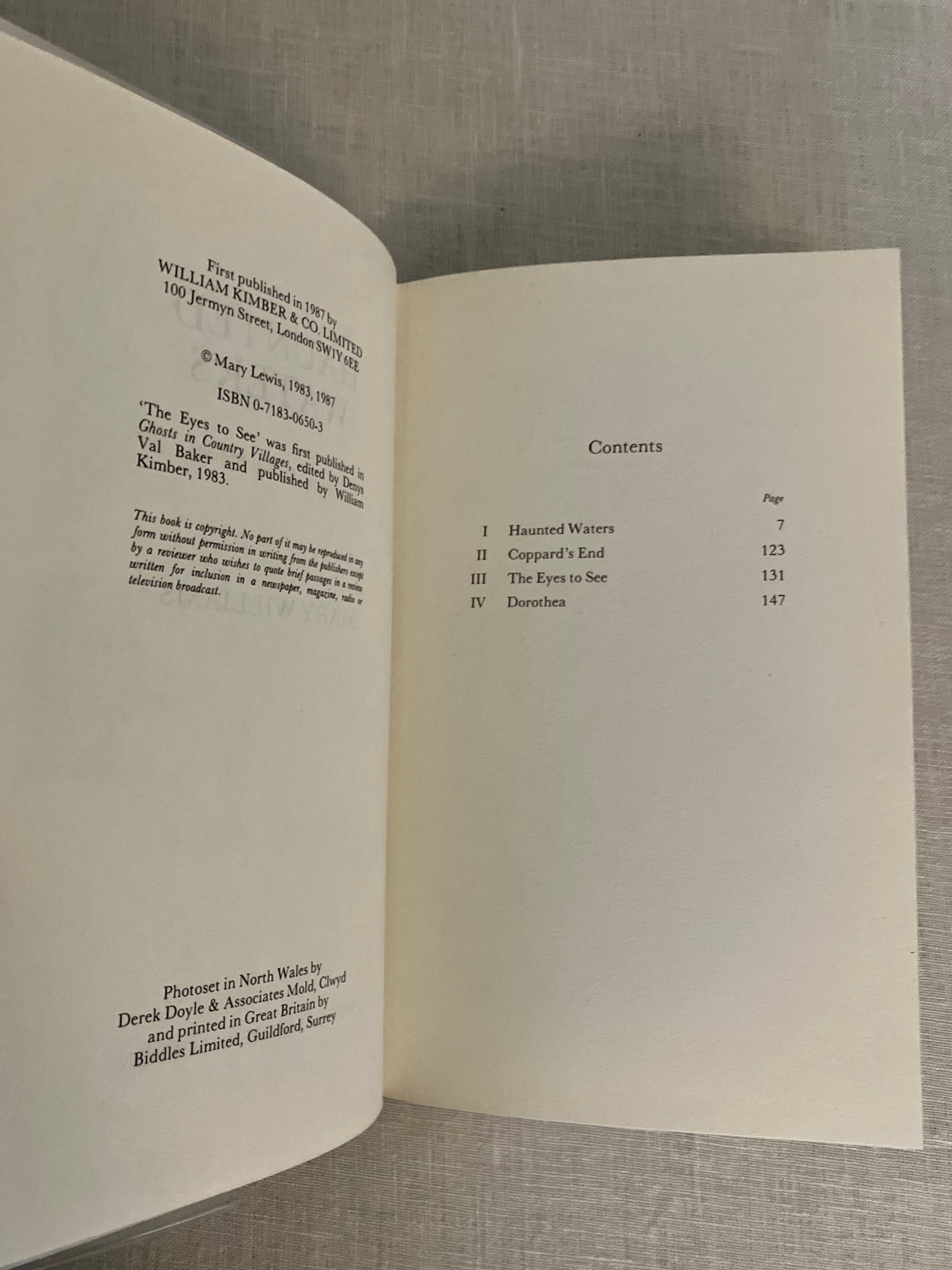 First Edition. Hard cover, 8vo, in publisher's brown cloth boards with gold lettering to spine. Dust jacket illustration by Ionicus of a barge passing under a stone footbridge. COLLATION: 190pp., [2]. CONDITION: Near Fine, with covers fresh and bright, with the ghost of a pencilled price mark to the front free endpaper. Dust jacket Fine (now protected in mylar). ** AUTHOR Mary Williams (1903-2000) was an English author who moved to Cornwall in 1947 and married a bilingual Welshman, thus in close proximity to two sources of Celtic sensibilities. She published several collections of ghost stories and other tales of the supernatural, as well as a handful of novels. ** The title story, "Haunted Waters", is a ghost story tied a place, much like Algernon Blackwood's "The Willows", and evokes the natural surroundings of a river and a canal, with echoes of its history both as a trade route and as the setting for.... but I won't spoil the story - suffice to say that Mary Williams was a gifted writer who managed to skillfully merge the world of spirits with the world we inhabit... The "Haunted Waters" collection also contains the short stories "Coppard's End", "The Eyes to See", and the novelette "Dorothea". ** Dust jacket ILLUSTRATOR, Ionicus, a.k.a. Joshua Charles Armitage (1913-1998), was a prolific contributor to Punch magazine, as well as a cover illustrator for the Penguin editions of P.G. Wodehouse. ** REFS: Internet Speculative Fiction Database #1298815.