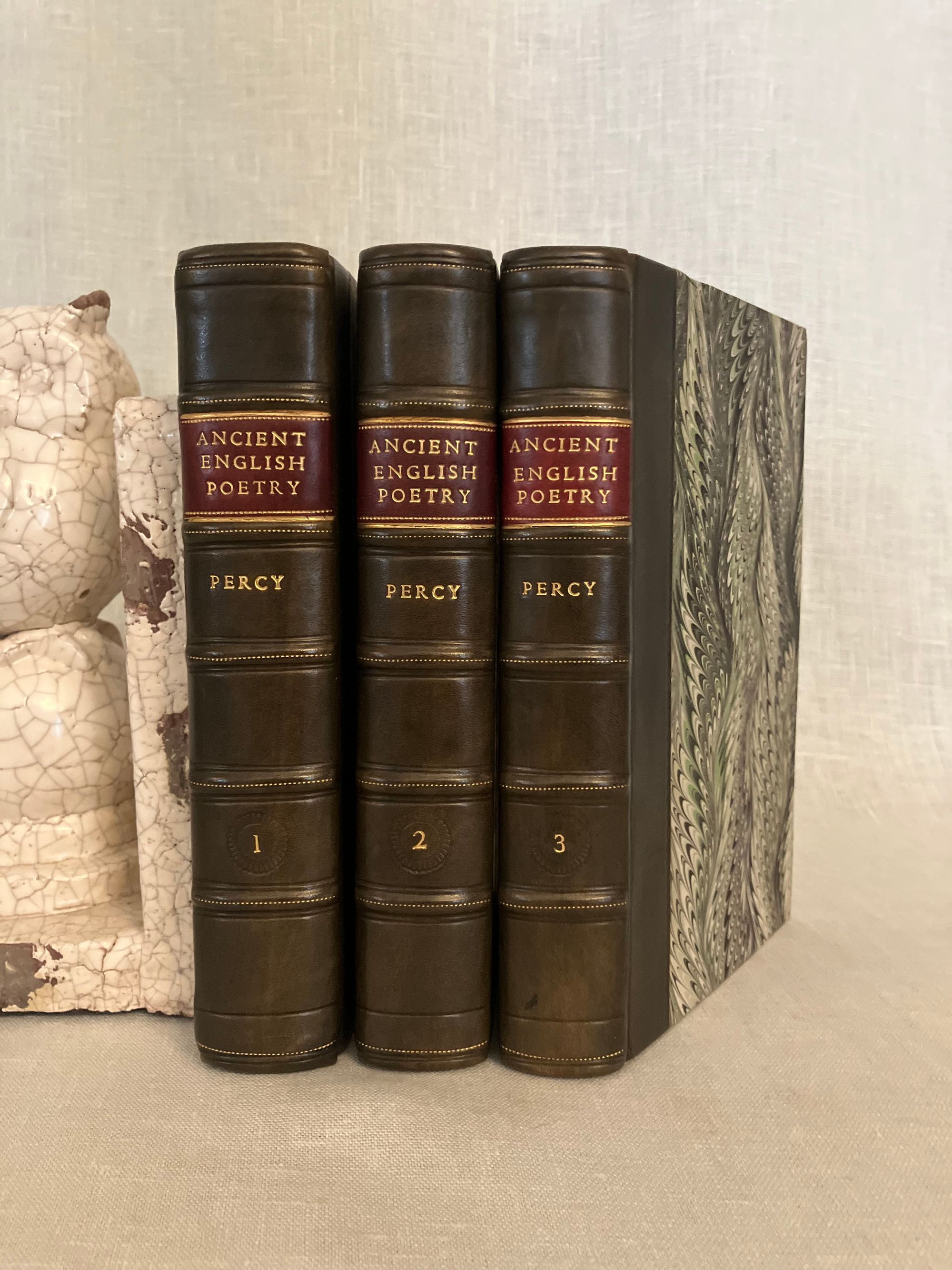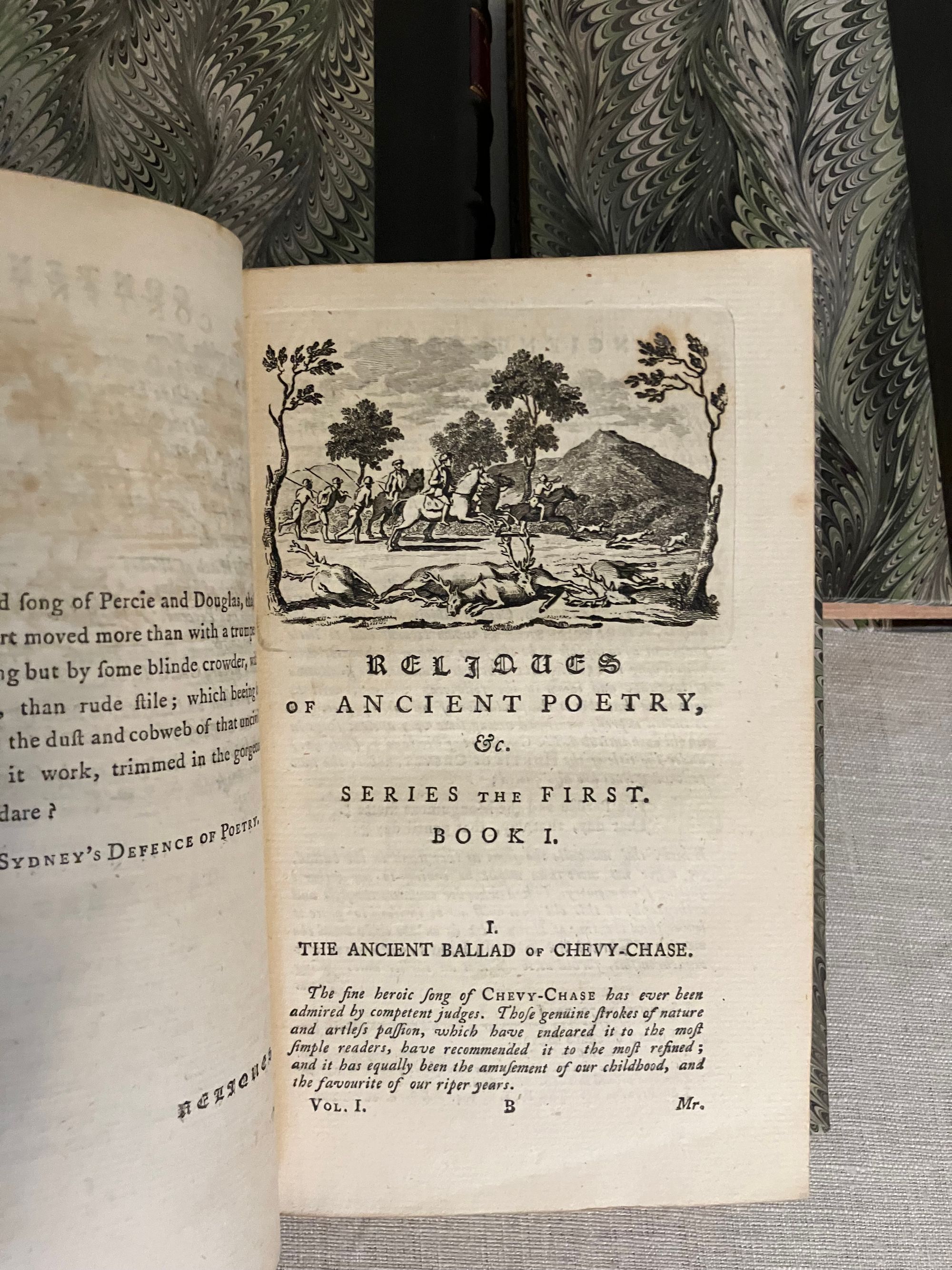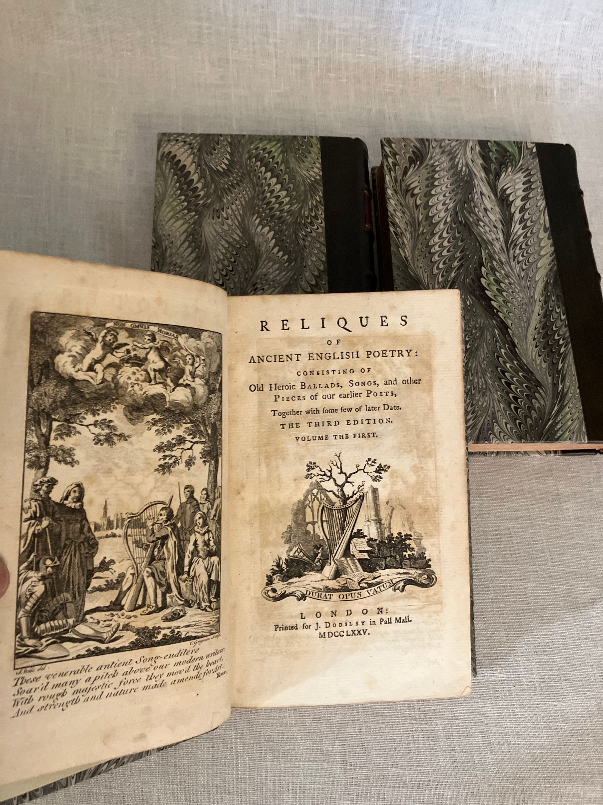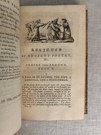 The Third Edition. Hard cover, 12mo, 3 volumes (complete). Bound in modern quarter-calf fine binding over marbled paper-covered boards, with five raised bands to the spine, rolled in gilt, the volume numbers within oval blind stamped surrounds. Title to red onlaid label in second compartment, with author name in the third. Spines have five raised bands with maroon title labels and lettering in gold. Top edge stained. Stone-colored end papers and binder's flies. Printed on laid paper. Wood engraved illustrated frontis is signed S. Wale English illustrator, draftsman, and painter, (ca. 1721-1786) Engraved by C. Grignion, London engraver (1717-1810) (COLLATION: lxxviii [4] 376 [2] pp; iii [1] 404 [2] pp; xxxix [1] 359 [1] pp. CONDITION: Near Fine. Boards are about fine, and fresh-looking, with tight binding. Text block is Near Fine with some age-toning and the occasional foxing or light crease. Small indentation to some pages in volume I, perhaps from time of printing. Overall a very pleasing set. ** COMPILER & EDITOR Bishop Thomas Percy (1729-1811), after gaining a doctorate in divinity from Cambridge University, did not immediately find a position in the church, so took to writing books to earn an income. His first work was "Hau Kiou Choaan, or The Pleasing History" (1761), the first known publication of a Chinese novel in English. After a few other Chinese works, Percy was encouraged by his friends, including Samuel Johnson and James Boswell, to publish the English ballads he had been collecting. These became the influential "Reliques of Ancient English Poetry", first published in 1765. ** The "Reliques" collect many famous English ballads, for example: "The Ancient Ballad of Chevy-Chase", "Robin Hood" and "Guy of Gisborne", "Sir Lancelot du Lake", "King Leir and his Three Daughters", "Ulysses," "Syren", "The Witch of Wokey", "Alcanzar and Zayda, a Moorish Tale", "Sir Aldingar", "K. Edward IV and the Tanner of Tamworth", "Hardyknute. "A Scottish Fragment", "Little John Nobody", "Fair Rosamond", "Old Tom of Bedlam", "Admiral Hosier's Ghost", "Legend of Sir Guy", "St. George and the Dragon", and many more. ** In publishing (and sometimes embellishing) ancient ballads, Percy was following the trend started by Scottish poet James Macpherson, who compiled (and composed) ancient Gaelic ballads into the works, "Fragments of Ancient Poetry" (1760) - later known as "The Poems of Ossian". These ballads were to influence writers of the Romantic movement, including Sir Walter Scott, who published his Scottish collection of ballads as "Minstrelsy of the Scottish Border" in 1802. ** Percy was was ordained as Bishop of Dromore in County Down in 1782, a position he held until his death in 1811. OCLC 868260468, general edition. Watson 243. On Artists: see Getty edu ULAN 500022805 and 500020329.