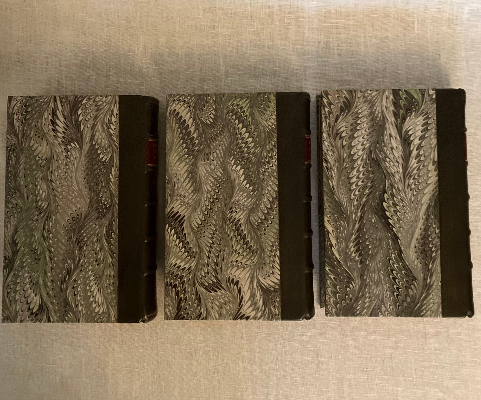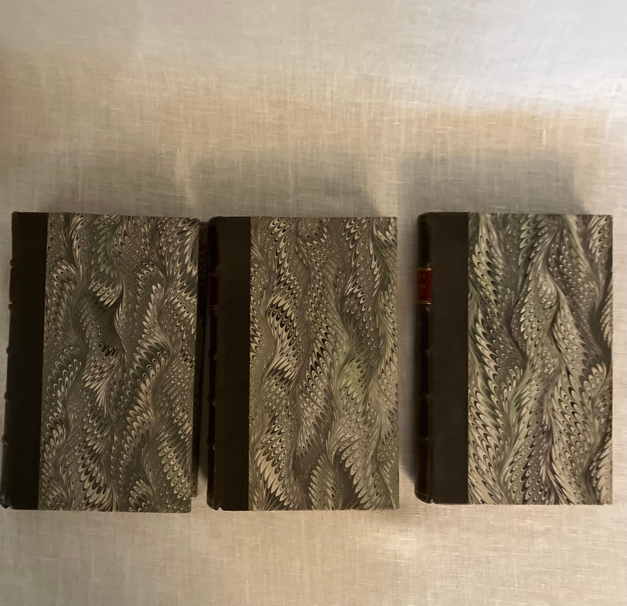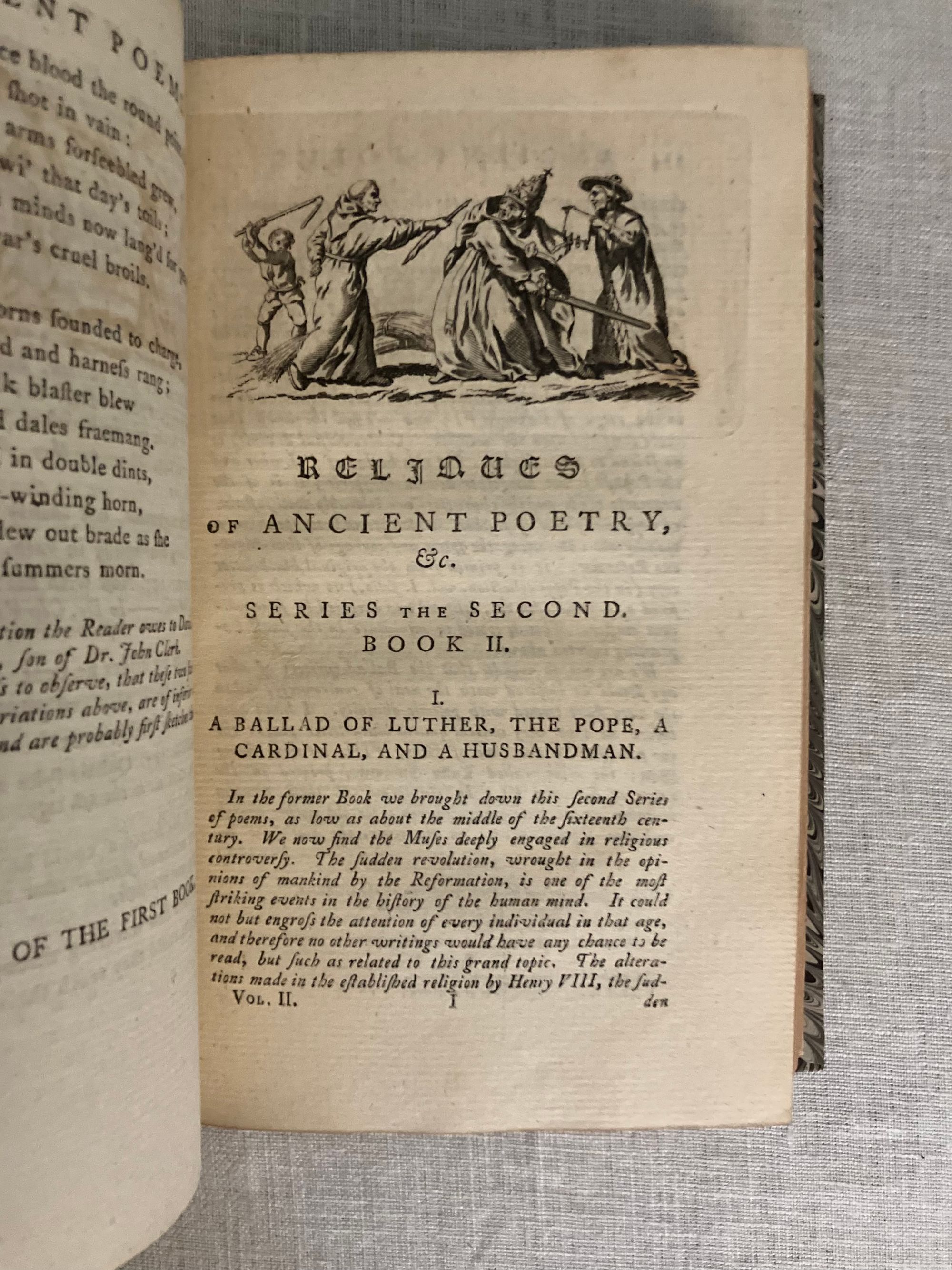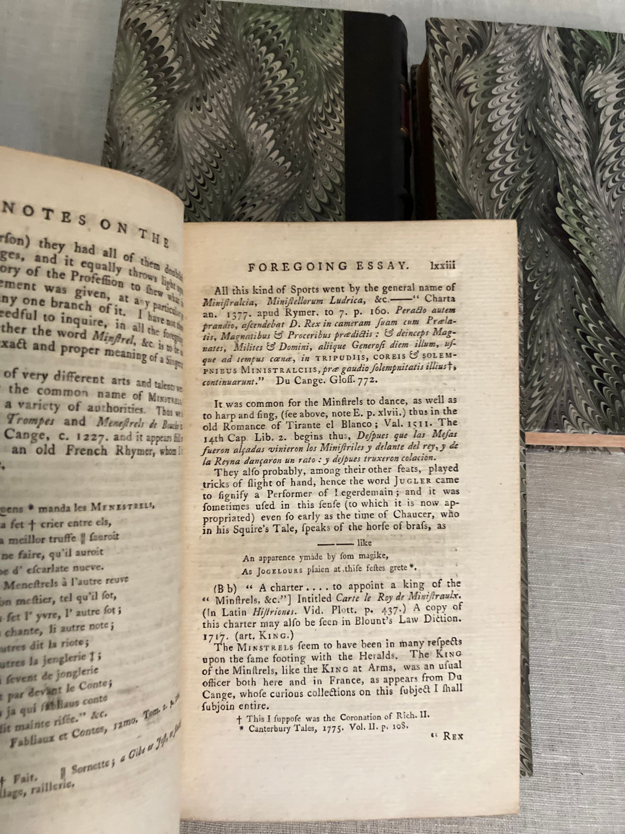 The Third Edition. Hard cover, 12mo, 3 volumes (complete). Bound in modern quarter-calf fine binding over marbled paper-covered boards, with five raised bands to the spine, rolled in gilt, the volume numbers within oval blind stamped surrounds. Title to red onlaid label in second compartment, with author name in the third. Spines have five raised bands with maroon title labels and lettering in gold. Top edge stained. Stone-colored end papers and binder's flies. Printed on laid paper. Wood engraved illustrated frontis is signed S. Wale English illustrator, draftsman, and painter, (ca. 1721-1786) Engraved by C. Grignion, London engraver (1717-1810) (COLLATION: lxxviii [4] 376 [2] pp; iii [1] 404 [2] pp; xxxix [1] 359 [1] pp. CONDITION: Near Fine. Boards are about fine, and fresh-looking, with tight binding. Text block is Near Fine with some age-toning and the occasional foxing or light crease. Small indentation to some pages in volume I, perhaps from time of printing. Overall a very pleasing set. ** COMPILER & EDITOR Bishop Thomas Percy (1729-1811), after gaining a doctorate in divinity from Cambridge University, did not immediately find a position in the church, so took to writing books to earn an income. His first work was "Hau Kiou Choaan, or The Pleasing History" (1761), the first known publication of a Chinese novel in English. After a few other Chinese works, Percy was encouraged by his friends, including Samuel Johnson and James Boswell, to publish the English ballads he had been collecting. These became the influential "Reliques of Ancient English Poetry", first published in 1765. ** The "Reliques" collect many famous English ballads, for example: "The Ancient Ballad of Chevy-Chase", "Robin Hood" and "Guy of Gisborne", "Sir Lancelot du Lake", "King Leir and his Three Daughters", "Ulysses," "Syren", "The Witch of Wokey", "Alcanzar and Zayda, a Moorish Tale", "Sir Aldingar", "K. Edward IV and the Tanner of Tamworth", "Hardyknute. "A Scottish Fragment", "Little John Nobody", "Fair Rosamond", "Old Tom of Bedlam", "Admiral Hosier's Ghost", "Legend of Sir Guy", "St. George and the Dragon", and many more. ** In publishing (and sometimes embellishing) ancient ballads, Percy was following the trend started by Scottish poet James Macpherson, who compiled (and composed) ancient Gaelic ballads into the works, "Fragments of Ancient Poetry" (1760) - later known as "The Poems of Ossian". These ballads were to influence writers of the Romantic movement, including Sir Walter Scott, who published his Scottish collection of ballads as "Minstrelsy of the Scottish Border" in 1802. ** Percy was was ordained as Bishop of Dromore in County Down in 1782, a position he held until his death in 1811. OCLC 868260468, general edition. Watson 243. On Artists: see Getty edu ULAN 500022805 and 500020329.