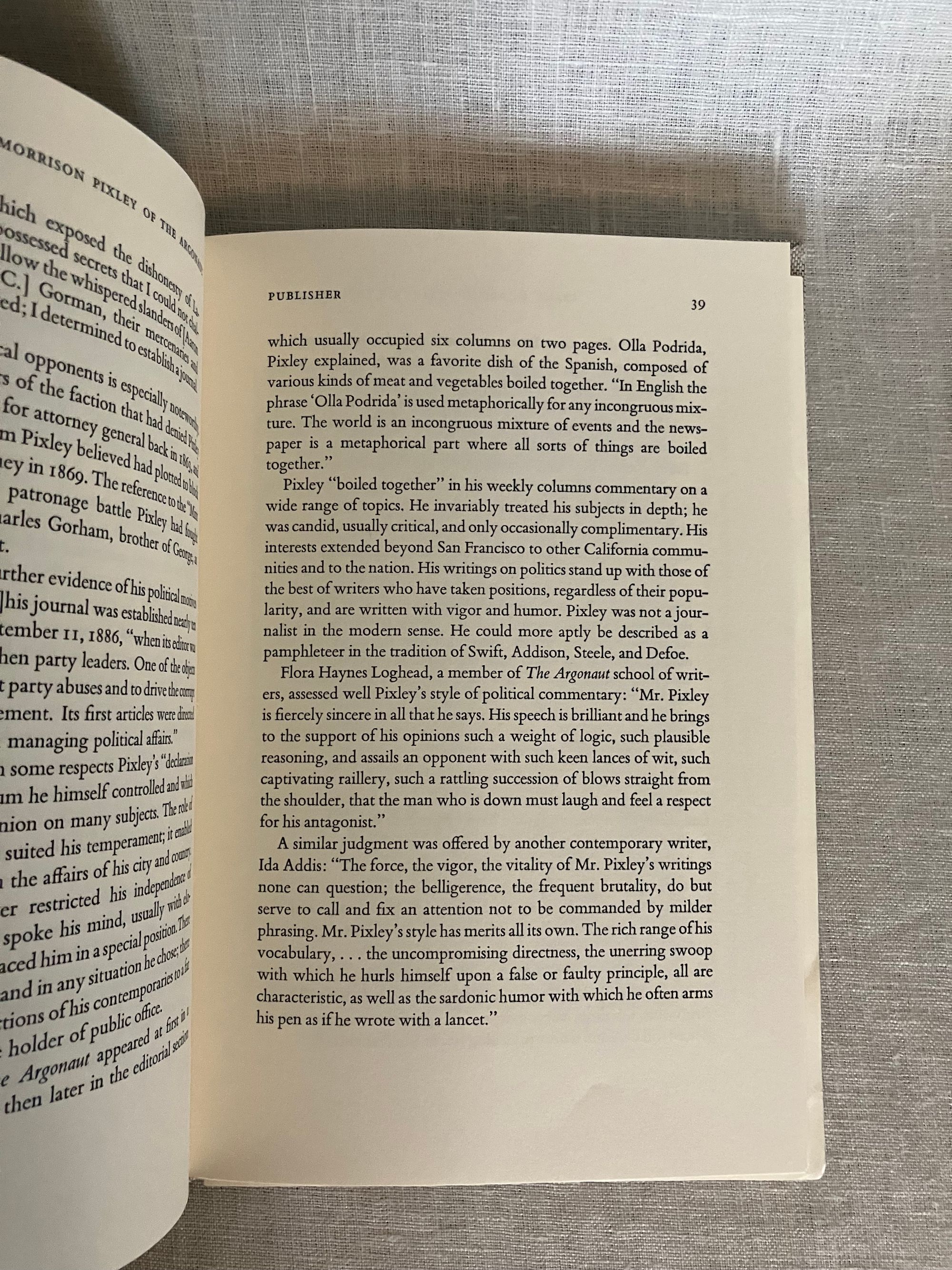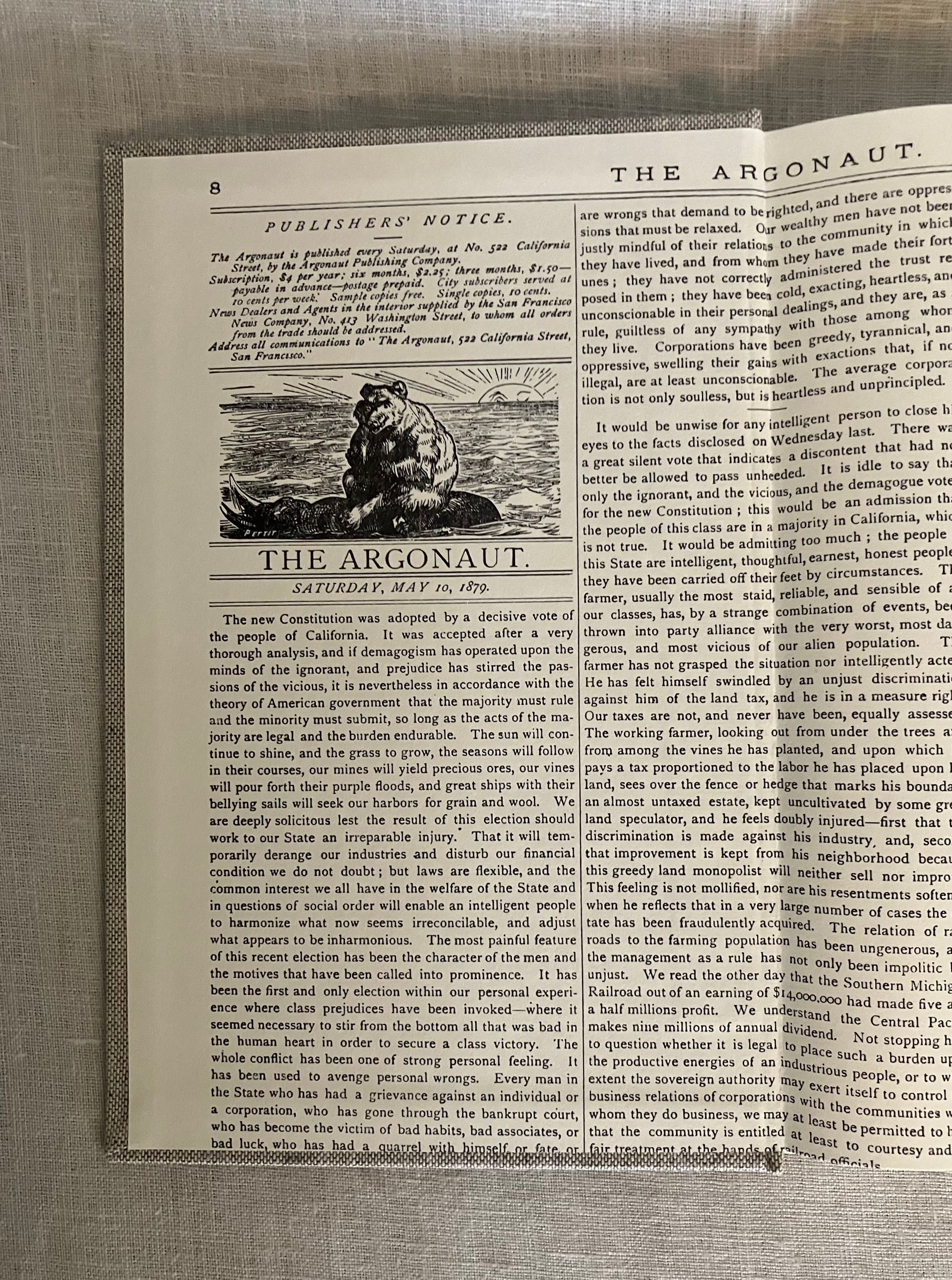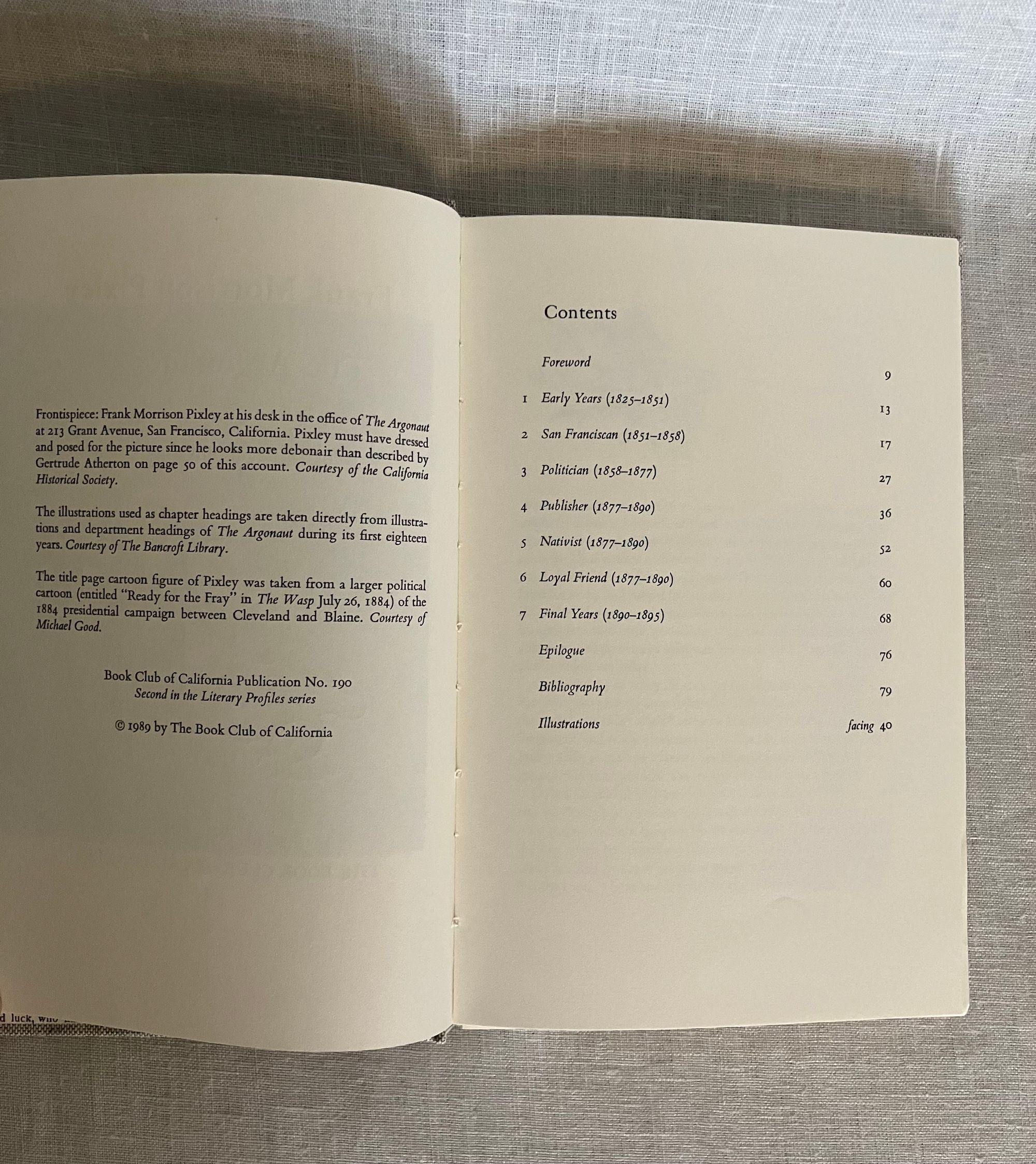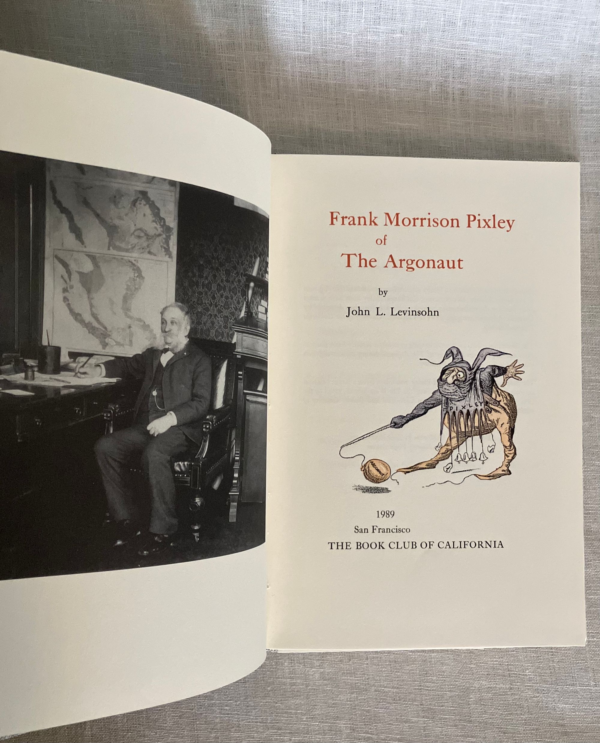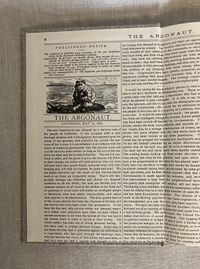 Hard cover 8vo, in grey linen-like cloth-covered boards with titles to spine blocked in gold. Endpapers are a facsimile copy of a 1893 copy of the titular San Francisco newspaper including illustrated logo and vintage advertising. Frontispiece portrait of the subject, Frank Morrison Pixley, editor, in addition to woodblock carved illustrations taken from from the original issues, which spanned the years 1877-1895. **CONDITION: Fine. No d/j. as issued. **From the prospectus: " When Frank Morrison Pixley founded" The Argonaut" literary weekly in 1877, he had already been a gold miner, San Francisco city attorney, state legislator, editor, real estate broker, regent of the University of California, state Attorney General, public speaker and editorial writer for San Francisco Chronicle...this book explores Pixley's personal and public life, as well as the "mysteries," breaths of scandal, which were headlined in the daily newspapers upon his death..." It goes on to recount how "The Argonaut" introduced a number of important Californian writers of the early twentieth century such as Ambrose Bierce, Ina Coolbrith, Gertrude Atherton, Charles Warren Stoddard, and more. Includes original prospectus. Provenance: Ex-libris Joseph C. Houghteling, California newspaper publisher and political activist. Book Club of California Publication Number 190.
