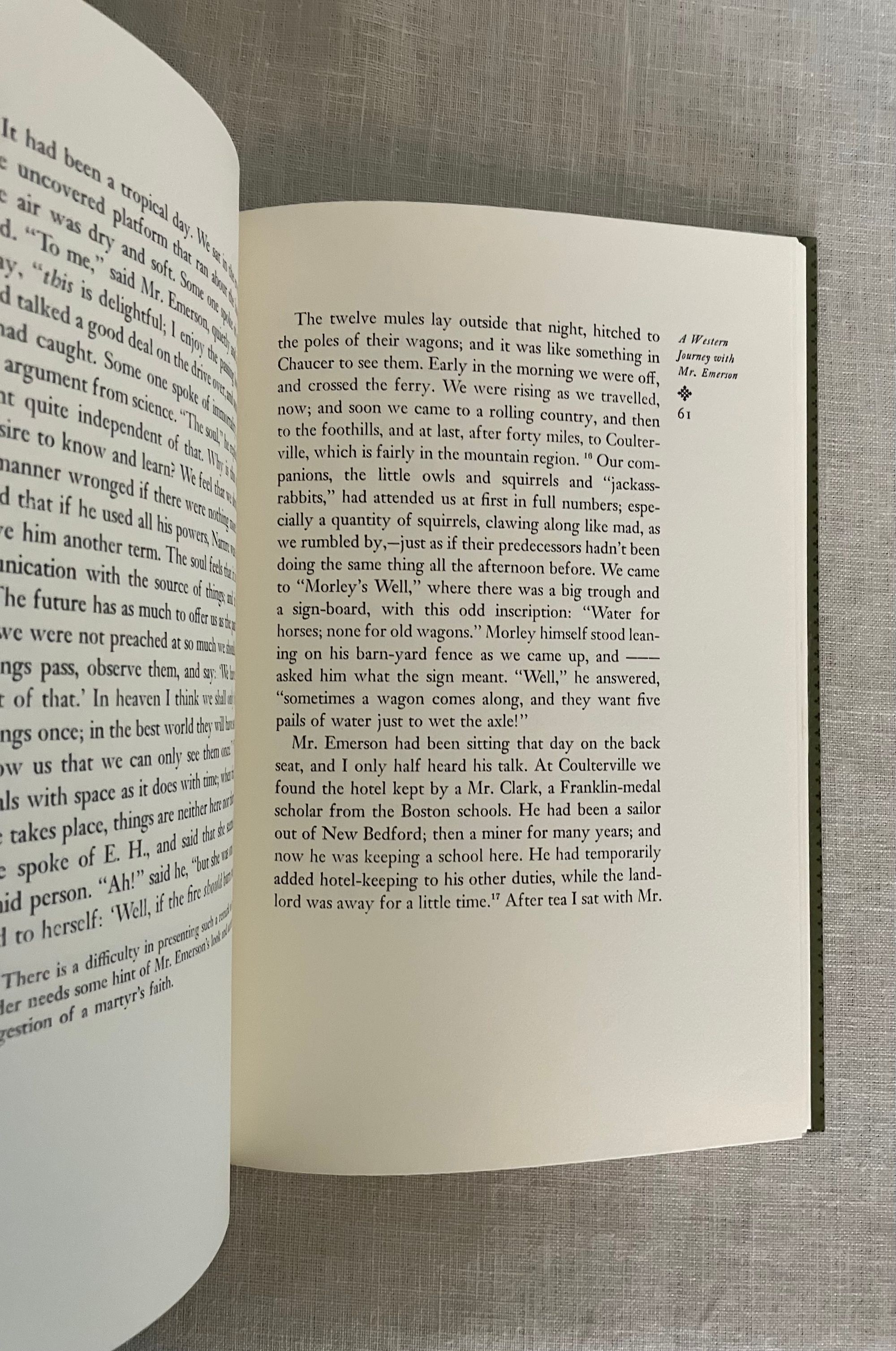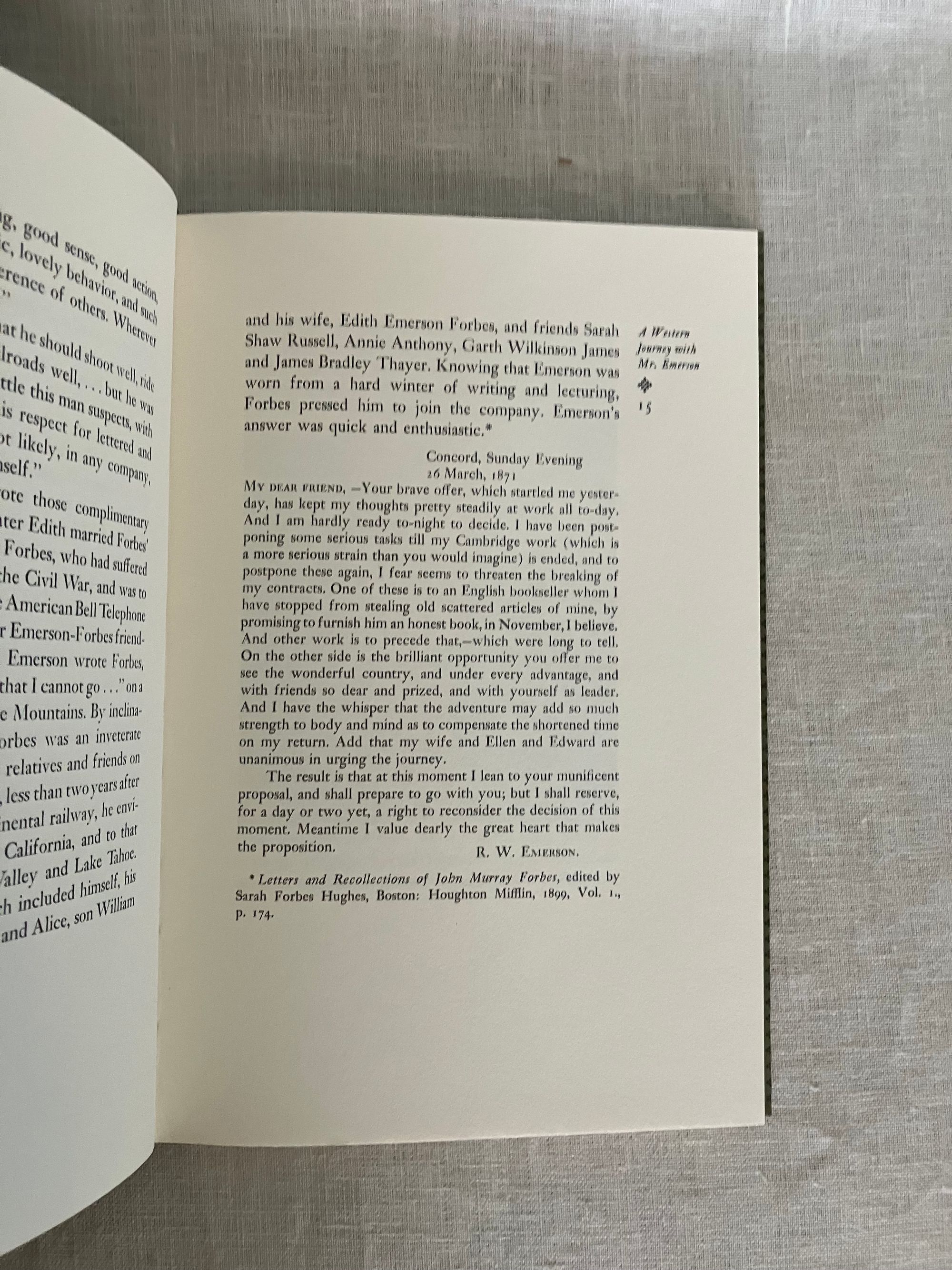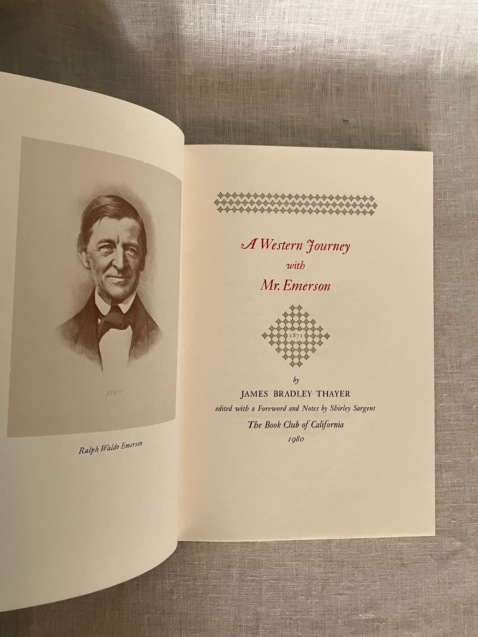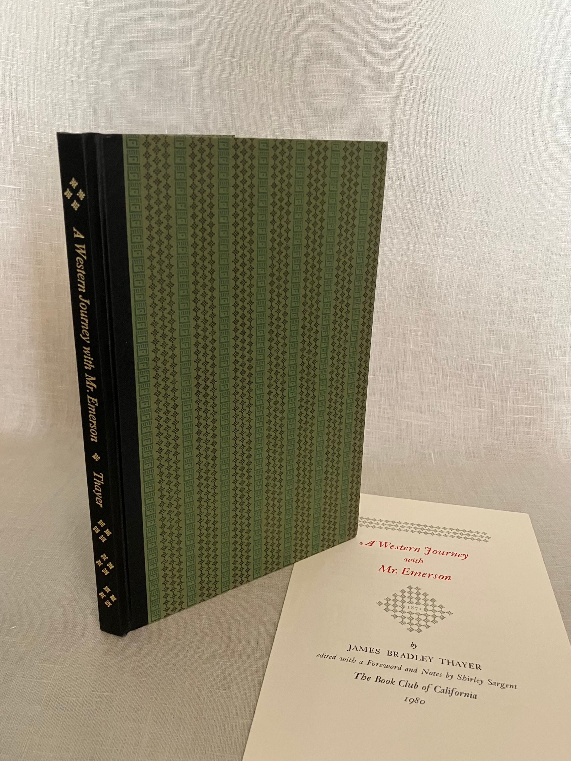Limited Edition 600 copies, First Edition. Hard cover, 8vo, in quarter black cloth with printed decorated paper-covered boards in a vertically-striped pattern in shades of green, titles blocked vertically in gold to the spine, olive green end papers, title page printed in grey, black and red, with a frontispiece portrait of the subject. Richard Hoffman, printer. CONDITION: Fine. **James Bradley Thayer (1831-1902), Harvard Law professor and constitutional scholar, wrote "A Western Journey with Mr. Emerson," for publication originally in 1884. He recounts a trip taken by rail between Boston and San Francisco, California in the Spring of 1871 with a discreetly unnamed traveling party which did, however, include the Transcendental thinker, Ralph Waldo Emerson, a distant relative and fellow Harvard man. Emerson apparently used the tour as a working holiday, sprucing up his work "Faust," for instance, and Thayer recollects the writer's opinions on a number of contemporary authors and other topics, dispensed in candid conversations. As a historic travelogue about the newly-connected transcontinental rail system in the United States, though, the work brings alive the early experience of tourism from the close confines of the Pullman car, highlighting the still sometimes dangerous conditions endured by rail passengers. Thayer's most interesting observations come from the people he and Emerson meet along the way, among them the Mormon president Brigham Young. An epochal meeting with conservationist John Muir is also documented. Shirley Sargent's excellent Foreward fleshes out a good number of Thayer's original allusions. Includes original prospectus. California Book Club Publication Number 163.