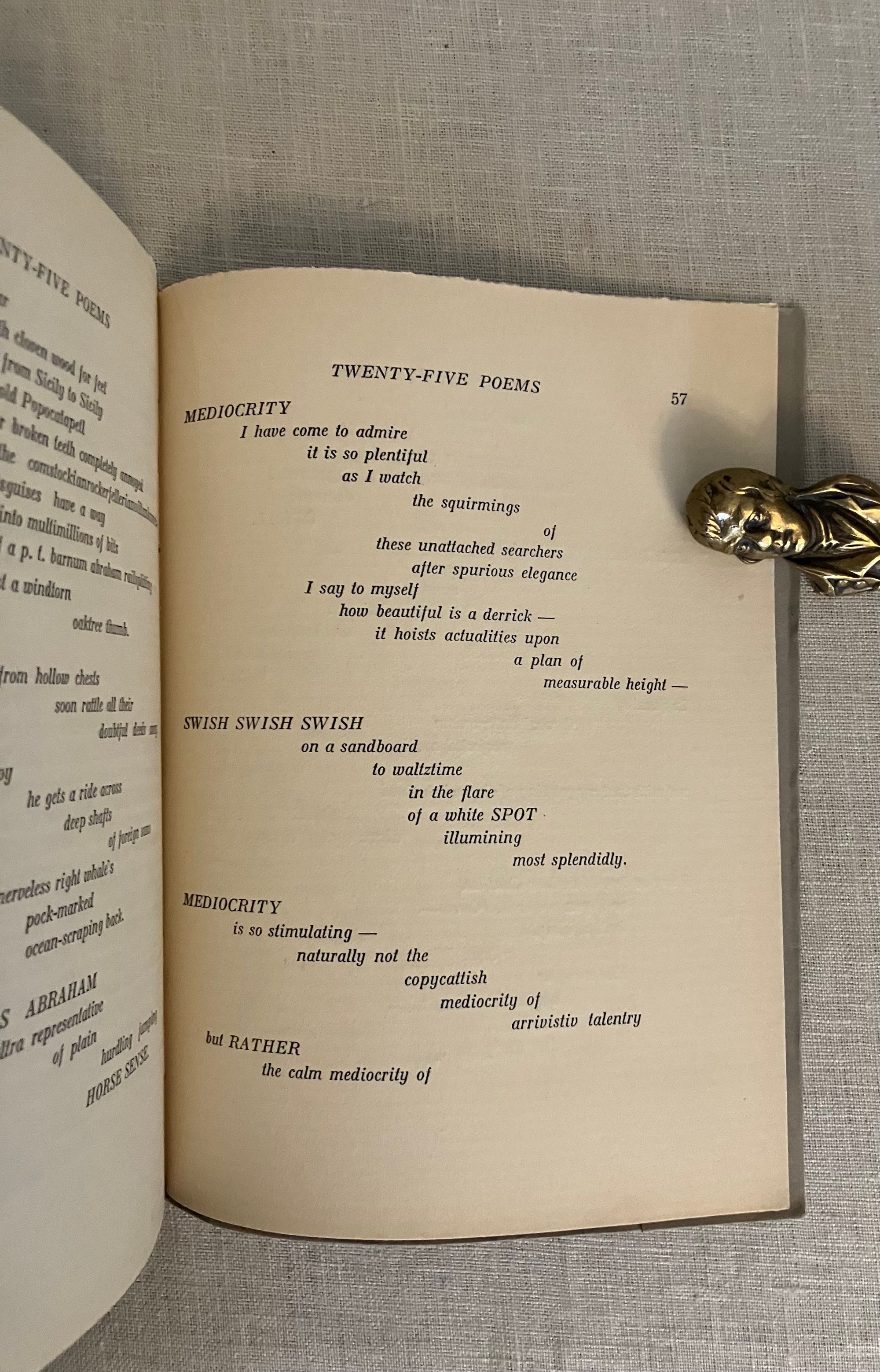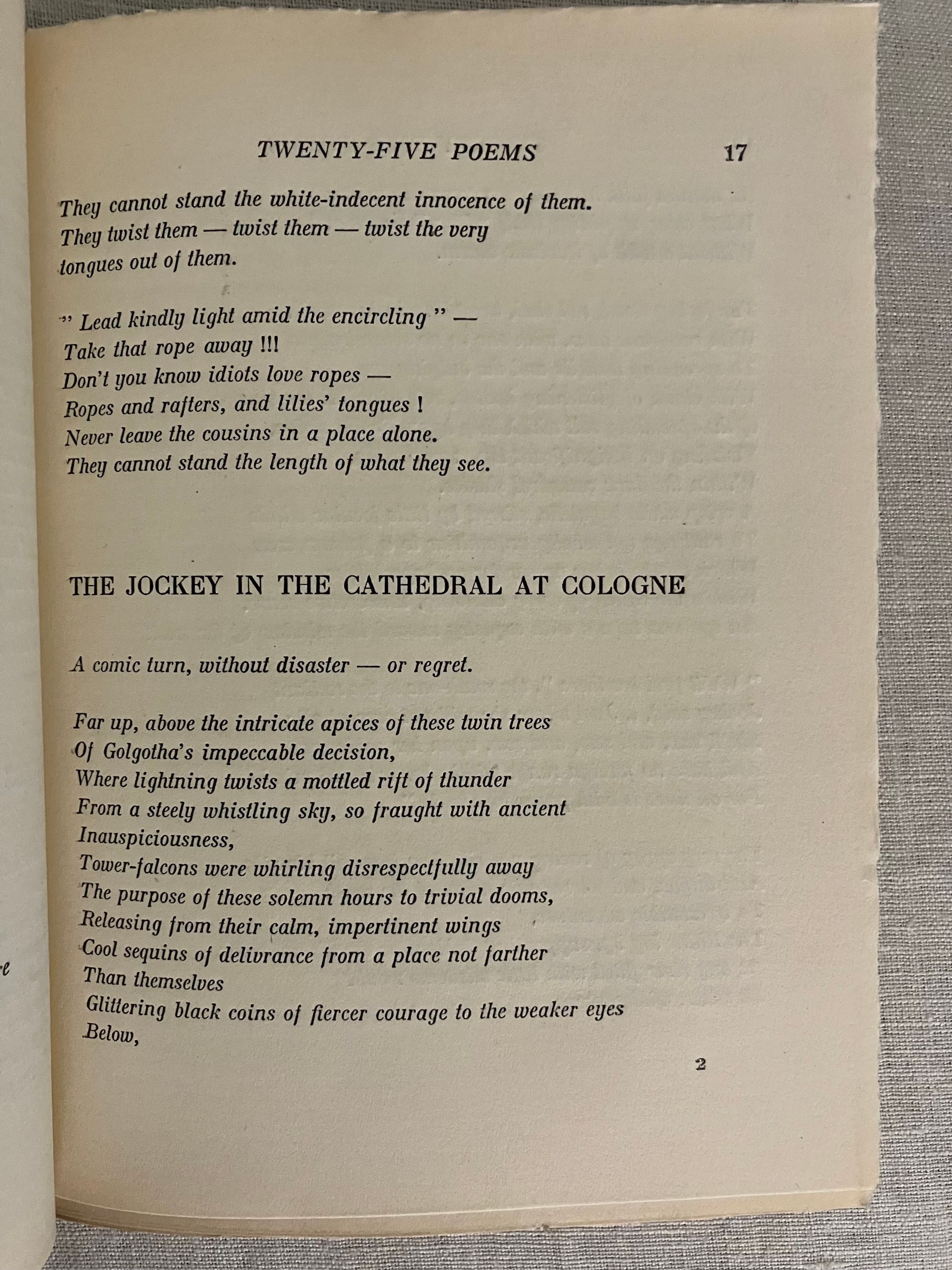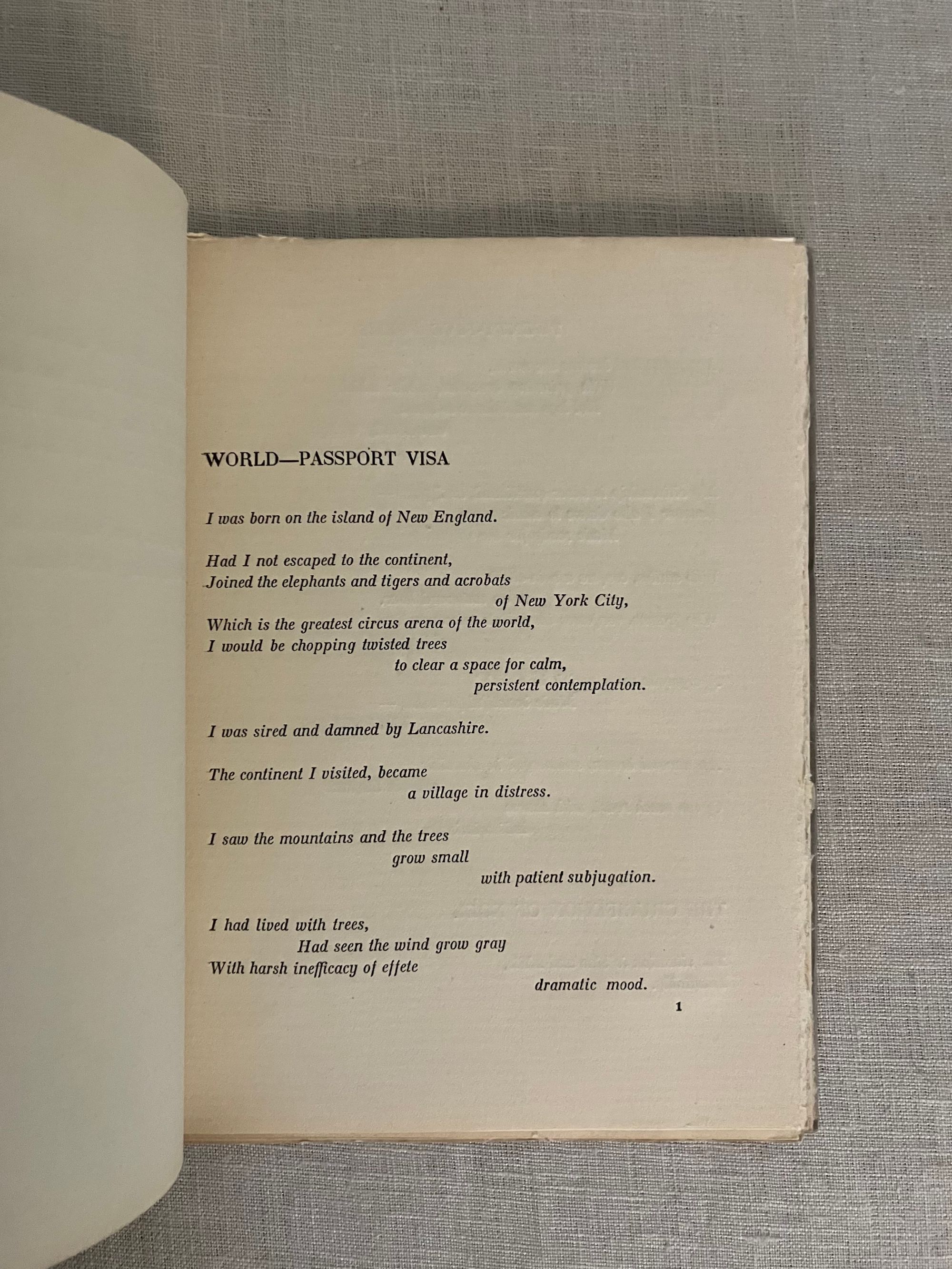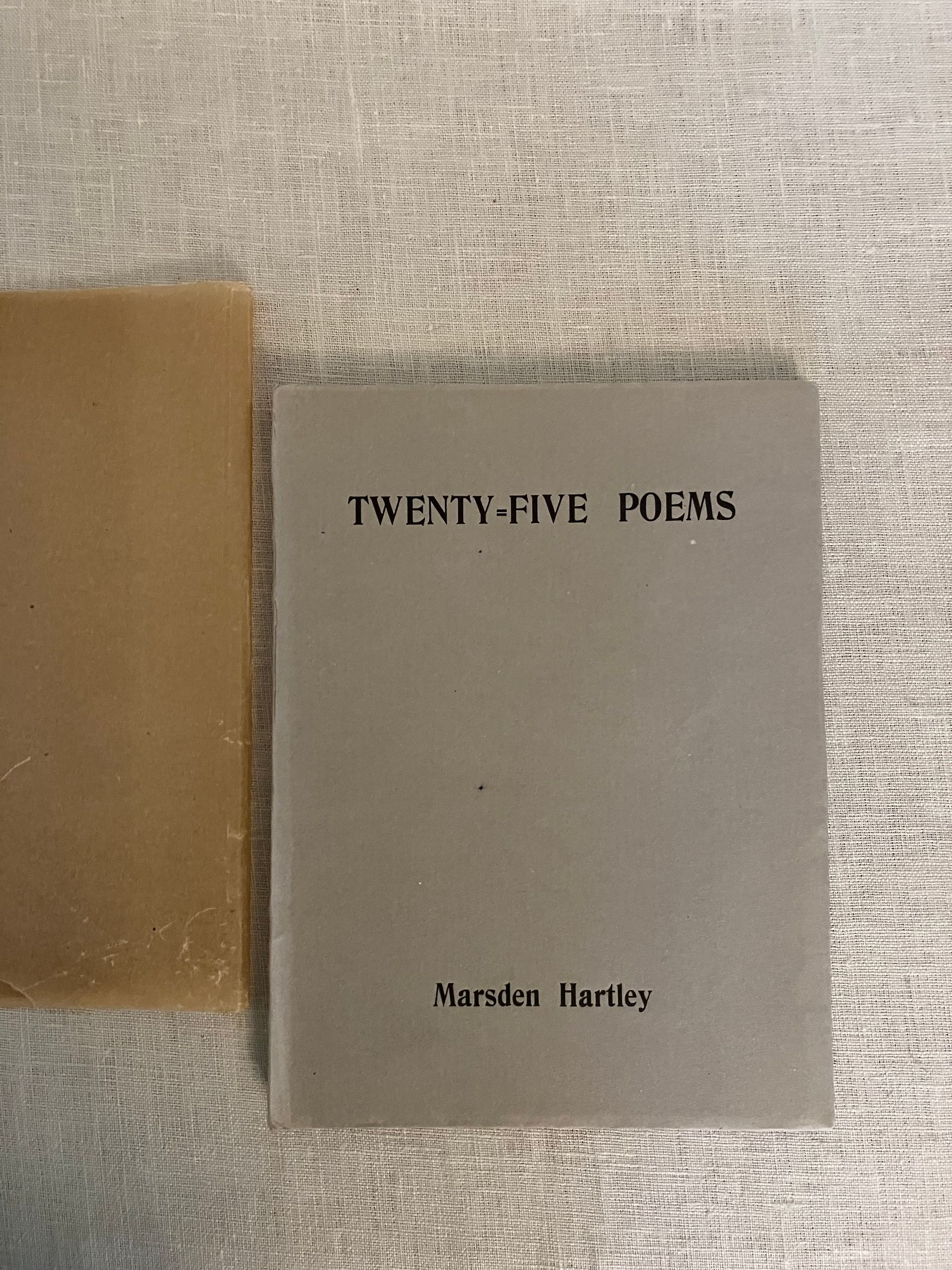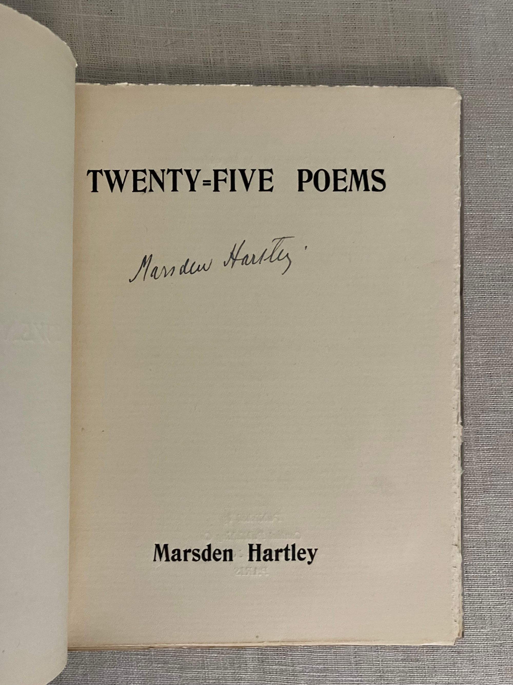 First edition. Soft cover booklet, 16mo, in gray paper wraps over laid paper, the title and author names printed to the front of the wrap, and the spine plain. Two sets of three sewn gatherings seen at spine edge. Many pages unopened. In the original glassine protector. Limited edition 300 copies, according to catalogue. COLLATION:[6pp., unnumbered],1-60, [1]pp. Artist's signature is to the Title page. "These pieces were written in Gloucester, New York, Santa Fe, and Berlin, during 1917-1922"--Page [5]. This was the first edition in book form of these pieces which had prior appearance in various periodicals. Poem titles include:"World--Passport Visa," "The Crucifiction of Noel," "Ossining," The Fork of Annie," "Above the Level," "Gloucester," "Spurious Coin," "Baltazar Fernande," "Portuguese Pool-Room," "Are You There, Rose Trumbull?" "Gulls at Gloucester," "Cobwebs and Ratholes," "The Jockey in the Cathedral at Cologne," The Inquisition," "Boston Portrait Projects," "First" "Second," "Third," "Fourth," "Fifth," "Sixth" 1920-1922. [Without title], "Diabolo" "Ten Cent Towers," "Yours with Devotion," and "Parade." Colophon: Printed at Dijon by Maurice Darantiere, 1923. In English. **CONDITION: Fine, in a Very Good original glassine sleeve with a moderate chip to bottom edge merging into a 2" vertical closed tear which has, nonetheless, kept the booklet contents quite well-protected.**Contact Publishing Company, the French imprint of Dijon-based MAURICE DARANTIER (1882- 1962) was perhaps most famous as the Dijon art printer and publisher responsible for the production of the first edition of James Joyce's " Ulysses " in 1922 for Sylvia Beech, (the year before this publication.) **One of the Stieglitz Circle of American Modernist painters, MARSDEN HARTLEY(1877-1943), originally from Lewiston, Maine, continued to be associated with that State until his death. He is widely acknowledged by art historians as a very significant figure in the American decoding of evolving European art movements of the early twentieth century; pushing the boundaries of abstraction, rewiring cubism with color for instance, experimenting with German Expressionism. In the process, he became one of the foremost artists of the time. His experimentation took him to some of the foreign locales cited here in these poems. REFS: FRBNF 32224532. OCLC 701073. Scarce.