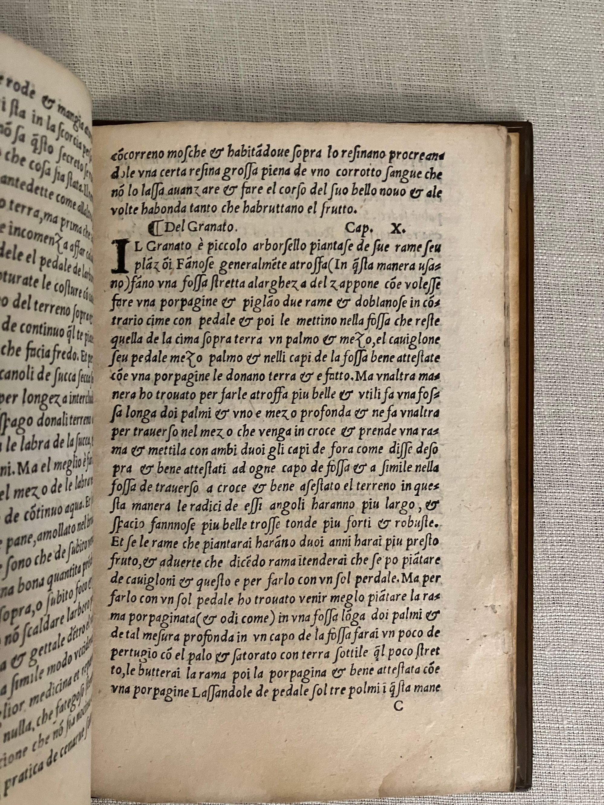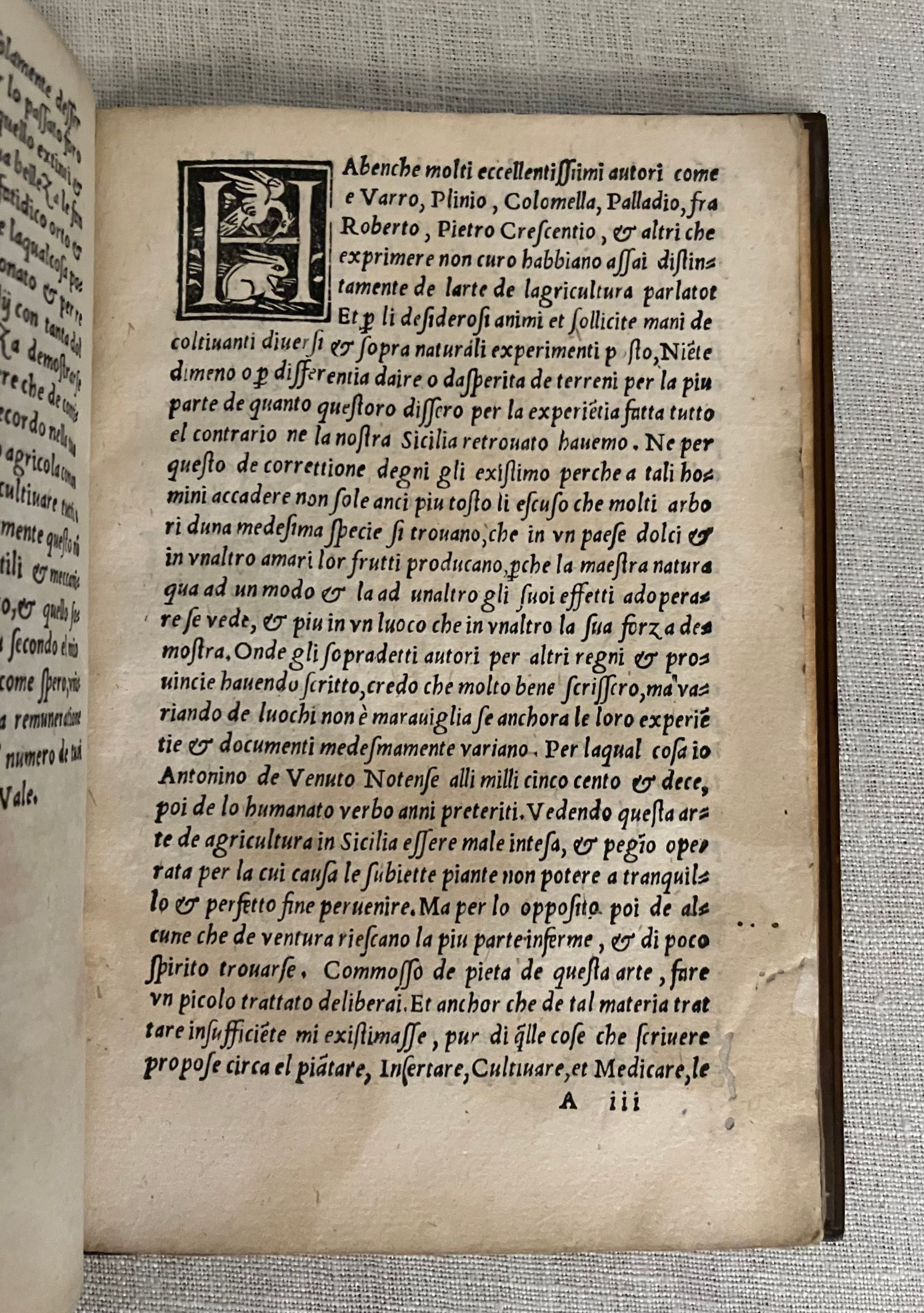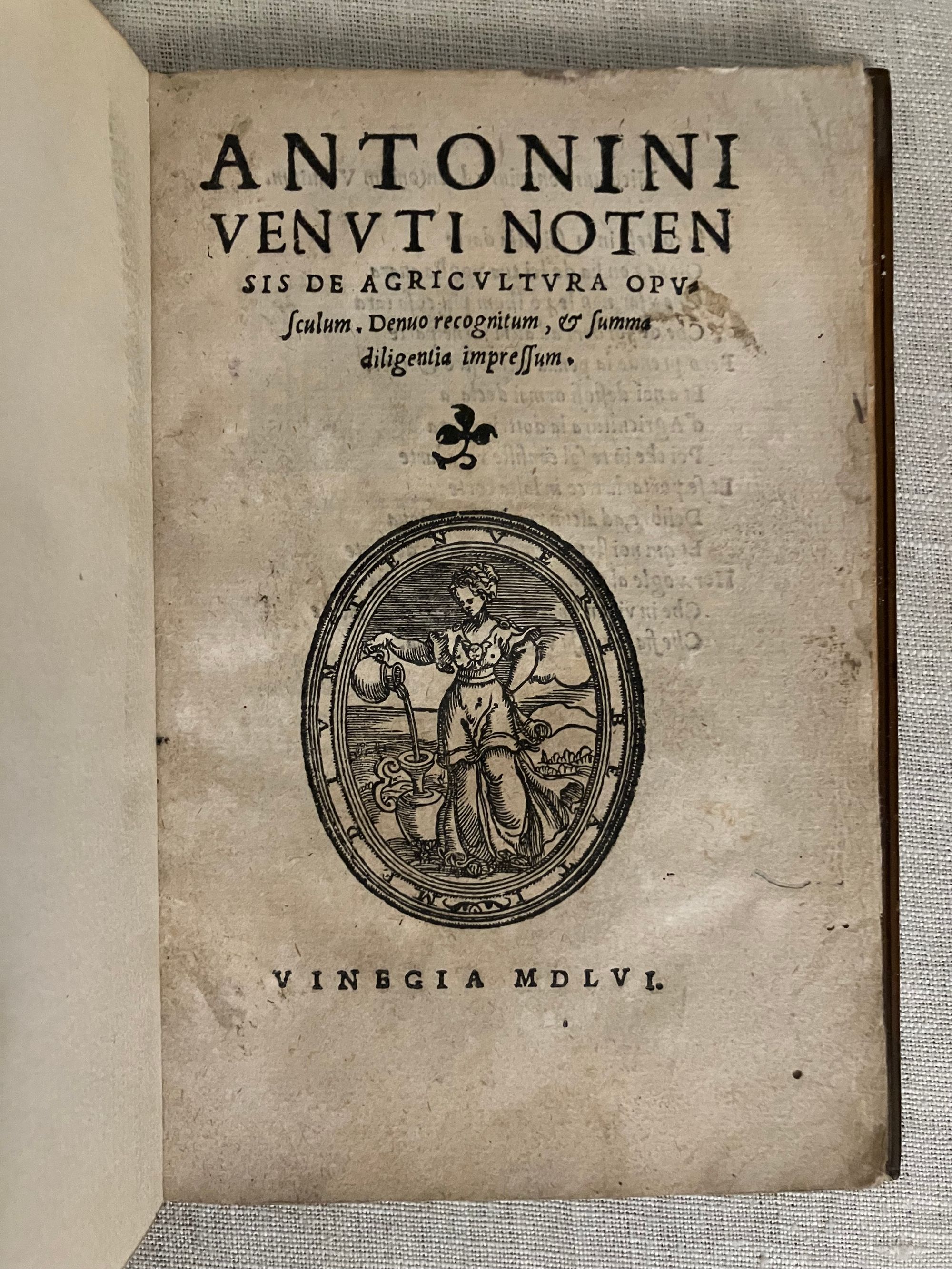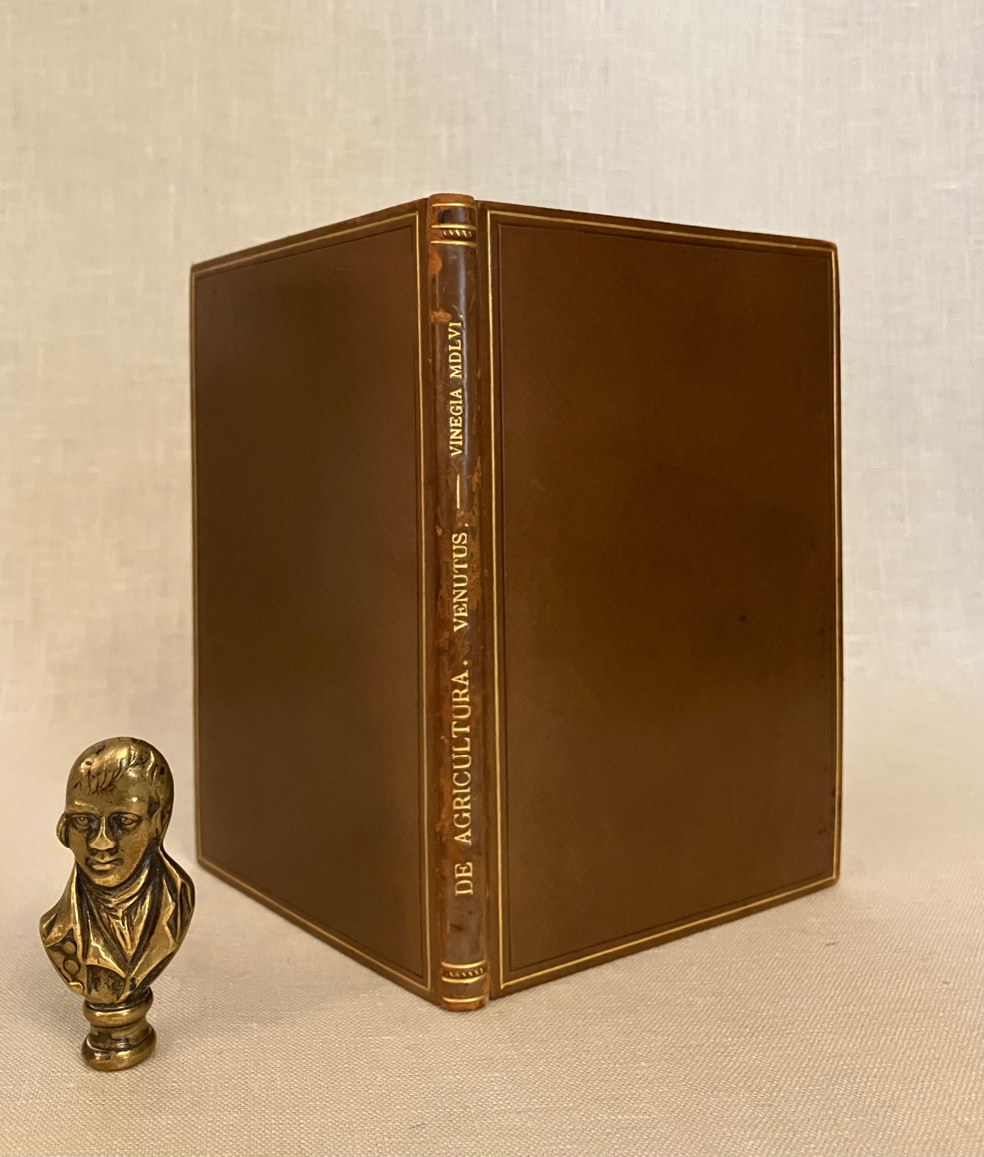 (Title in English: "Antonio Venuti's Notes on Agriculture, Again Revised, & Printed with the Greatest Care.") Hard cover, 12mo (4 1/4 x 6 1/2 inches) in a modern stamp-signed fine binding by Birdsall & Son, Northampton, of full calf, the boards double-ruled in blind and gilt, two small raised bands at the spine with shilling roll and gilt outlines and the title tooled vertically to the spine. Board edges rolled in blind floral pattern. Title page has an oval wood-carved printer's device featuring Temperance: a woman pouring wine from one amphora into another on the ground, all within in a lush landscape by the sea. A motto on the framing the scene reads: "medium tenuere beati" (to hold the heart of a blessed thing.) In Latin, and Italian Sicilian dialect. Handsome typography features three carved historiated capitals and italic typeface. ** COLLATION: A-D8, E4. [2], [70], [2] pp. **CONDITION: Very Good Antiquarian condition. Modern binding shows moderate rubbing at joints with light wear to tips, a few light scuffs. However, the volume is pleasing in the hand, sound and square. Internally, polish offset to ffep. Small pencil notations and library stamp of the agricultural library noted below are left as is. (See provenance statement.) Old wormhole is noted at the very outer blank margin at fore edge (likely trimmed in rebinding) and extends a bit deeper into margin at places. Light old damp staining affects bottom fore corner of about half the text, presumably professionally restored at time of rebinding. This remains a very useable item. **This RENAISSANCE WORK ABOUT AGRICULTURE IN SICILY was first published in Naples in1515. Later editions appeared in1536, 1541 and this one of 1556. The AUTHOR, Antonino Venuti, was born in Noto, near Ragusa, and this has been called the first work on agronomy by a Sicilian. Cultivation of fruits such as oranges, cherries, chestnuts, figs, pomegranates and dates, as well as the care of flowers and herbs are included. The propagation and care of fruiting trees forms another section, including the loquot, palm and olive, for instance, and discussion of their pests and pruning. The author references the classic authors from Latin antiquity on the agricultural arts: Varro, Columella, Palladio, Fra. Roberto and Pietro Crescentino for recording their early experimentations in the arts of agriculture. REFS: EDIT 16 CNCE 48244. STC Italian 719. On the Author: CERL cni00104463. **PROVENANCE: Lawes Agricultural Library, deaccessioned: Aslin (1940), p. 275. Scarce to market.