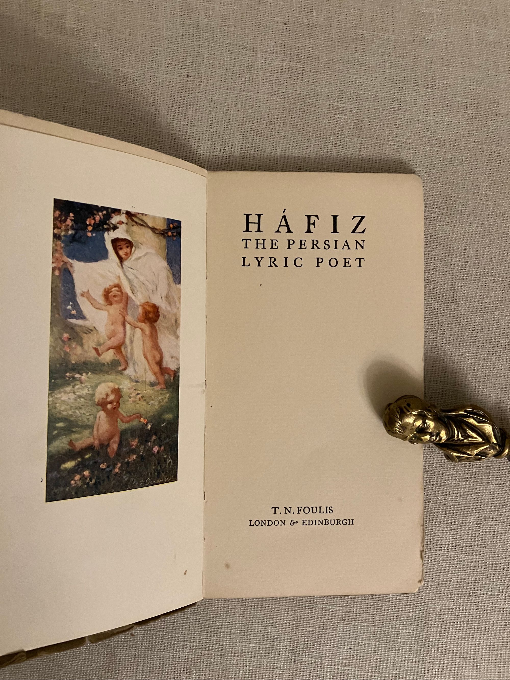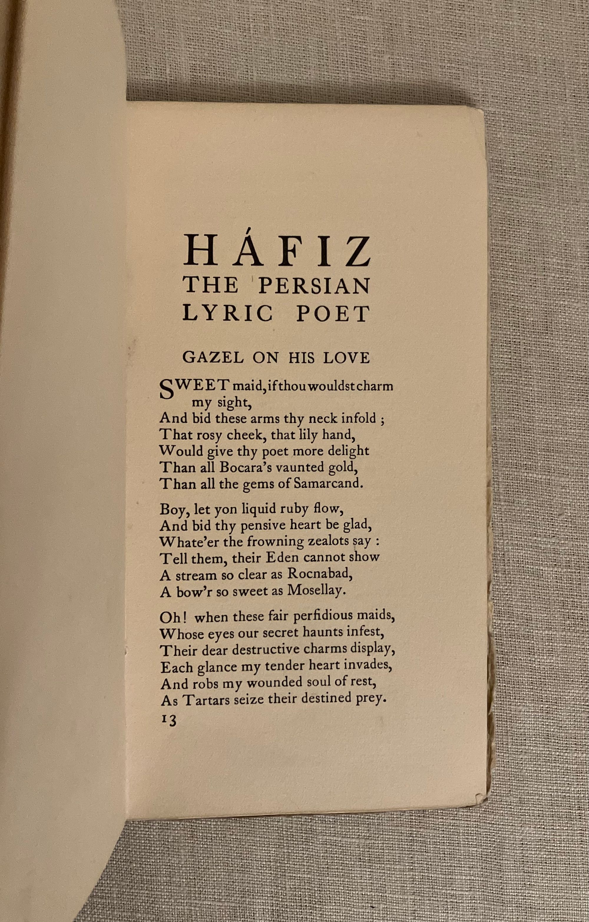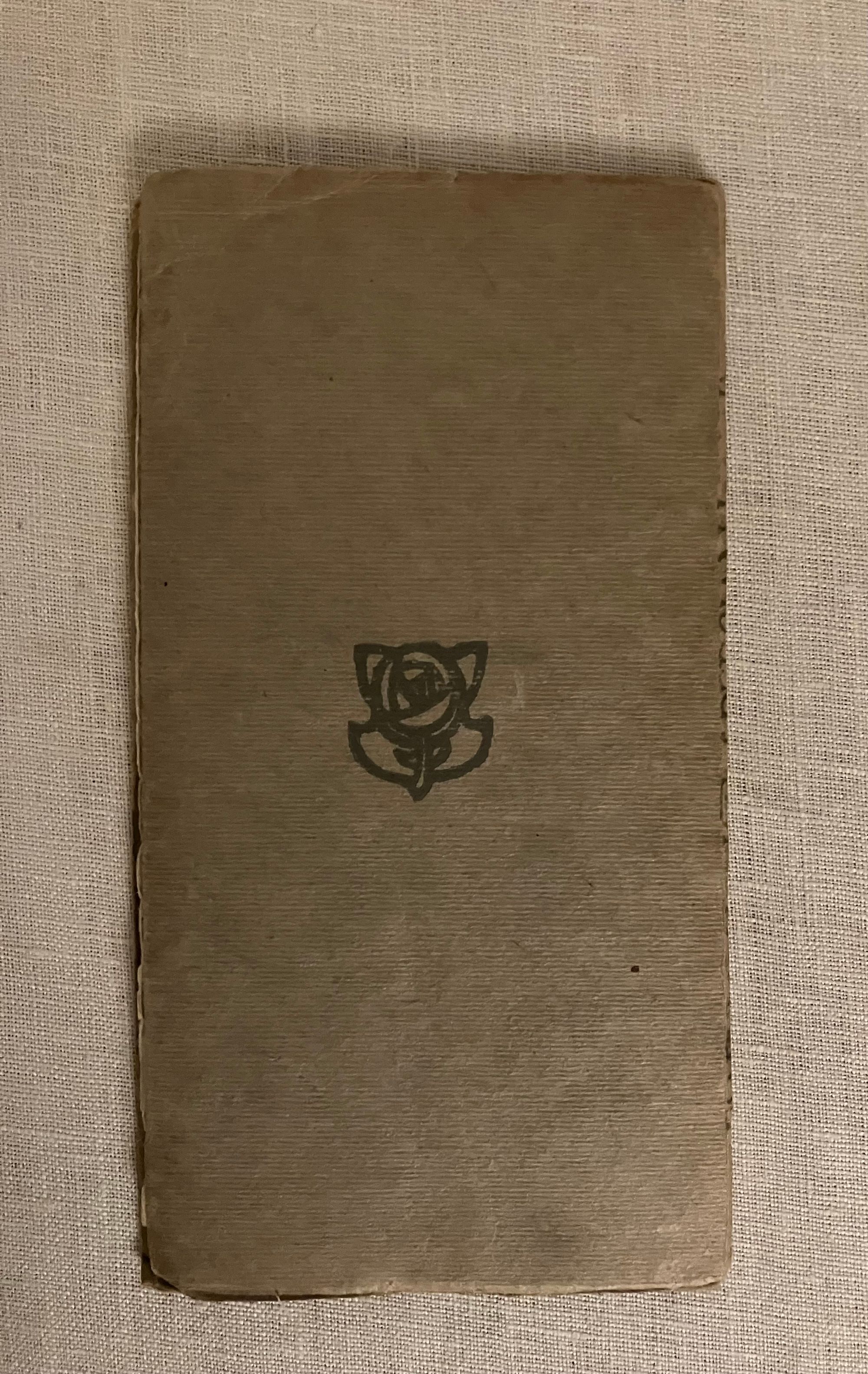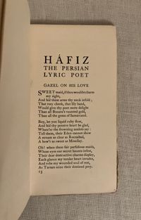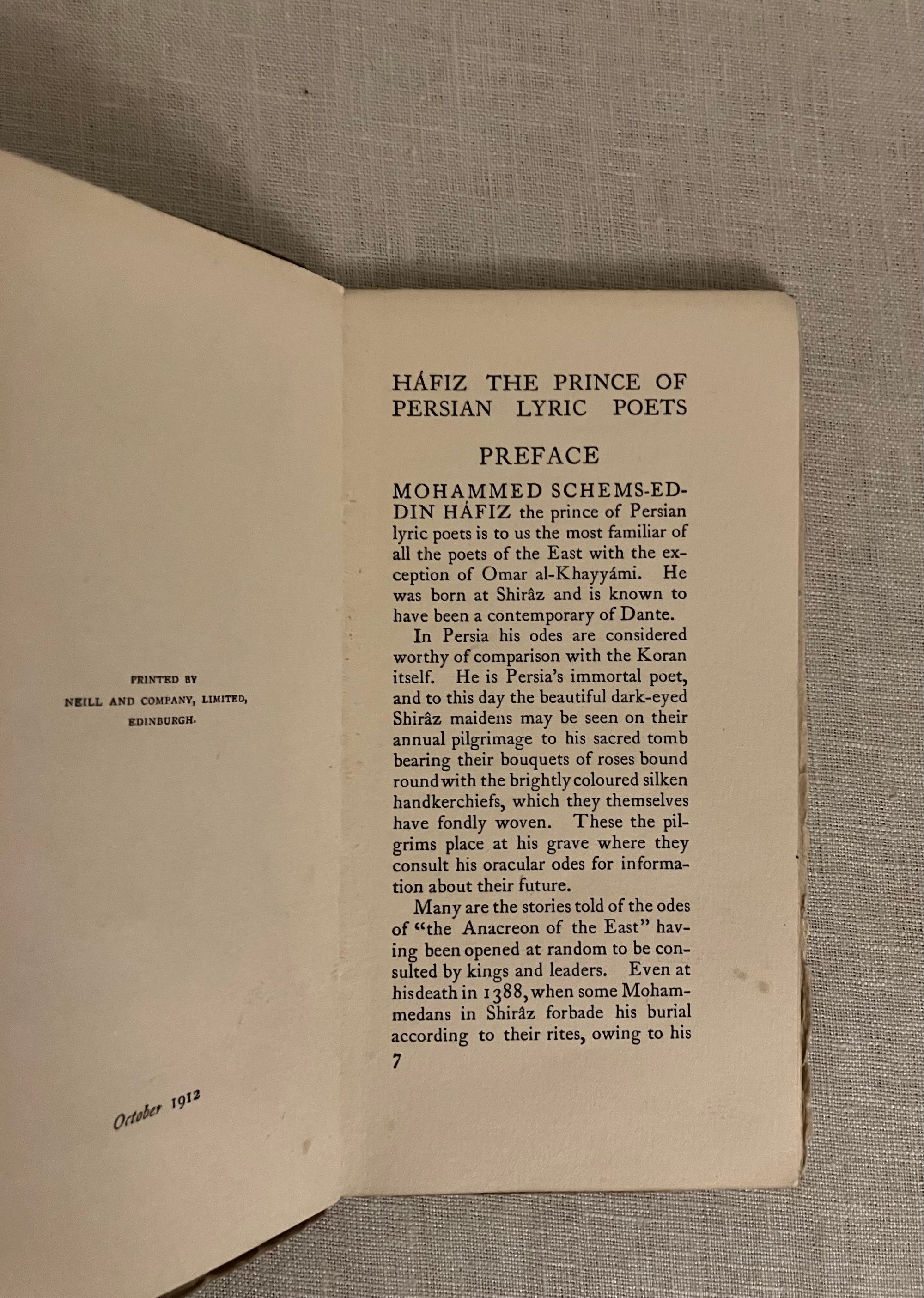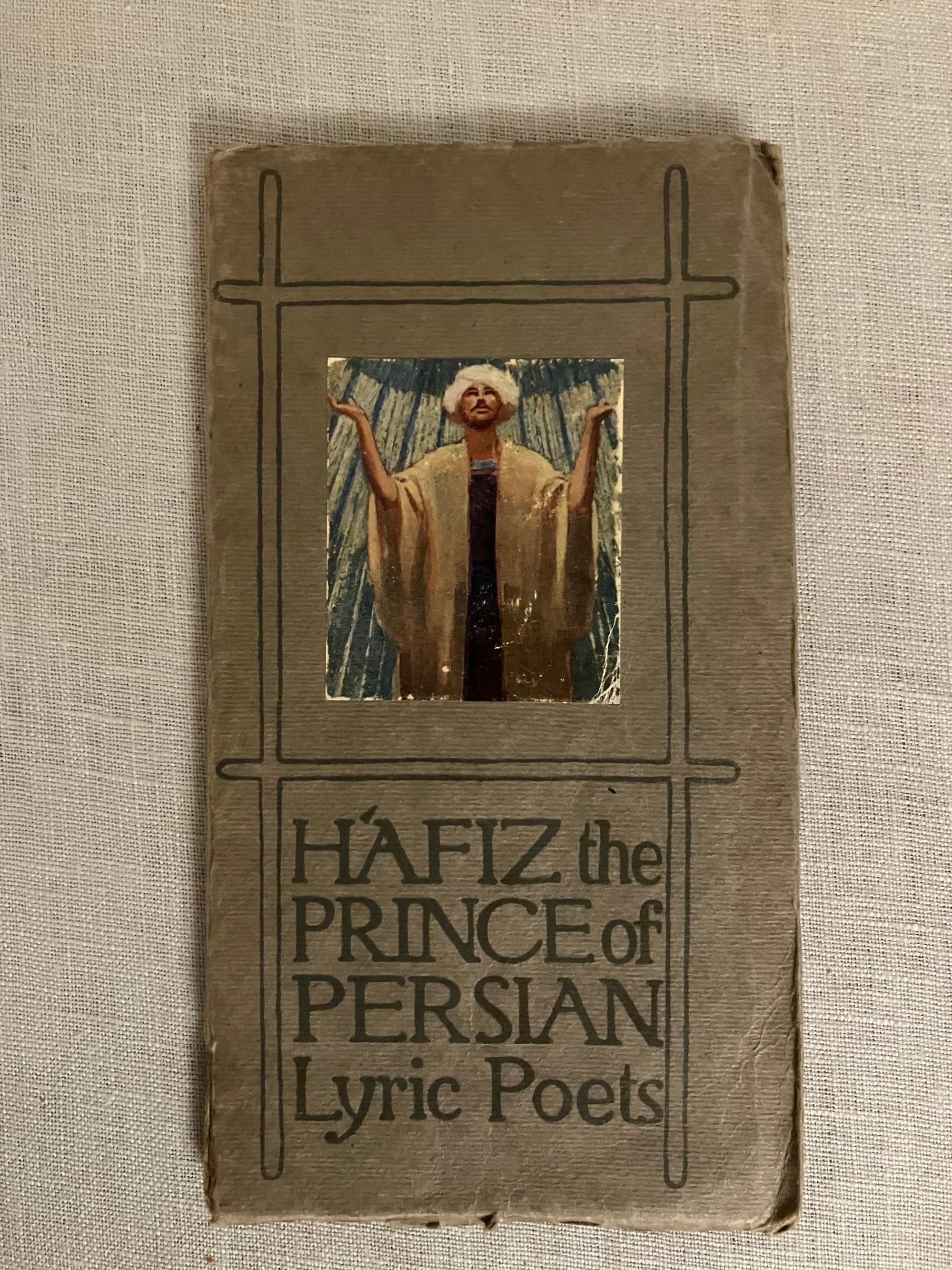 Reprint, (printing dated October 1912.) Soft cover chapbook 16mo, measuring (3 5/8 x 6 3/4 inches), in gray paper wraps over cream art paper, the front of wraps printed with a darker gray frame design enclosing hand lettered titles, and an applied color lithographed cropped version of p. 25 artwork entitled, "Awake, my soul! Pour forth thy praise, to that great bring anthems raise." Rear of wraps printed with a vignette of the Foulis art deco style rose. Contains 5 color illustrations by the ARTIST Frederick Gardner (1882-1968). Gardner was a painter and poster artist born in London's Hackney. 35 [2] pp. including final page publisher's advertising, listing the "Envelope Books," of which there are 17 entries. The cover designs of this series were designed by Glasgow's Jessie M. King. Printed Neill and Company, Edinburgh. CONDITION: Very Good. No foxing, slight soiling The medieval Persian Poet, MOHAMMED SCHEMS-EDDIN HÁFIZ, (d. 1388) was, according to the Preface, born at Shiraz and a contemporary with Dante. Known for his "oracular odes," he nonetheless died a poor man. 14 Odes are included many on the topic of love. Elfick and Harris No.124.