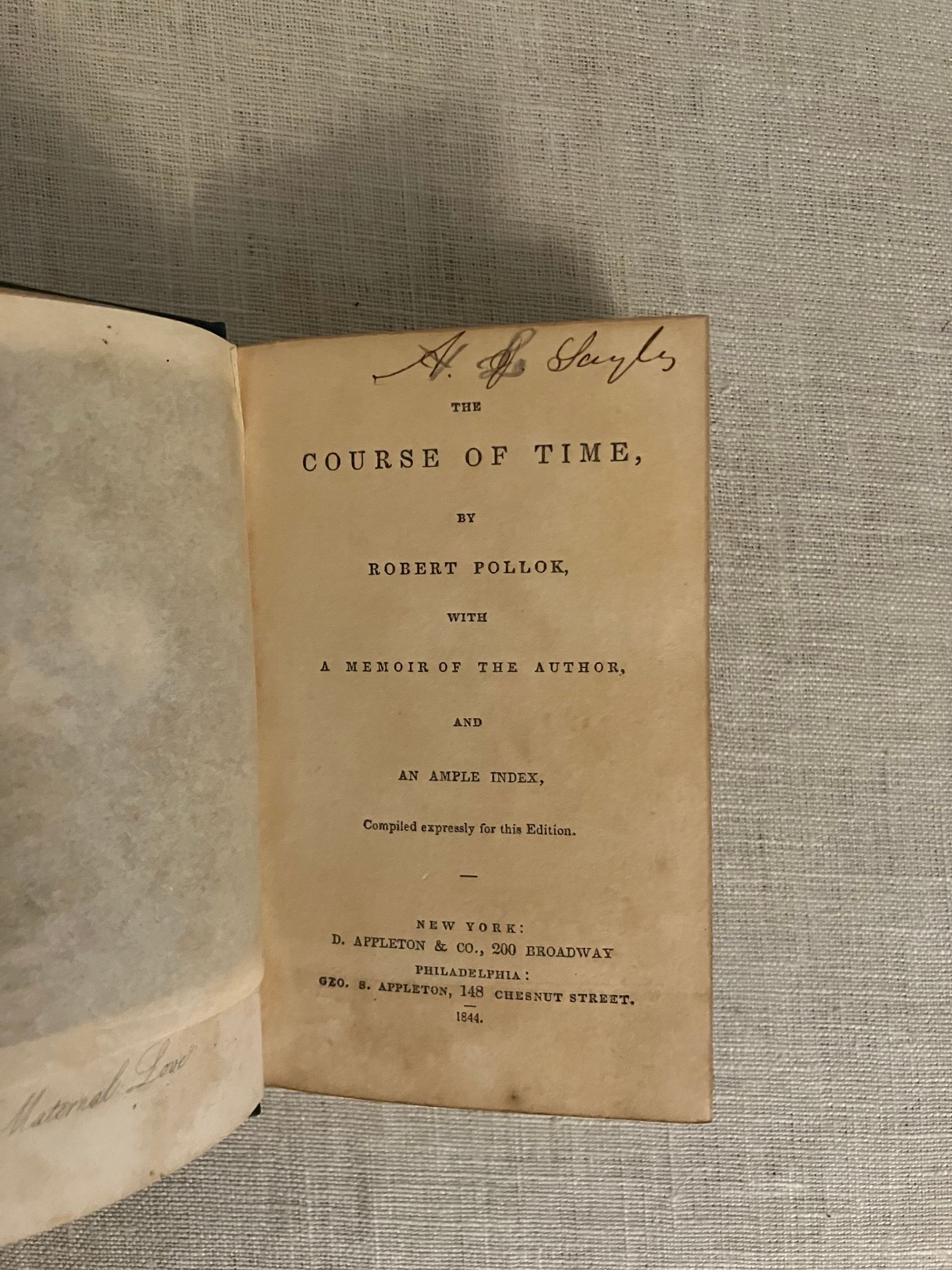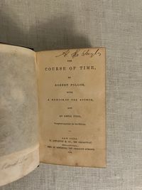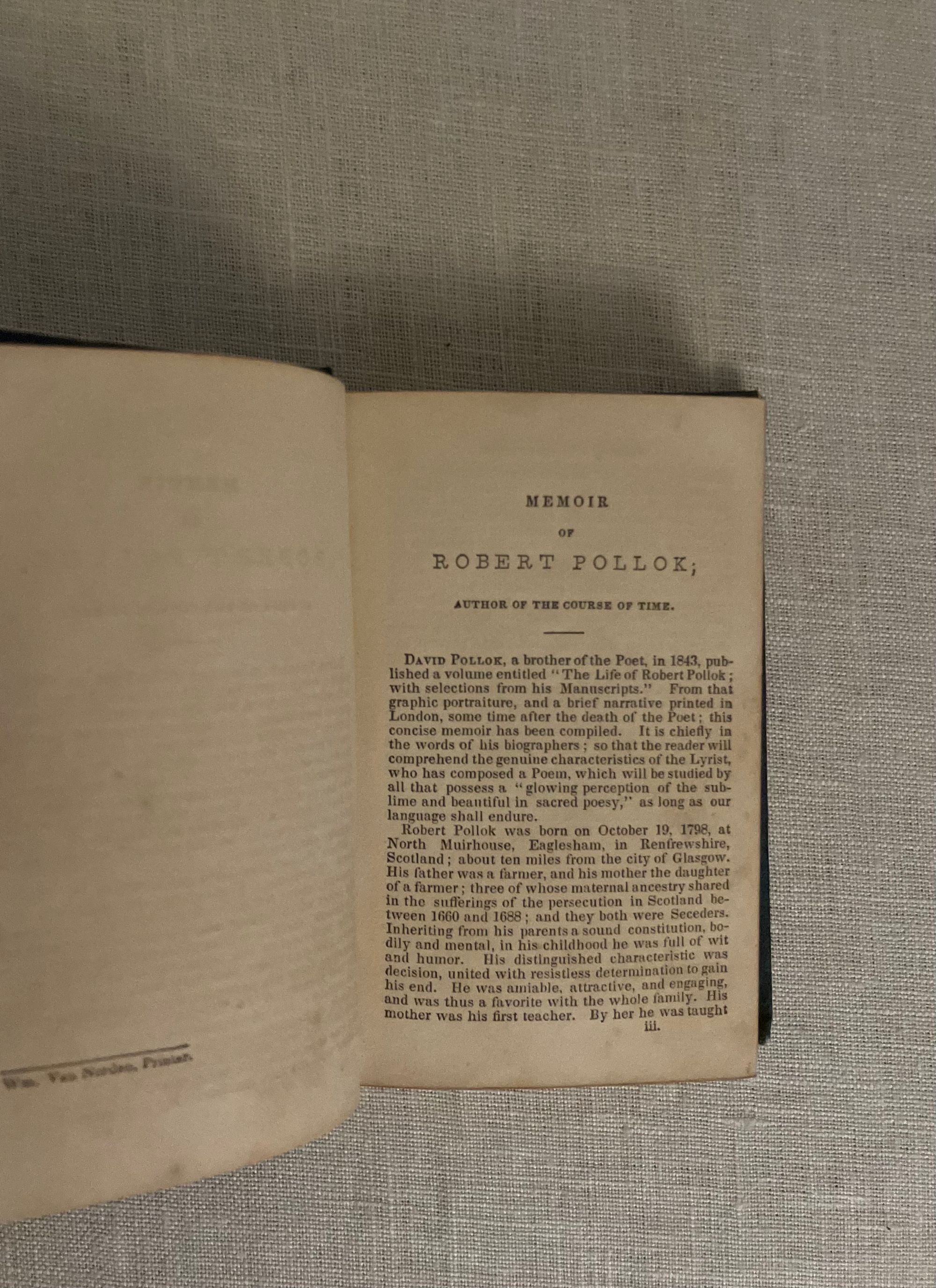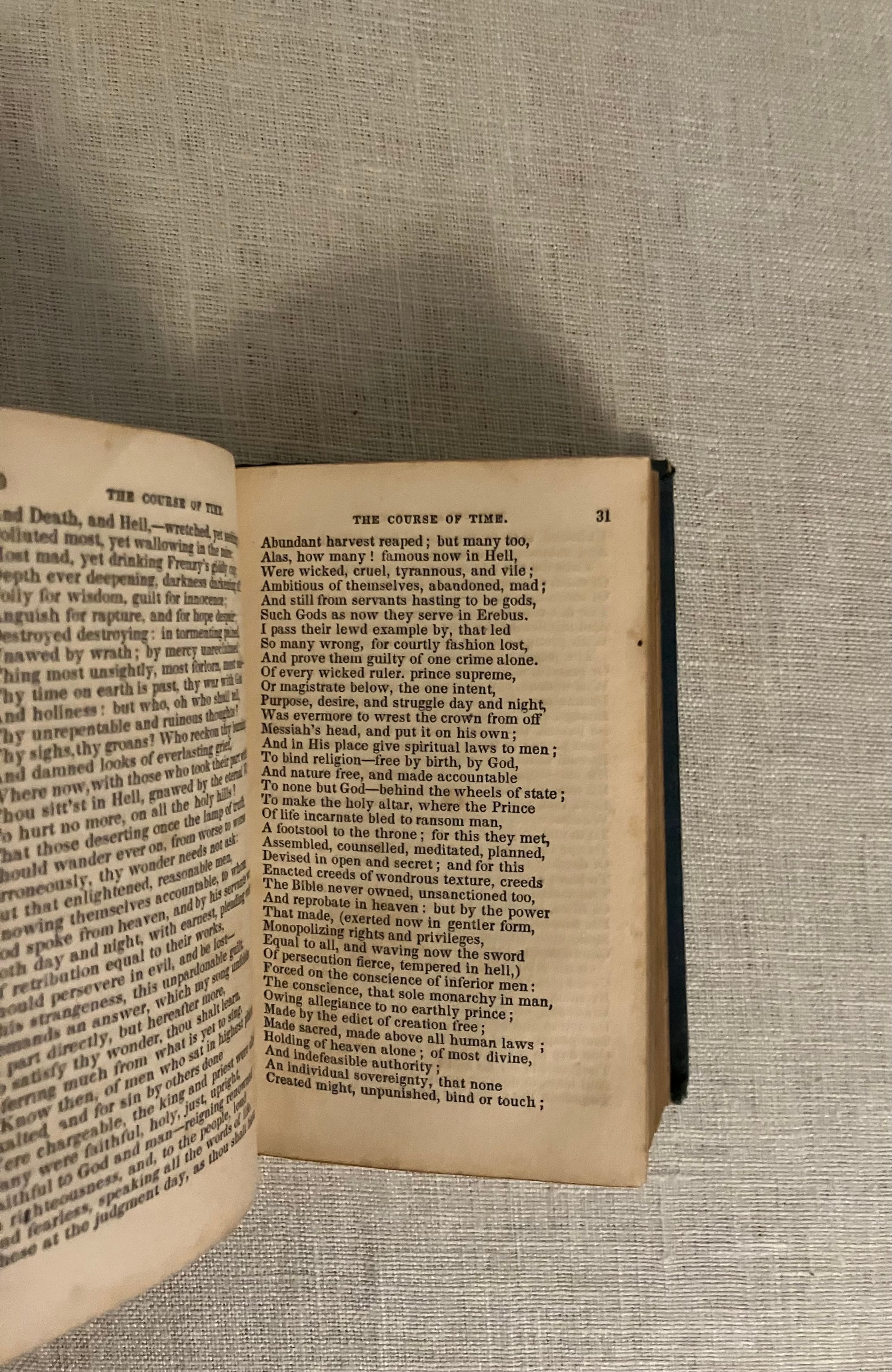 Hard cover , Miniature ( 2 3/4 x 4 1/4 inches) in blue cloth-covered boards blind stamped in an interesting pattern illustrated with birds, squirrels, and festoons, from the center of which hangs a bird on a perch, with chippendale-style corner accents. The title to the spine in gilt with a broad floral band of decoration resembling hops or perhaps grapes, flanked by a frame of ruled lines with dentilated accent. Cream end papers, tissue-guarded frontispiece engraving titled "Maternal Love" William Van Norden, printer. iii-xviii, 233 pp. plus [3, index], plus [4pp.] publisher's ads : "Works Published in Appleton' Miniature Classical Library." CONDITION: Very Good Plus. Font joint with a small separation at midpoint. Discoloration to rear endpapers. Otherwise, a few areas of light foxing and minor soiling, intermittently. Pages mildly age toned.**Originally published 1827, this is Scottish poet Robert Pollock's (1798-1827) most famous work. Edinburgh publisher John Blackwood would release the ten-book poem in blank verse shortly before the poet's death. He is said to have been inspired by the work of Byron, and was much admired by his Edinburgh contemporary, Prof. John Wilson. A farmer's son, who gave up furniture-making to join the church, Pollock was educated variously at the Univ. of Glasgow and Dunfermline but was considered of too feeble health to continue in that vocation. This work went into many editions being popular at the time. DNB , T.W. Bayne, "Robert Pollock," (1900).