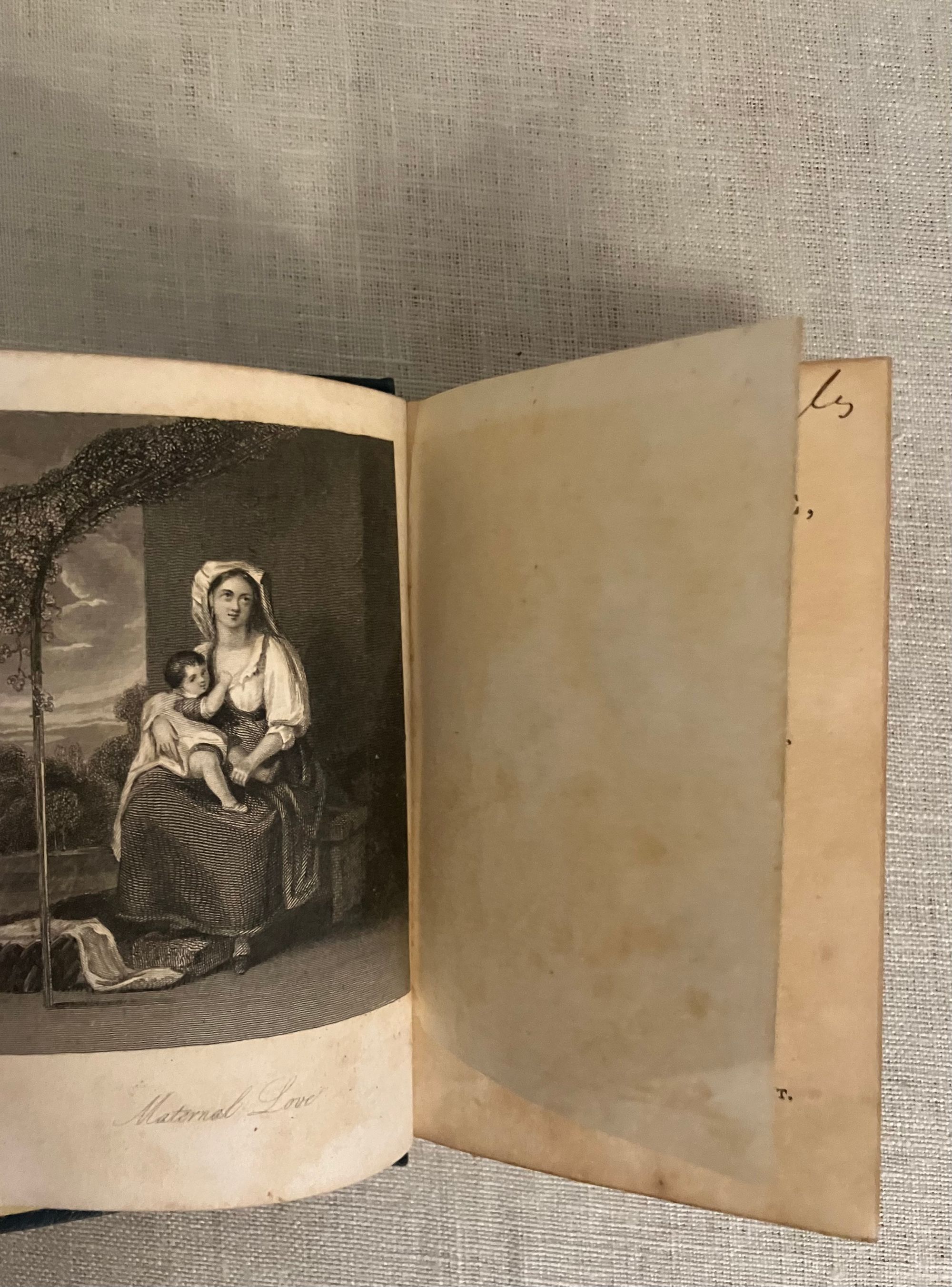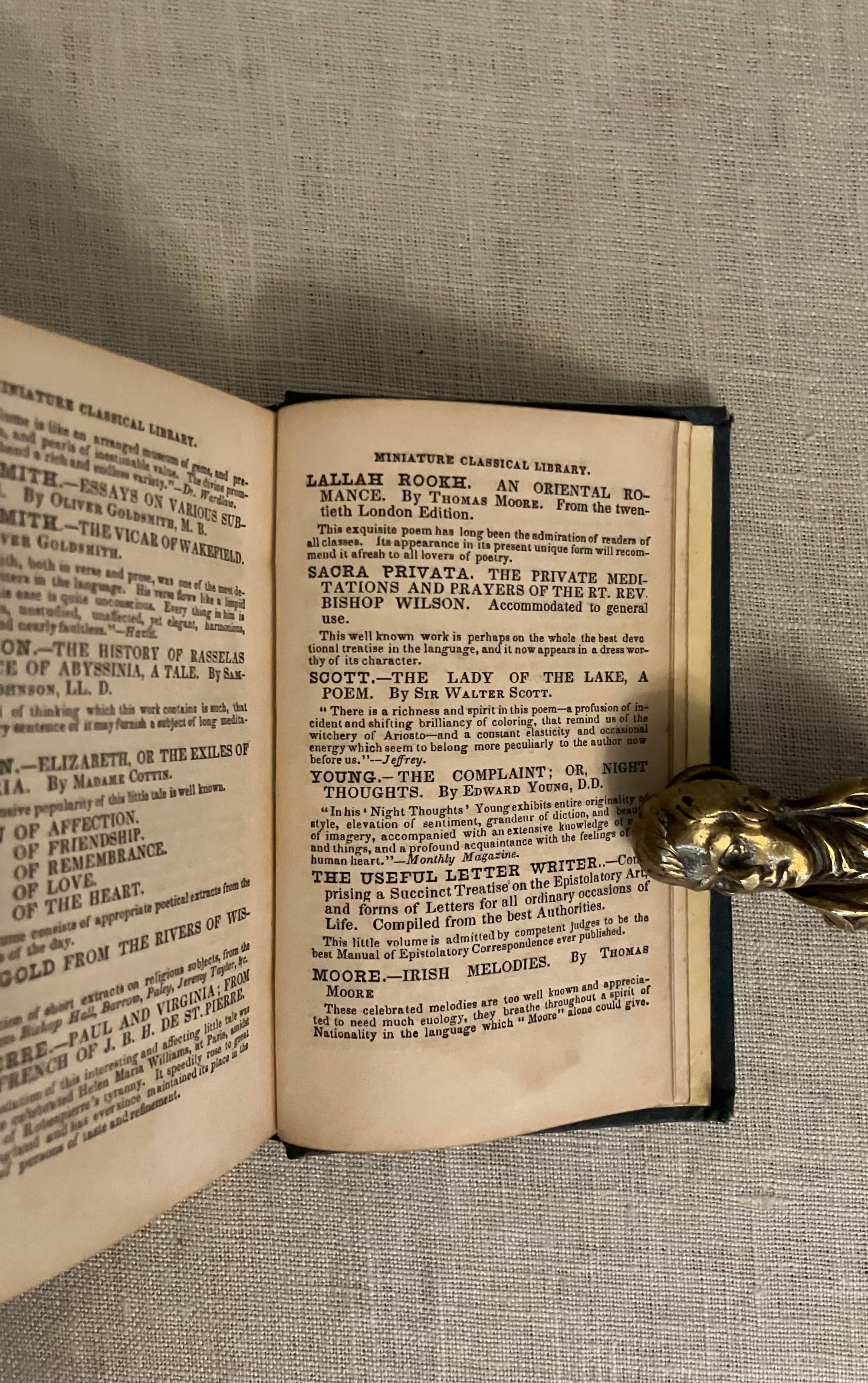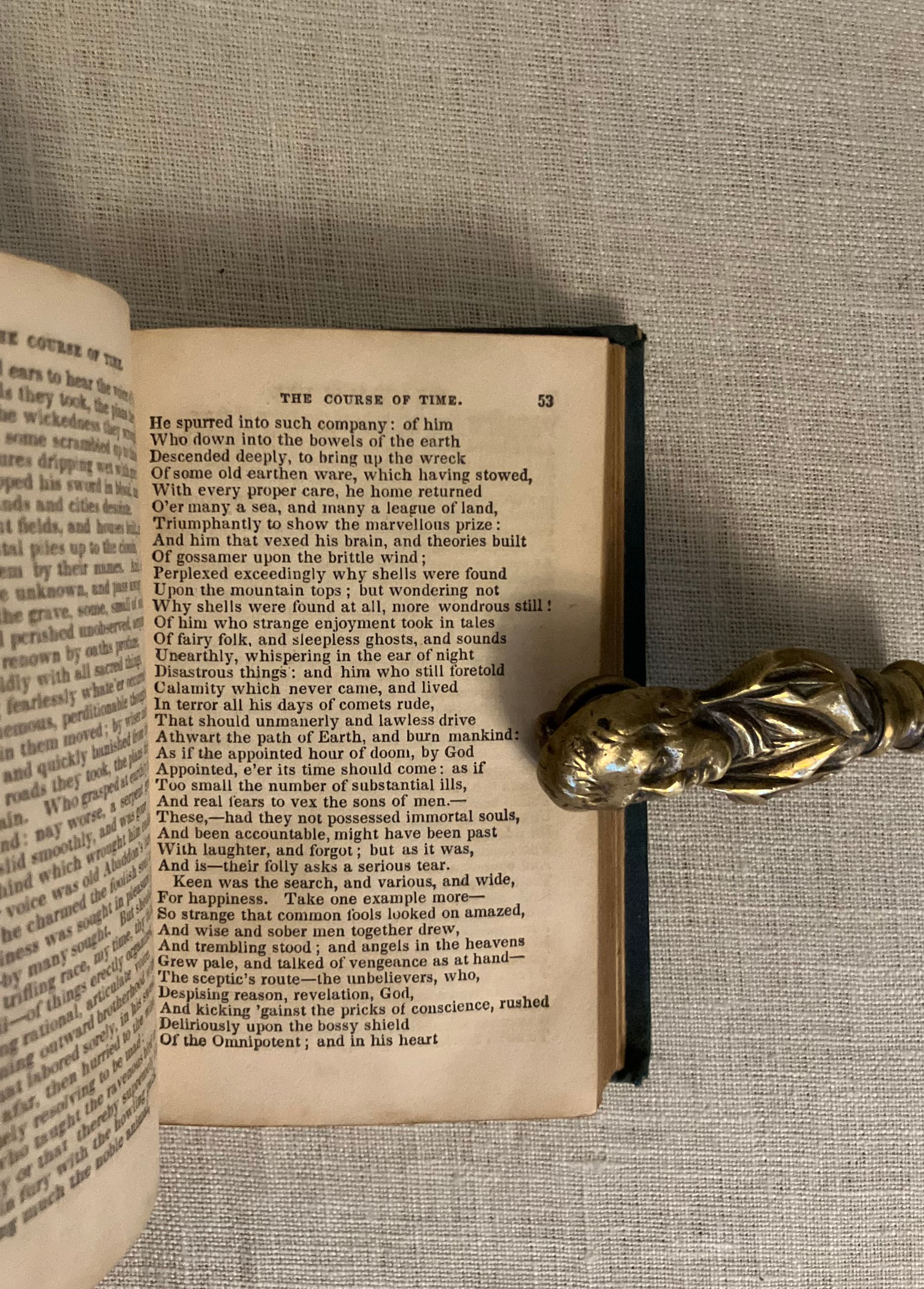 Hard cover , Miniature ( 2 3/4 x 4 1/4 inches) in blue cloth-covered boards blind stamped in an interesting pattern illustrated with birds, squirrels, and festoons, from the center of which hangs a bird on a perch, with chippendale-style corner accents. The title to the spine in gilt with a broad floral band of decoration resembling hops or perhaps grapes, flanked by a frame of ruled lines with dentilated accent. Cream end papers, tissue-guarded frontispiece engraving titled "Maternal Love" William Van Norden, printer. iii-xviii, 233 pp. plus [3, index], plus [4pp.] publisher's ads : "Works Published in Appleton' Miniature Classical Library." CONDITION: Very Good Plus. Font joint with a small separation at midpoint. Discoloration to rear endpapers. Otherwise, a few areas of light foxing and minor soiling, intermittently. Pages mildly age toned.**Originally published 1827, this is Scottish poet Robert Pollock's (1798-1827) most famous work. Edinburgh publisher John Blackwood would release the ten-book poem in blank verse shortly before the poet's death. He is said to have been inspired by the work of Byron, and was much admired by his Edinburgh contemporary, Prof. John Wilson. A farmer's son, who gave up furniture-making to join the church, Pollock was educated variously at the Univ. of Glasgow and Dunfermline but was considered of too feeble health to continue in that vocation. This work went into many editions being popular at the time. DNB , T.W. Bayne, "Robert Pollock," (1900).