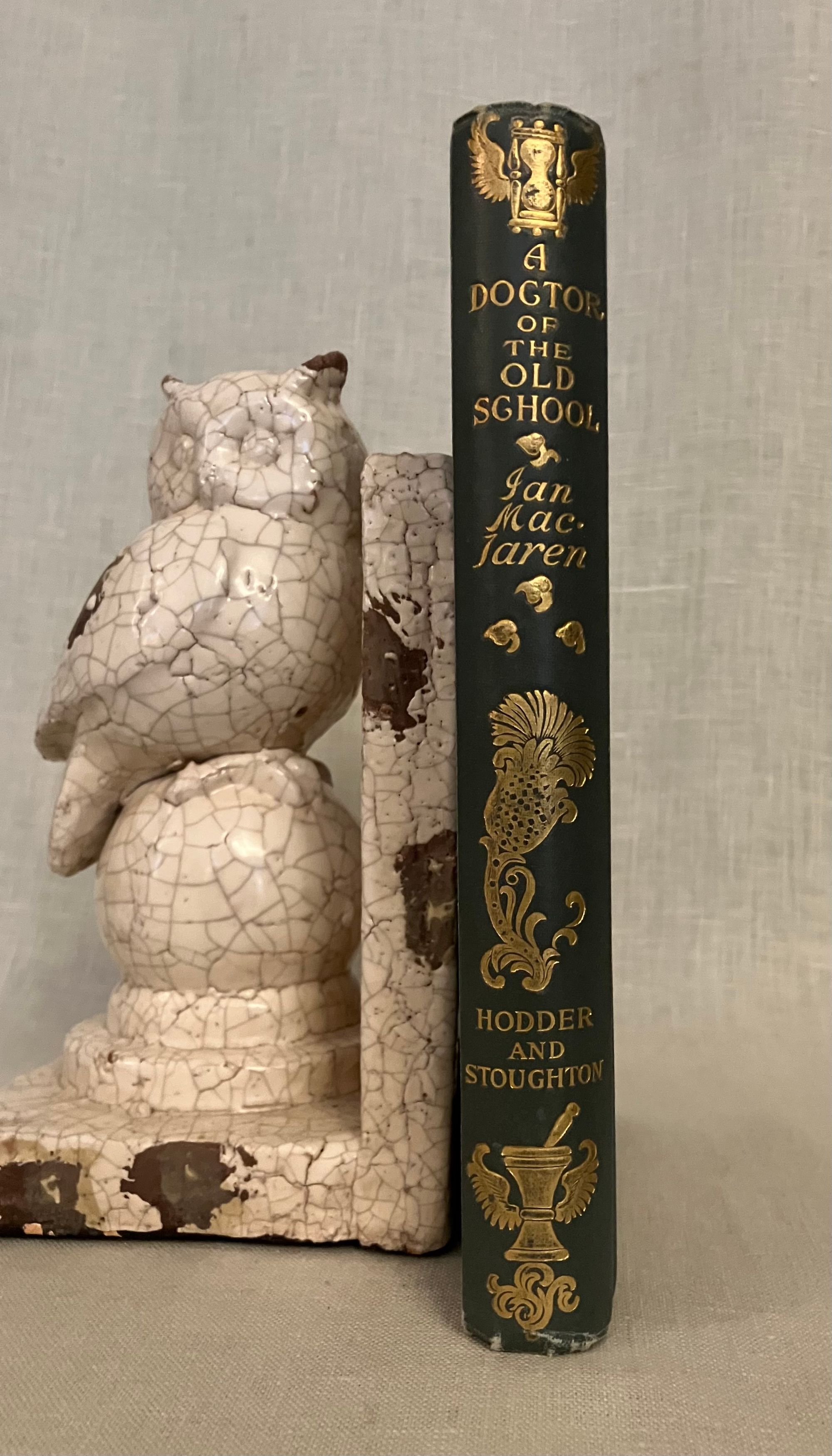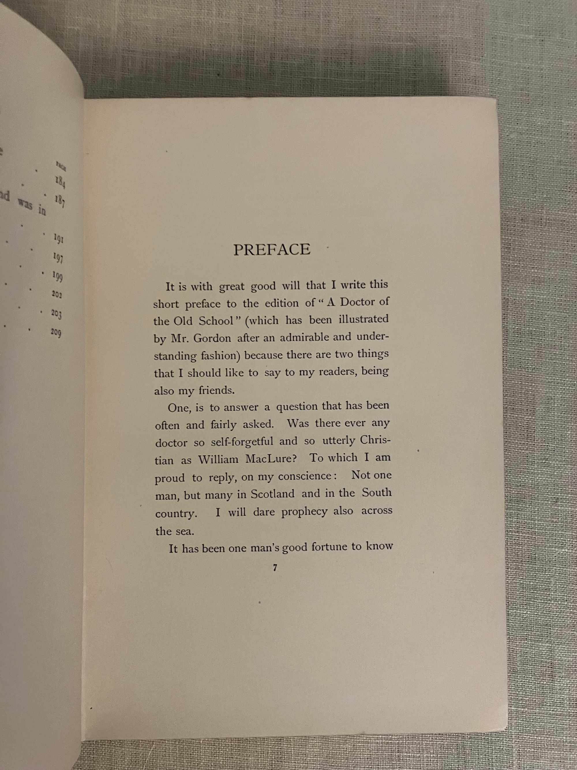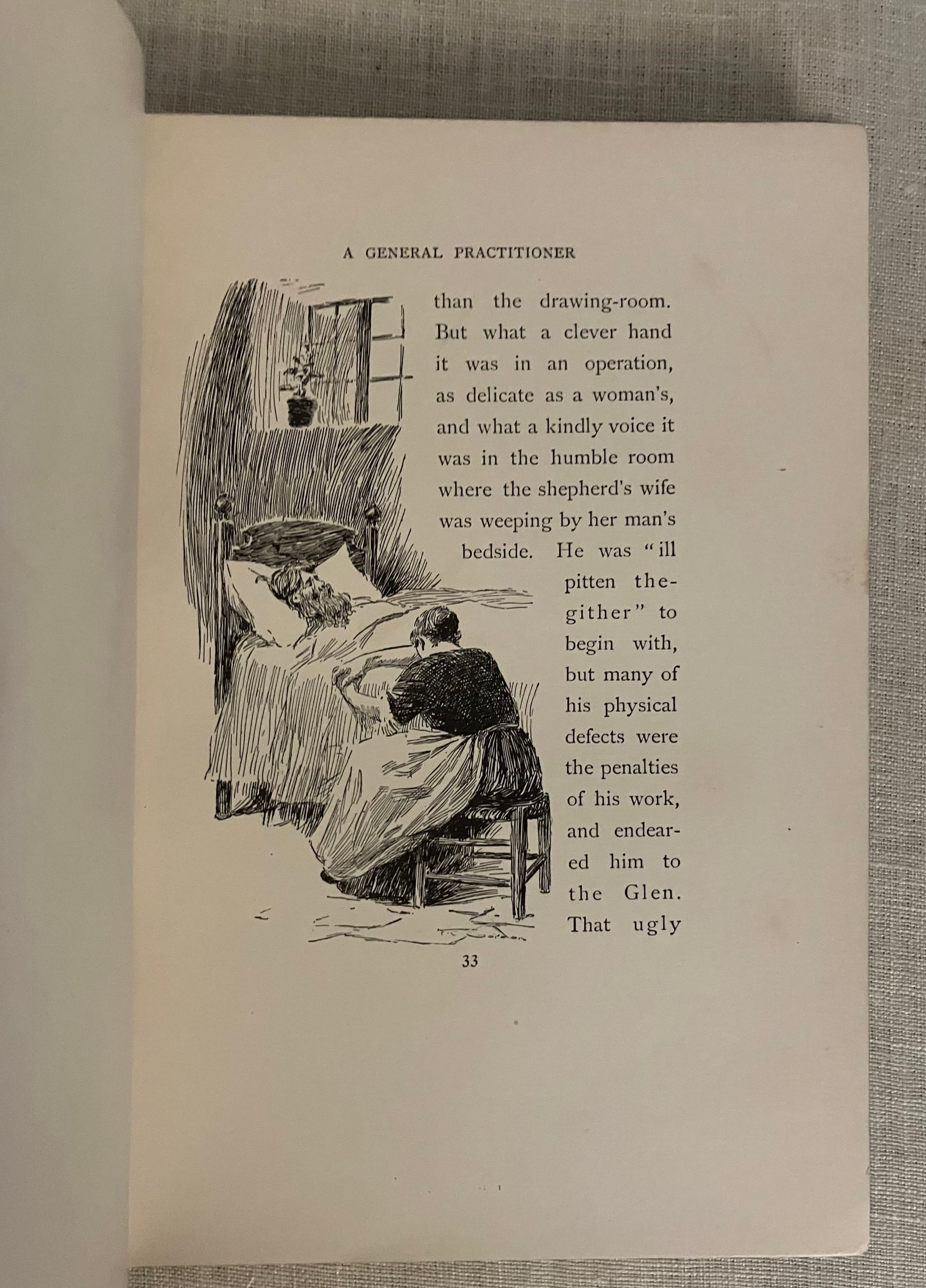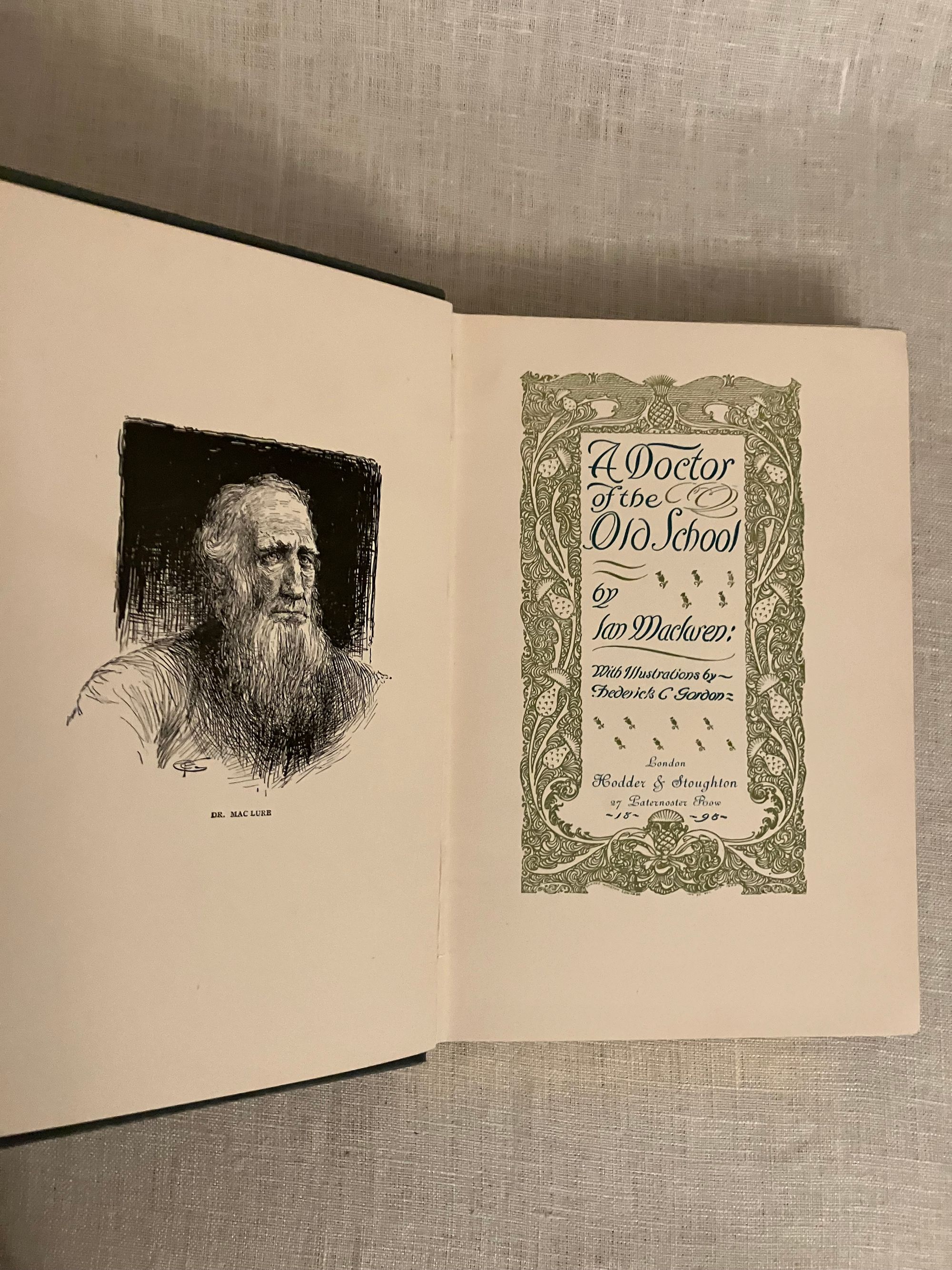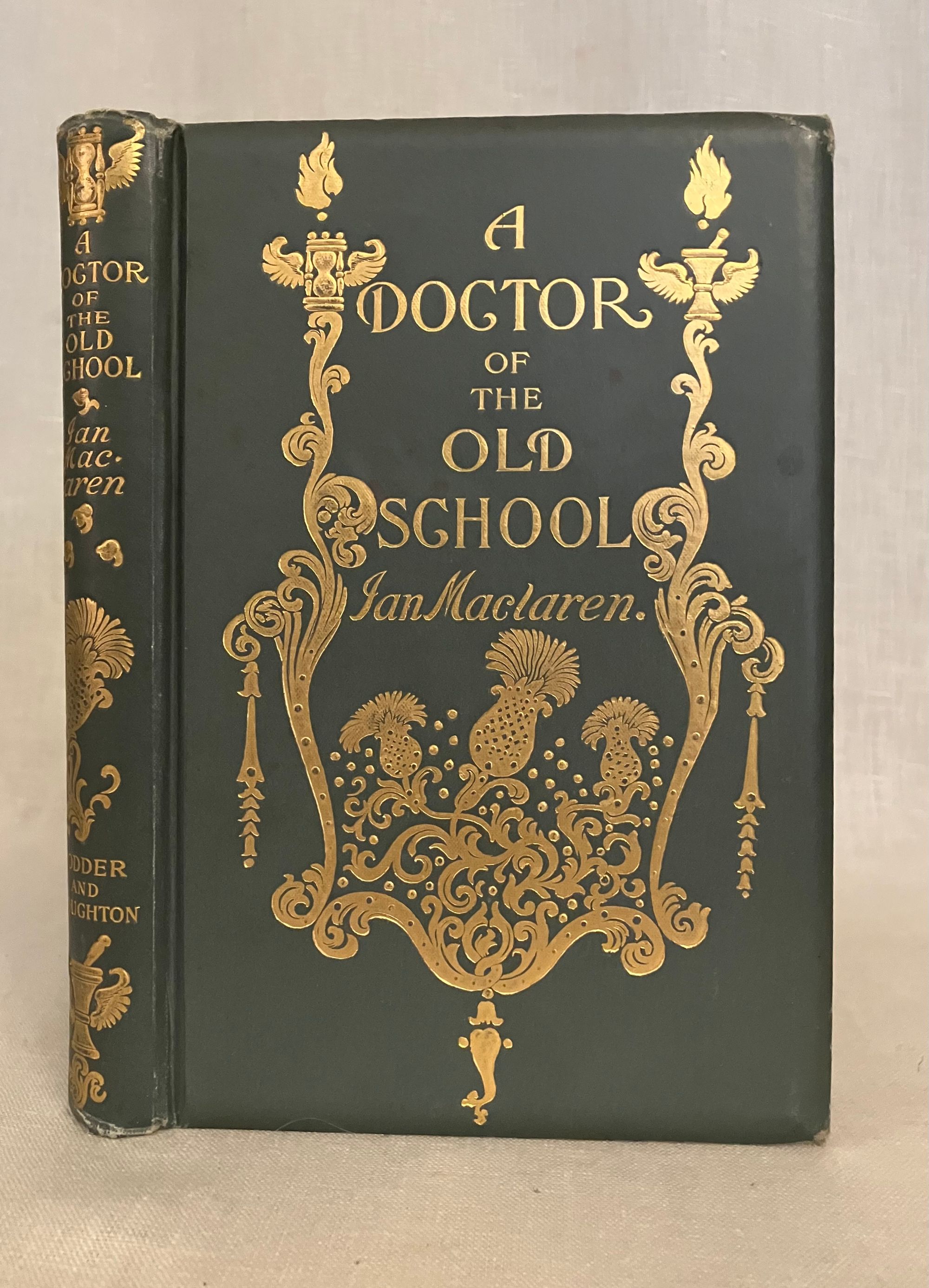First Edition. Hard cover, crown 8vo, (5 1/2 x 8 inches) in light blue cloth gilt with decorative festoons featuring a winged mortar and pestle, hour glass and pineapples framing the hand lettered title. Extensive decoration to the spine in similar motifs. Beveled edged boards. Frontispiece portrait of the subject faces the two-color illustrated arts and crafts style bordered title page, printed harmoniously in blue and green by the Caxton Press, New York. Contains 56 black and white line illustrations by noted Canadian book artist Frederick C. Gordon (1856-1924). **CONDITION: Very Good. Rear hinge partly cracked. Some corner wear seen at tips, head and foot of spine. However, the gilt decoration to boards remains bright. a few spots of minor soiling to boards, not easily seen. Lacking tissue guard to frontispiece portrait; replacement laid in. **This somewhat sentimental novel about Scottish village life features country physician, Dr. Weelum MacLure, "the Doctor of Drumtochty," a slightly decrepit figure who travels on his appointed rounds via horse, without regard to snow, rain or personal discomfort, to nobly attend to the tenant farmers and others in his care. Lots of Scots dialect will have you speaking like a native in no time. **AUTHOR Ian MacLaren (1850-1907) was the pseudonym of John Watson, educated at Edinburgh, and a minister of the Free Church of Scotland. He has been noted a prime example of the so-called "kailyard school " of Scottish literature, by critics. In addition to his popular novels, he wrote a number of books on religious topics. He was invited to lecture at Yale University the year after publication of this novel. A "Cranford style" illustrated gift book in the vein of the contemporary Macmillan /Hugh Thomson et al illustrated editions. A really good read.