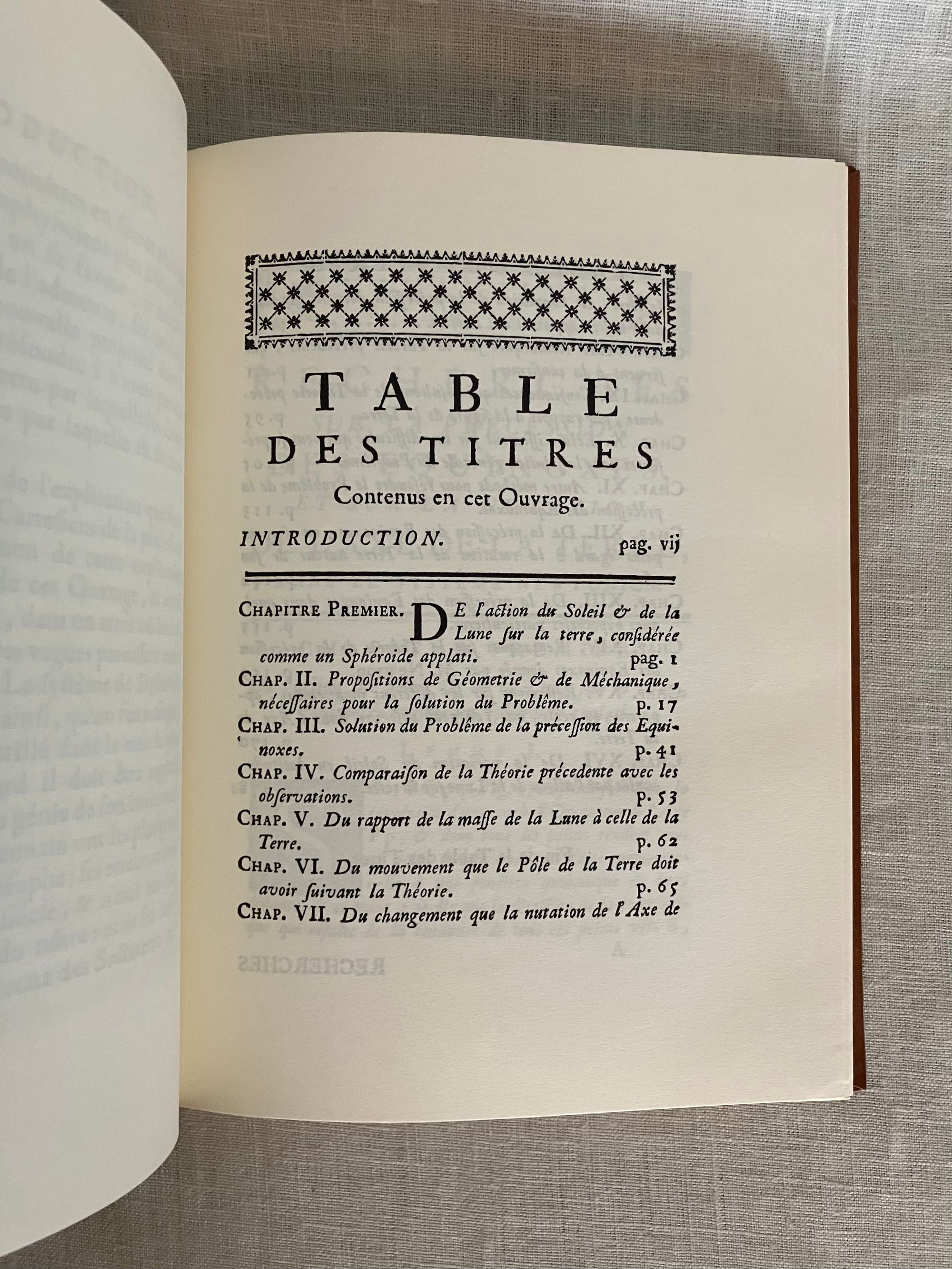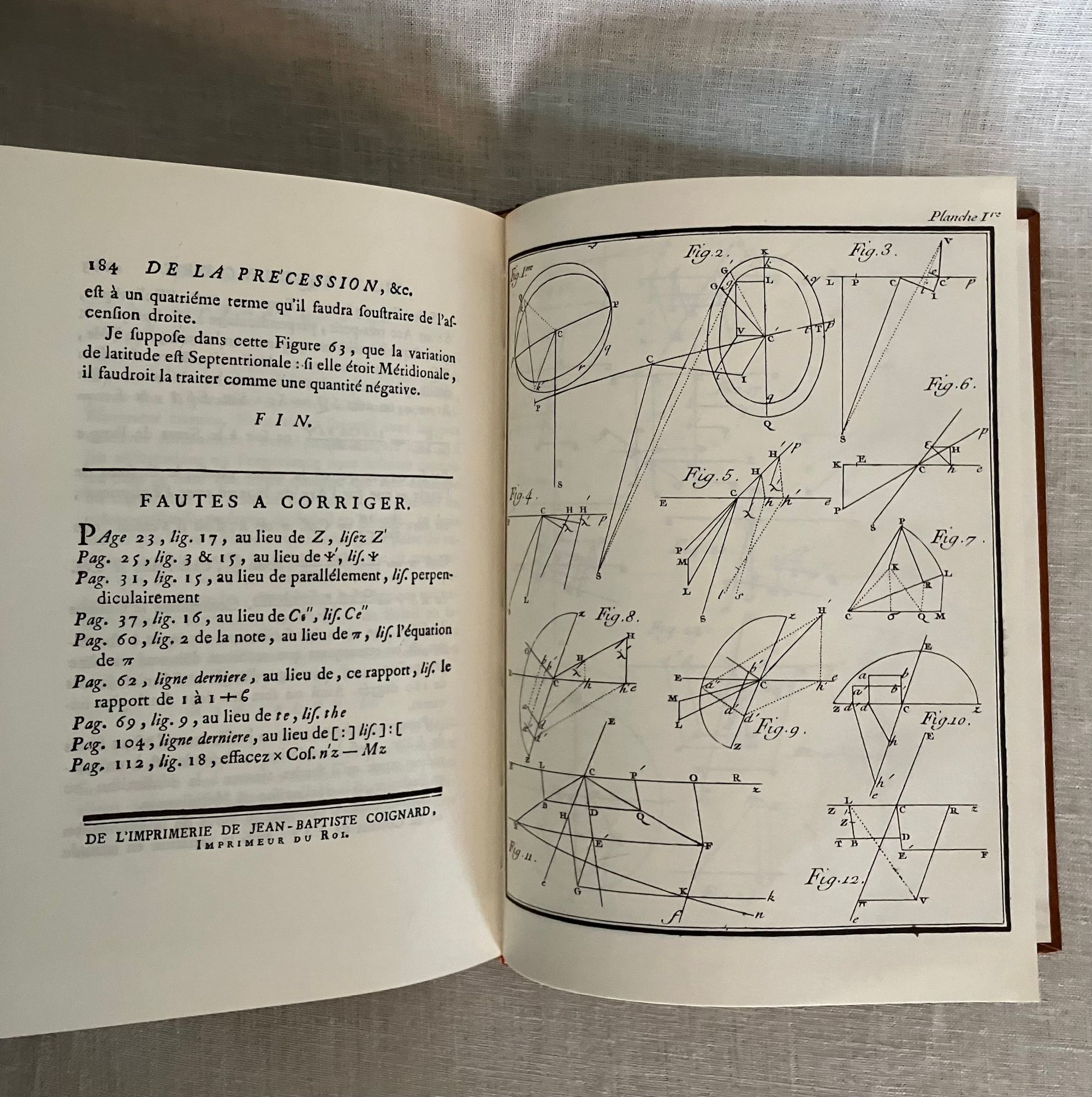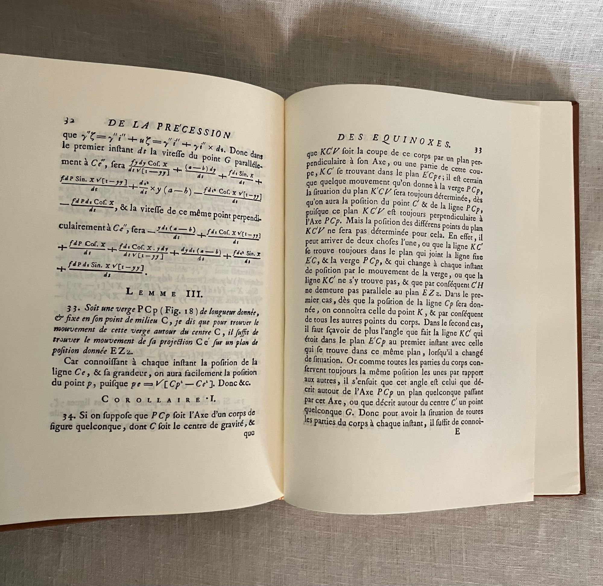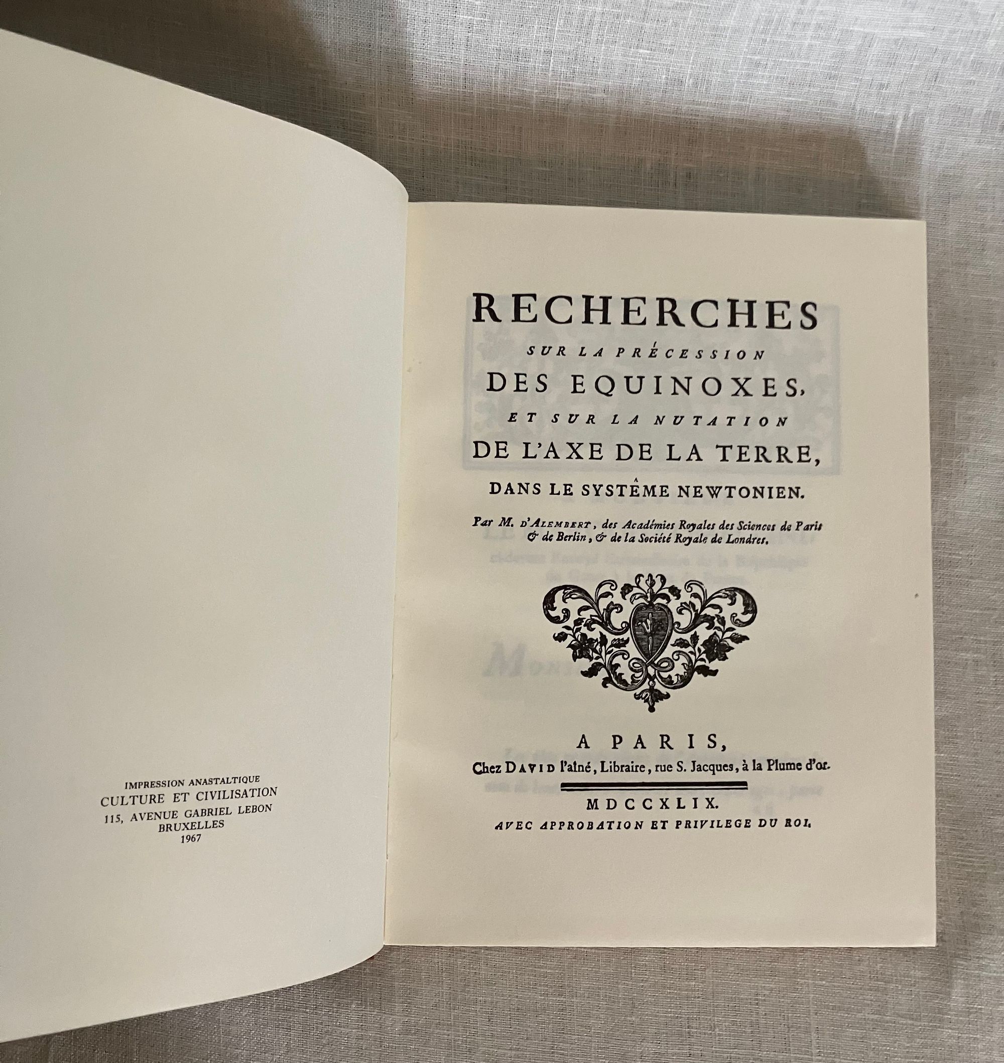 French text. Facsimile of the 1749 first edition. Hard cover, 8vo. Collation: [4], xxxviii,184 [8] pp. In publisher's brown cloth binding with faux spine labels lettered in silver. With four full-page reproduction plates. CONDITION: Fine. Very lightly bumped bottom corners. Ghost of a pencil mark to front free endpaper. ** A pleasing facsimile of d'Alembert's study of the "wobble" of the Earth on its axis, causing a change in the position of the sun seen during the Spring Equinox. ** Jean-Baptiste le Rond d'Alembert (1717-1783) was a French mathematician, and physicist, as well as being a co-editor of Diderot's famous "Encyclopédie" (1751-1772). He is most famous for his contributions to algebra (the "fundamental theorem of algebra") and physics (the "wave equation"). In this work, he gives a detailed explanation as to the motion of the Earth, and its effect on our observation of the Spring Equinox (with charts at the end to make sure you're following). An affordable way to own one of the great works of physics and astronomy. REF: Original work, BnF No.12148, bpt6k1521937c. (Paris: Chez David l'aîné, Libraire, Jean-Baptiste Coignard, Printer, 1749.)