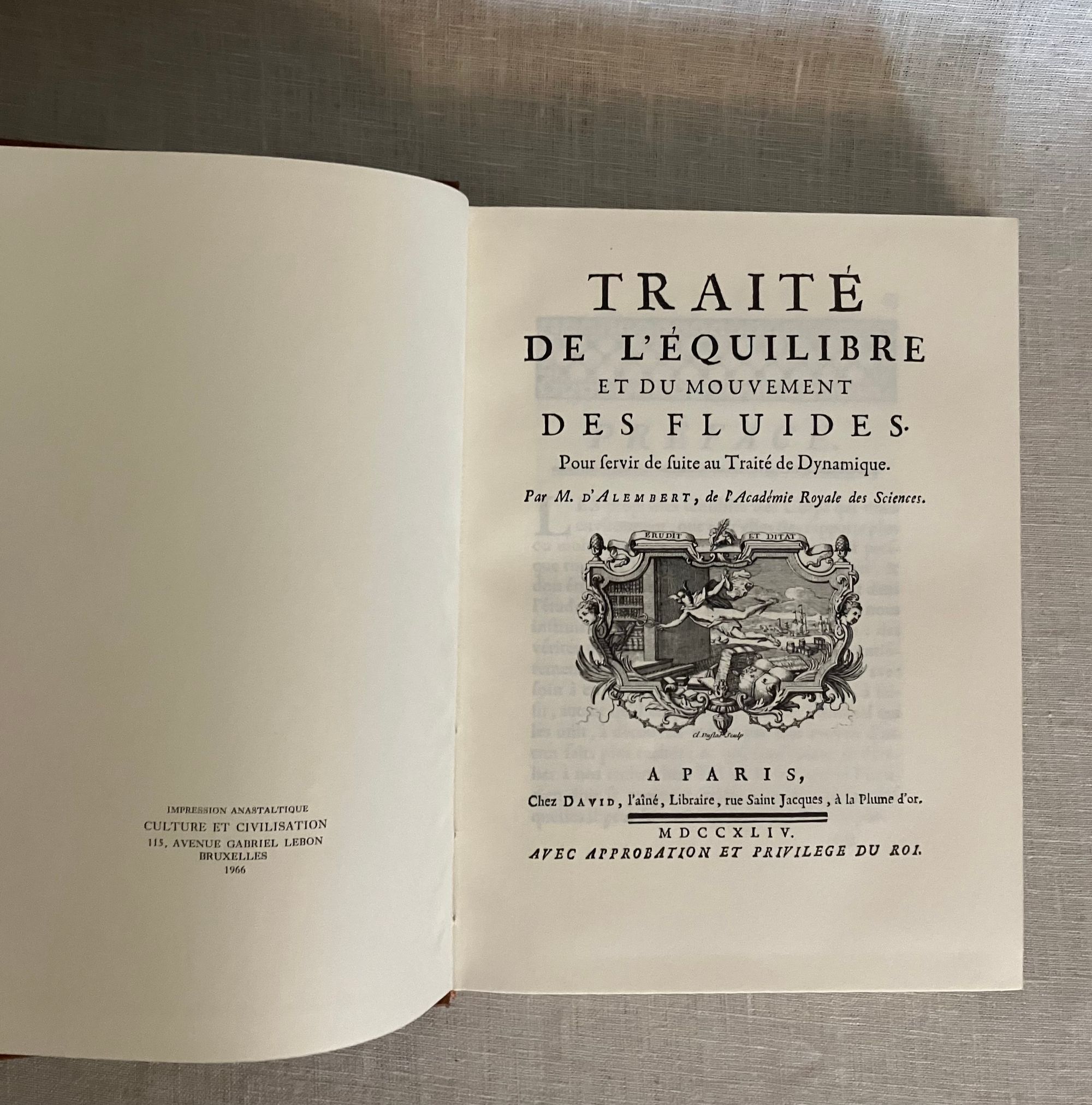 French text. Facsimile of the 1744 first edition. Hard cover, 8vo. Collation: [2], xxxii, [8], 458 [26] pp. In publisher's brown leatherette binding with faux spine labels in red, blocked titles in silver. With ten full-page reproduction plates. CONDITION: Fine. Bright, clean and fresh. Ghost of a pencil mark to front free endpaper. ** A pleasing facsimile of d'Alembert's study of fluid mechanics. ** Jean-Baptiste le Rond d'Alembert (1717-1783) was a French mathematician, and physicist, as well as being a co-editor of Diderot's famous "Encyclopédie" (1751-1772). He is most famous for his contributions to algebra (the "fundamental theorem of algebra") and physics (the "wave equation"). ** In this work, he outlines a general approach to the mathematical study of fluid mechanics. REF: Original work from 1744: BnF No. 12148. (Paris: Chez David, l'aine, Libraire, Jean-Baptiste Coignard, Printer, 1744.)