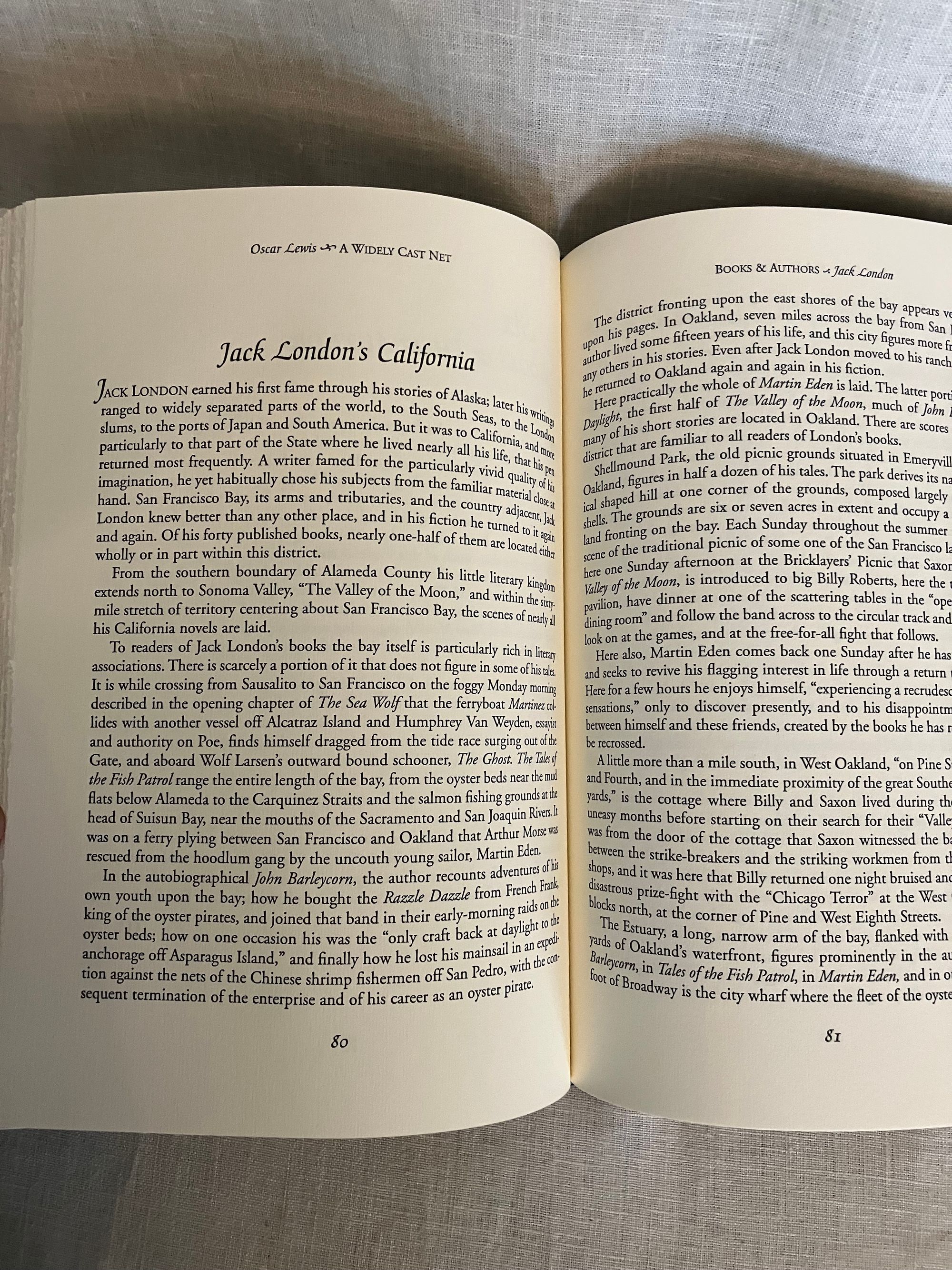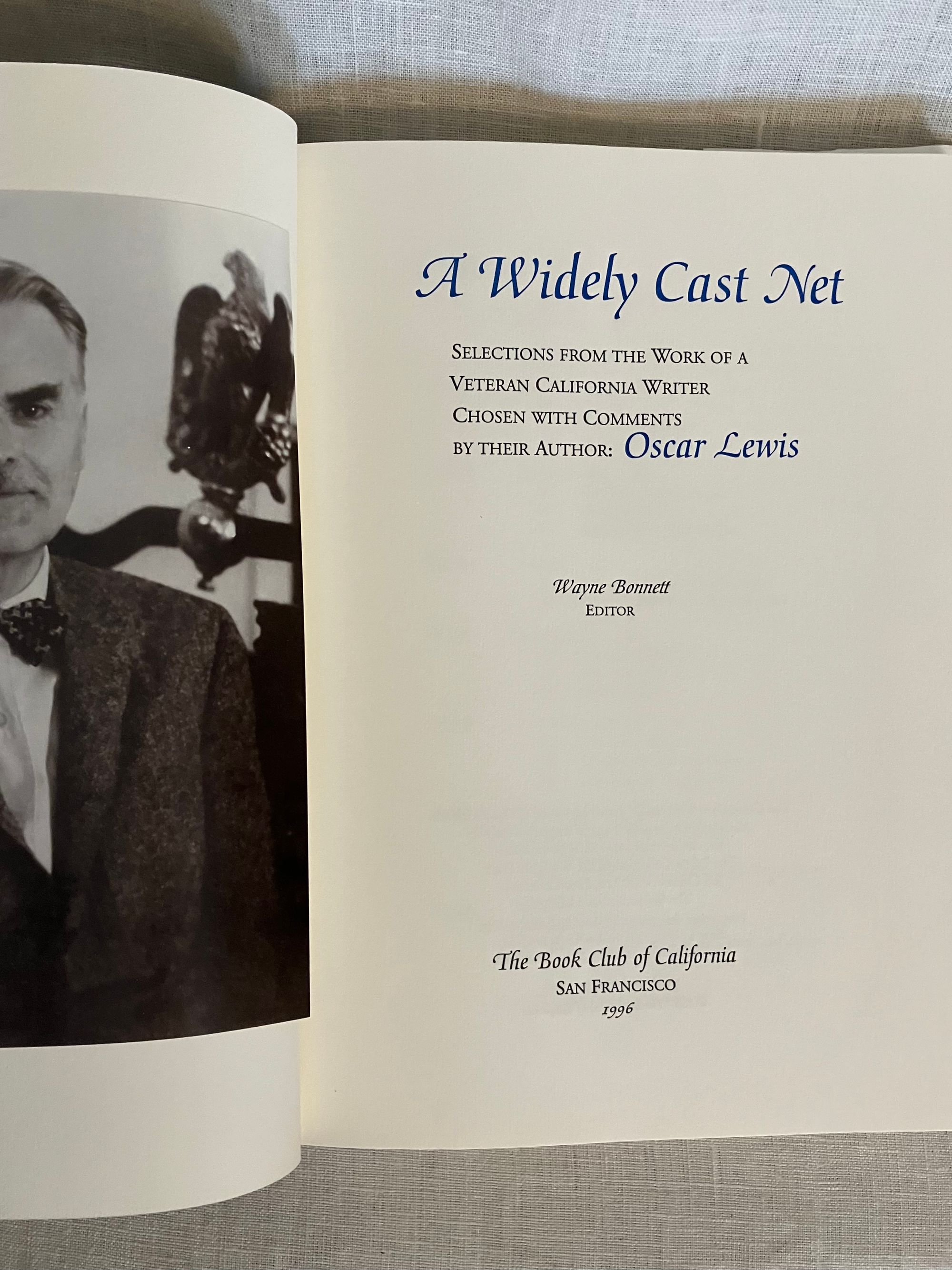 Hard cover, 4to, in quarter blue silk-like cloth over light stone paper covered boards, titles in blue to the front board and in silver to the spine. In orig. plain white d/j. Book design and printing by Susan Acker at The Feathered Serpent Press and Anchor & Acorn Press. Bookbinder Cardoza-James. Limited edition 400 copies. CONDITION: Fine, in a Near Fine d/j. ***American Author Oscar Lewis (1893-1992) journalist, novelist and publisher, was a founder member of the Book Club of California, in whose name awards for works of history and the book arts are still granted annually. This anthology of his writings includes reminiscences, several short stories, columns and travel writing, literary criticism, as well as selections from several books. The pieces are excerpted from the "Atlantic Monthly, "The New Republic," "The Outlook," "Boy's Life" and "The Argonaut," among other magazines. The book excerpts come from " Bonanza Inn" and his best-selling history about the advent of California's Central Pacific Railroad ,"The Big Four." This is Publication No. 205 of the Book Club of California.