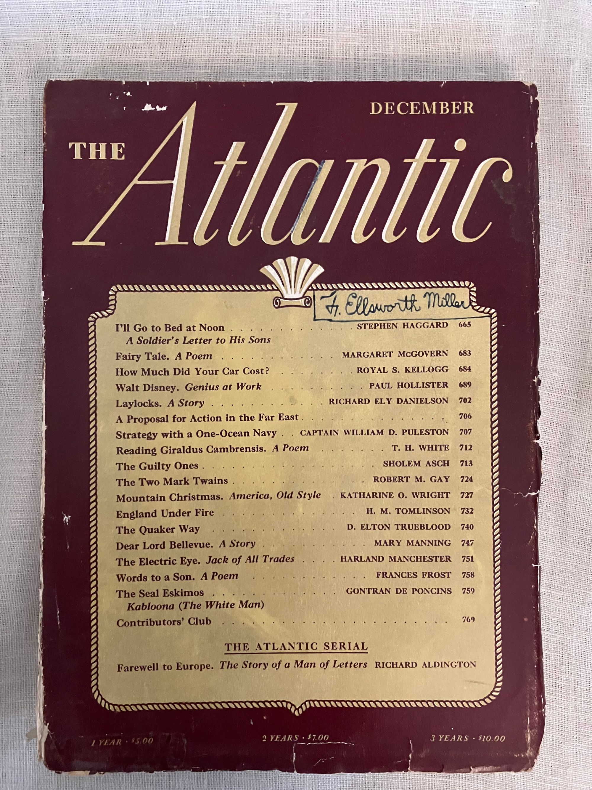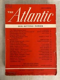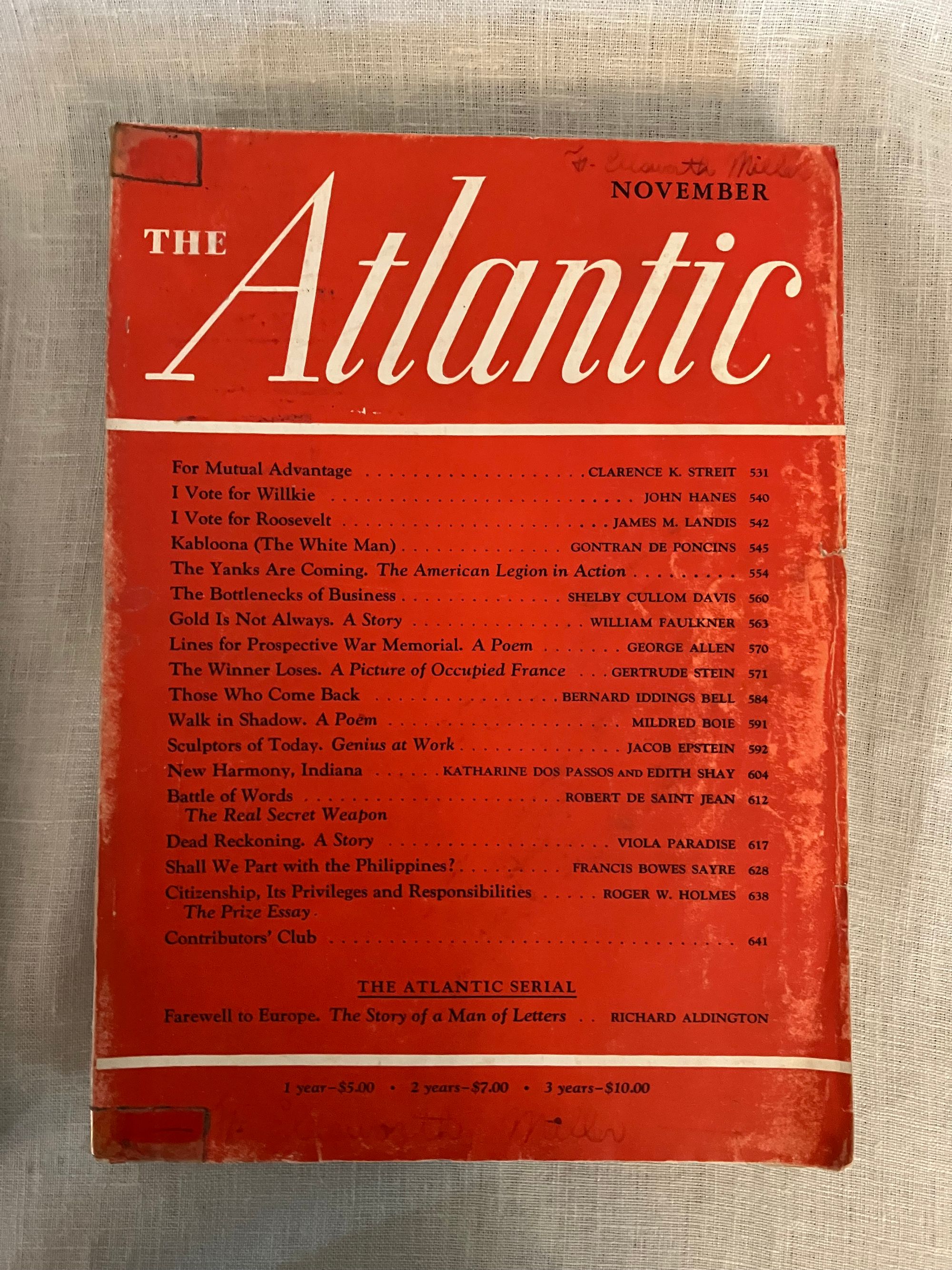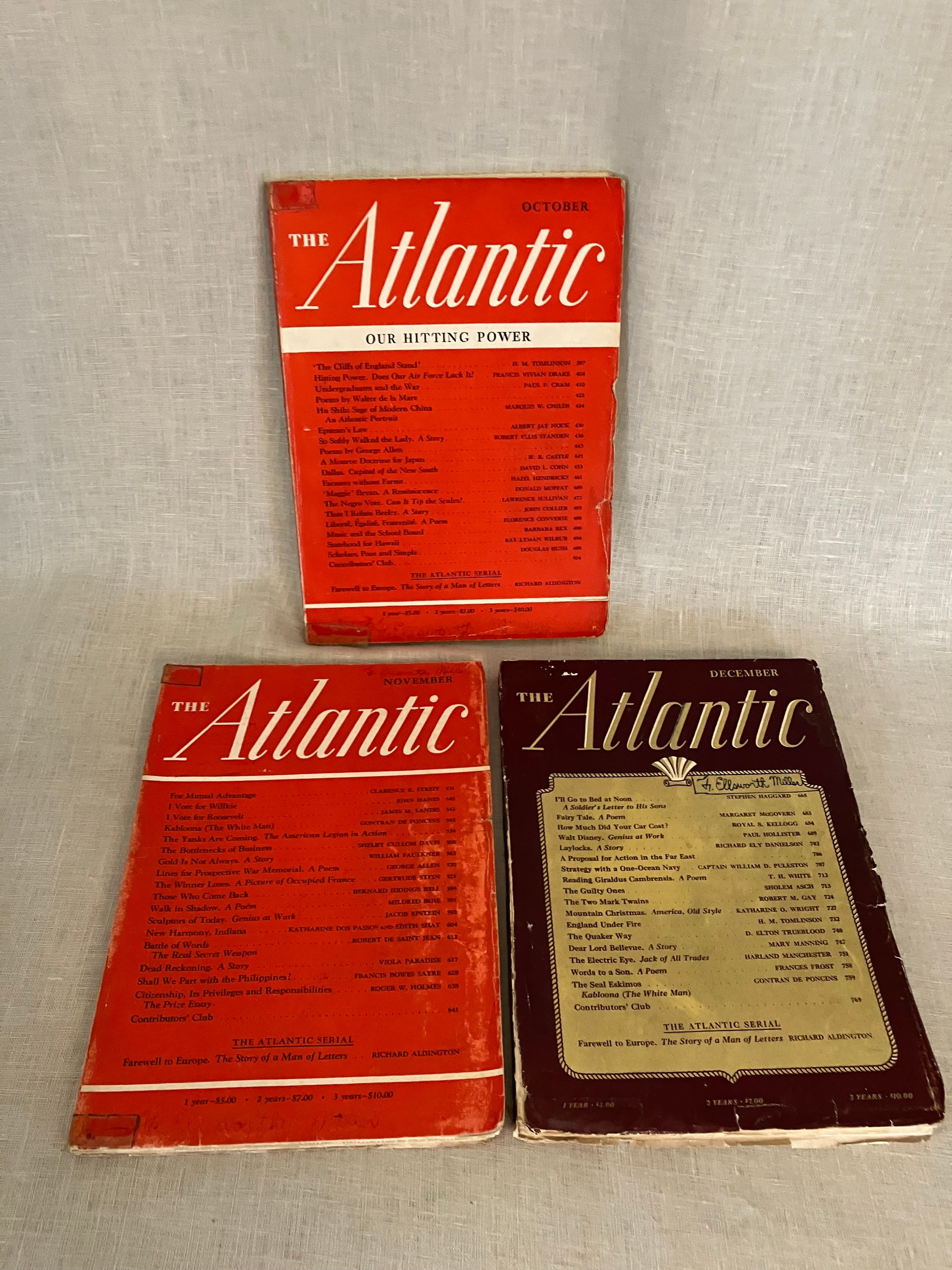 Soft cover, 8vo, in original color printed wraps with advertising to rear. 398- 529pp, -664pp. and -796 pp. These three, original World War II-vintage magazines reflect wartime debates on international diplomacy and American politics, as well as presenting a snapshot of contemporary literature, poetry, biography, book reviews, short fiction and serialization, publisher's literary catalogs and contemporary advertising. The October issue entitled, "Our Hitting Power" contains article on the Air Force by Francis V. Blake, as well as a reflection on the new Chinese ambassador to the United States, Dr. Hu Shih, by Marquis W. Childs. W.R. Castle contributes " A Monroe Doctrine for Japan." Albert Jay Nock writes a political article about the Presidential campaign, entitled Epstean's Law," and Ray Lyman Wilbur an article entitled, " Statehood for Hawaii." Condition this issue: Very Good, with usual light wear to wraps, name to cover in old ink, and brief underlining for the dictionary exercise of the original owner, who appears to have been a 5th grader. The November, 1940 issue features a William Faulkner short story, "Gold is not Always, " published first here, and later forming part of his 1942 novel, " Go Down Moses." Gertrude Stein contributes an article entitled, " The Winner Loses," about France under German occupation. The 1940 Presidential election is debated in competing articles by John Hanes and James M. Landis regarding the two candidates, Wendell Willkie and Franklin D. Roosevelt. Condition this issue: ditto as above, also with reinforced tape at foot and head of spine. No underlining. Notable in the December, 1940 issue is a short story by the Irish-American author and theater director, Mary Manning entitled, " Dear Lord Bellevue," a story of hereditary bankruptcy ("My mother was dressed by Worth and I am dressed by Woolworth.") in which a down-at-heels Irish lord gives a tour of his abandoned manor to two young acquaintances. Gontran de Poncins writes about "The Seal Eskimos." Also, an advertorial undersigned by sixteen members of the Faculty of Harvard Law School entitled, "A Proposal for Action in the Far East," advocates for a naval embargo of Japan, sharing of naval bases with Britain, Denmark and others in the area, as well as possible strategic aid to China. Condition this issue: Good only, with cover of wrap three-quarters detached. A fascinating time capsule of the period.