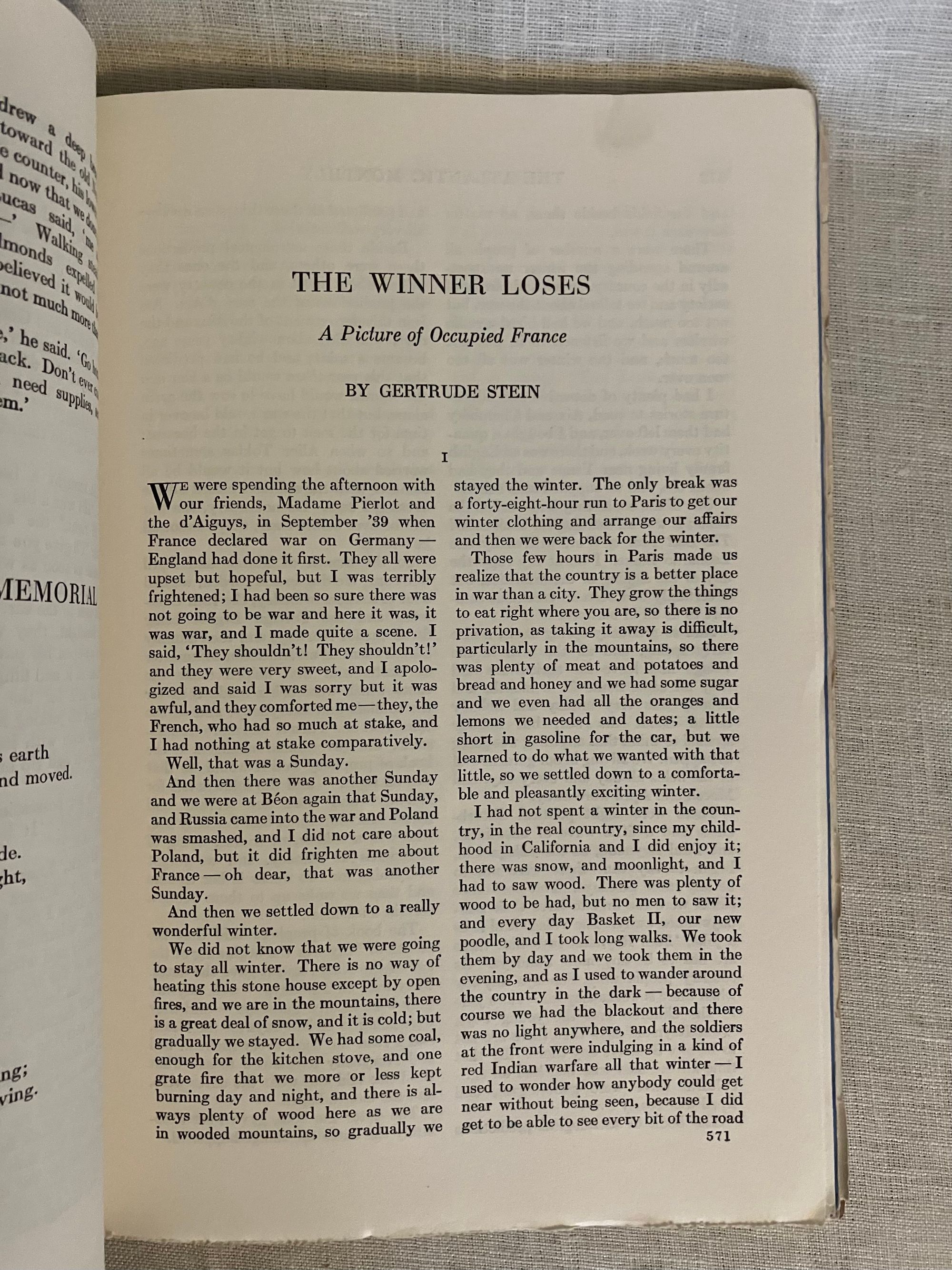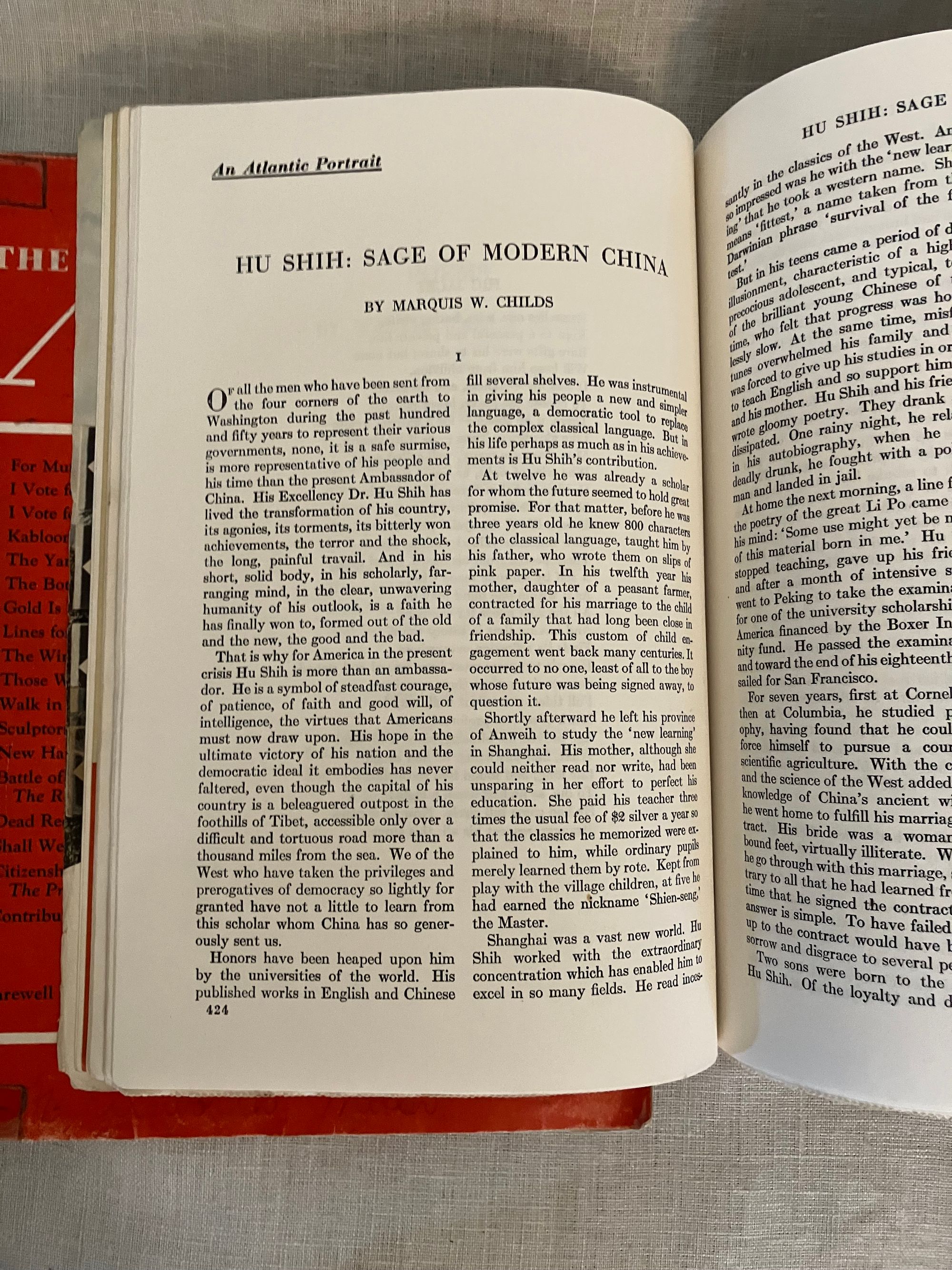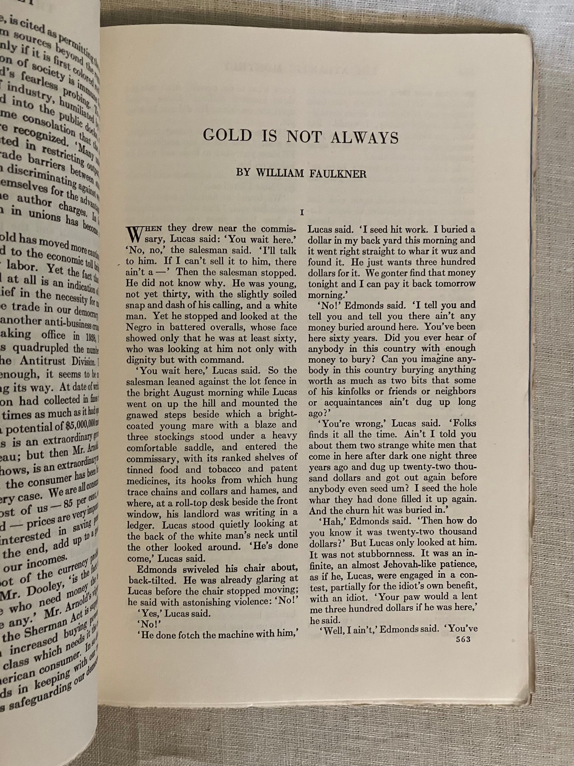 Soft cover, 8vo, in original color printed wraps with advertising to rear. 398- 529pp, -664pp. and -796 pp. These three, original World War II-vintage magazines reflect wartime debates on international diplomacy and American politics, as well as presenting a snapshot of contemporary literature, poetry, biography, book reviews, short fiction and serialization, publisher's literary catalogs and contemporary advertising. The October issue entitled, "Our Hitting Power" contains article on the Air Force by Francis V. Blake, as well as a reflection on the new Chinese ambassador to the United States, Dr. Hu Shih, by Marquis W. Childs. W.R. Castle contributes " A Monroe Doctrine for Japan." Albert Jay Nock writes a political article about the Presidential campaign, entitled Epstean's Law," and Ray Lyman Wilbur an article entitled, " Statehood for Hawaii." Condition this issue: Very Good, with usual light wear to wraps, name to cover in old ink, and brief underlining for the dictionary exercise of the original owner, who appears to have been a 5th grader. The November, 1940 issue features a William Faulkner short story, "Gold is not Always, " published first here, and later forming part of his 1942 novel, " Go Down Moses." Gertrude Stein contributes an article entitled, " The Winner Loses," about France under German occupation. The 1940 Presidential election is debated in competing articles by John Hanes and James M. Landis regarding the two candidates, Wendell Willkie and Franklin D. Roosevelt. Condition this issue: ditto as above, also with reinforced tape at foot and head of spine. No underlining. Notable in the December, 1940 issue is a short story by the Irish-American author and theater director, Mary Manning entitled, " Dear Lord Bellevue," a story of hereditary bankruptcy ("My mother was dressed by Worth and I am dressed by Woolworth.") in which a down-at-heels Irish lord gives a tour of his abandoned manor to two young acquaintances. Gontran de Poncins writes about "The Seal Eskimos." Also, an advertorial undersigned by sixteen members of the Faculty of Harvard Law School entitled, "A Proposal for Action in the Far East," advocates for a naval embargo of Japan, sharing of naval bases with Britain, Denmark and others in the area, as well as possible strategic aid to China. Condition this issue: Good only, with cover of wrap three-quarters detached. A fascinating time capsule of the period.
