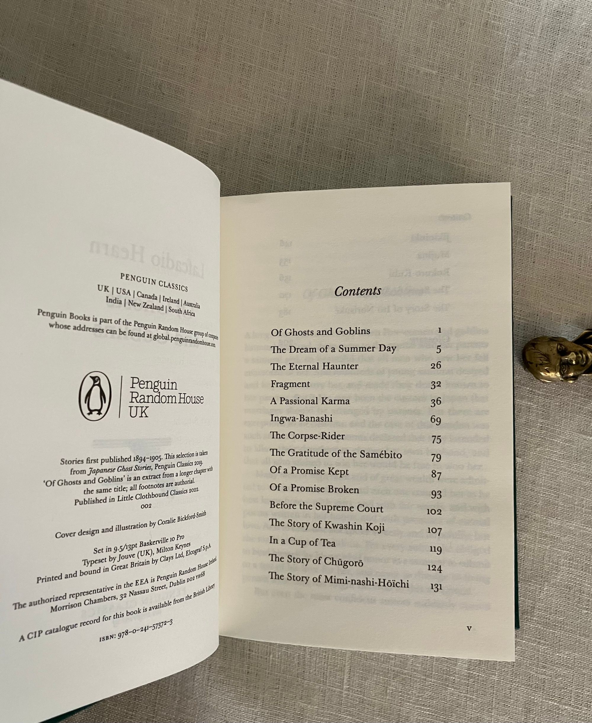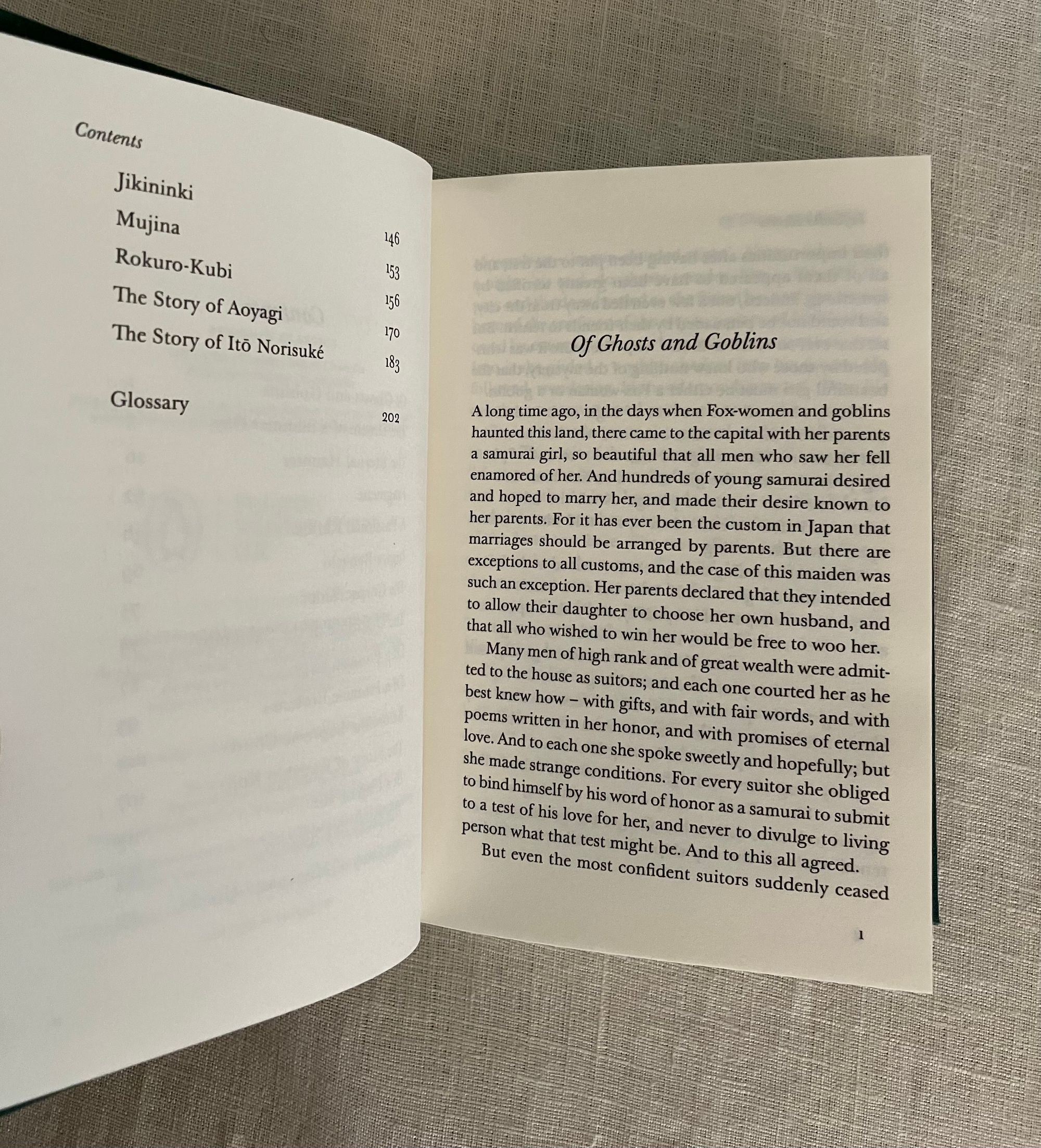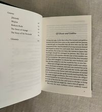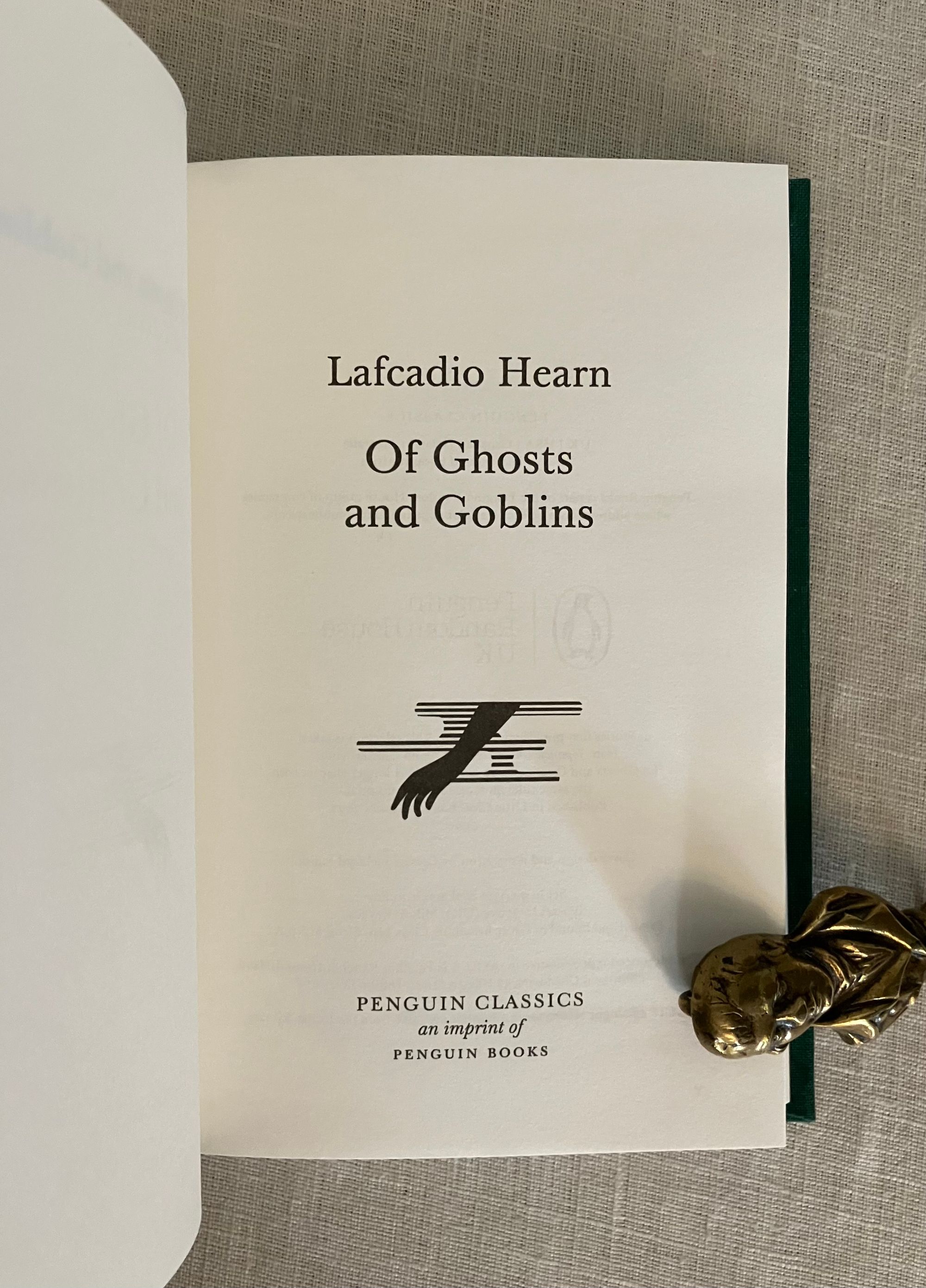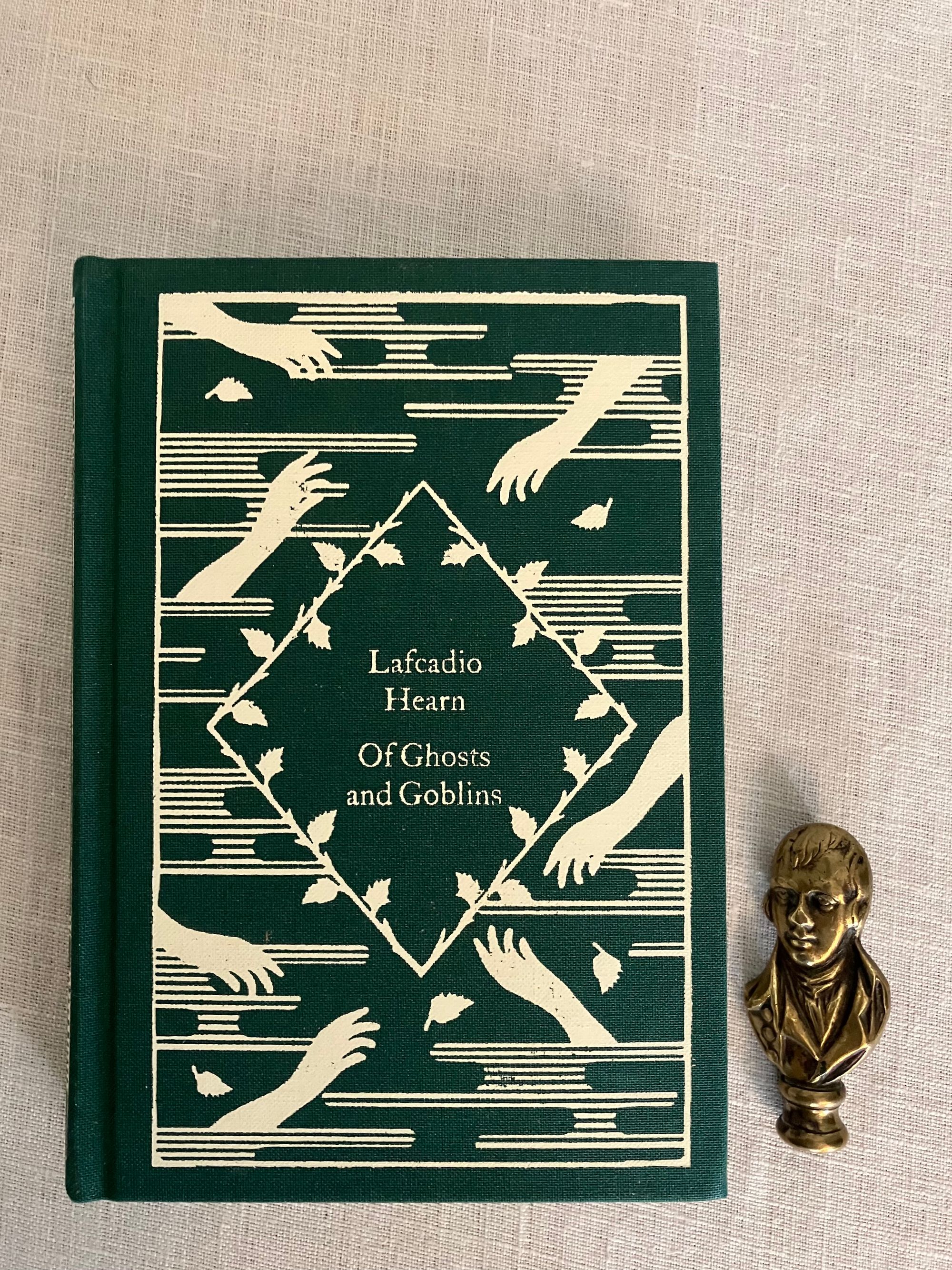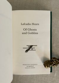 Reprint. (First Thus, second printing.) Hard Cover, 16mo, (4 1/2 x 6 1/2) in green cloth blocked with titles and design of reaching hands in white, 203pp. plus 2 pp. publisher's advertising for the series. CONDITION: Fine, like new. This anthology of twenty short tales of the supernatural by the folklore collector, essayist and Author Lafcadio Hearn, (1850-1904) an Irish ex-pat who moved to Japan in the mid 19th century, becoming assimilated, and adopting a Japanese name and family. He was a very popular writer in his time, providing interesting cultural views of the then more isolated," exotic" culture. These fairytales were adapted from "Japanese Ghost Stories "(Penguin, 2019), and were originally published between 1894 and 1905. The title tale, " Of Ghosts and Goblins," tells the mysterious tale of a young woman, who appears to be a ghost, testing samurai suitors in a deep dark wooded graveyard...