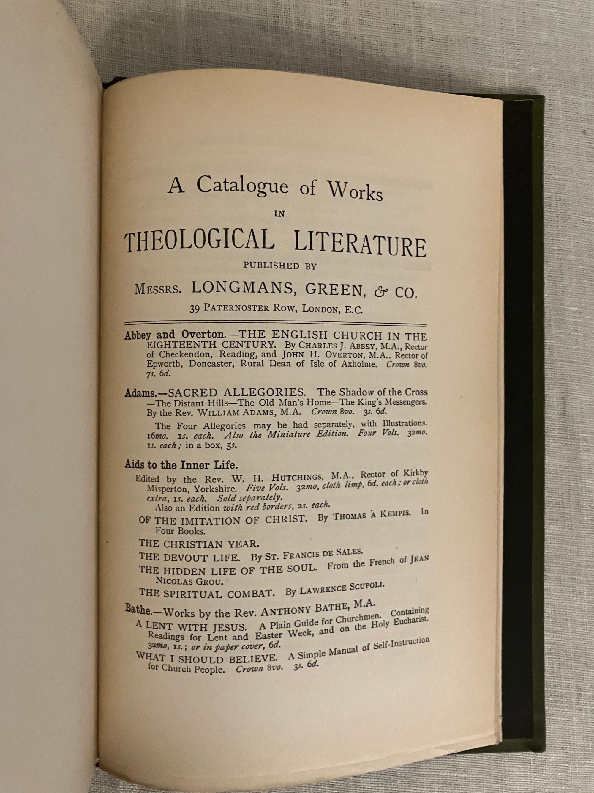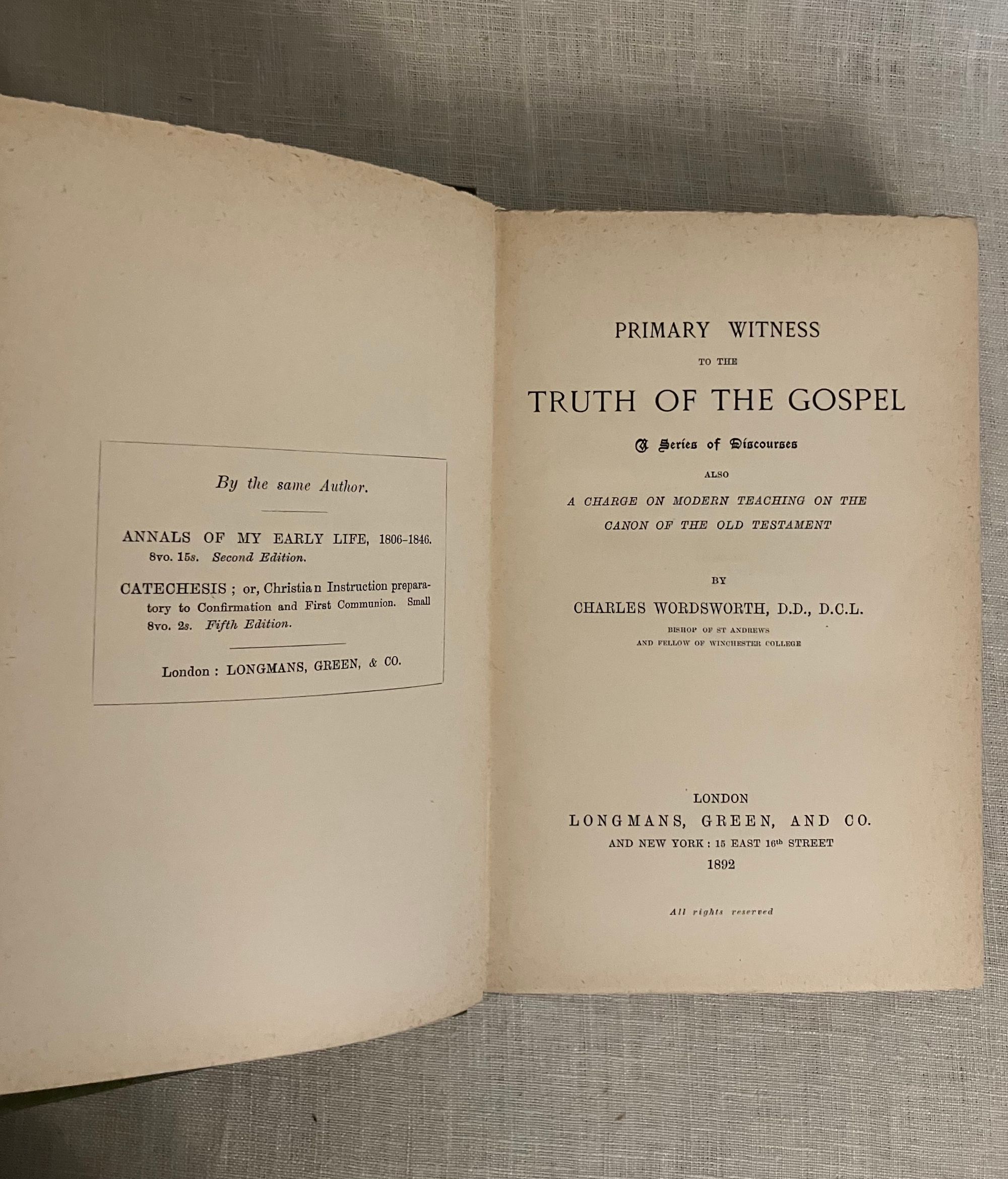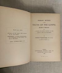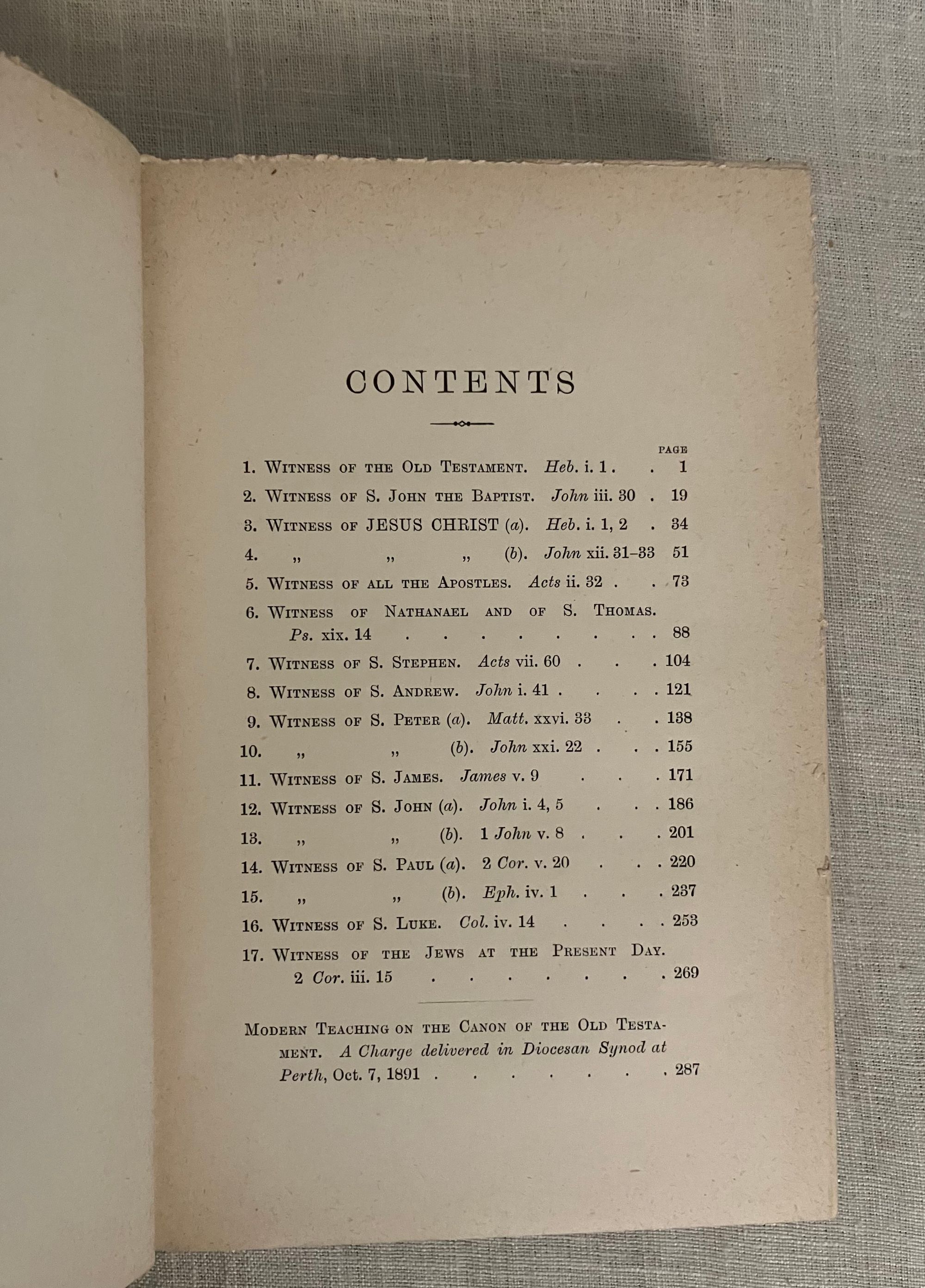 First Edition. Hard cover, 12mo, in olive green cloth ruled in blind at upper and lower borders, with titles blocked in gold to the spine, Condition: Very Good. Top edge a bit dusty. Hinges cracked, but holding firmly. Remains tight and square and clean, otherwise. Light wear seen to tips and along top inch of the front joint. Remains bright and no foxing seen. The Episcopal Bishop Charles Wordsworth dedicates this to his several congregations of the United Diocese of Saint Andrews, Dunkeld and Dunblane, Scotland as he was "now entering the Fortieth Year of my Episcopate," in 1892. A readable examination of the Old Testament as espoused by Saints, Apostles and the Jews of the Present Day, and Modern teaching on the Canon of the Old Testament. 333pp. plus 16 pp. publisher's catalogue of Theological Literature.**AUTHOR Charles Wordsworth (1806-1892) was the nephew of the Romantic poet, William Wordsworth, being the son of his brother Christopher. His schooling at Harrow and Oxford put him in touch with other notable future clerics of the day, although there is also much mention of sport; cricket, and rowing in particular, during the halcyon days of youth. DNB tells of a visit to Sir Walter Scott at Abbotsford in the company of his uncle William Wordsworth and his sister Dora in 1831. Before entering the ministry, he travelled in Europe, and became Master at Winchester College, as well as publishing a successful work on Greek Grammar. OCLC 6623785.