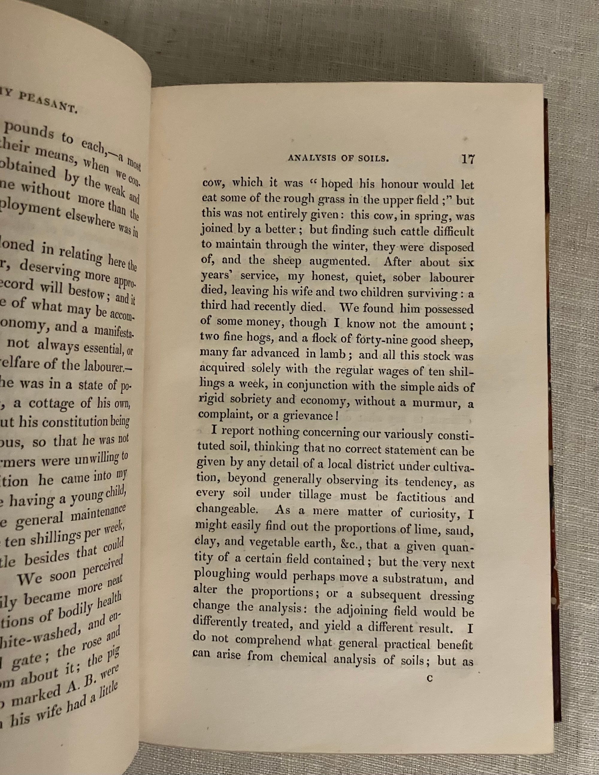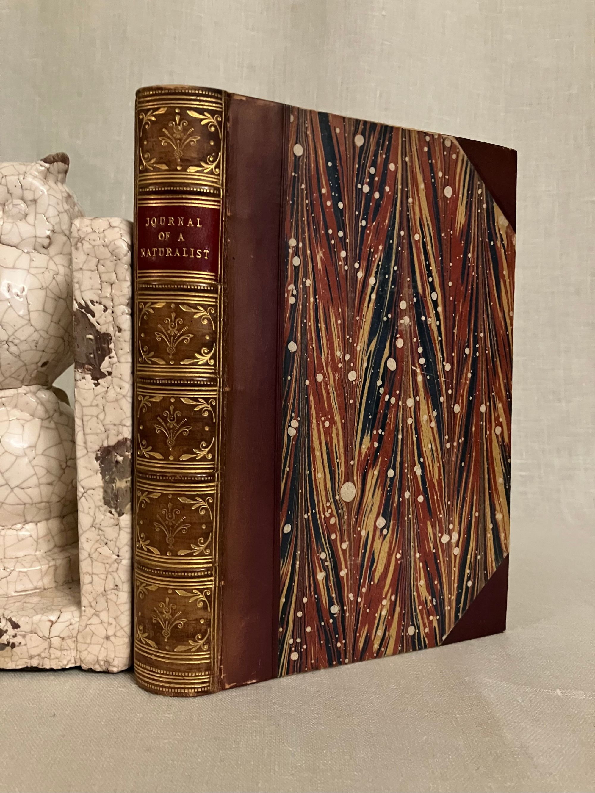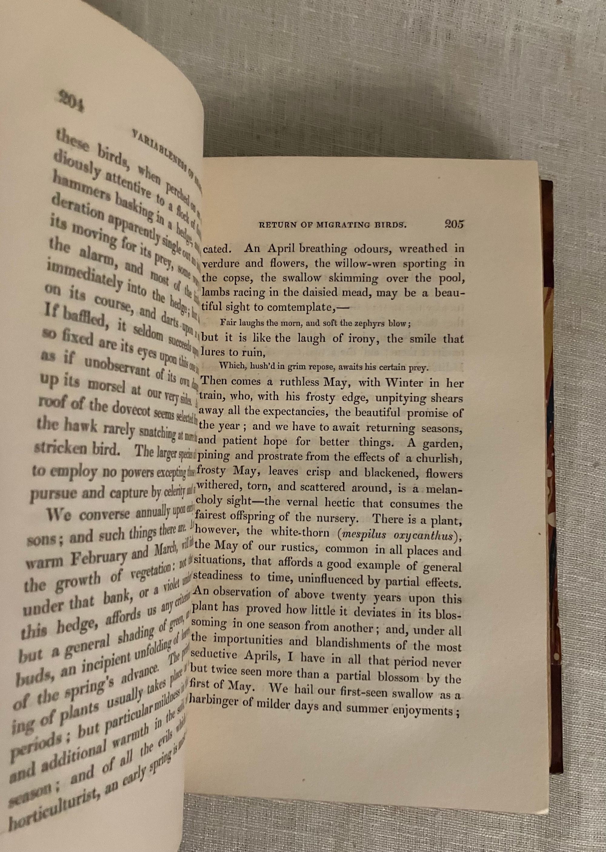 Hard cover, 12mo, finely bound in three-quarter, maroon-brown calf gilt, with marbled paper-covered boards, the spine with five raised bands rolled with small squares, and the compartments tooled with a slightly abstract floriate design flanked to the corners with leaf sprigs. Text edges trimmed and mottle glazed. Engraved illustrated title page with art by S. Williams. Further illustrations are dated 1830 and consist of seven engraved plates, of which four are double paged and one printed in color. ** COLLATION: xvi, [1]-432, [1], Plate I (double page),(blank), II, (2 blank), III (double page), (blank), IV, (2 blank), V (double page), (2 blank), VI (double page), (blank), VII --color, (blank), Index, 440pp. Printed by W. Clowes, Stamford Street. [3]. CONDITION: Near Fine. Published anonymously by English botanist John Leonard Knapp (1767-1845), this material was first serialized in the magazine " Times Telescope" before publication of the first English edition in 1829, 2nd in 1829 and then this third edition of 1830. (The American 1st was published in Philadelphia the following year, 1831.)**Knapp was a native of Bristol in northern England, later moving across the nearby Severn to southeast Wales. He was an early ecologist in that manner in which empirical observation overlaps with philosophical thought, economics and morals. The native limestone of the area is his first focus; its origins, differences of type and methods of formation. Use of the component minerals as amendments to the soil for different crops, and limestone powder as a moisture retaining amendment are considered. Mention of the area's Roman occupation highlights the long usage of the limestone cliffs for civil construction of roads, which is continued into the eighteenth century (child labor included). His investigation of quarries leads into a digression on the changing environment over the centuries, including the effects of deforestation. Further uses for limestone as a kiln fuel and as a medicinal component are also considered. Beyond this, Mr. Knapp catalogues the various local grasses and other components of silage and discusses how different biological varieties effect outcomes in terms of local dairy products, for instance. Other topics: the culture of the potato and causes of localized varieties; the teazel plant and other native flora; the oak, elm and maple and their localized ecology, ill-effects of pollarding; hellebore, dyer's broom, foxglove and other various medicinal plants; flowers as sweet, sugary attractions to beneficial insects; local species of quadrupeds, birds and insects; the cruelty of man toward animals; changes taking place in nature; the philosophy of empericism; observation of changes wrought by "electric" atmosphere, winds, sinkings, salt winds; 1825 and its peculiarities and influences; celestial observations et al. Knapp became a fellow of the botanical Linnean Society, and also a fellow of the Society of Antiquaries. In general, this is a fantastic read encouraging the wonders of direct observation of nature and its many changes, still an urgent topic today. This title (not this edition tho) is in the Wellcome Collection. His 1804 title "Gramina Britannica" (on British grasses) is also listed there, as well as in: M. Aslin, "Library Catalogue of Printed Books and Pamphlets on Agriculture" (Harpenden, 1940) p. 84. REF: G.S. Boulger, "John Leonard Knapp," DNB. British Library database, Shelfmark 1609/373. (AMJ)