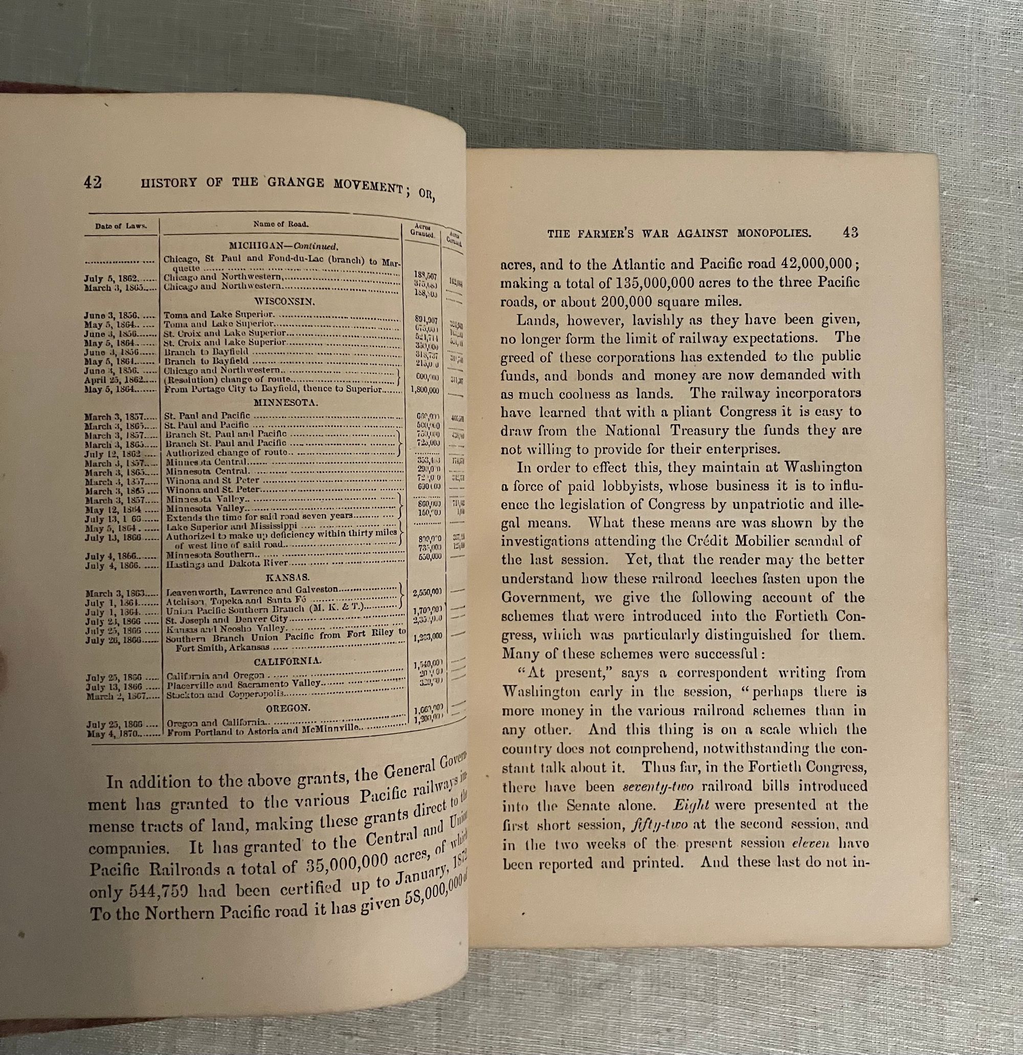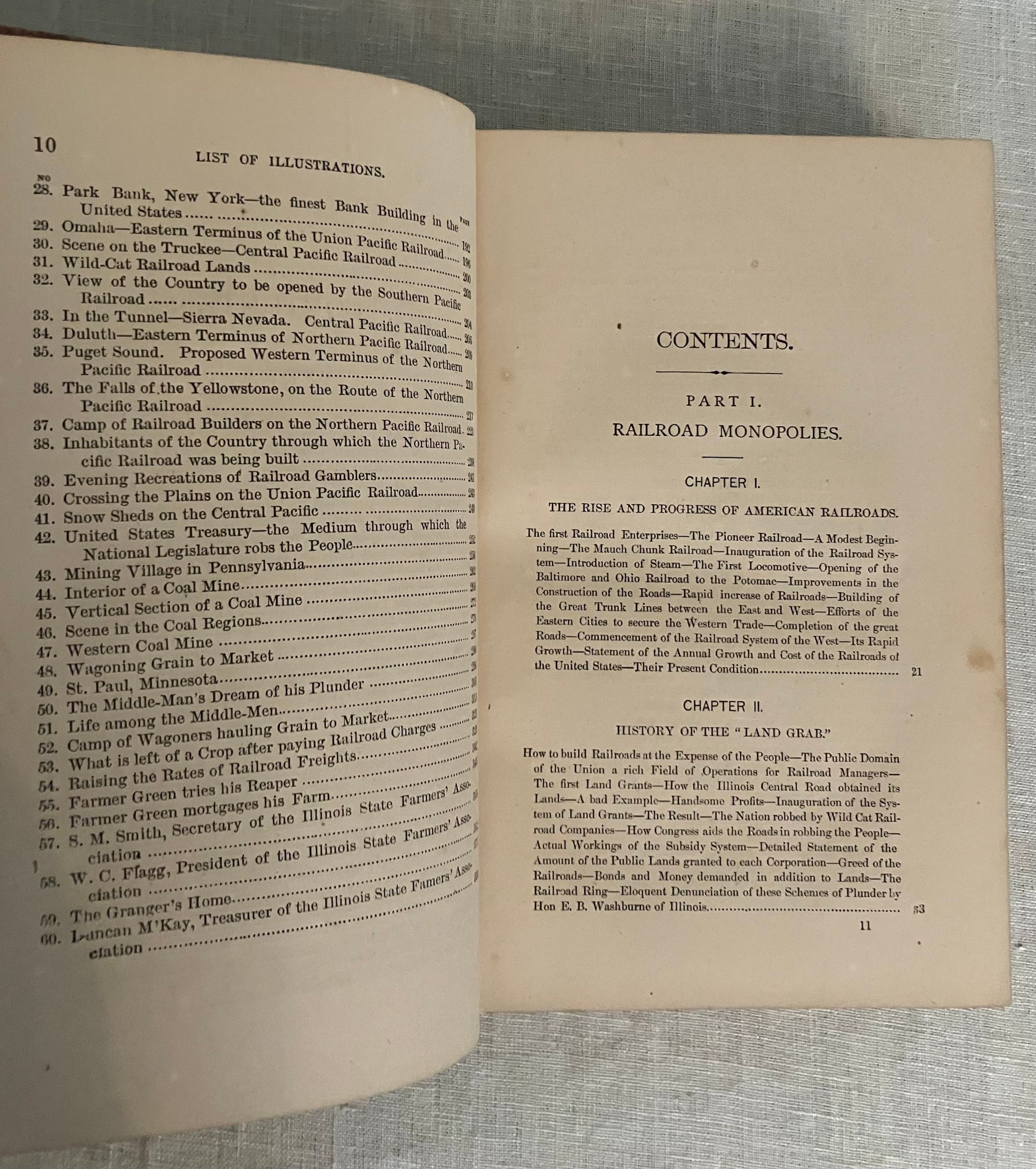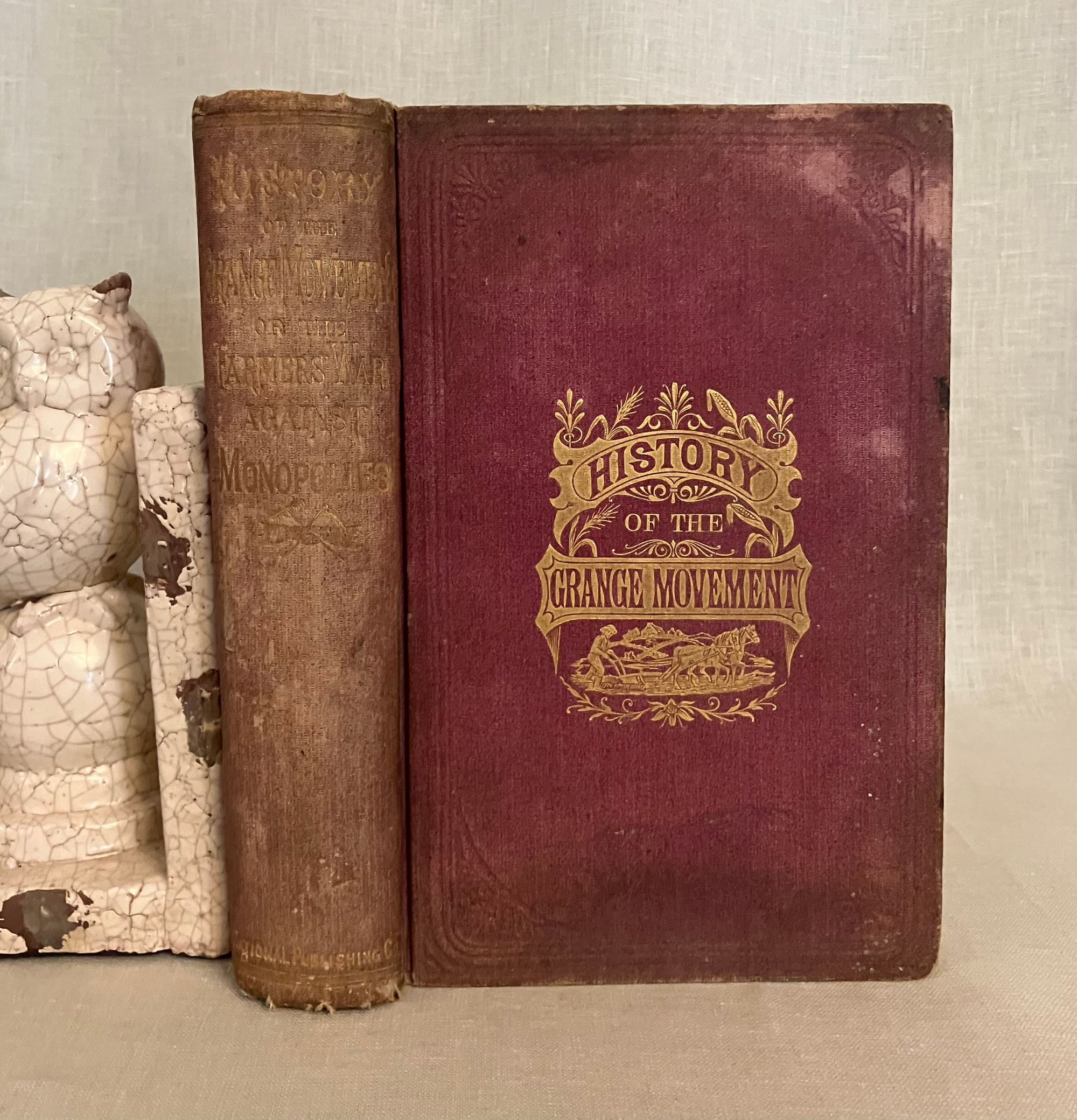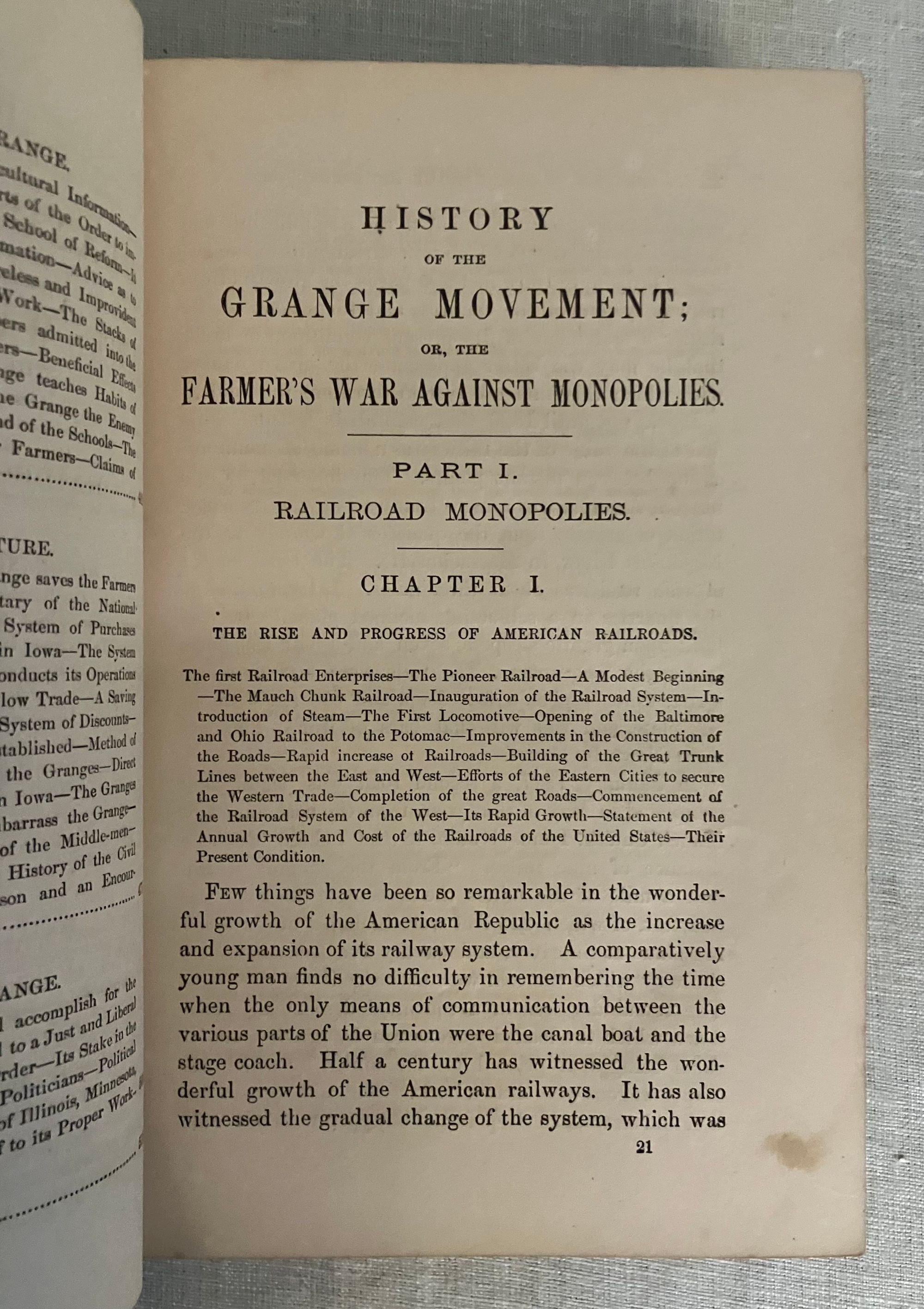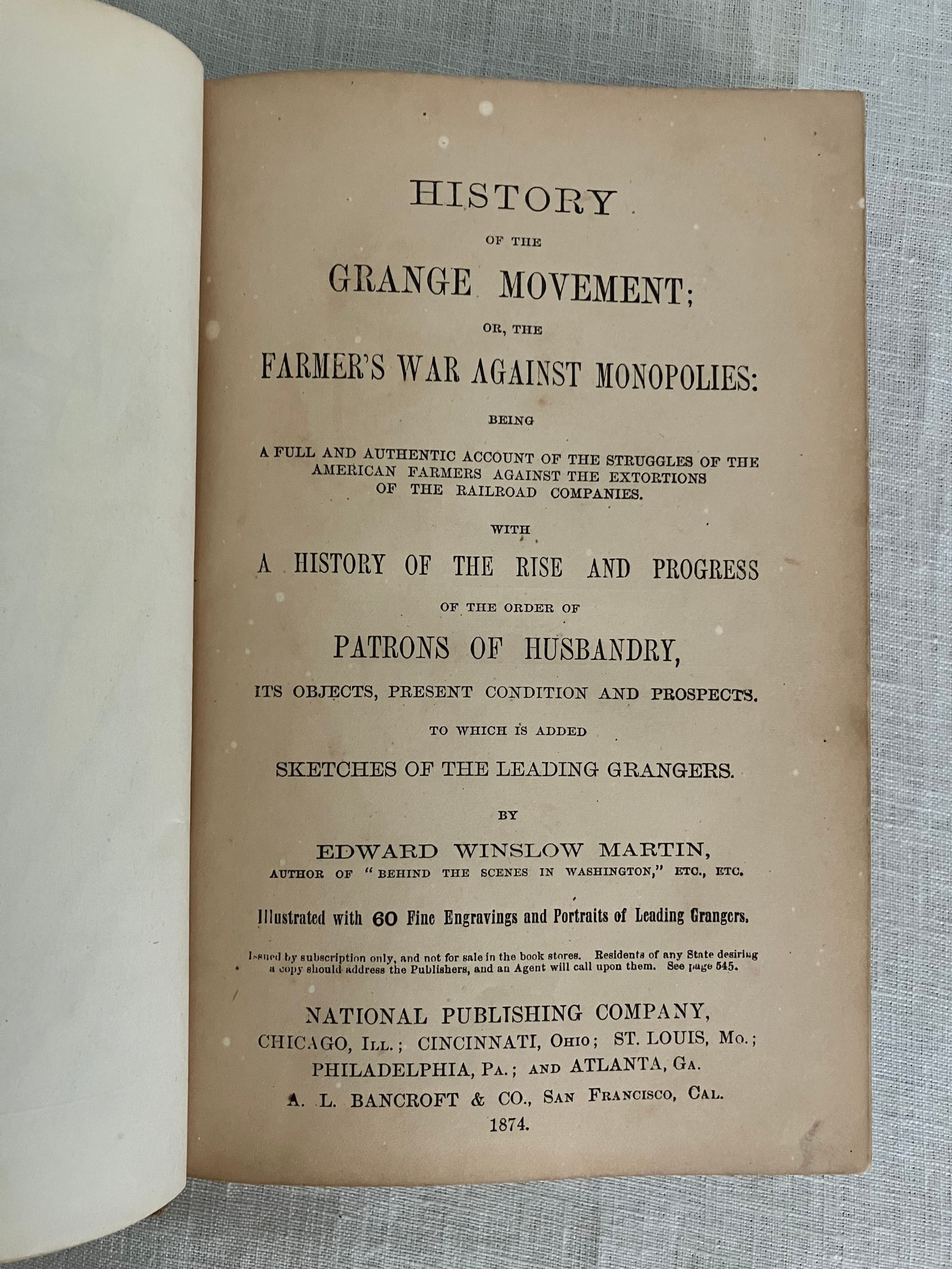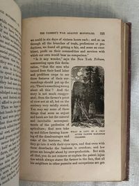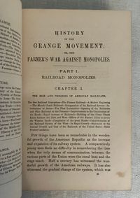 First edition. Copyright 1873. Hard cover, 8vo., in original red cloth with blindstamped border surrounding an illustrated title vignette with a farmer driving a horse-drawn plow. 544 pp. plus 4 pp. publisher's advertising. Illustrated with 60 black and white portraits and other illustration. CONDITION: Very Good Minus. Structurally sound and square but with significant exterior spotting and staining especially to front board, (better on rear board,) and with much fading to the spine. Now in protective mylar. Hinges are in order and interior is generally clean, but with a few occasional old stains, with the foolscap pages moderately age toned. Some foxing to prelims, especially tissue guards. Full page illustrations, being printed on different stock, have remained bright. **CONTENTS: This popular history explores the economic influence of the railroad, particularly upon farmers of the Midwest, from pre-Civil War technological advances of 1826 to 1874. Rapid growth of various lines which combined into intercontinental giants such as the Union Pacific are considered, as well the economic influence of the many small branch lines. The ownership monopolies of men such as Cornelius Vanderbilt, Jay Gould and others who inordinately benefited from the heavily-subsidied land grant system, whereby huge swathes of public lands were set aside for their private profit, is put into context with concurrent congressional chicanery and lack of judicial oversight. The Crédit Mobilier railroad investment scandal (revealed during the 1872 presidential election,) and failure of the investment bankers J. Cooke and Sons, are put into context with the resultant political and economic fallout such as the Wall Street crash of 1873.* Beyond being an informative history of this time, though, the particular economics affecting farmers (and coal producers) are explored. Being at the mercy of middlemen, haulage and rail companies whose stock was manipulated to exact maximum profits from the farmers, is considered in detail through in-depth interviews. The goals, and identities of the semi-secret "Patrons of Husbandry," founded in 1867, are discussed, as well as the speedily-organized Grange movement which followed in their wake. The author interviews key figures of the co-operative Illinois Farmers Association about the Grange's cooperative farmer's union which suceeded in exerting bulk purchasing power with suppliers. As the Author notes in his Preface, the fast pace of the political organization of the farmers and coal miners who were similarly at the economic mercy of the railroads to sell their product, was a topic of concern for many "back East" who were not subject to these same economic pressures, and feared the shifting of political power away from the eastern bastions of power as the centennial of the nation loomed.**Virginia AUTHOR James Dabney McCabe, Jr. (1842-1883) journalist from the age of 14, wrote a number of popular illustrated history titles during the last quarter of the nineteenth century for this publisher. The pen-name, "Martin" was presumably adopted to distance himself from some of his earlier opinions he had renounced when arriving in the North. (As late as the mid '60's McCabe embraced support of the Confederacy, producing a novel, and a pro-Confederate drama called "The Guerrillas," performed in Richmond in 1864.)* The copyright of this title belongs to publisher Joshua R. Jones, owner of the National Publishing Company of Philadelphia. The company employed direct sales agents who worked on commission, rather than selling through wholesale. (See the ad.) **REFS: National Agricultural Library, 277.12 M12 1874. OCLC 11883930. C. S. Watson, "Confederate Drama: The Plays of John Hill Hewitt and James Dabney McCabe," The Southern Literary Journal, Vol. 21, No. 2 (Spring, 1989), pp. 100-112.