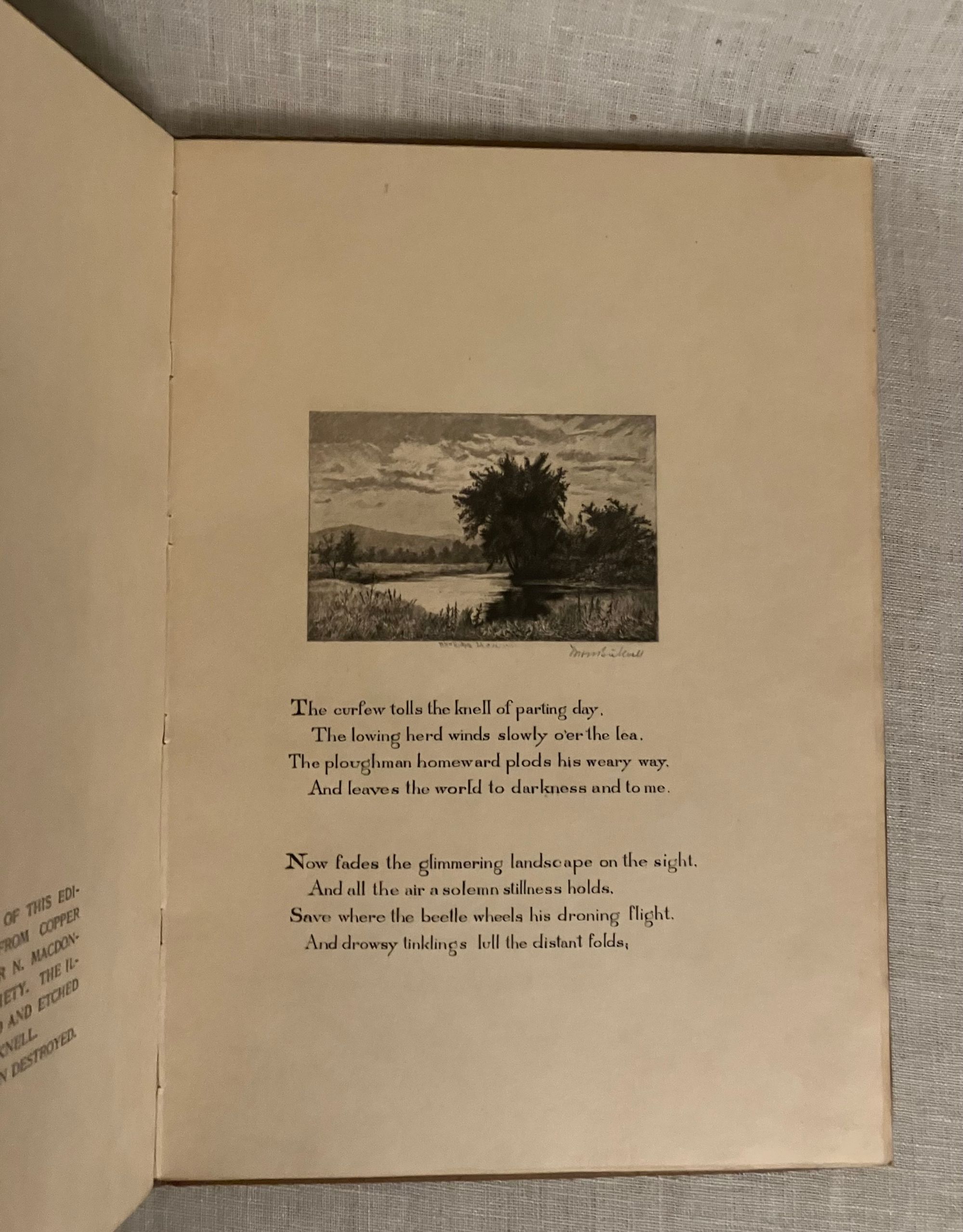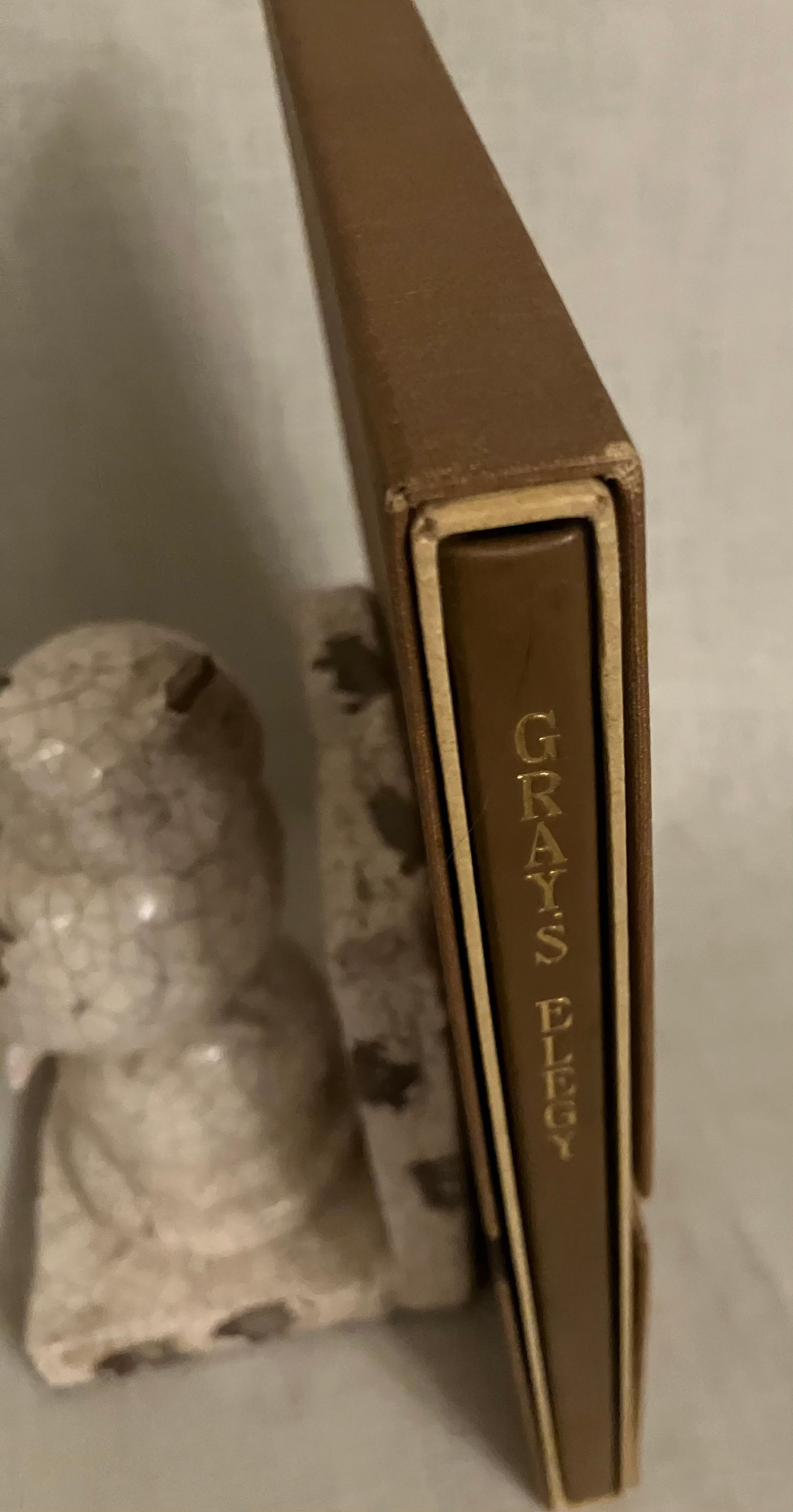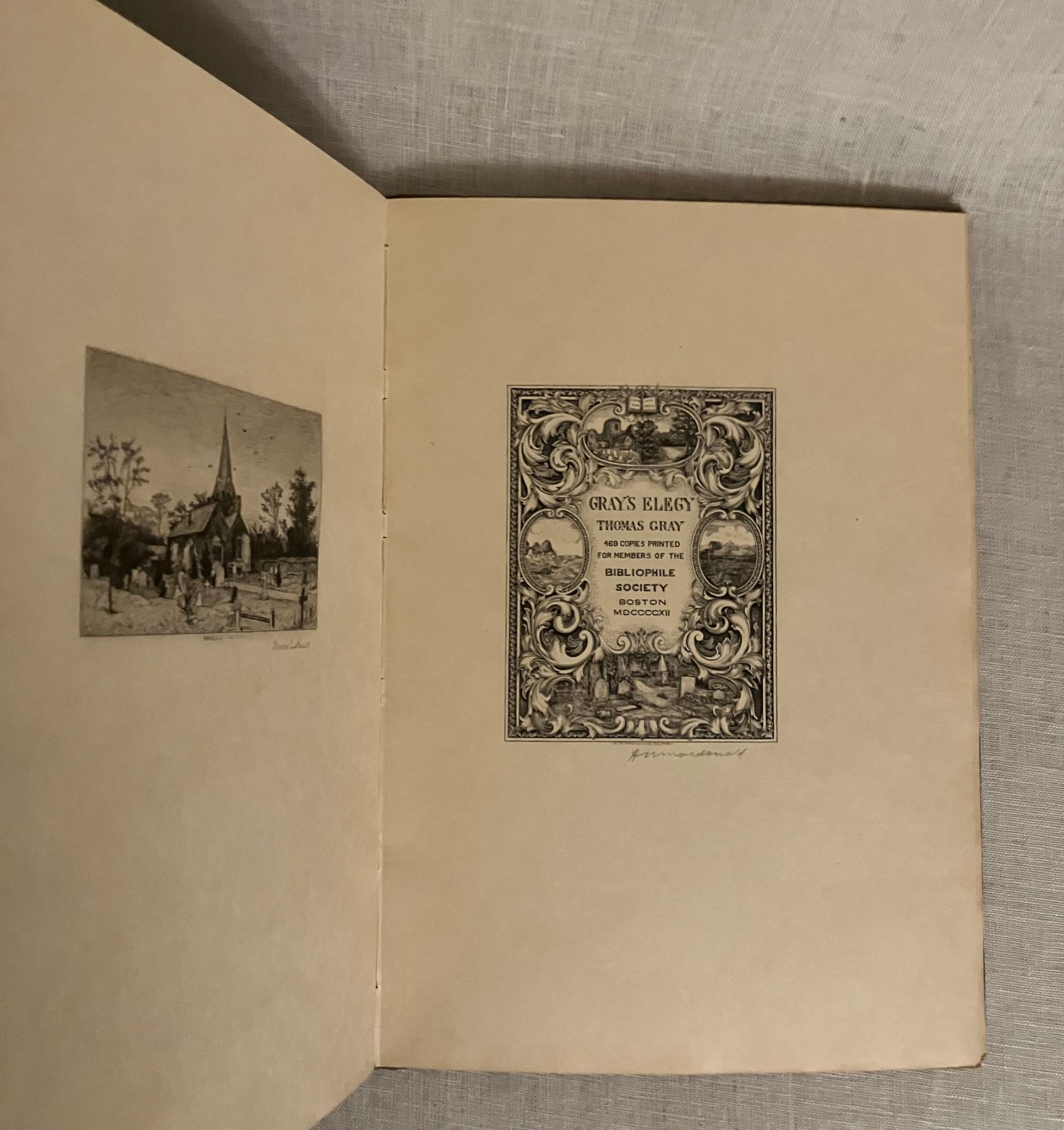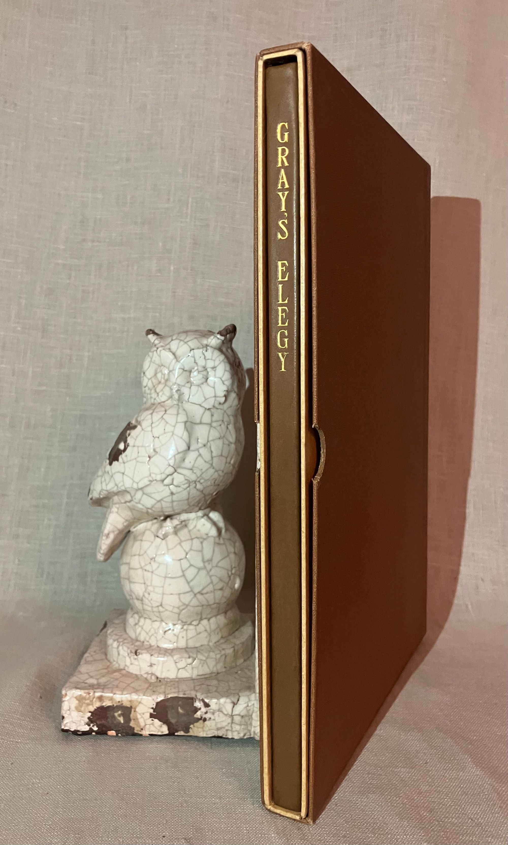 First edition, Limited to 469 copies printed for members only, each plate signed by the artists in pencil below the engravings. Hard cover, small 4to., in full calf blocked with gold double rules and the title vertically down the spine. Included in the original double slipcase with applied printed paper label. 32 (unnumbered) pages printed on a cream japon-like parchment, with the Society's logo in blue to prelims, followed by facing pages with frontispiece illustration of a churchyard and the pictorial title engraved within an architectural frame, finely detailed with four landscape vignettes and alternating neoclassical scrolls. "Entire text engraved on copper, with nine etchings, artist signed, and two supplementary pages of printed textual matter." (as in bibliography)**CONDITION: Very Good Plus, or better. A few small spots to boards, (on rear especially). Handsewn binding is a tad loose. Slipcase about Near Fine with only a bit of abrasion at top front edge, as seen.**The Bibliophile Society was founded in Boston in 1901. As described in their charter: "...for the purpose of the study and promotion of the arts pertaining to fine book making and illustrating, and to the occasional publication of of specially designed and illustrated books for the distribution among it's members at a minimum cost of production." **Englishman Thomas Gray's famous poem "Elegy in a Country Churchyard," was written in 1751. Boston-born printmaker William Harry Warren Bicknell (1860-1947) trained at The Boston Museum School of Fine Arts under Otto Grundman and Frederick Crowninshield. His work with the Bibliophile Society included etchings for the 1903 Howard Pyle-illustrated "The Bibliomaniac." He died in Provincetown. (Delaware Art Museum) REF: "The Thirteenth Year Book," (Boston: The Bibliophile Society, 1914) p. 94. Rare in the slipcase.