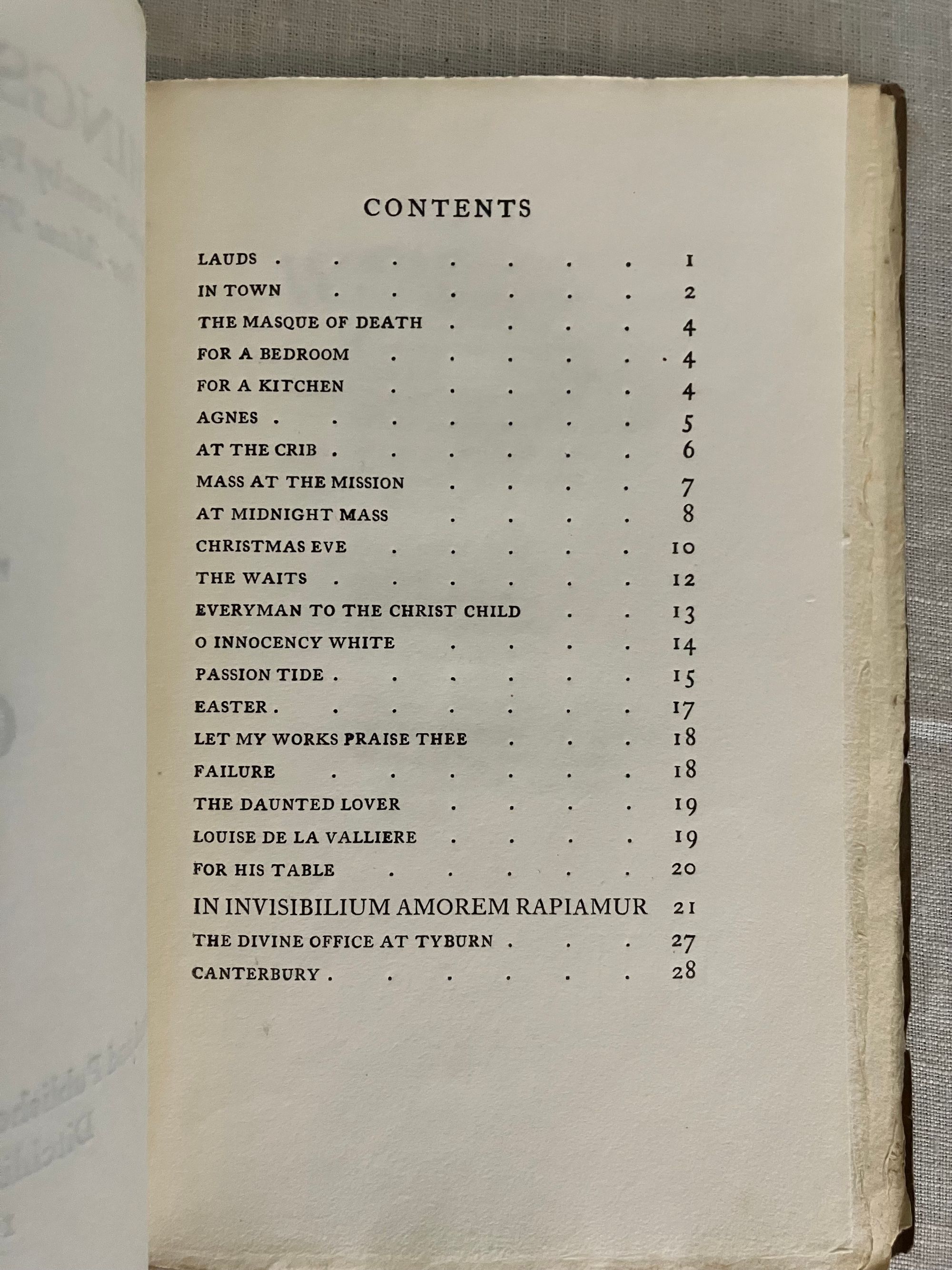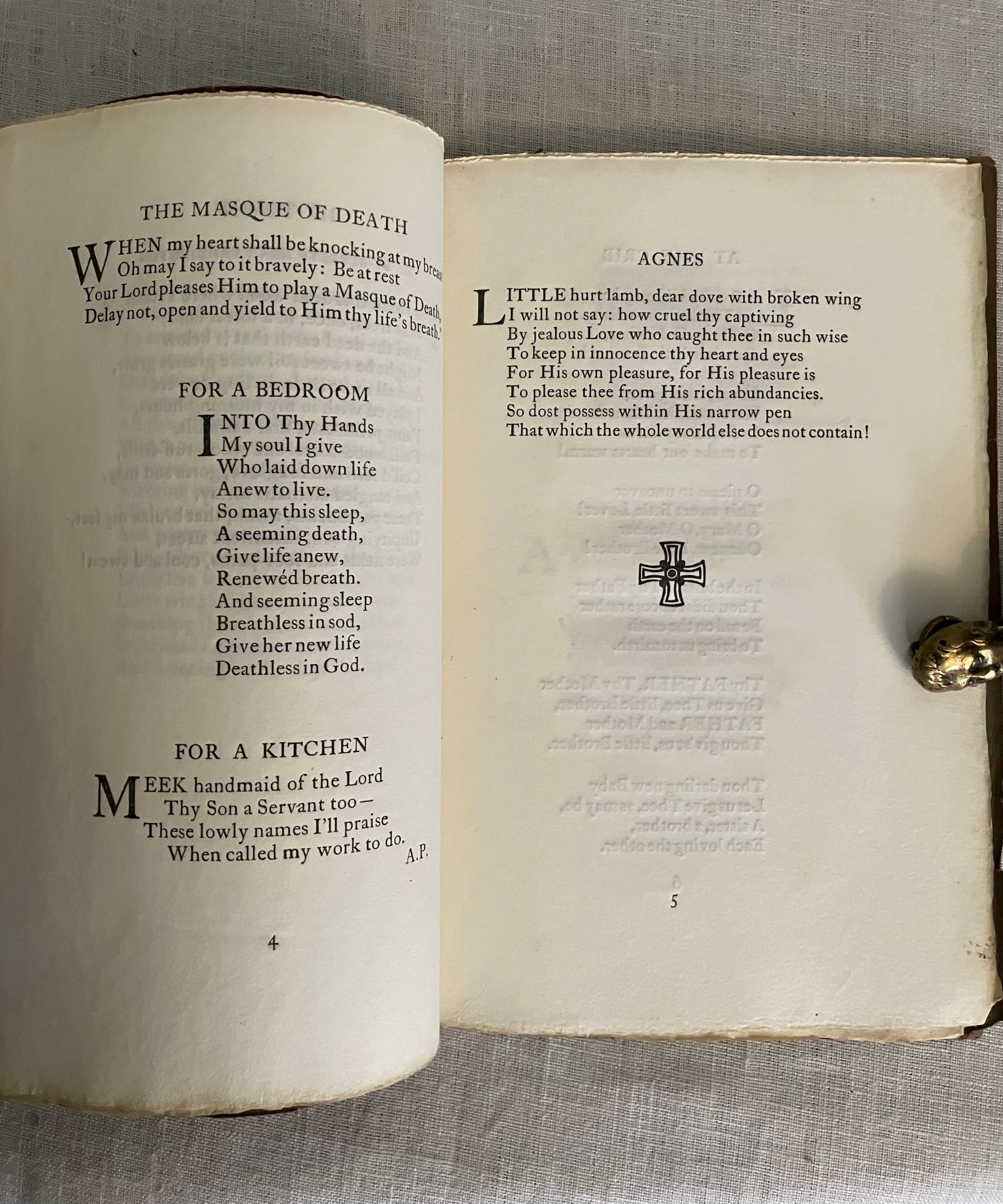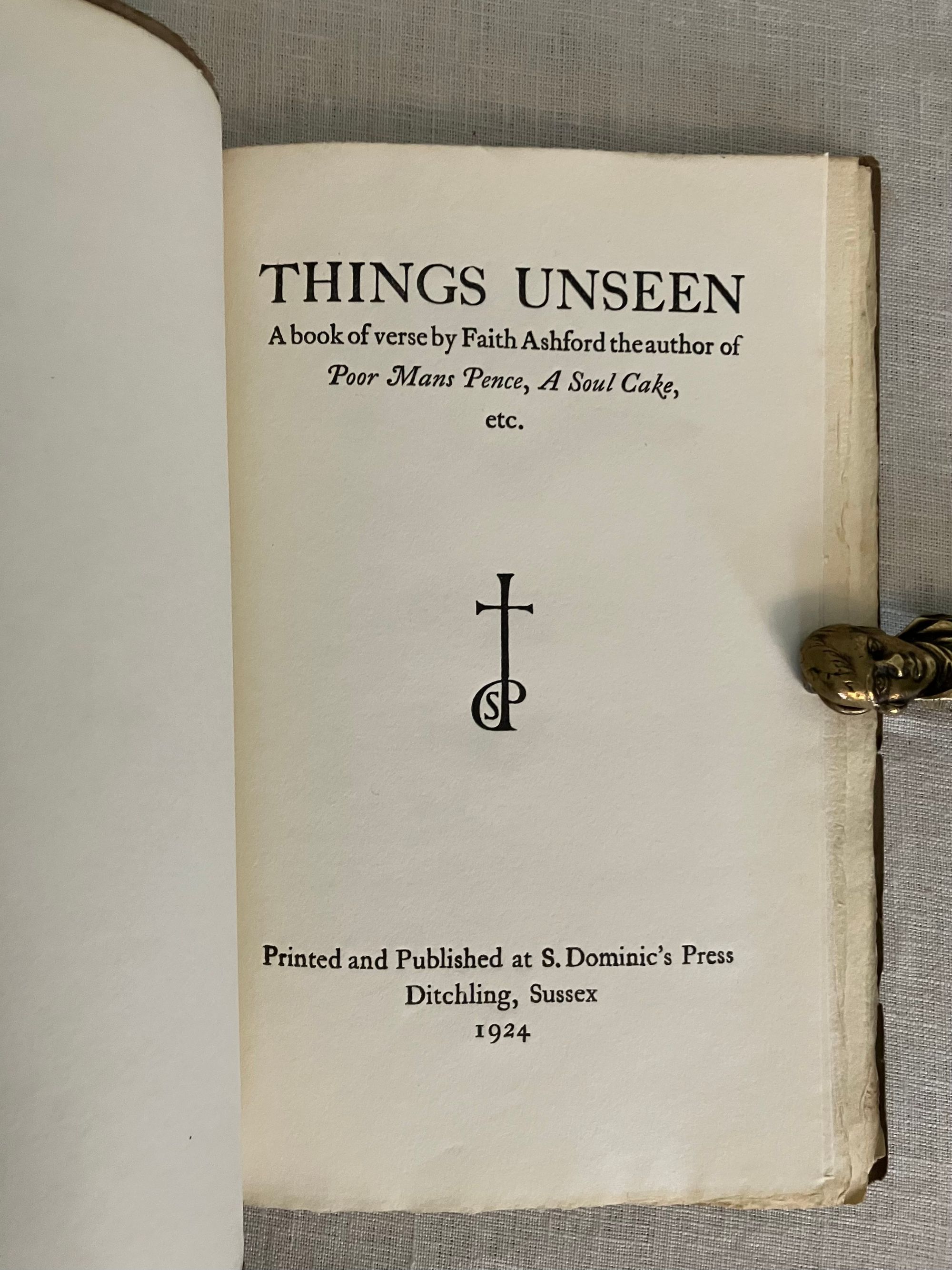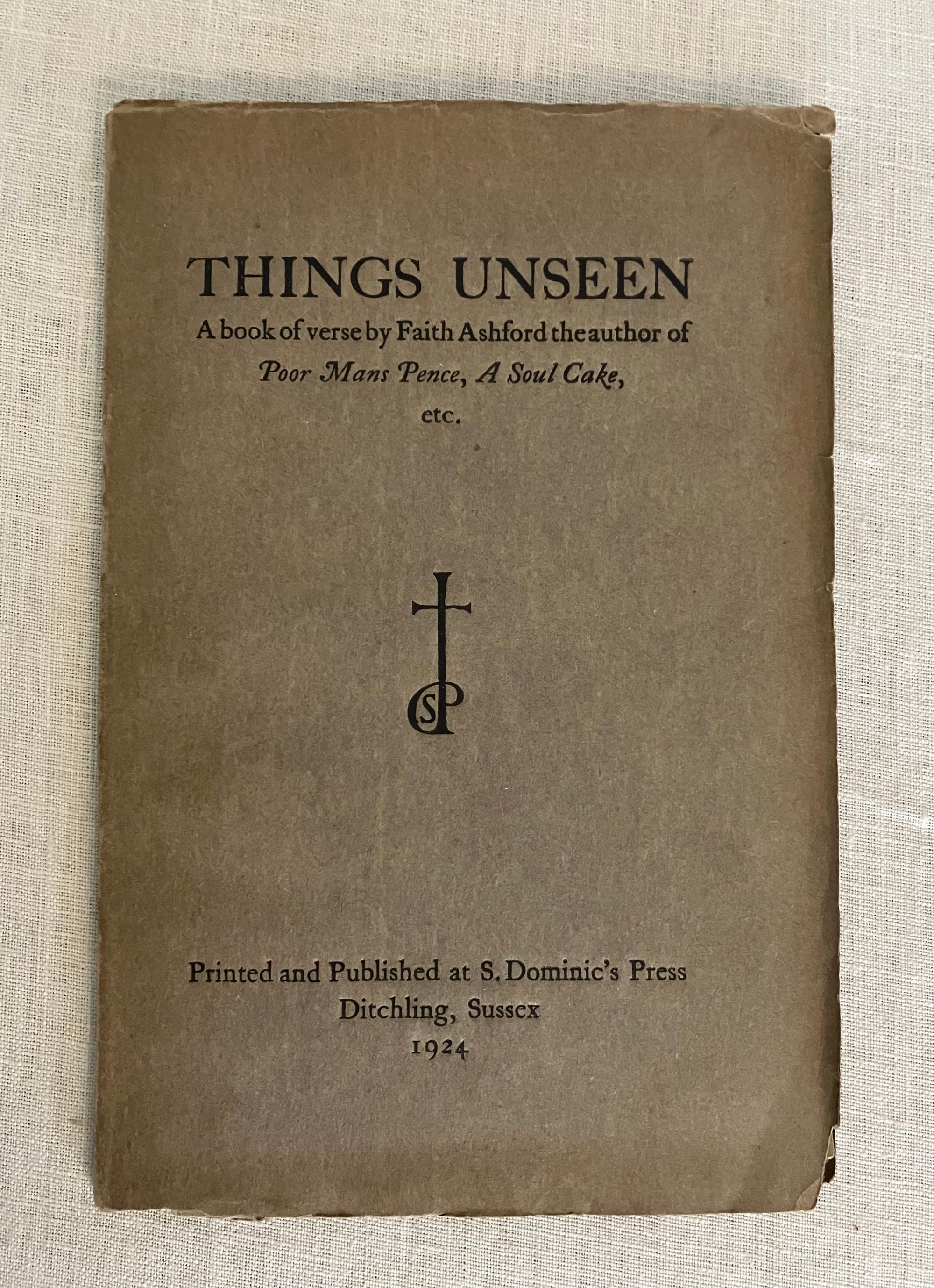 Soft cover, 8vo in olive green-brown printed wraps with title to front, letterpress printed on handmade art paper. [8], 28 pp., [4], First Edition. Contains several small engraved cuts as headers and footers. This is a collection of 23 poems, many with a Catholic Christian theme or setting. CONDITION: Near Fine. Wraps remain bright with only slight oxidation (browned) near outer edges, and a few quarter inch (or less) tears at yap edges, and one missing corner lower front edge of wrap.*English Impressionist Artist and POET Faith Ashford (1884-1967) lectured at the University of Reading School of Art. She was also a co-founder of the Reading Artists Guild. Her oil paintings were exhibited at the Royal Academy as well as the Wertheim Gallery, London. **Hilary, or Harry Pepler, publisher at the St. Dominic's Press, produced a number of fine press books between 1915 and 1937. Other notable versions of the workshop were produced for the Ulysses Bookstore, Holburn, including the work of modern authors such as James Joyce, Eugene O'Neil, and John Drinkwater, among others. The St. Dominic's Press workshop was an offshoot of the Dominican religious order of the Guild of Saint Joseph and Saint Dominic, Ditchling Commons, East Sussex. REFS: University of Reading, Art Collections. Blackfriars Gallery and Library at the Dominican School of Philosophy and Theology, Berkley, Calif. Examples of Ashford's paintings work can be seen at artdotukdotorg.