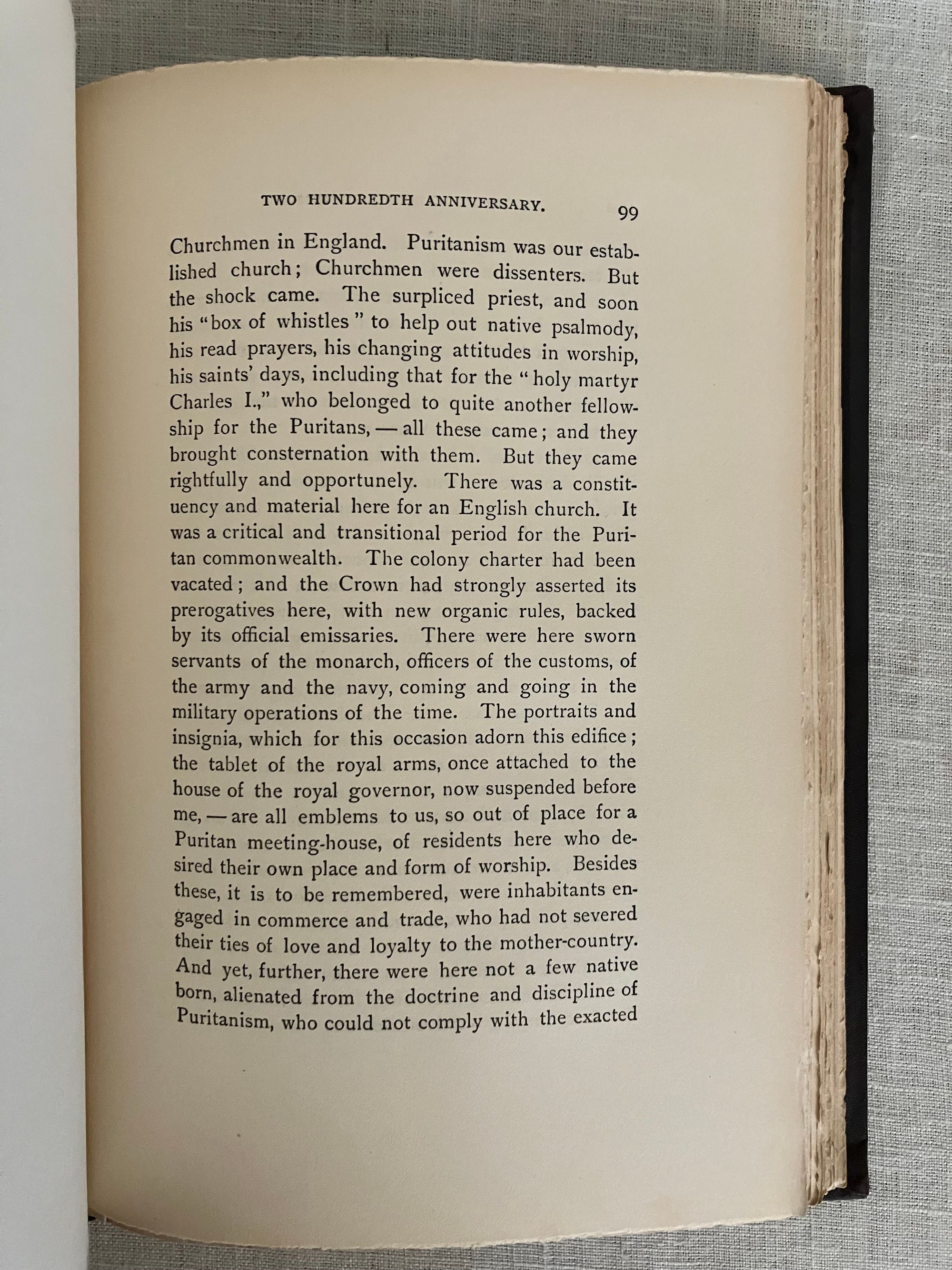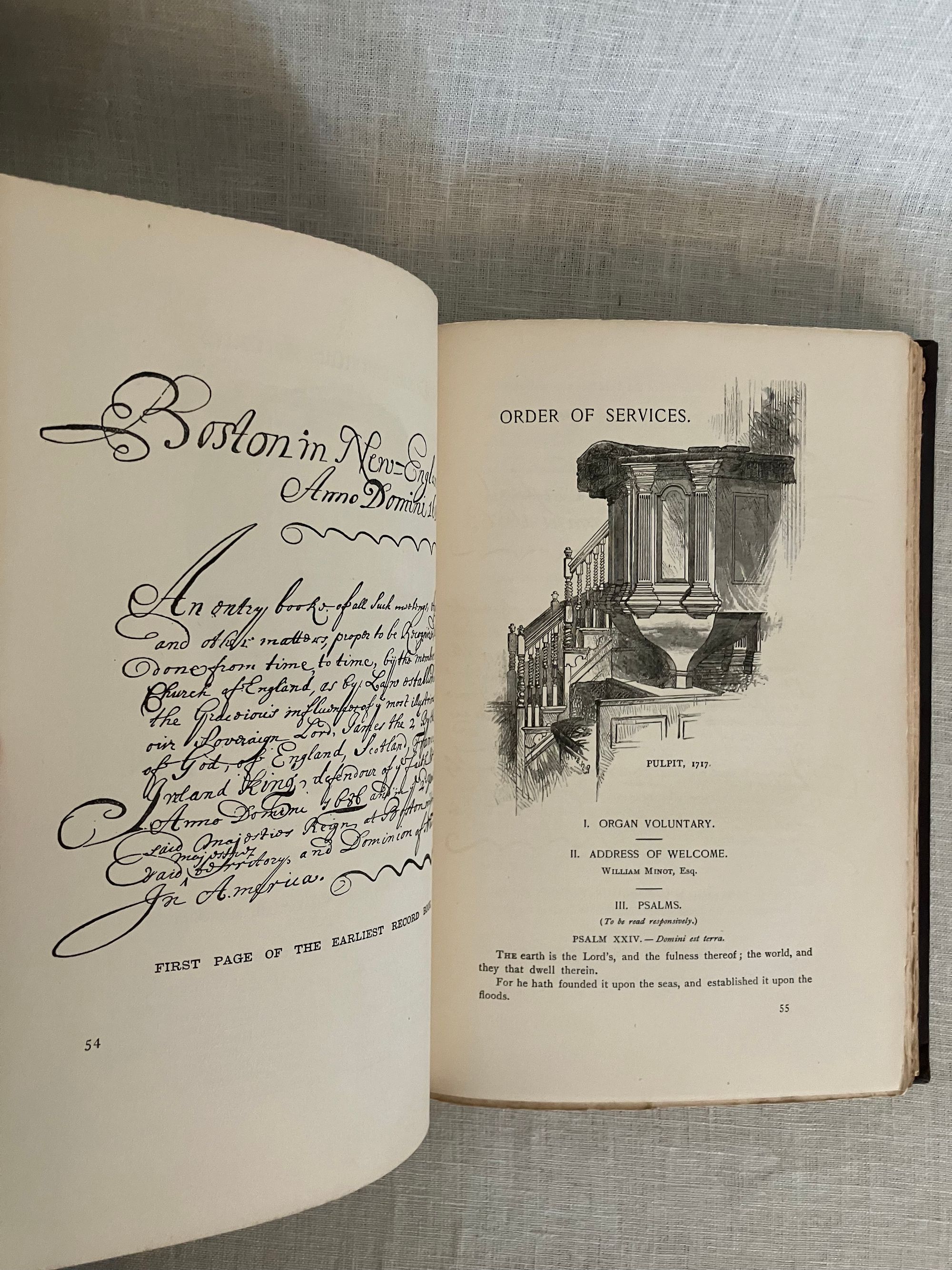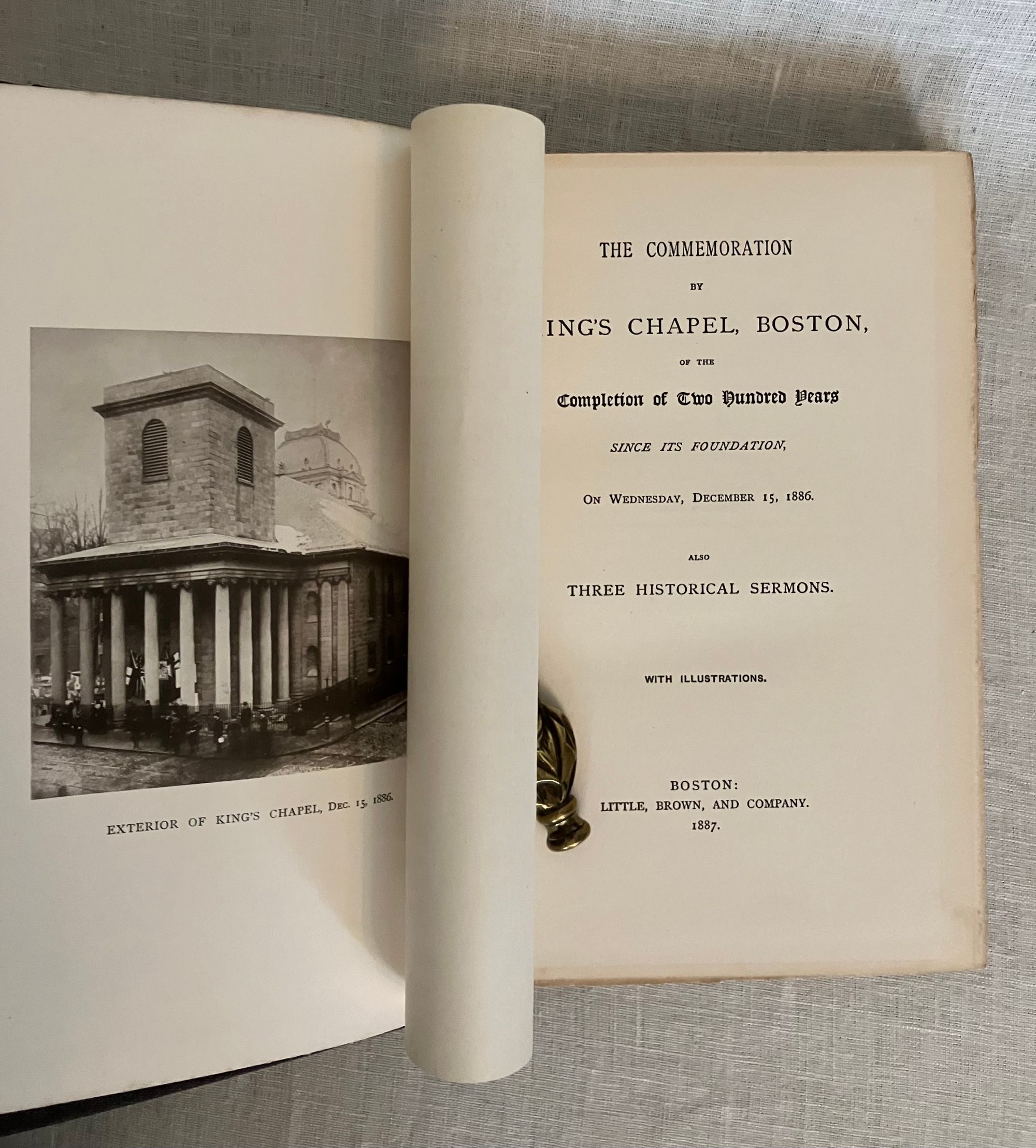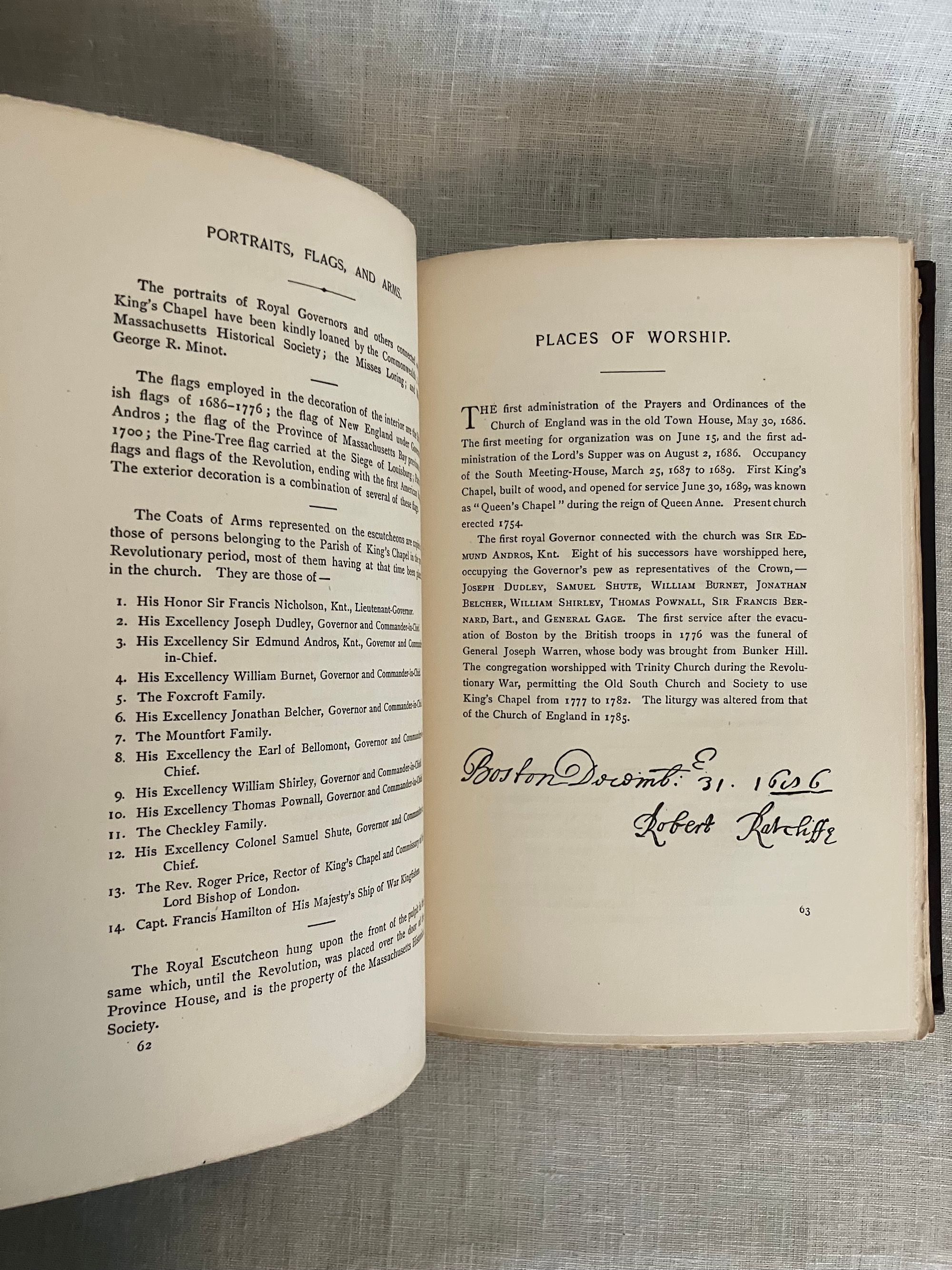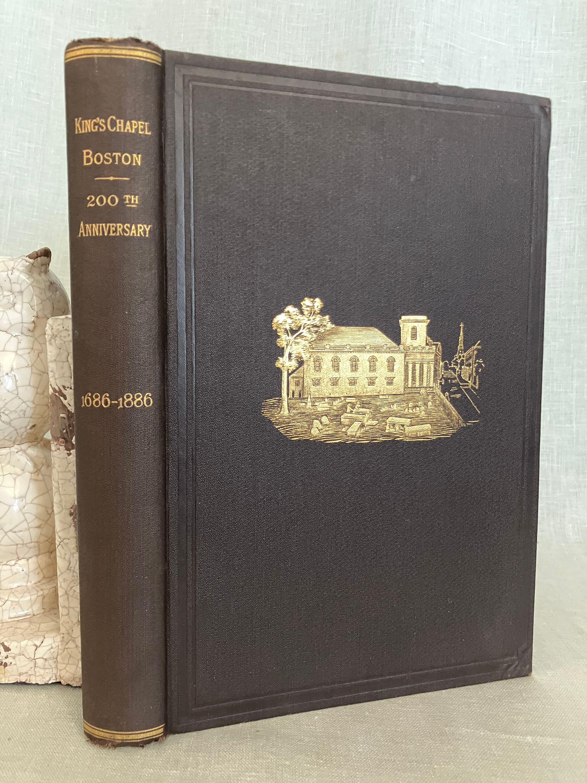 Hard cover, 4to, in original brown cloth with gilt vignette of King's Chapel Church and burial ground, ruled in blind to front board, and with titles blocked in gilt to the spine. Chocolate brown end papers. vi, [1] -200 [2]pp. Illustrations, coats of arms, facsimile invitation to the ceremony, and engraved portraits of early Massachusetts Governors supplied. With index. Printed University Press, Cambridge, Mass. *CONDITION: Very Good Minus. Large graze to the rear board, slight wear to head of spine, lightly bumped corners otherwise generally clean, square and sound. Hinges in order. Now in mylar protector. ** King's Chapel celebrated its 200th year of worship in 1886, with a display of portraiture, coats of arms and other regalia marking the Anglican origins of the institution in Boston. The Rev. Henry Wilder Foote's (1838- 1889) three historical sermons, delivered in the course of December 1886, shed light on the character and challenges faced by the earliest Massachusetts Bay settlers, discusses the tenor of the varied Puritan beliefs brought from the Old World, and how these beliefs were further shaped by the challenges of survival in the New World. The history of the institution reflected the changing political landscape of colonial America. Initially founded as an Anglican, Loyalist congregation, the church closed during the Revolution, as its loyalist congregants largely departed for Nova Scotia or England. It was reopened as a Unitarian congregation in 1782. Discussion of some of the pre-revolutionary, early loyalist personalities include Governor William Shirley, Lt. Gov. William Dummer, and Gov. Dudley, as well as the Puritan dissenter, Mrs. Anne Hutchinson, among others. Overall, a concise history. Oliver Wendell Holmes 's poem. Not found in Sabin, (although other of Rev. Foote's works are.)