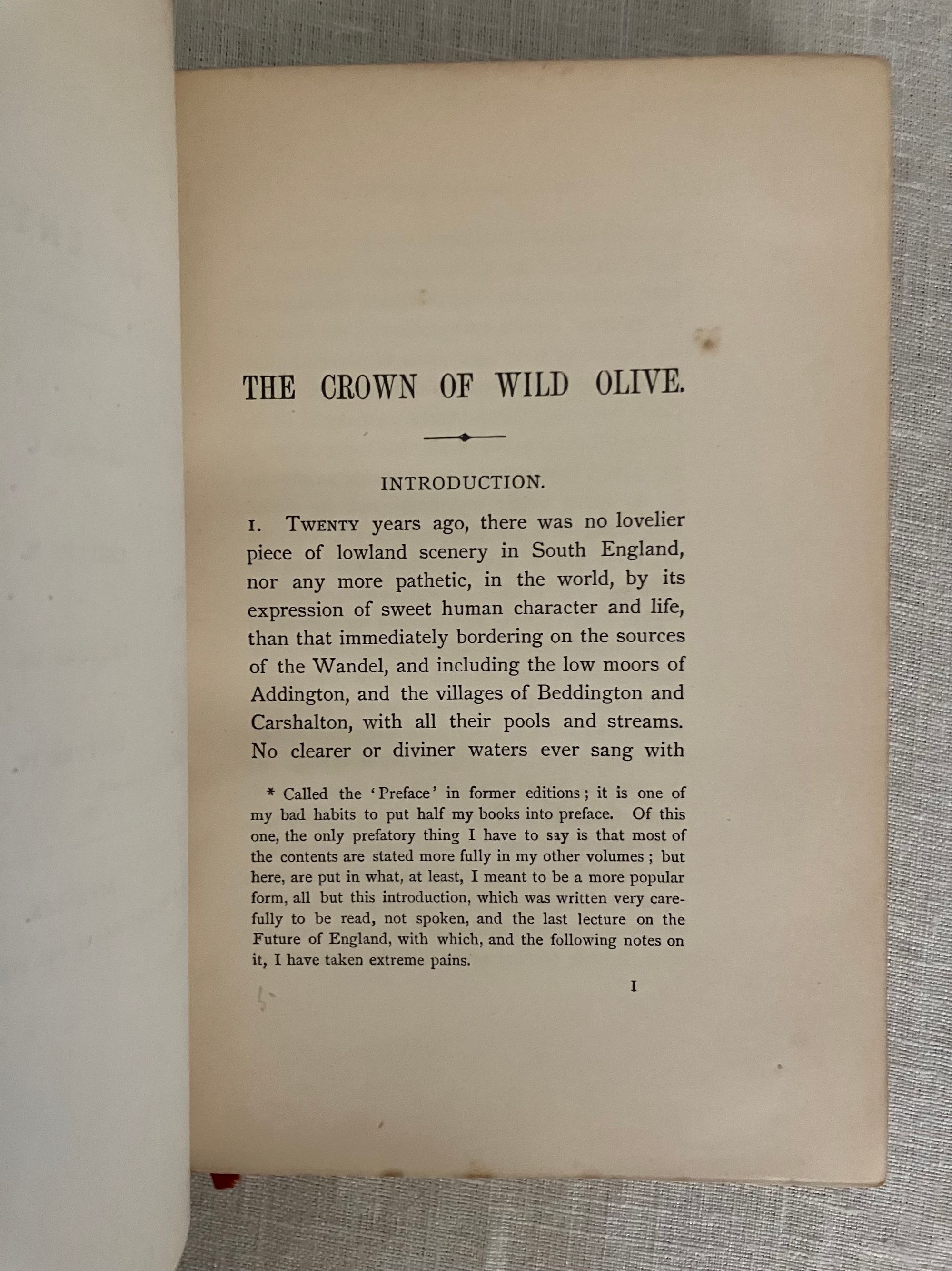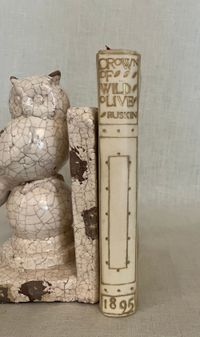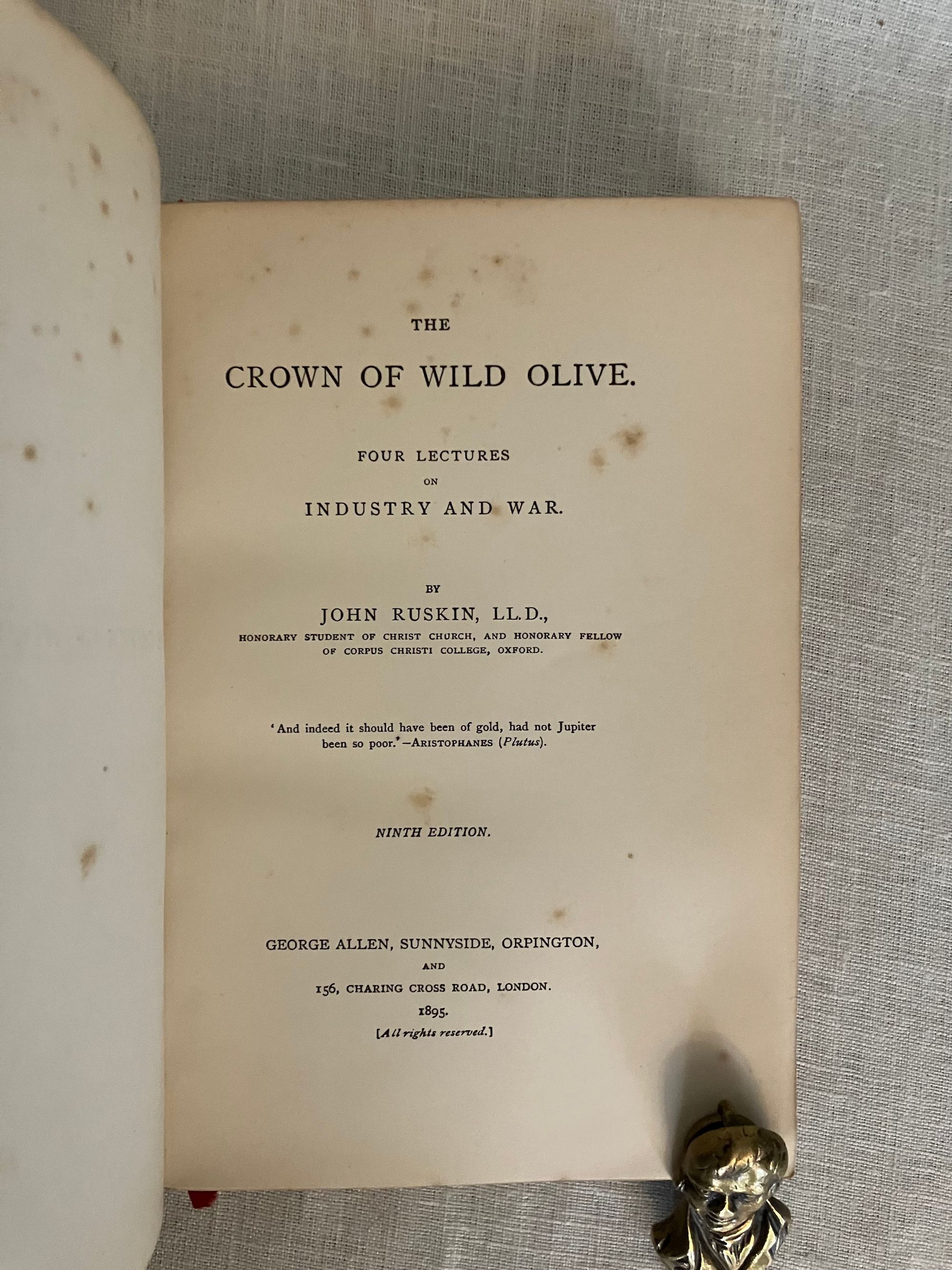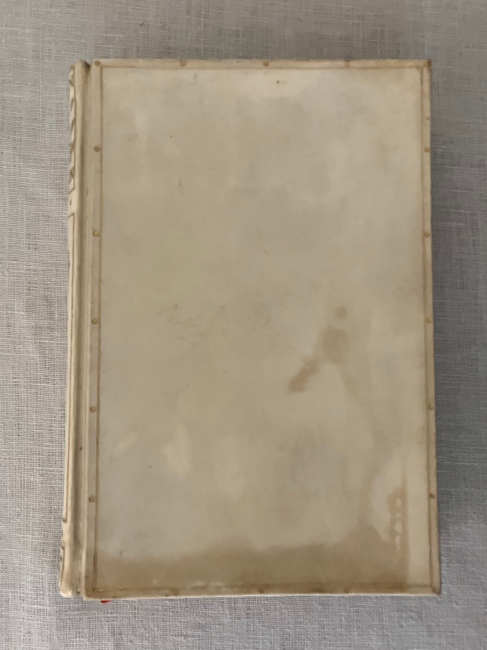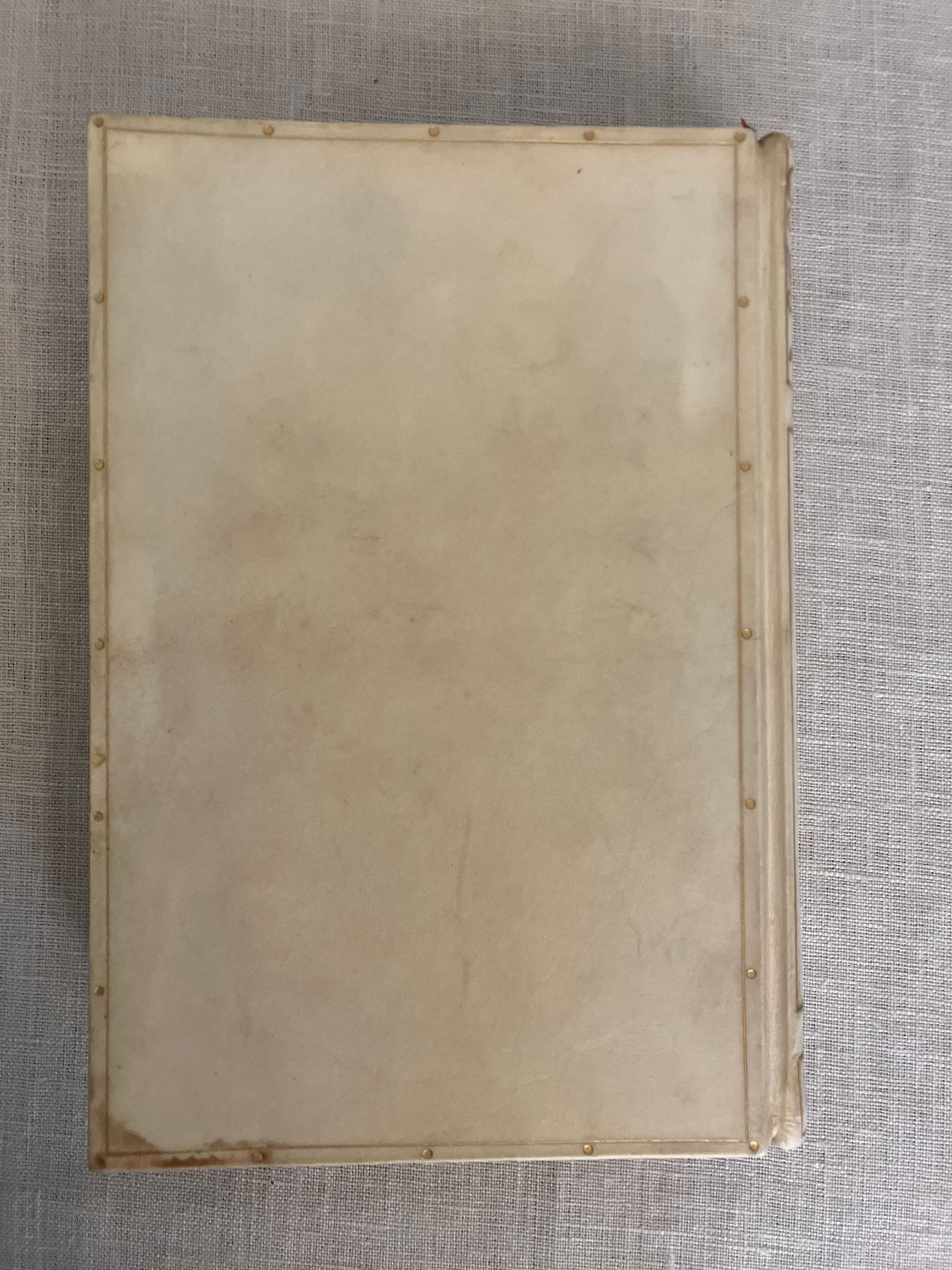 Reprint, Ninth edition. Hard cover 8vo, finely bound in a British Arts and Crafts style for Hatchard's in full vellum over boards tooled with gilt rule and dots intermittently around outer edges, the spine tooled in faux bands highlighted with dots with title to the uppermost compartment designed attractively with superscript o's and diagonally-placed ovoid leaves. Gilt rolled turn ins, pastel colored marbled end papers with binder's signature to bottom front turn-in: "Hatchards of Piccadilly." Top edge gilt. Printed on smooth japon-like stock by Ballantyne and Hanson, Edinburgh and London. [9], 1-276 [3] pp. including index.**CONDITION: Very Good, generally. Staining and minor soiling affects vellum, especially on boards, as seen. (See more pix on our website.) Original red silk ribbon marker laid in. Boards a little bowed. Hinges are in order and book remains square and tight. Foxing to prelims affects title page. Old Christmas gift inscription dated 1896.** These essays on political economy are transcripts of speeches by the eminent British art historian and social critic John Ruskin (1819-1900). Lecture I , "Work," was delivered to the Working Men's Institute at Camberwell. The second lecture, "Traffic," was given at the Town Hall in Bradford. The third address, "War" was a lecture delivered to the Royal Military Academy, Woolwich in 1865. Lecture Four, "The Future of England," dates from 1870 and was delivered to the Royal Artillery Institution. The book also has an Appendix with "Notes on the Economies of the Kings of Prussia," and an Index. Ruskin equates the rise of democracy, poverty, anarchy, atheism and war with the demise of what he sees as the stabilizing influence of strong monarchies in firm control of the social order. First published in 1866. Watson 1347.