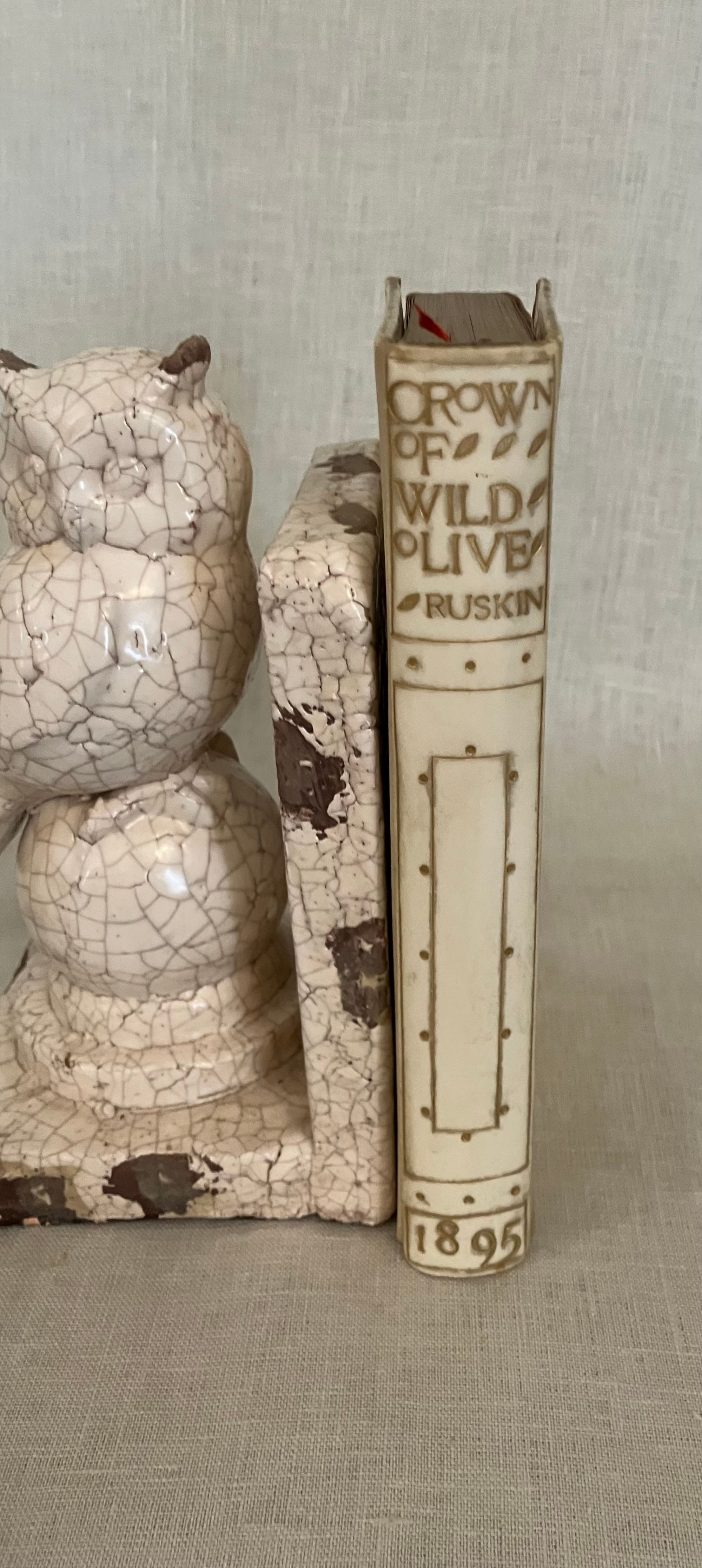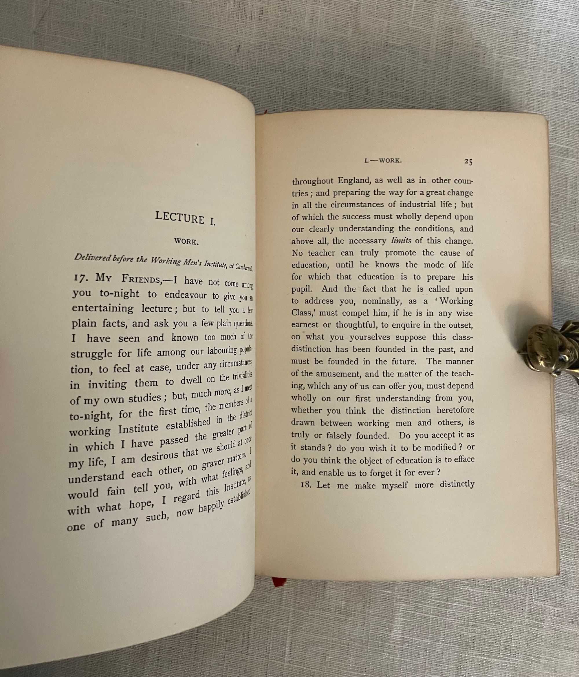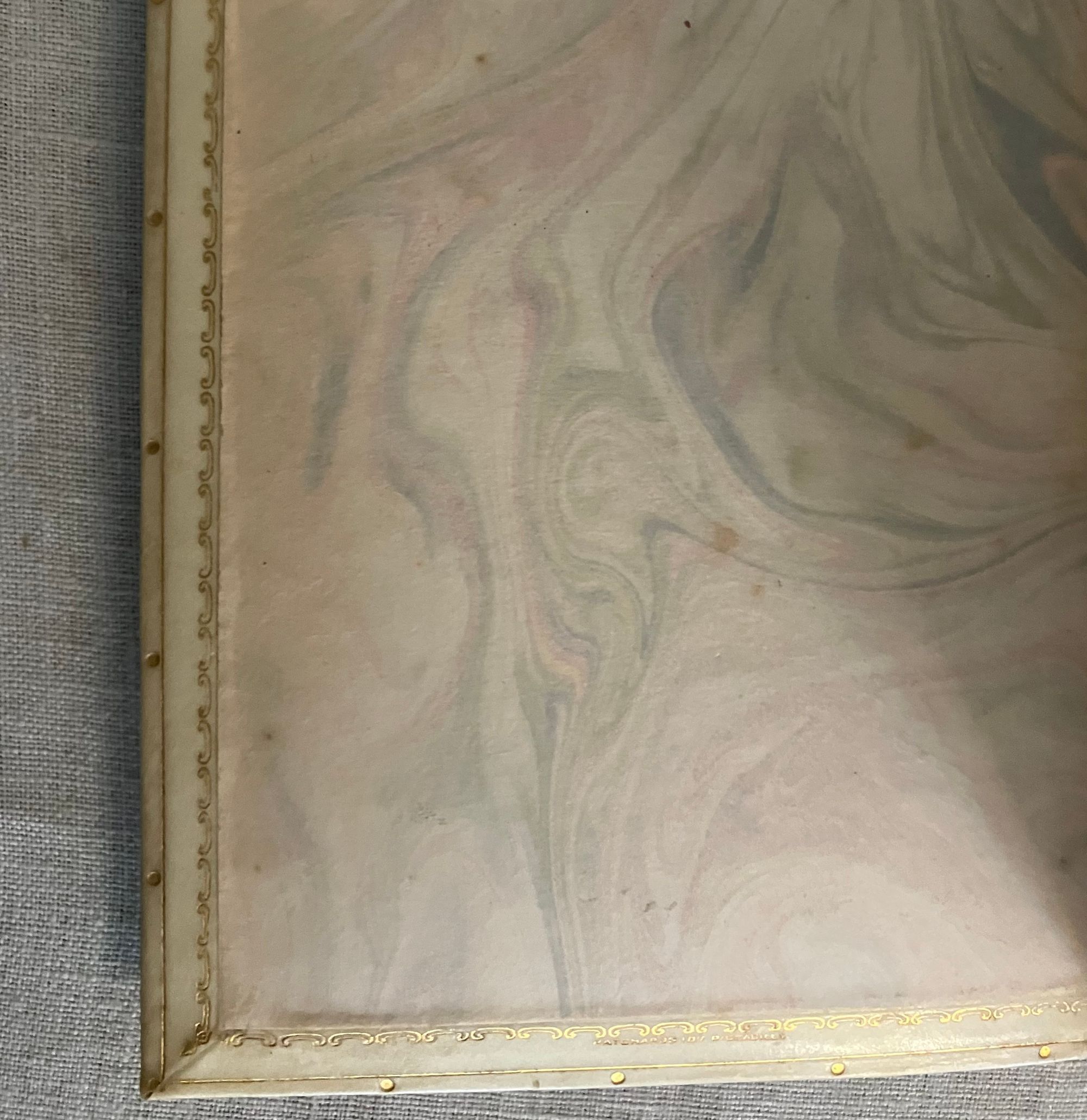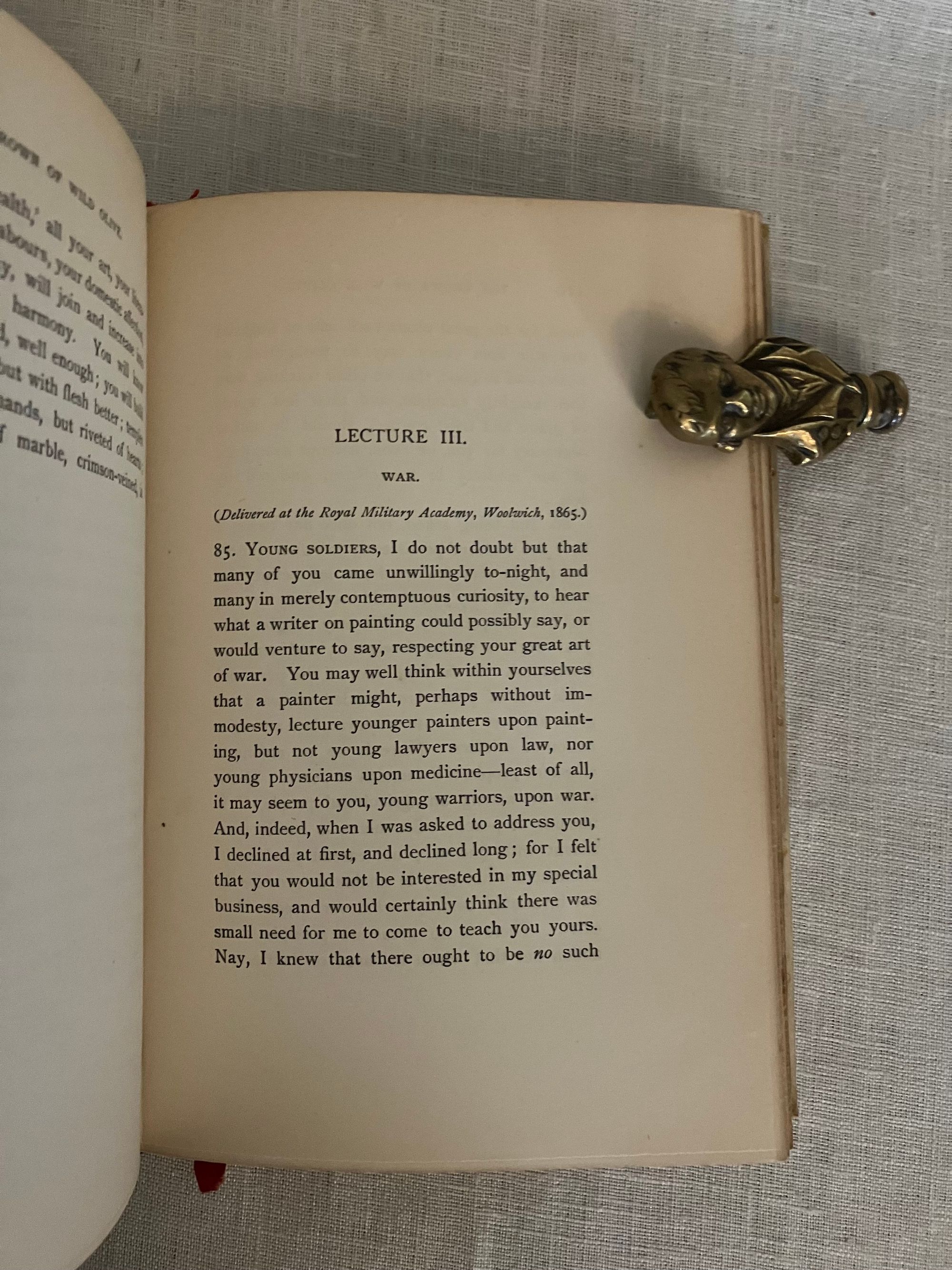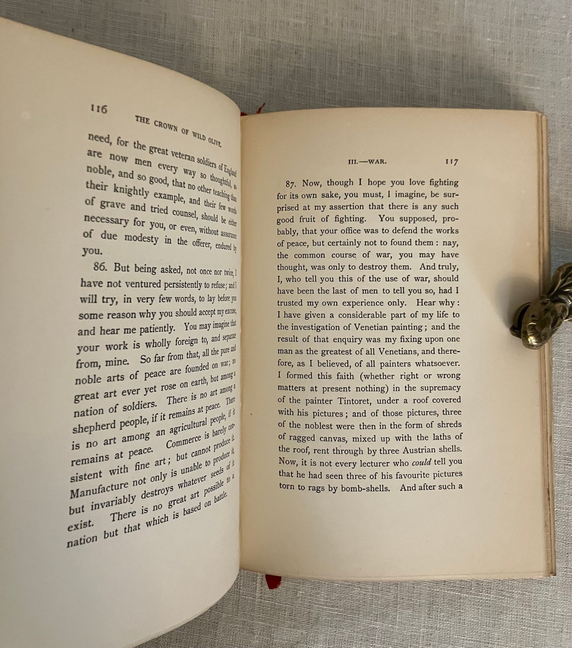Reprint, Ninth edition. Hard cover 8vo, finely bound in a British Arts and Crafts style for Hatchard's in full vellum over boards tooled with gilt rule and dots intermittently around outer edges, the spine tooled in faux bands highlighted with dots with title to the uppermost compartment designed attractively with superscript o's and diagonally-placed ovoid leaves. Gilt rolled turn ins, pastel colored marbled end papers with binder's signature to bottom front turn-in: "Hatchards of Piccadilly." Top edge gilt. Printed on smooth japon-like stock by Ballantyne and Hanson, Edinburgh and London. [9], 1-276 [3] pp. including index.**CONDITION: Very Good, generally. Staining and minor soiling affects vellum, especially on boards, as seen. (See more pix on our website.) Original red silk ribbon marker laid in. Boards a little bowed. Hinges are in order and book remains square and tight. Foxing to prelims affects title page. Old Christmas gift inscription dated 1896.** These essays on political economy are transcripts of speeches by the eminent British art historian and social critic John Ruskin (1819-1900). Lecture I , "Work," was delivered to the Working Men's Institute at Camberwell. The second lecture, "Traffic," was given at the Town Hall in Bradford. The third address, "War" was a lecture delivered to the Royal Military Academy, Woolwich in 1865. Lecture Four, "The Future of England," dates from 1870 and was delivered to the Royal Artillery Institution. The book also has an Appendix with "Notes on the Economies of the Kings of Prussia," and an Index. Ruskin equates the rise of democracy, poverty, anarchy, atheism and war with the demise of what he sees as the stabilizing influence of strong monarchies in firm control of the social order. First published in 1866. Watson 1347.