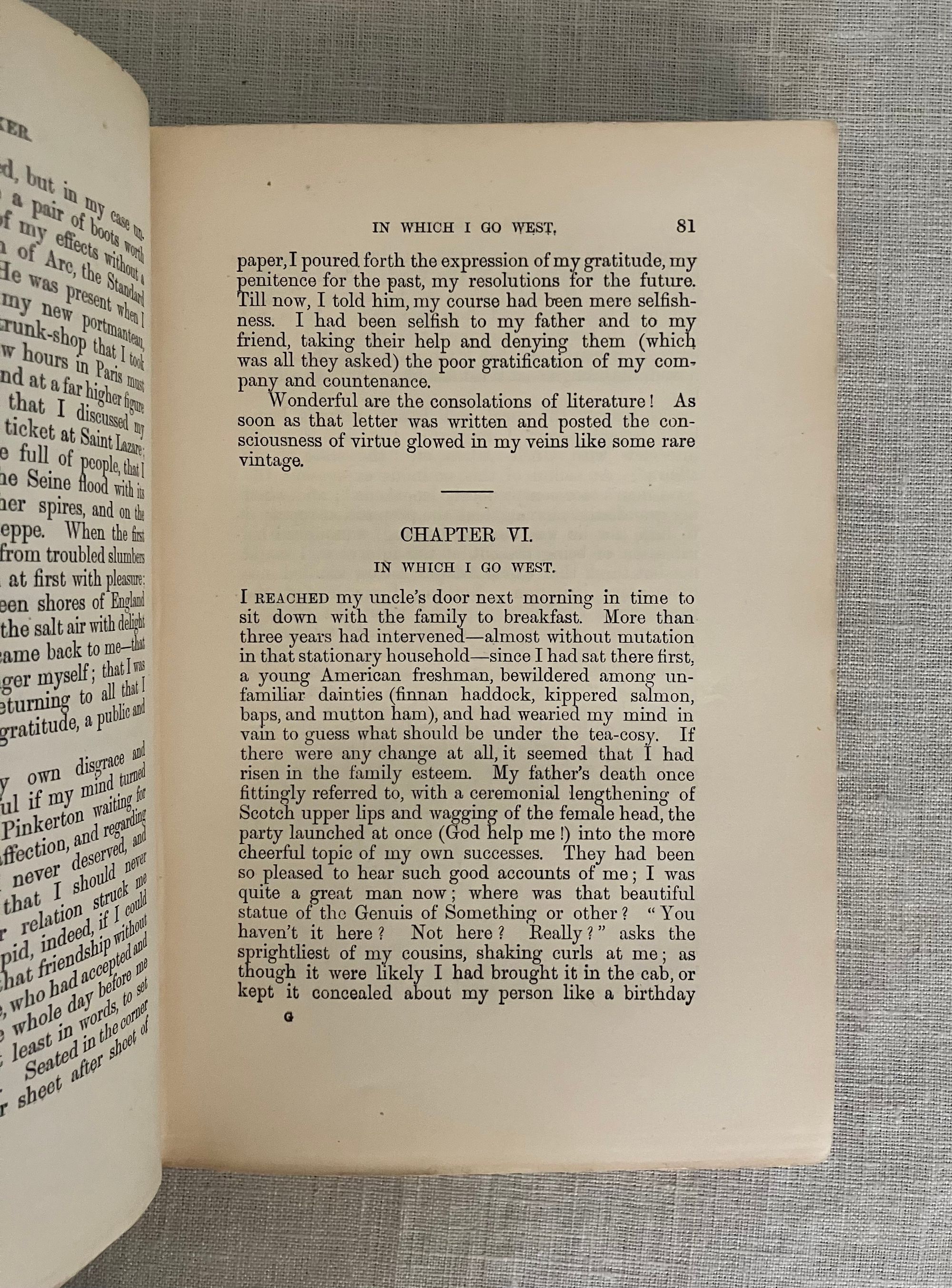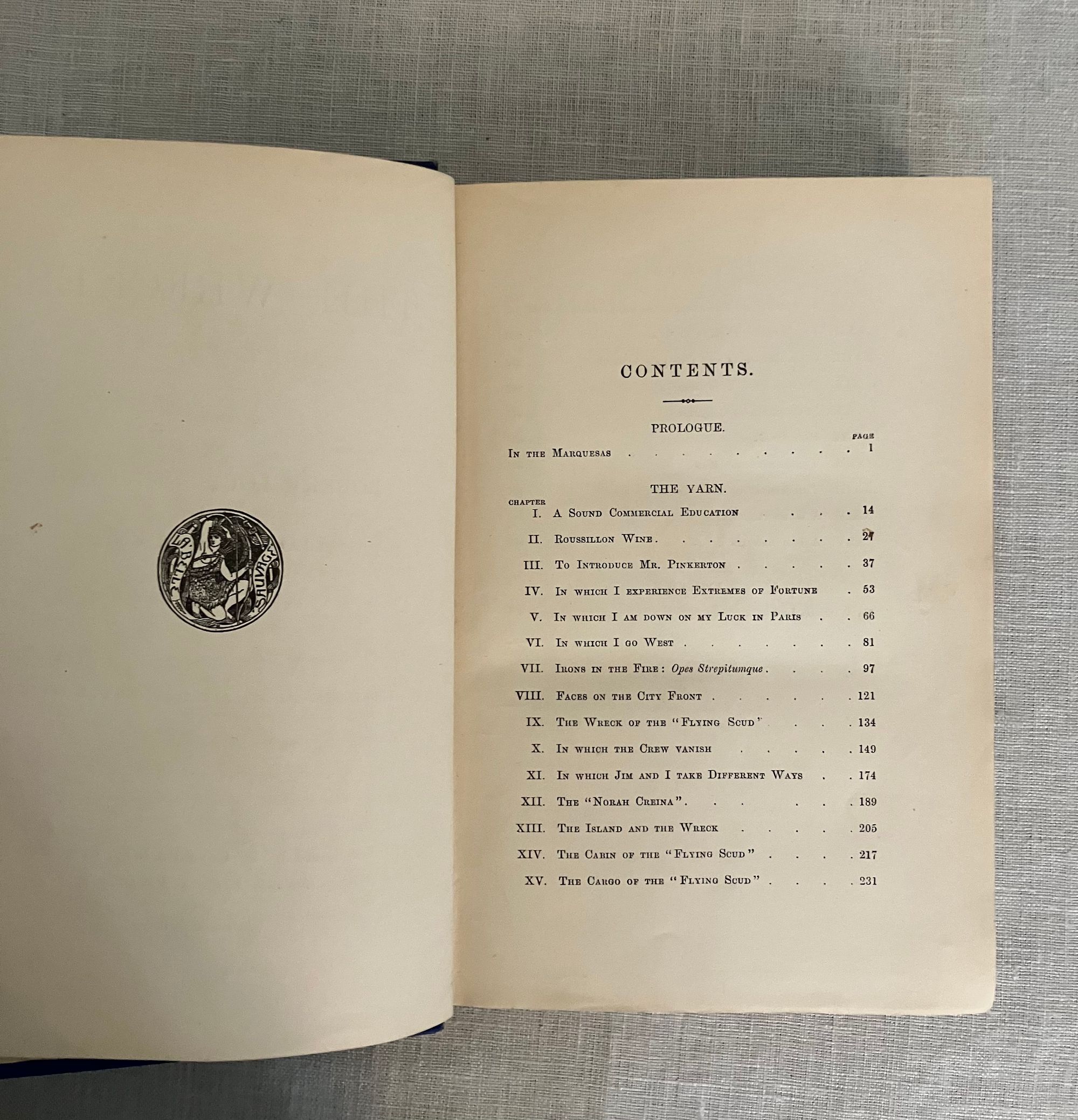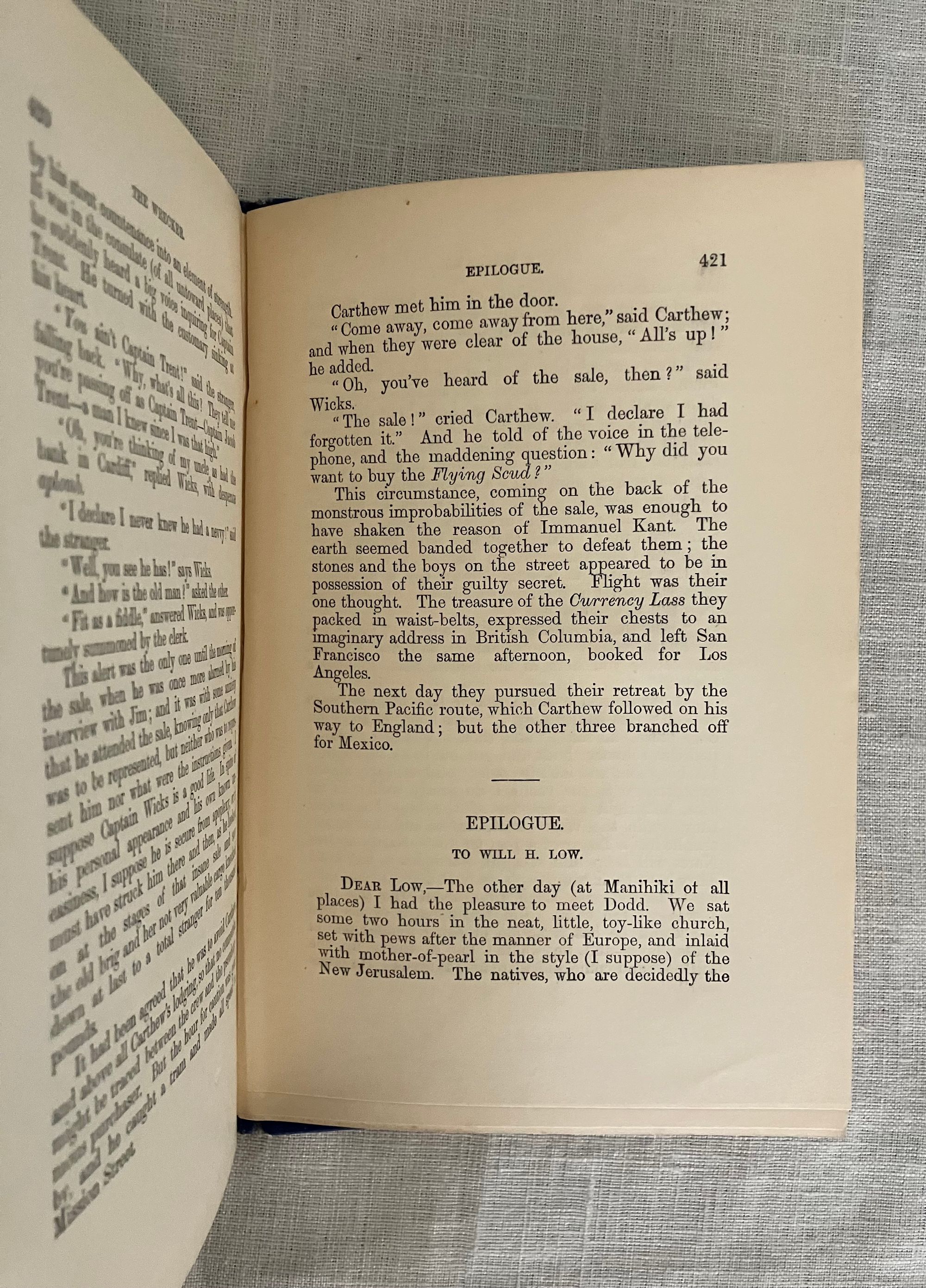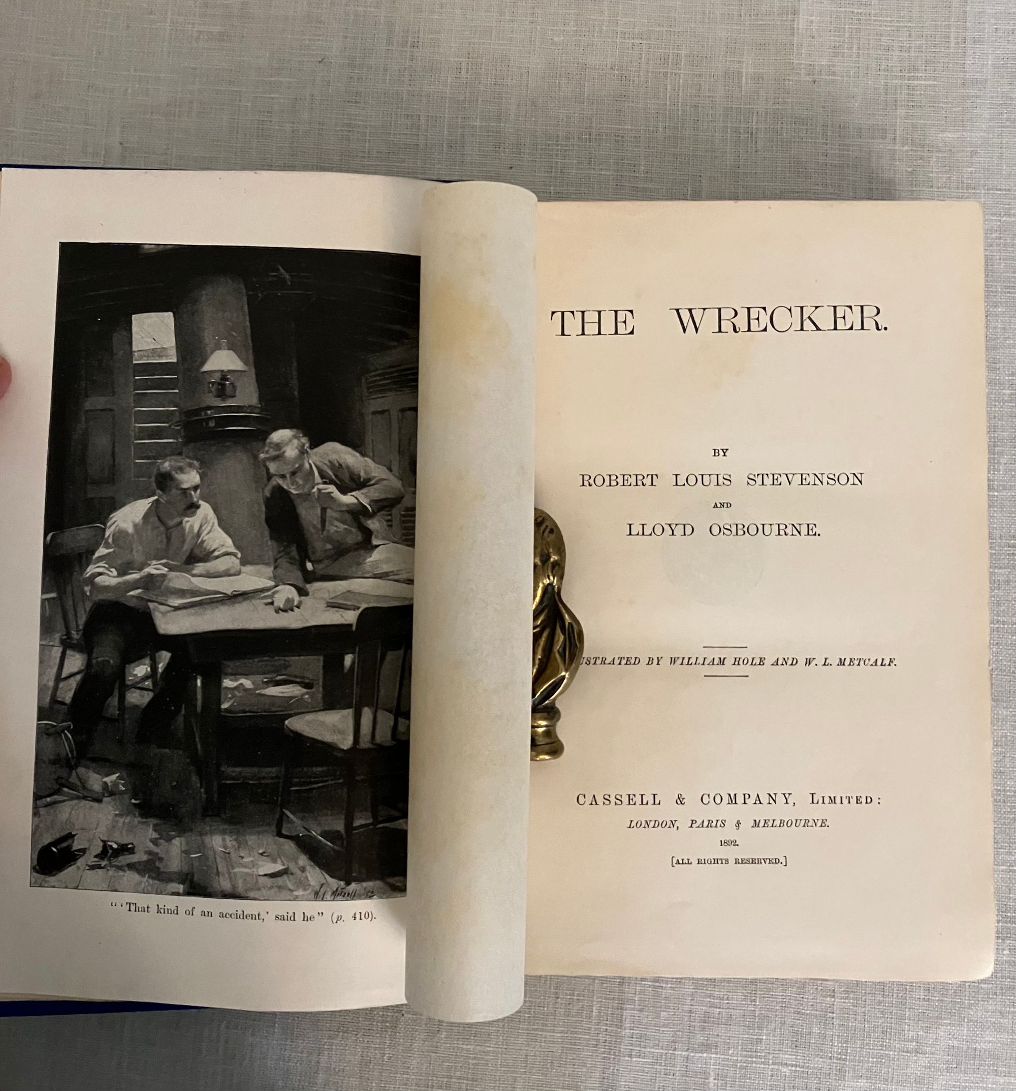This is the First English Edition in book form; serialized in Scribner's Magazie Aug. 1891-July 1892. Hard cover, 8vo, in blue cloth, the boards plain with title blocked to the spine in a hand drawn typeface, the two author's names and publisher at foot of spine. Plain cream endpapers, with black and white tissue guarded frontispiece illustration: "That kind of an accident,"said he". 15 illustrations. No copyritght statement (instead, a publisher's round logo entitled "La Belle Savage.") vi, [vii] (blank), [1]- 427pp. plus 12pp. Cassel & Company publishers advertising section, headlined "A Story of Pirates and the Spanish Main," ad for RSL's Treasure Island. CONDITION: Very Good Minus. Boards a bit rubbed, both hinges have started and spine is a bit cocked. **Edinburgh novelist, essayist and poet Robert Louis Stevenson (1850-1894) wrote this novel in collaboration with his step-son, Lloyd Osbourne, during 1891. This was during RLS's later years when he had long departed Scotland for Samoa and where a lifelong struggle with tuberculosis was mitigated by the South Seas climate.** Most of the book is narrated by Loudon Dodd, an American from the fictional State of Muskegon, USA. Unhappy as a business school student, Dodd convinces his father to send him to Paris to pursue his real passion, sculpture. He stops on the way in Scotland to meet his Edinburgh relatives, and makes a favorable impression on his grandfather, a down to earth home builder, who generously irons out of a few financial problems for his grandson throughout the story. While in Paris, Dodd meets Pinkerton, an enterprising man with many money-making ideas. The pair ends up in San Francisco, purchasing the wreck of a cargo ship, "The Flying Scud." Mysterious circumstances surround the history of this supposed shipwreck off Midway Island. Dodd and Pinkerton originally believe the cargo to have been silks and tea; later they suspect it contained opium. The original crew and captain appear to have disappeared and a mysterious proxy drives up the auction price. With exotic settings from the Polynesian Marquesas Islands, to Honolulu, Paris, Edinburgh and beyond, this is an excellent mystery read. Later translated into many languages. REF: Col. W.F. Prideaux, No. 34. p. 80. Watson 1007.