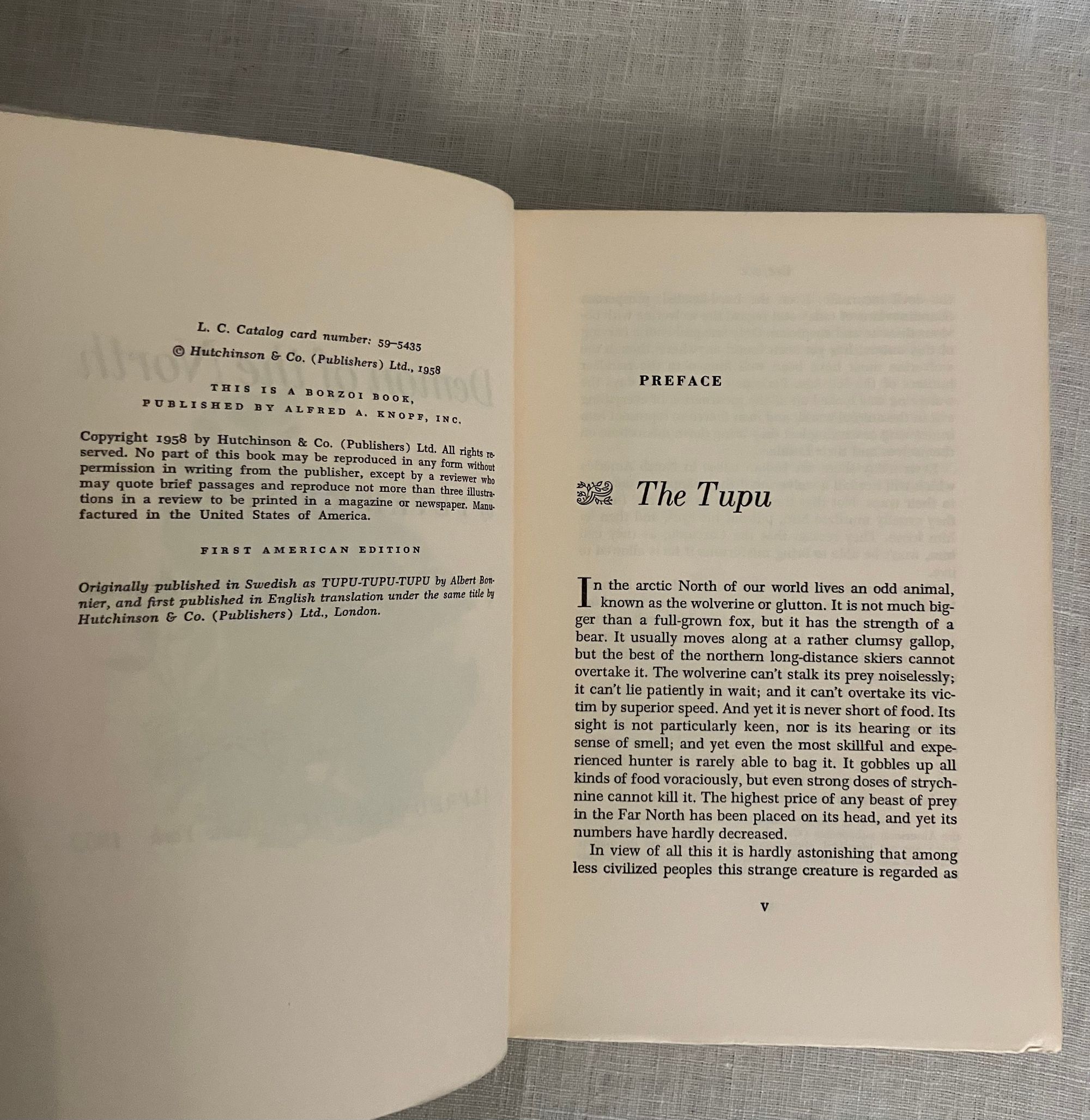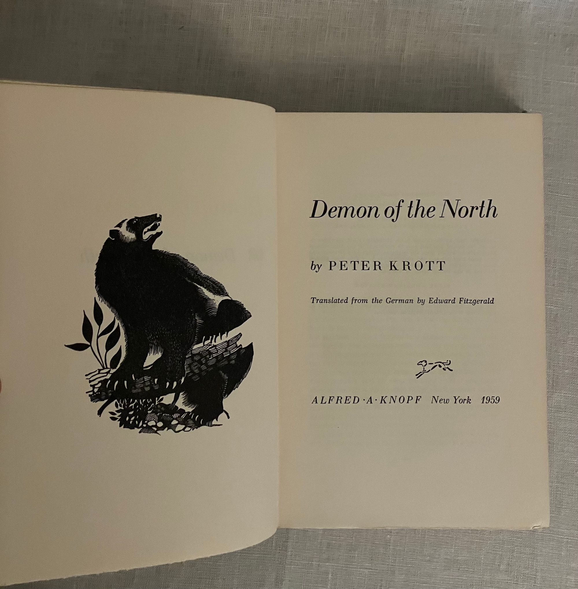 Hard cover, 8vo, in black cloth, the spine with titles and decoration in gold, in the original pictorial dust jacket, now protected in mylar. In English, (translated from the German.) xiii, 259 pp. with black and white photo illustration.**CONDITION: Fine in a fine dust jacket, in mylar. With bookplate of original owner, mammalogist Larry C. Watkins, to front endpaper. **Austrian Author Peter Krott (b. 1919) studied Forestry at the Universities of Helsinki and Gottingen. Later, he bred and exported animals for scientific research in Finland. His study of the behavior of the wolverine, (the topic of this book,) followed in Sweden. Krott's facination with the arctic wolverine leads him to adopt a number of pups and bring them up at home, where he finds them companionable despite a reputation for being aggressive and nasty. The travails of releasing his pack back into the wild forms the drama of this story.