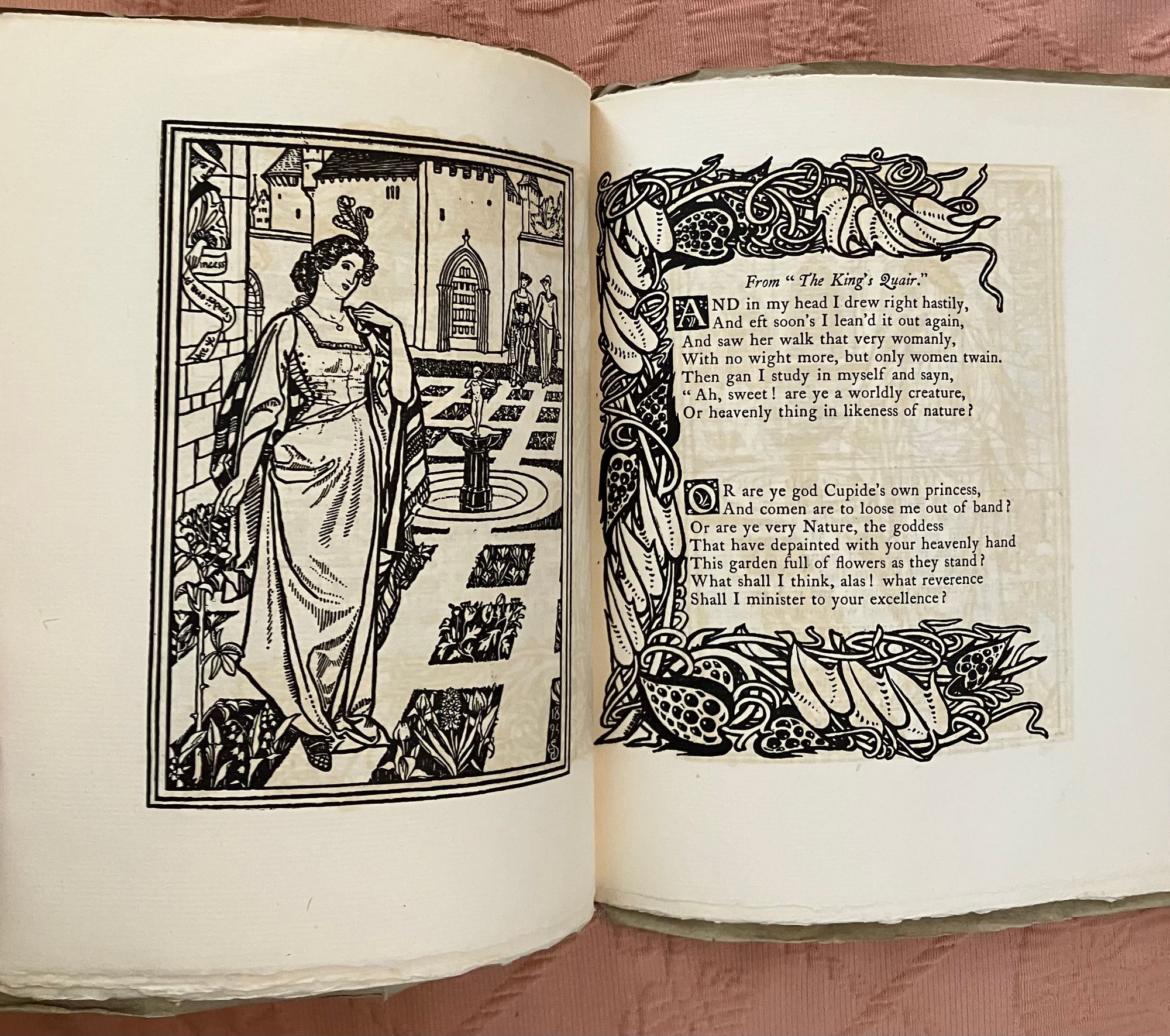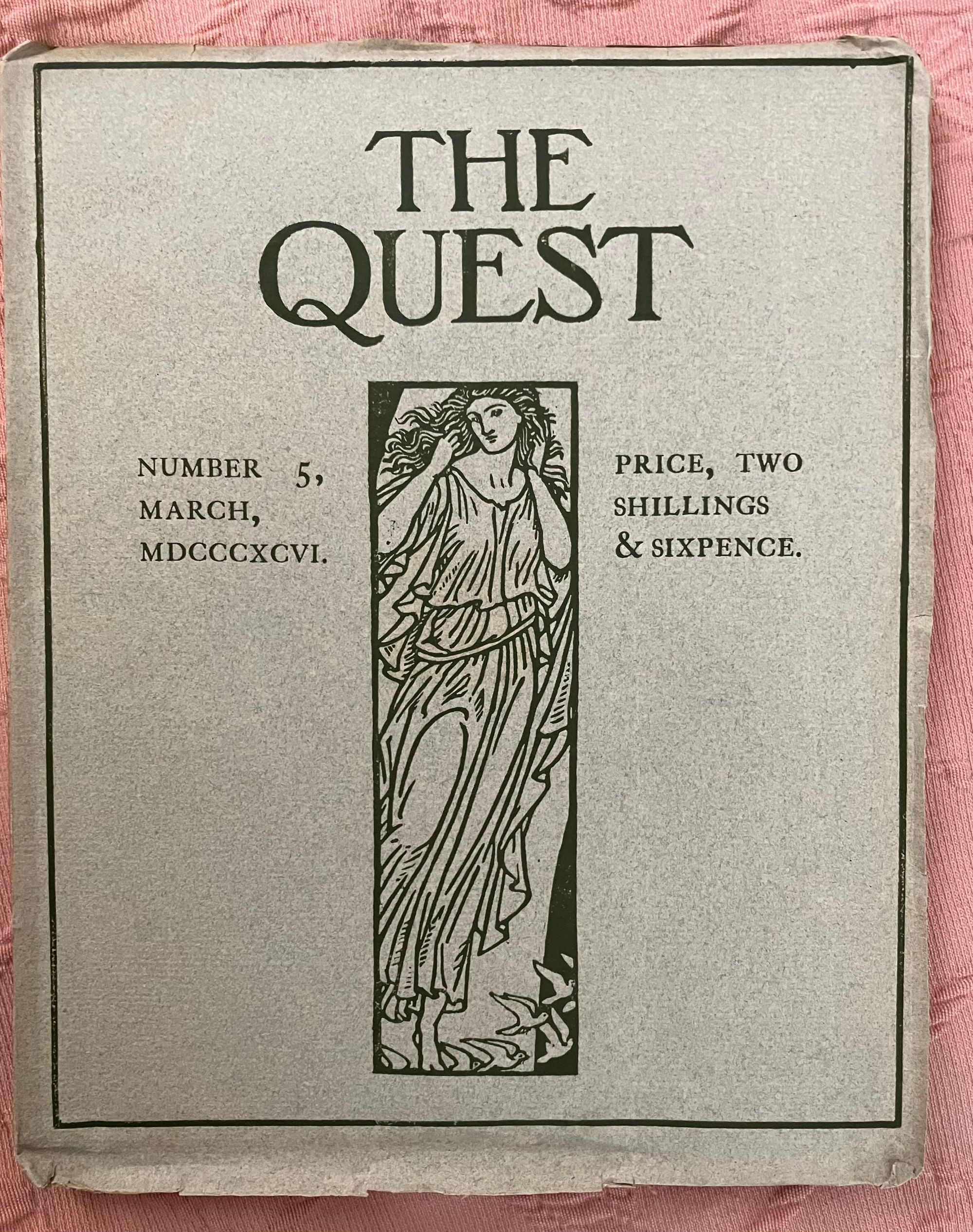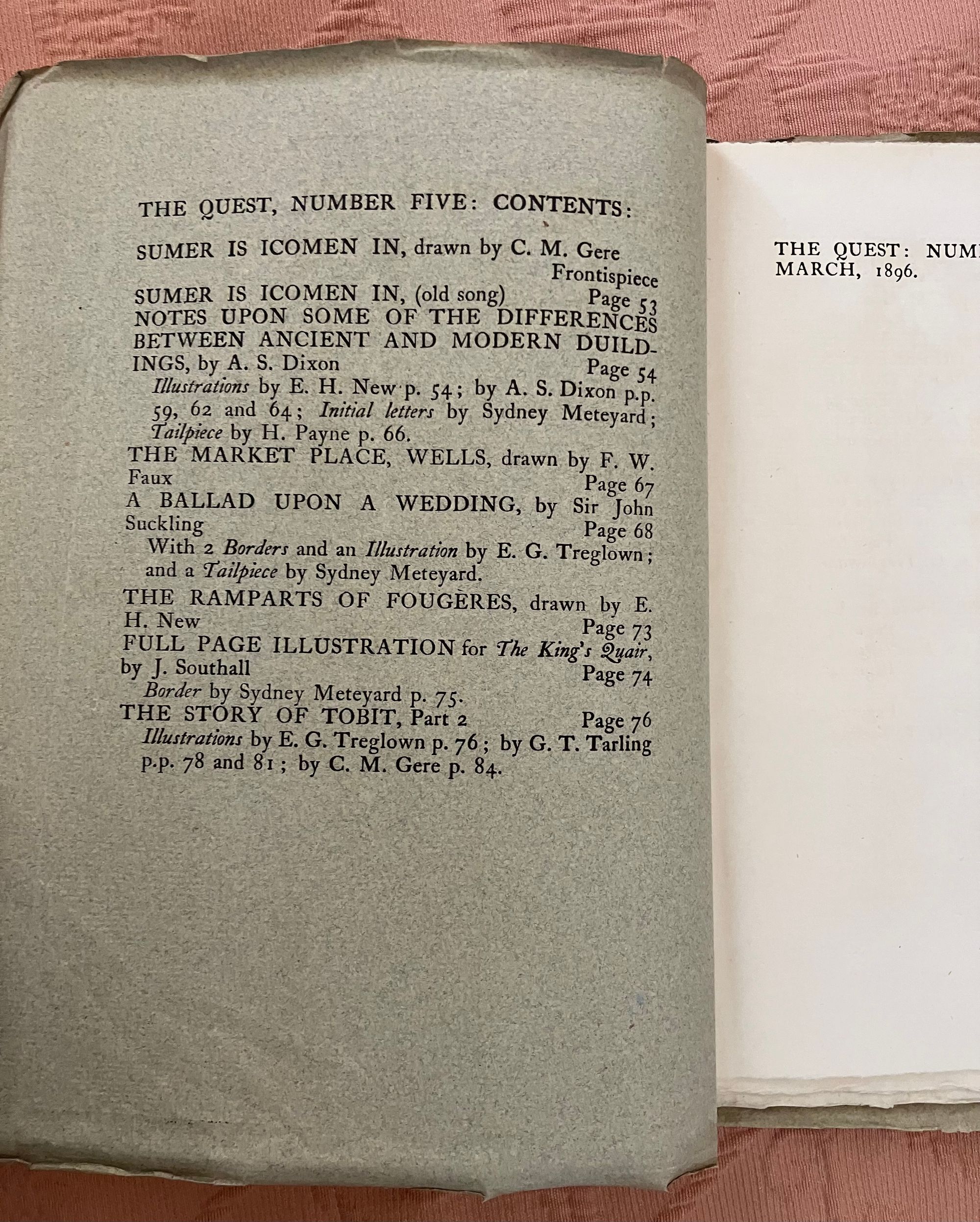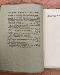 Soft cover periodical, single issue, in green-grey printed paper wraps, quarto, (7-1/2 x 9-1/2 inches), the cover with engraved decoration to front of wraps printed in black. Contains 5 full page woodblock carved printed illustrations, 11 partial page in-text illustrations, 8 decorated initial capitals, and 4 decorative borders, (including ads and front of wraps, hand printed on Dutch handmade paper. Thus, [2, title and limitation pg.], [blank], [52-53] 54-87pp. , [plus 4pp. advertising], [1]. Numbering is consecutive with that of Quest Issue No. 4, see our listing 9417. **CONDITION: About Fine, with a some very, very minor crease to front of wraps, slight darkening to spine, and some slight offset browning to text, seen opposite plates. Now with tissue inserted. Overall, though, this is clean and has been well cared for. **This issue has decidedly medieval and architectural themes, marking it relevant in the Pre-Raphaelite and William Morris vein of promoting the past as a template for chivalric values, proper, handmade workmanship, and honoring the labor of the craftsperson. Hence, the article" Notes Upon Some of the Differences Between Ancient and Modern Buildings," by the architect and metalworker Arthur Stansfield Dixon (1856-1929), founder of the Birmingham School of Handicraft, and designer of their original premises. Other highlights include Edmund Hort New's wonderful full-page illustration of the medieval French castle at Fougerès. Located in Brittany, this holdfast was destroyed by Henry II in the twelfth century, and later rebuilt as a more durable fortification, sheltering artisans such as tanners, weavers, drapers and, later, glass works. *Following is a selection from the "King's Quair," the 15th-century poem written by the Scottish King James I (1394- 1437), and decorated with illustration by J. Southall and a border by Sydney Meteyard. [The ten-year old King James I sailed from North Berwick, via Bass Rock, in 1403, as his father, King Richard III attempted to keep him safe from the Stewarts. However, James was kidnapped at sea, imprisoned in the Tower of London and, later, Windsor Castle, by agents of the English King Henry IV, and not released until 1424.] The verses are from stanza 42-43 of James's poem, unfortunately "english-afied" from the original Scots. His captivity introduced him to the woman who would become his queen, and this is the section of the poem represented in these pages. (See, Skeat, "The Kingis Quair..." (Edinburgh and London: William Blackwood and Son, 1884) pp. vii-ix. Watson 567.