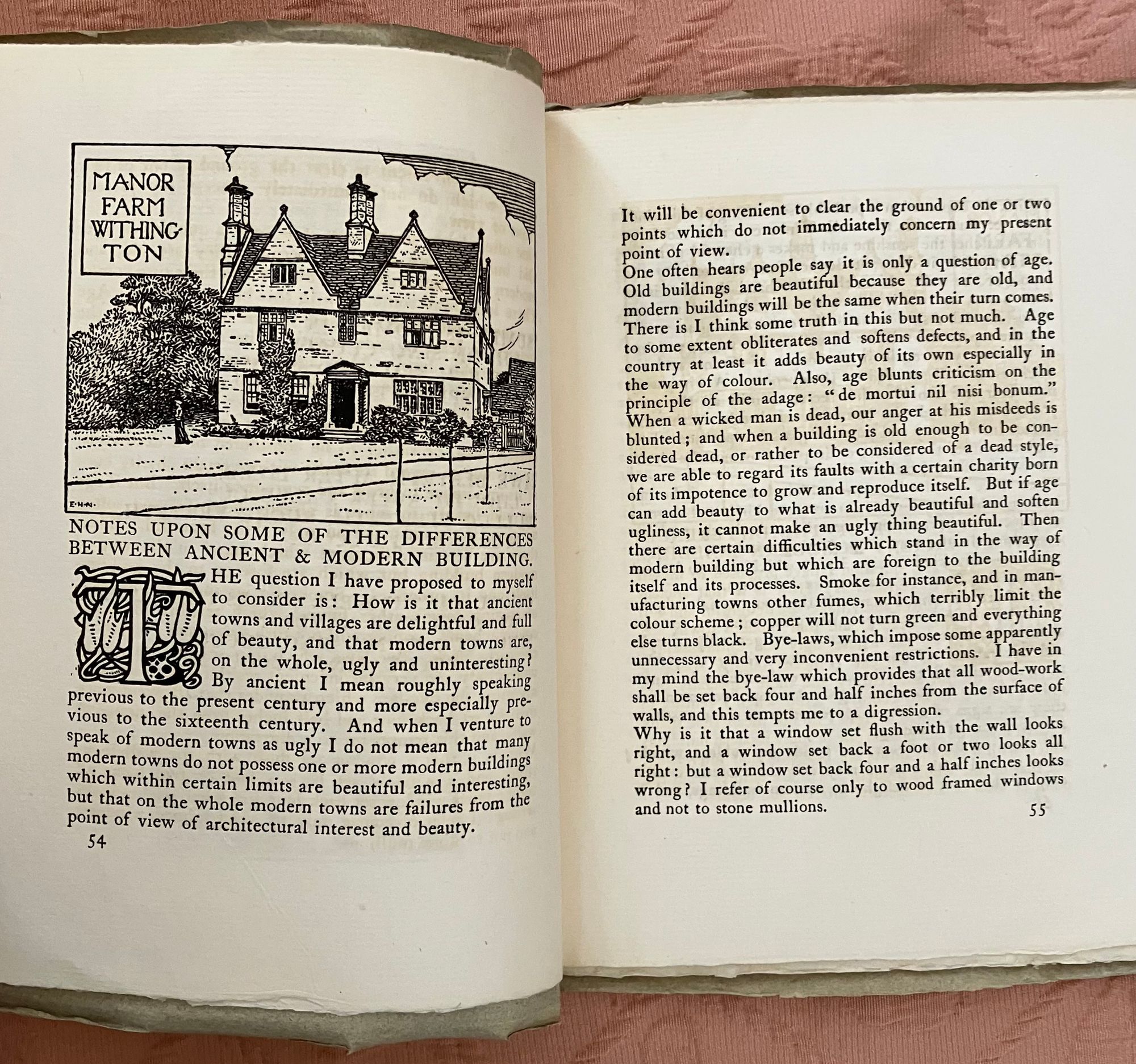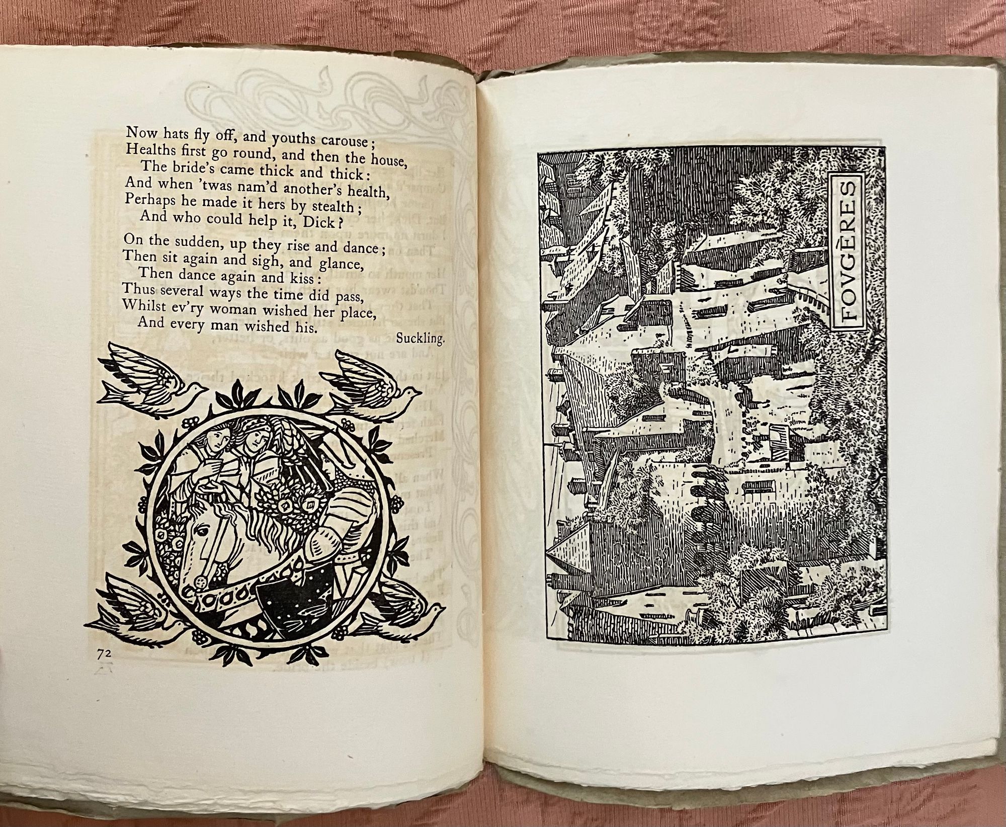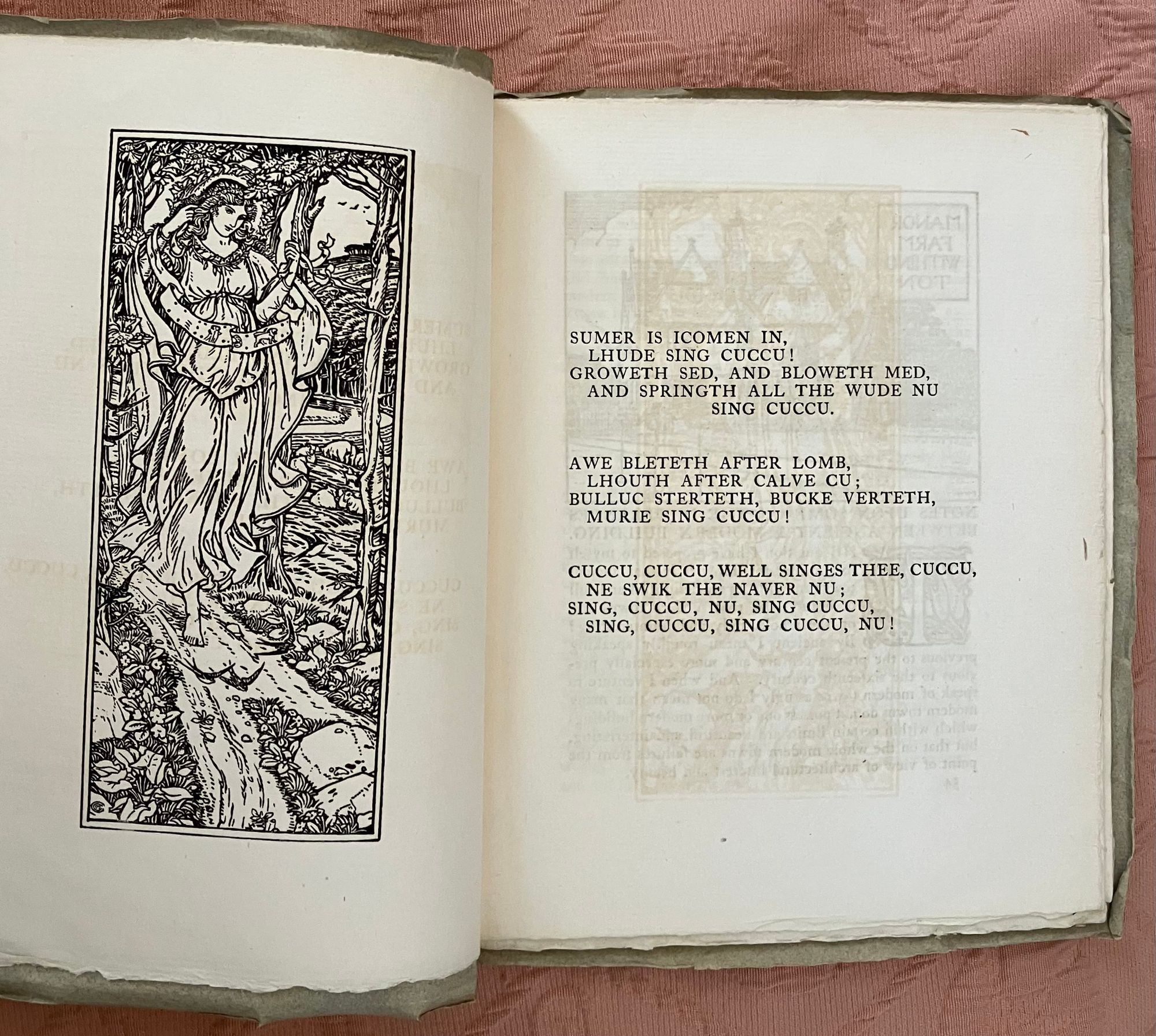 Soft cover periodical, single issue, in green-grey printed paper wraps, quarto, (7-1/2 x 9-1/2 inches), the cover with engraved decoration to front of wraps printed in black. Contains 5 full page woodblock carved printed illustrations, 11 partial page in-text illustrations, 8 decorated initial capitals, and 4 decorative borders, (including ads and front of wraps, hand printed on Dutch handmade paper. Thus, [2, title and limitation pg.], [blank], [52-53] 54-87pp. , [plus 4pp. advertising], [1]. Numbering is consecutive with that of Quest Issue No. 4, see our listing 9417. **CONDITION: About Fine, with a some very, very minor crease to front of wraps, slight darkening to spine, and some slight offset browning to text, seen opposite plates. Now with tissue inserted. Overall, though, this is clean and has been well cared for. **This issue has decidedly medieval and architectural themes, marking it relevant in the Pre-Raphaelite and William Morris vein of promoting the past as a template for chivalric values, proper, handmade workmanship, and honoring the labor of the craftsperson. Hence, the article" Notes Upon Some of the Differences Between Ancient and Modern Buildings," by the architect and metalworker Arthur Stansfield Dixon (1856-1929), founder of the Birmingham School of Handicraft, and designer of their original premises. Other highlights include Edmund Hort New's wonderful full-page illustration of the medieval French castle at Fougerès. Located in Brittany, this holdfast was destroyed by Henry II in the twelfth century, and later rebuilt as a more durable fortification, sheltering artisans such as tanners, weavers, drapers and, later, glass works. *Following is a selection from the "King's Quair," the 15th-century poem written by the Scottish King James I (1394- 1437), and decorated with illustration by J. Southall and a border by Sydney Meteyard. [The ten-year old King James I sailed from North Berwick, via Bass Rock, in 1403, as his father, King Richard III attempted to keep him safe from the Stewarts. However, James was kidnapped at sea, imprisoned in the Tower of London and, later, Windsor Castle, by agents of the English King Henry IV, and not released until 1424.] The verses are from stanza 42-43 of James's poem, unfortunately "english-afied" from the original Scots. His captivity introduced him to the woman who would become his queen, and this is the section of the poem represented in these pages. (See, Skeat, "The Kingis Quair..." (Edinburgh and London: William Blackwood and Son, 1884) pp. vii-ix. Watson 567.