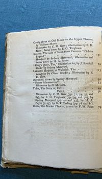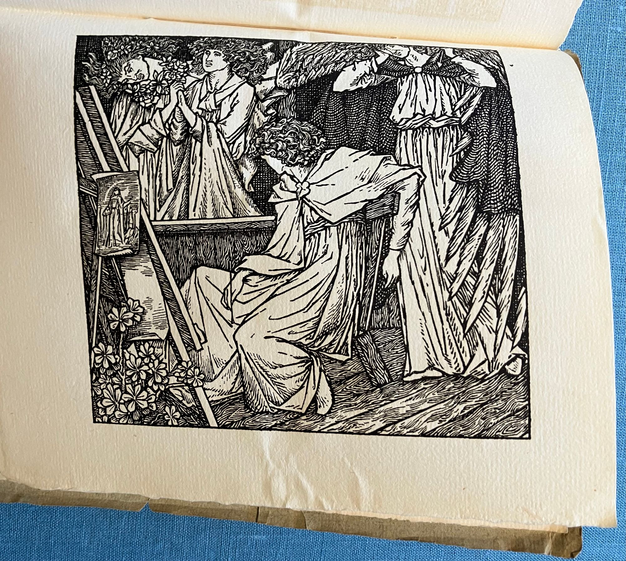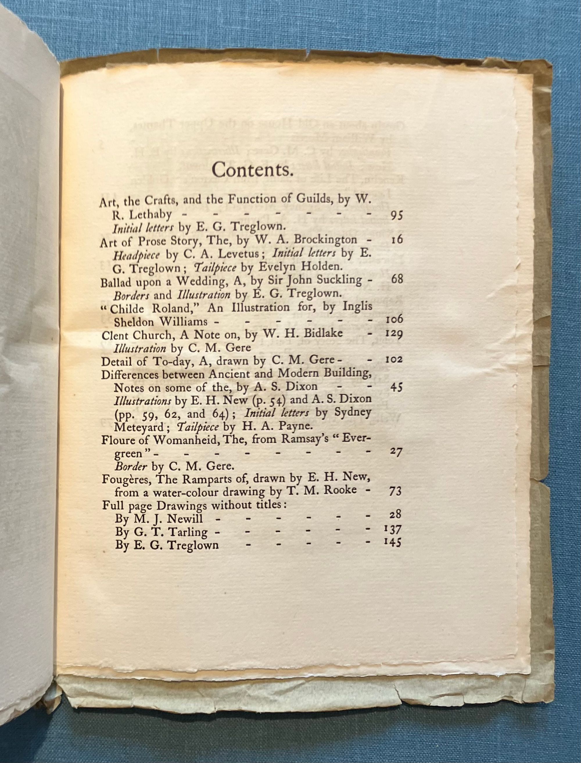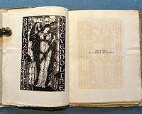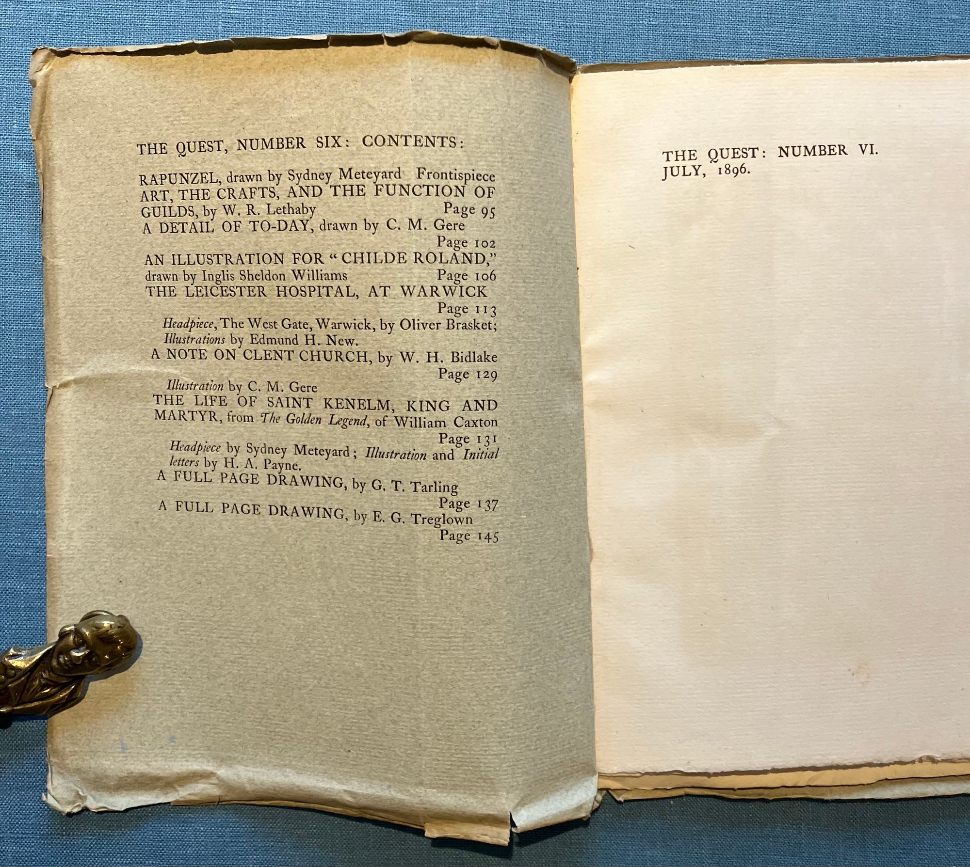Soft cover periodical, single issue, in green-grey printed paper wraps, quarto, (7-1/2 x 9-1/2 inches), the cover with engraved decoration to front printed in black. Contains 10 full page black and white illustrations by various artists of the Guild, including Edmund Hort New, Sydney Meteyard, C. M. Gere, Inglis Sheldon Williams, E.H. New, G.T. Tarling and E. G. Treglown, each preceded by a title sheet. Also, three partial page illustrations, two borders, 1 footer and 18 decorative initial caps. An index of the three issues comprising Vol. 2 appears as well. (Numbering is continuous from prior issue.) Thus: [2], [blank], [2], [blank], 95-144pp., [1], [blank], [1], [blank], [1], [blank], [5pp., vol. index and ads].**CONDITION: Very Good. Sound and clean, although with moderate folding which affects the margin of each page. Edges of the yapp-edged wraps have a few some minor (1/4 or less) tears and rumple, as seen. Very light browning at the spine. **Contents: British architect, preservationist, art historian and friend of William Morris, William Lethaby (1857-1931) provides an article entitled "Art, the Crafts, and the Function of Guilds." The onetime Surveyor for Westminster Abbey, Lethaby was responsible for the cleaning and preservation of the fabric of the building in the from 1906- 1928. Additionally, he was principal of London's Central School of Arts and Crafts, Professor of Design at the Royal College of Art and on the Committee for the Preservation of Ancient Buildings. Between 1894 and 1900 he had two building projects in Birmingham, which no doubt brought him into contact with the the work of the Guild. As an early friend of William Morris, he was also involved in the very early meetings of the Kelmscott Press, and later, as a defender of Morris's aims in the period after World War One when his work went somewhat out of favor. ( L. Parry, p. 21; Peterson, History, p. 290)** A portion of Robert Browning's 1852 narrative poem "Childe Roland to the Dark Tower Came" is illustrated here by the English-born artist Inglis Sheldon Williams (1870-1940). The poem has been described as having moody, quest-like theme. Williams emigrated to Saskatchewan, Canada for a time, returning to London to study at the Slade School of Art, later traveling extensively and becoming an official war artist for the Canadians during the First World War. (Nat. Portrait Gallery) **A selection from William Caxton's "The Golden Legend," the Story of Seynt Kenelme, also appears in this issue. The text is presumably taken from William Morris and F.S. Ellis's three-volume Kelmscott edition of 1892, and there is certainly some fun to be had comparing the two sets of texts and noting the minor similarities and differences. However, the significant differences are found in the new illustrations and overall page design provided by the BGH artists, consisting of Meteyard's headpiece, the fancy initial capitals by H.A. Payne, as well as Tarling and Tregown's new full page illustrations of this story of the martyrdom of the ninth century King Kenelme, who was murdered by his sister Quyndrede and her lover Askeberd in an attempt to usurp power in the Welch Marches. Picturesque details of the tale provide ample fodder for the detail of these new drawings. (William Caxton, responsible for the printing of England's earliest books, had famously translated this book of saint's histories known as "The Golden Legend" from the original Latin version compiled by the medieval Bishop of Genoa, Jacobus de Voragine, published by Caxton in 1483.) Following this section are more items relating to the Kenelme story, including W.H. Bidlake's "A Note on Clent Church," and C.M. Gere's illustration of the same. [It is interesting to note that some of the art here was used in later editions of the "Golden Legend," cf. C.M. Gere's illustration in G.V. O'Neill's "The Golden Legend, Lives of the Saints" ( Cambridge, University Press, 1914.)] REFS: DNB, Linda Parry, edit. "William Morris," (New York," Harry N. Abrams, Inc., 1996). pp. 21, 35, 79 etc. W. S. Peterson, Bibliography, A7, pp.19-24. Peterson, History, pp. 290-293. [Please see related Quest issue 5, our no. 9419. The two issues are also available as a set, details upon request--it was thought best to list separately in order to provide differentiated detail.] Scarce.