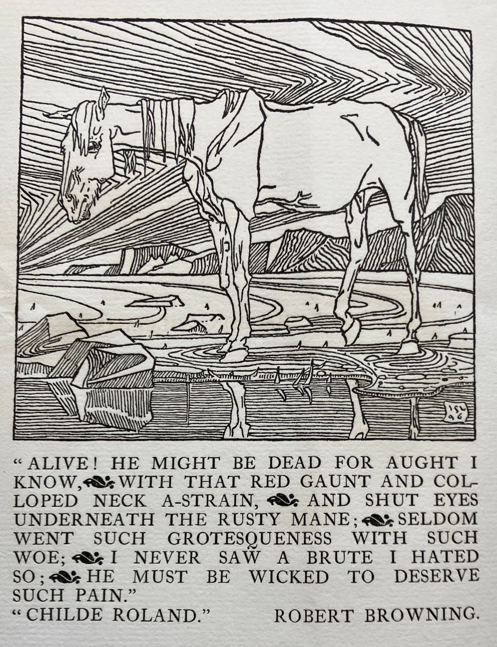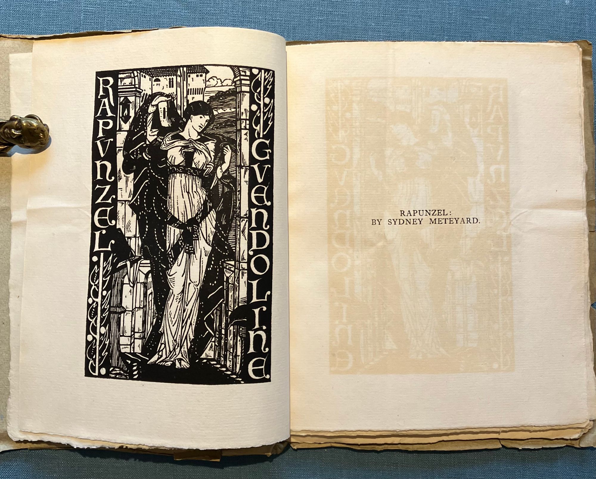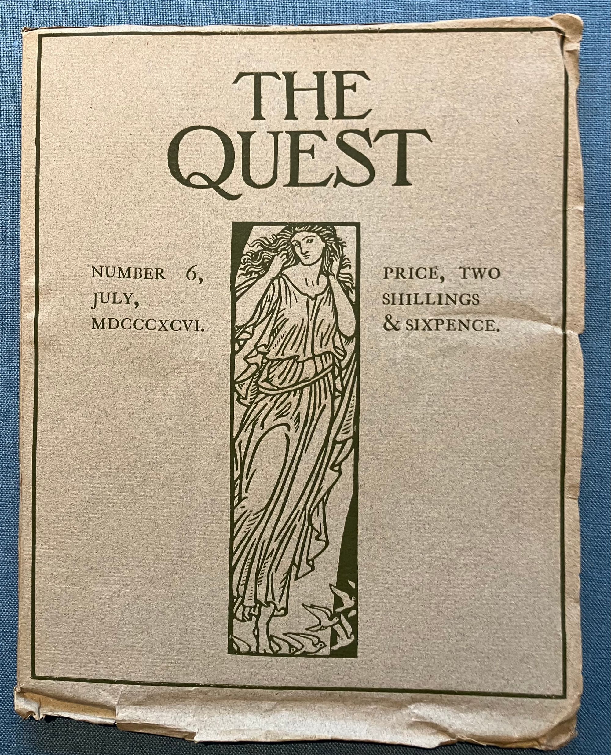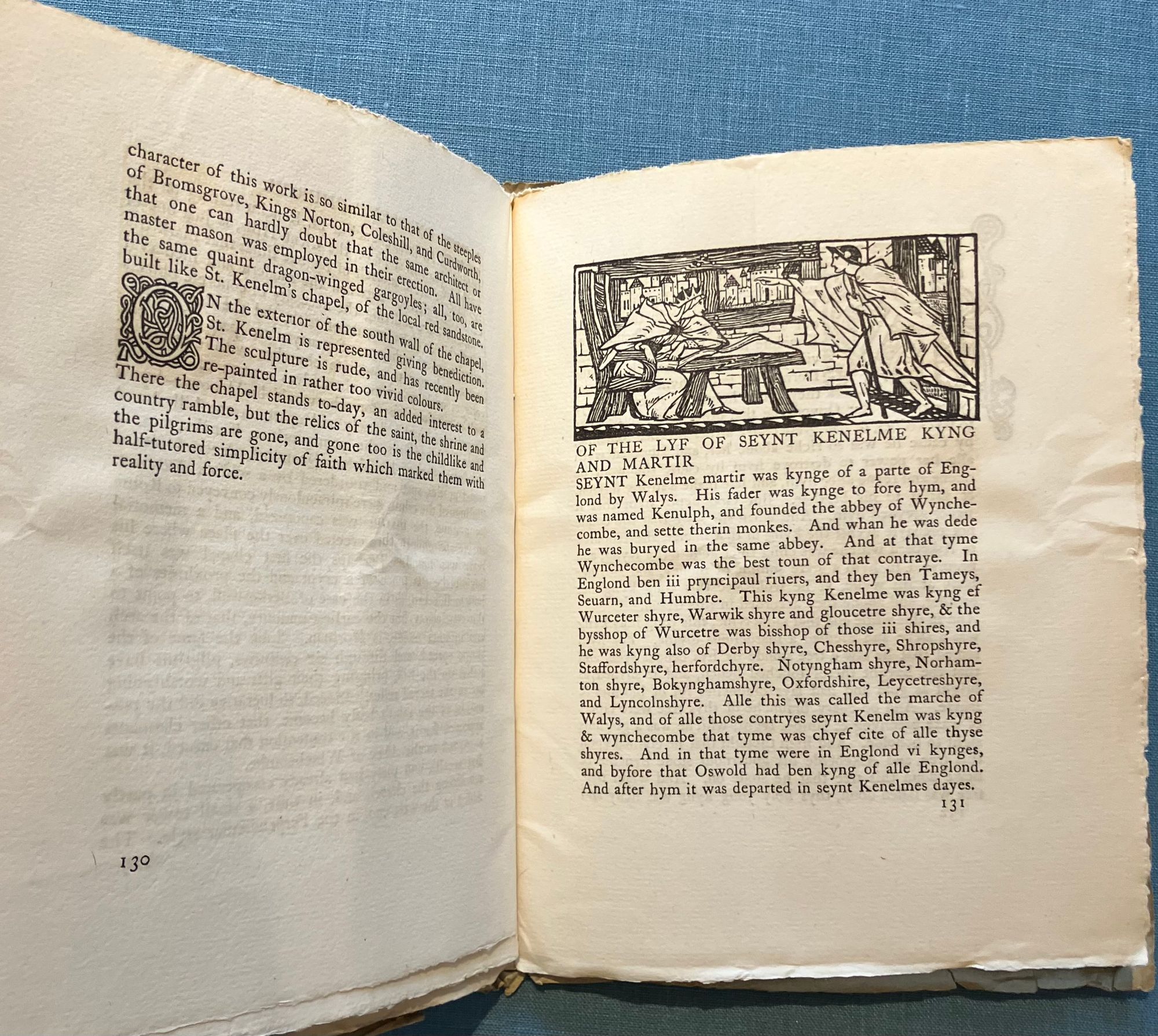 Soft cover periodical, single issue, in green-grey printed paper wraps, quarto, (7-1/2 x 9-1/2 inches), the cover with engraved decoration to front printed in black. Contains 10 full page black and white illustrations by various artists of the Guild, including Edmund Hort New, Sydney Meteyard, C. M. Gere, Inglis Sheldon Williams, E.H. New, G.T. Tarling and E. G. Treglown, each preceded by a title sheet. Also, three partial page illustrations, two borders, 1 footer and 18 decorative initial caps. An index of the three issues comprising Vol. 2 appears as well. (Numbering is continuous from prior issue.) Thus: [2], [blank], [2], [blank], 95-144pp., [1], [blank], [1], [blank], [1], [blank], [5pp., vol. index and ads].**CONDITION: Very Good. Sound and clean, although with moderate folding which affects the margin of each page. Edges of the yapp-edged wraps have a few some minor (1/4 or less) tears and rumple, as seen. Very light browning at the spine. **Contents: British architect, preservationist, art historian and friend of William Morris, William Lethaby (1857-1931) provides an article entitled "Art, the Crafts, and the Function of Guilds." The onetime Surveyor for Westminster Abbey, Lethaby was responsible for the cleaning and preservation of the fabric of the building in the from 1906- 1928. Additionally, he was principal of London's Central School of Arts and Crafts, Professor of Design at the Royal College of Art and on the Committee for the Preservation of Ancient Buildings. Between 1894 and 1900 he had two building projects in Birmingham, which no doubt brought him into contact with the the work of the Guild. As an early friend of William Morris, he was also involved in the very early meetings of the Kelmscott Press, and later, as a defender of Morris's aims in the period after World War One when his work went somewhat out of favor. ( L. Parry, p. 21; Peterson, History, p. 290)** A portion of Robert Browning's 1852 narrative poem "Childe Roland to the Dark Tower Came" is illustrated here by the English-born artist Inglis Sheldon Williams (1870-1940). The poem has been described as having moody, quest-like theme. Williams emigrated to Saskatchewan, Canada for a time, returning to London to study at the Slade School of Art, later traveling extensively and becoming an official war artist for the Canadians during the First World War. (Nat. Portrait Gallery) **A selection from William Caxton's "The Golden Legend," the Story of Seynt Kenelme, also appears in this issue. The text is presumably taken from William Morris and F.S. Ellis's three-volume Kelmscott edition of 1892, and there is certainly some fun to be had comparing the two sets of texts and noting the minor similarities and differences. However, the significant differences are found in the new illustrations and overall page design provided by the BGH artists, consisting of Meteyard's headpiece, the fancy initial capitals by H.A. Payne, as well as Tarling and Tregown's new full page illustrations of this story of the martyrdom of the ninth century King Kenelme, who was murdered by his sister Quyndrede and her lover Askeberd in an attempt to usurp power in the Welch Marches. Picturesque details of the tale provide ample fodder for the detail of these new drawings. (William Caxton, responsible for the printing of England's earliest books, had famously translated this book of saint's histories known as "The Golden Legend" from the original Latin version compiled by the medieval Bishop of Genoa, Jacobus de Voragine, published by Caxton in 1483.) Following this section are more items relating to the Kenelme story, including W.H. Bidlake's "A Note on Clent Church," and C.M. Gere's illustration of the same. [It is interesting to note that some of the art here was used in later editions of the "Golden Legend," cf. C.M. Gere's illustration in G.V. O'Neill's "The Golden Legend, Lives of the Saints" ( Cambridge, University Press, 1914.)] REFS: DNB, Linda Parry, edit. "William Morris," (New York," Harry N. Abrams, Inc., 1996). pp. 21, 35, 79 etc. W. S. Peterson, Bibliography, A7, pp.19-24. Peterson, History, pp. 290-293. [Please see related Quest issue 5, our no. 9419. The two issues are also available as a set, details upon request--it was thought best to list separately in order to provide differentiated detail.] Scarce.