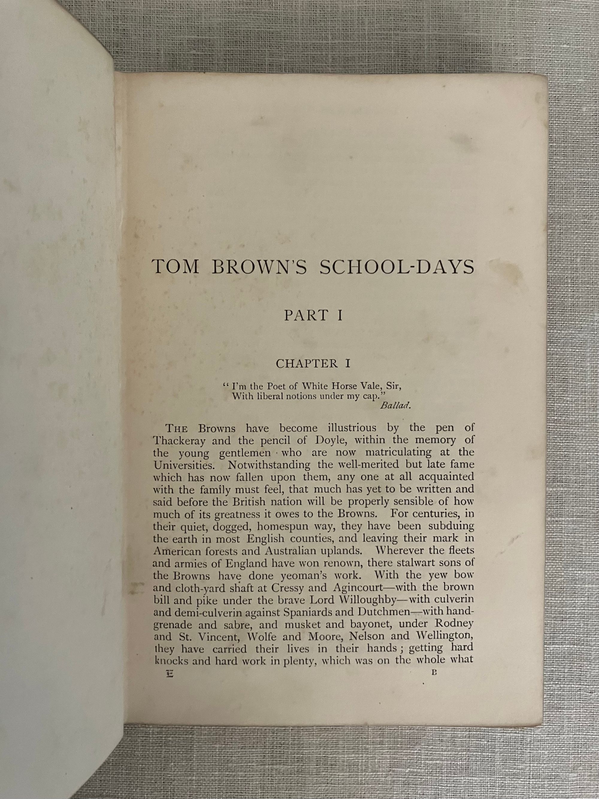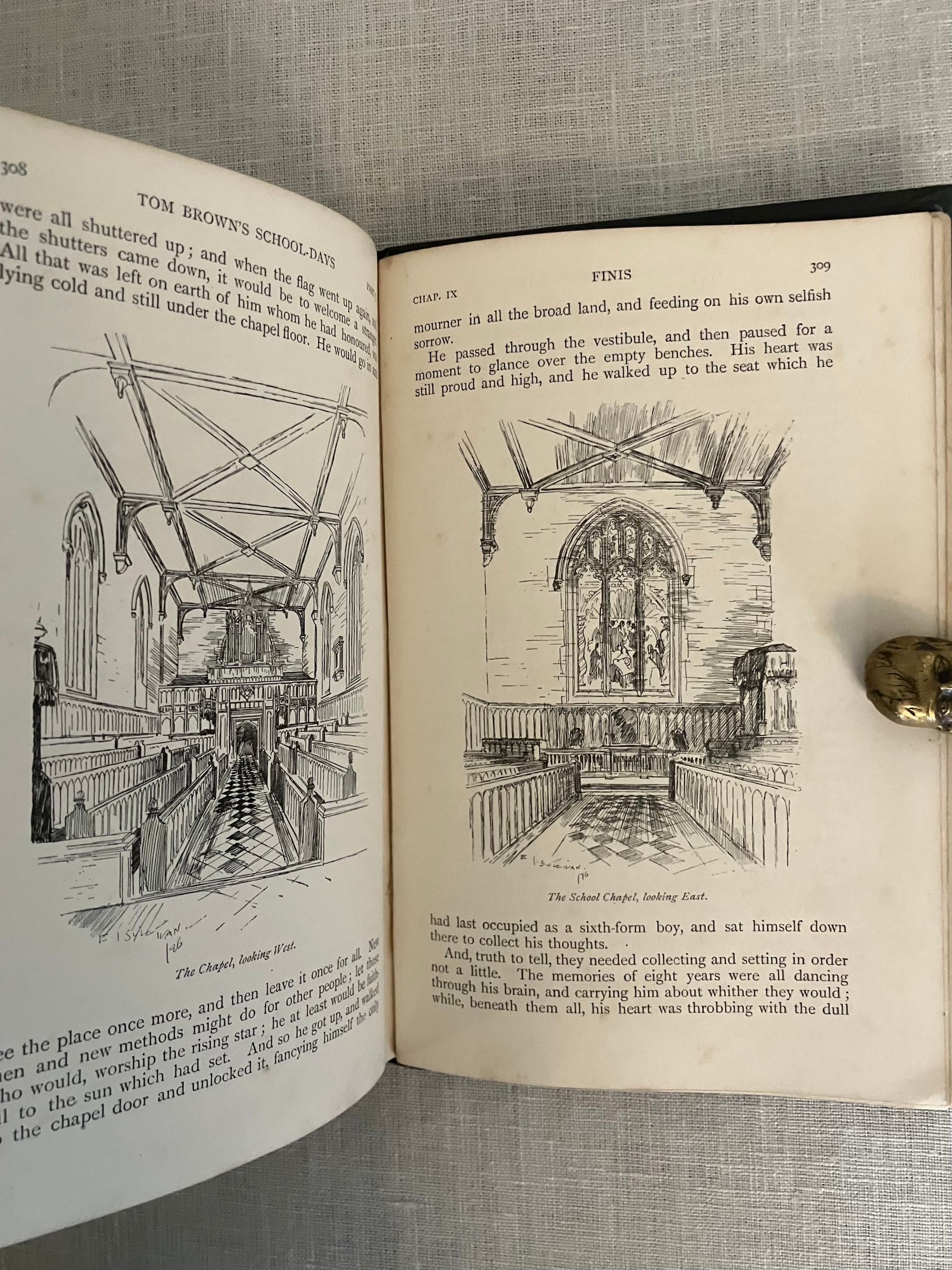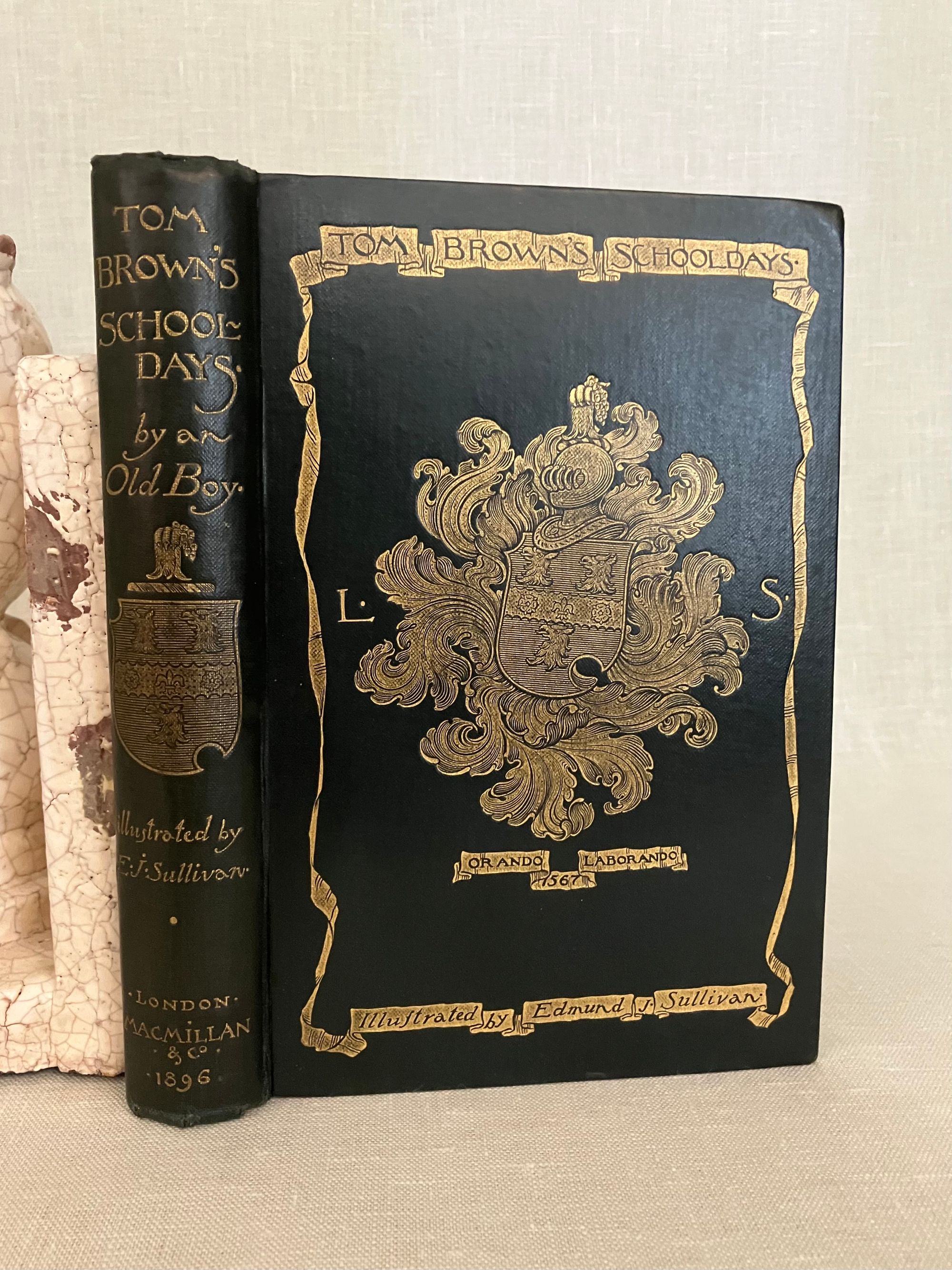 Hard cover, demy 8vo in dark green cloth, with pictorial cover design featuring hand lettered title amid scrolled ribbon, surrounding an English public school escutcheon by the English artist Edmund J. Sullivan blocked in gold to the front board and similar to spine. All edges gilt, glazed green end papers, In two Parts, numbered continuously, xxiii, 312pp. Printed by Richard Clay and Sons, Ltd., London and Bungay. With preface to the 1858 edition. Illustrated tissue-guarded frontispiece by the English Artist Edmund J. Sullivan (1869-1933), plus additional 50 illustrations Part One, and another 27 in Part Two. **CONDITION: Very Good. One bumped corner, and small gouge at rear board, as seen. Front hinge partly split. Gilt lightly rubbed to front board, and remaining quite bright on the text block edges. Some soiling seen to first page and light foxing ocassionally throughout. Now in mylar. **This semi-autobiographical novel was based on the Author's days at the British public school of Rugby, and is notable for his criticism of the prevailing culture of bullying of the younger and weaker boys. Author Thomas Hughes, QC, lawyer and later judge (1822-1896) was also a social reformer interested trades unionism and cooperatives, founding, in later life, a Christian socialist utopian community at Rugby, Tennessee for the aid of the English nobilities' second sons. This book represents some early work of the British graphic Artist Edmund (E.J.) Sullivan (1869-1933). He would go on to illustrate numerous London magazines and books. His style has been compared to Beardsley, and his work did appear in the latter's "Yellow Book" series. Numerous editions of this work were published, with Macmillan publishing six alone between 1857 and 1858. This is in a scarce Cranford-style illustrated gilft binding. Watson 933.