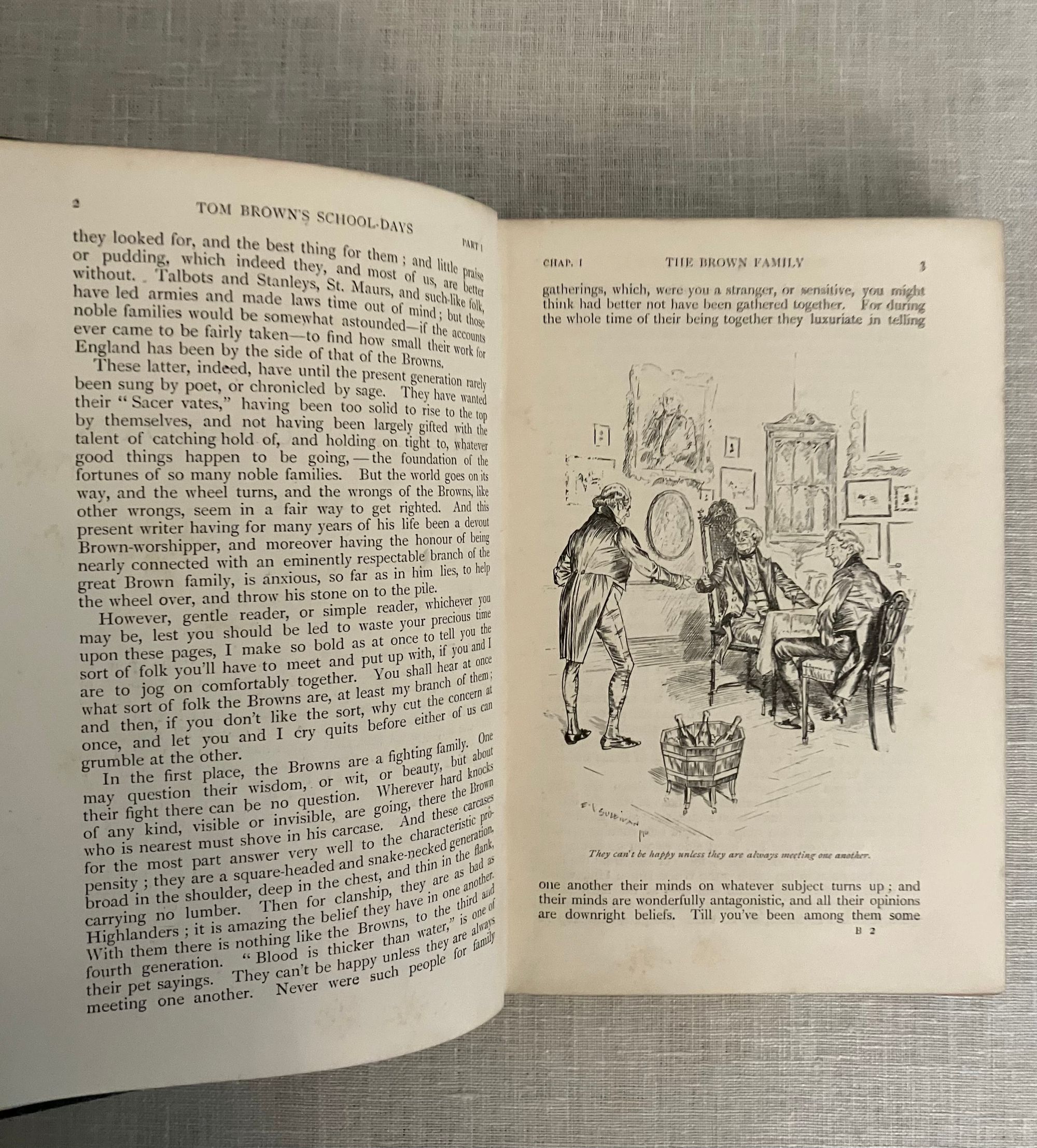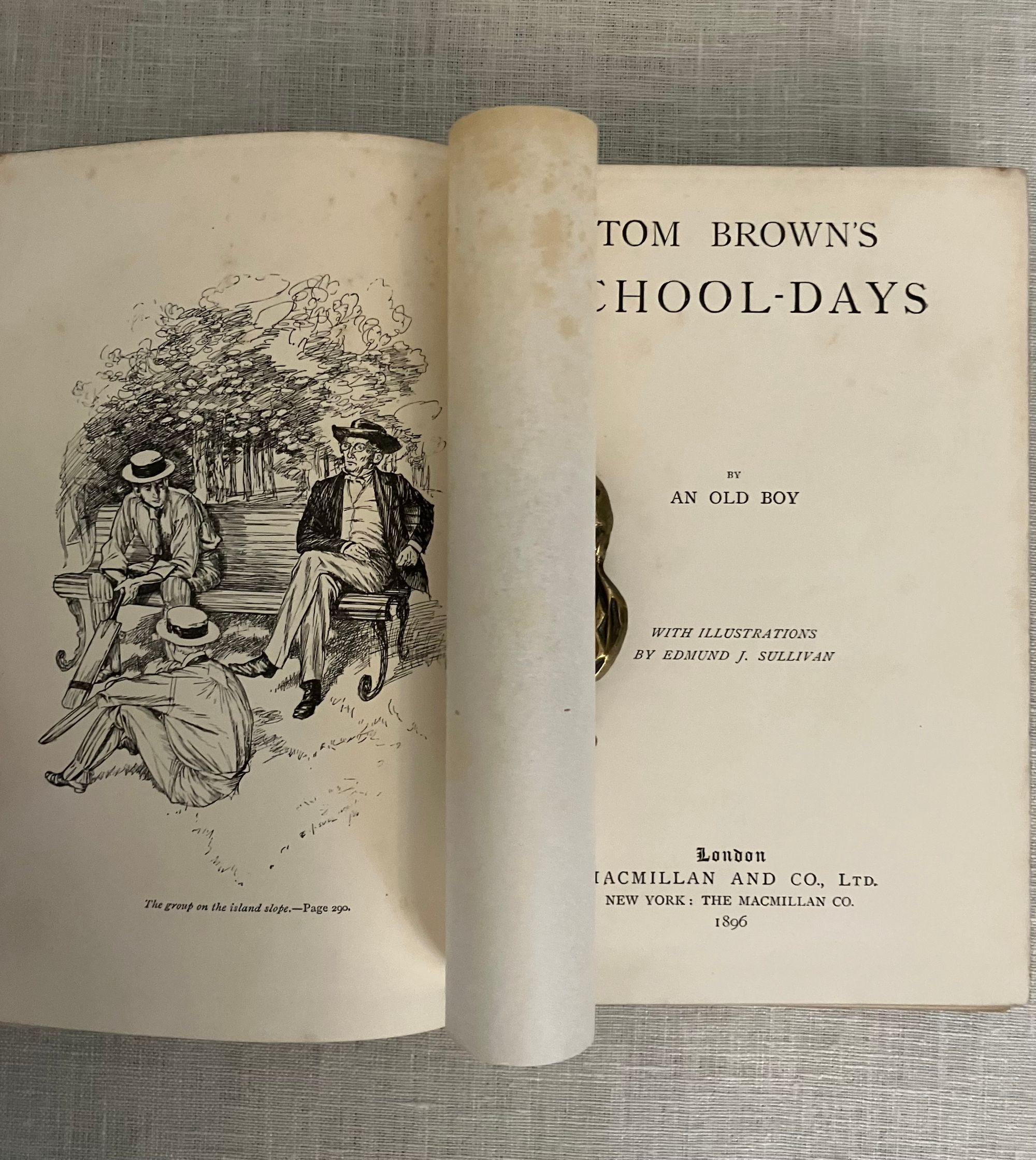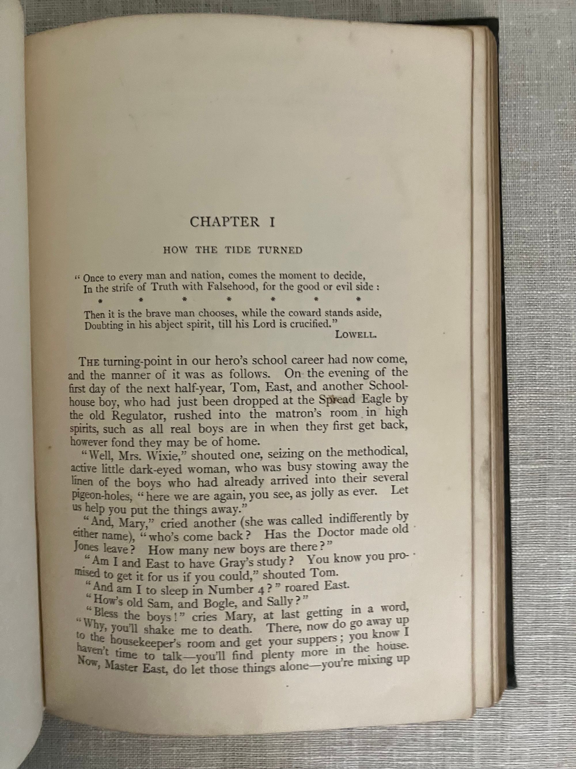 Hard cover, demy 8vo in dark green cloth, with pictorial cover design featuring hand lettered title amid scrolled ribbon, surrounding an English public school escutcheon by the English artist Edmund J. Sullivan blocked in gold to the front board and similar to spine. All edges gilt, glazed green end papers, In two Parts, numbered continuously, xxiii, 312pp. Printed by Richard Clay and Sons, Ltd., London and Bungay. With preface to the 1858 edition. Illustrated tissue-guarded frontispiece by the English Artist Edmund J. Sullivan (1869-1933), plus additional 50 illustrations Part One, and another 27 in Part Two. **CONDITION: Very Good. One bumped corner, and small gouge at rear board, as seen. Front hinge partly split. Gilt lightly rubbed to front board, and remaining quite bright on the text block edges. Some soiling seen to first page and light foxing ocassionally throughout. Now in mylar. **This semi-autobiographical novel was based on the Author's days at the British public school of Rugby, and is notable for his criticism of the prevailing culture of bullying of the younger and weaker boys. Author Thomas Hughes, QC, lawyer and later judge (1822-1896) was also a social reformer interested trades unionism and cooperatives, founding, in later life, a Christian socialist utopian community at Rugby, Tennessee for the aid of the English nobilities' second sons. This book represents some early work of the British graphic Artist Edmund (E.J.) Sullivan (1869-1933). He would go on to illustrate numerous London magazines and books. His style has been compared to Beardsley, and his work did appear in the latter's "Yellow Book" series. Numerous editions of this work were published, with Macmillan publishing six alone between 1857 and 1858. This is in a scarce Cranford-style illustrated gilft binding. Watson 933.