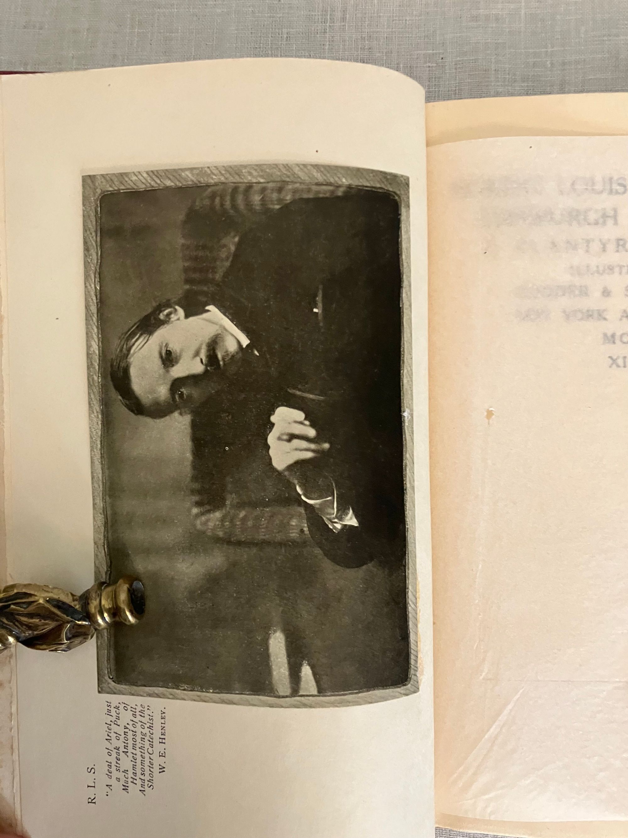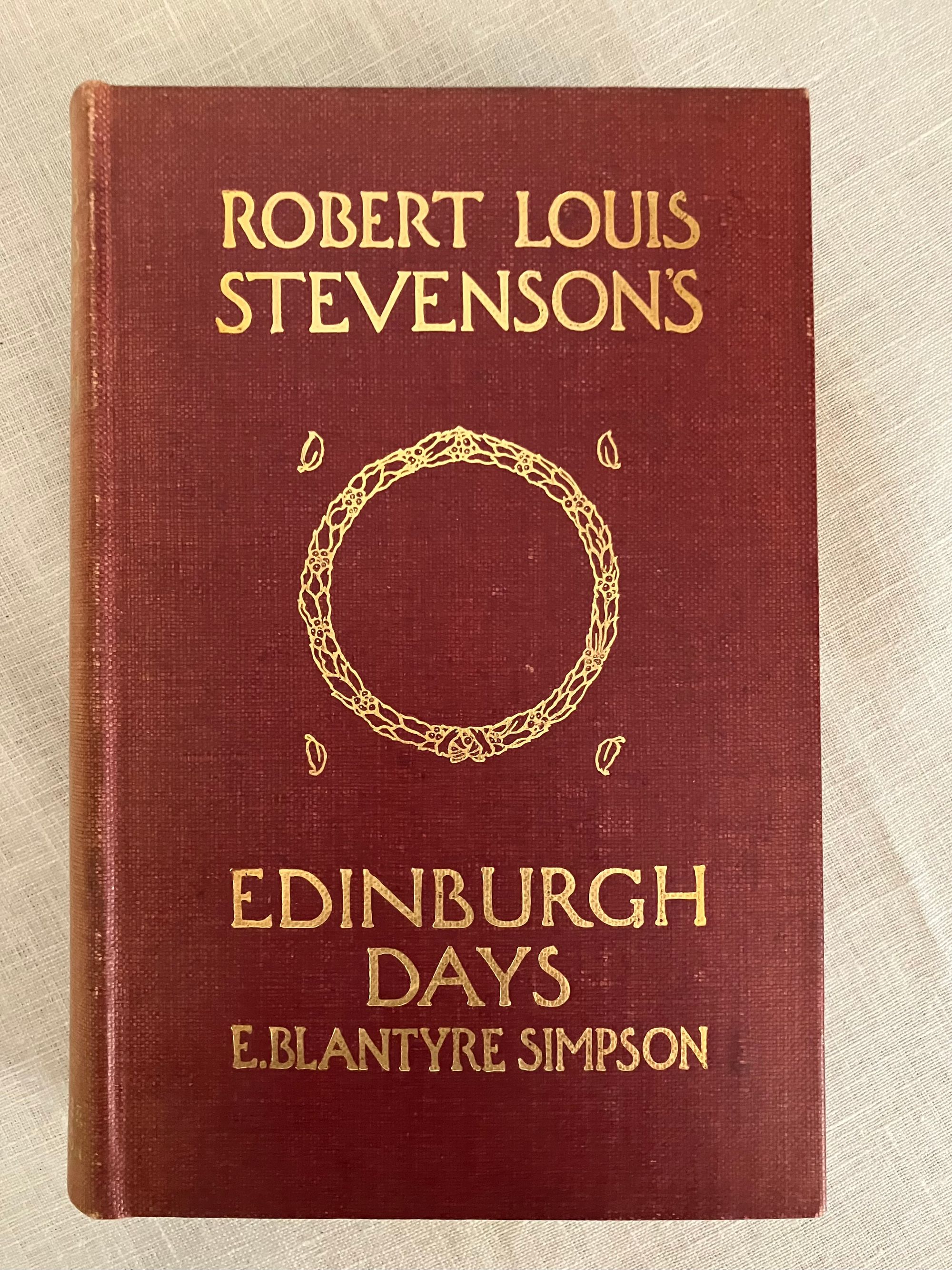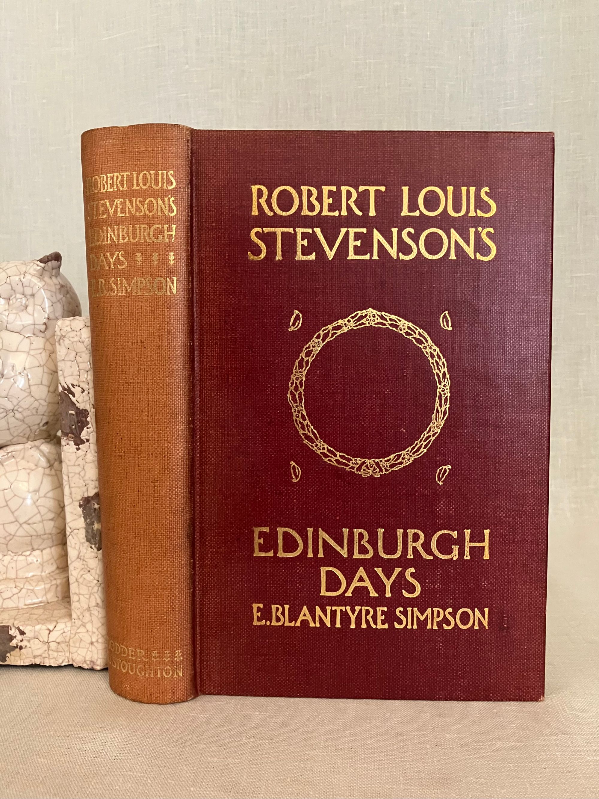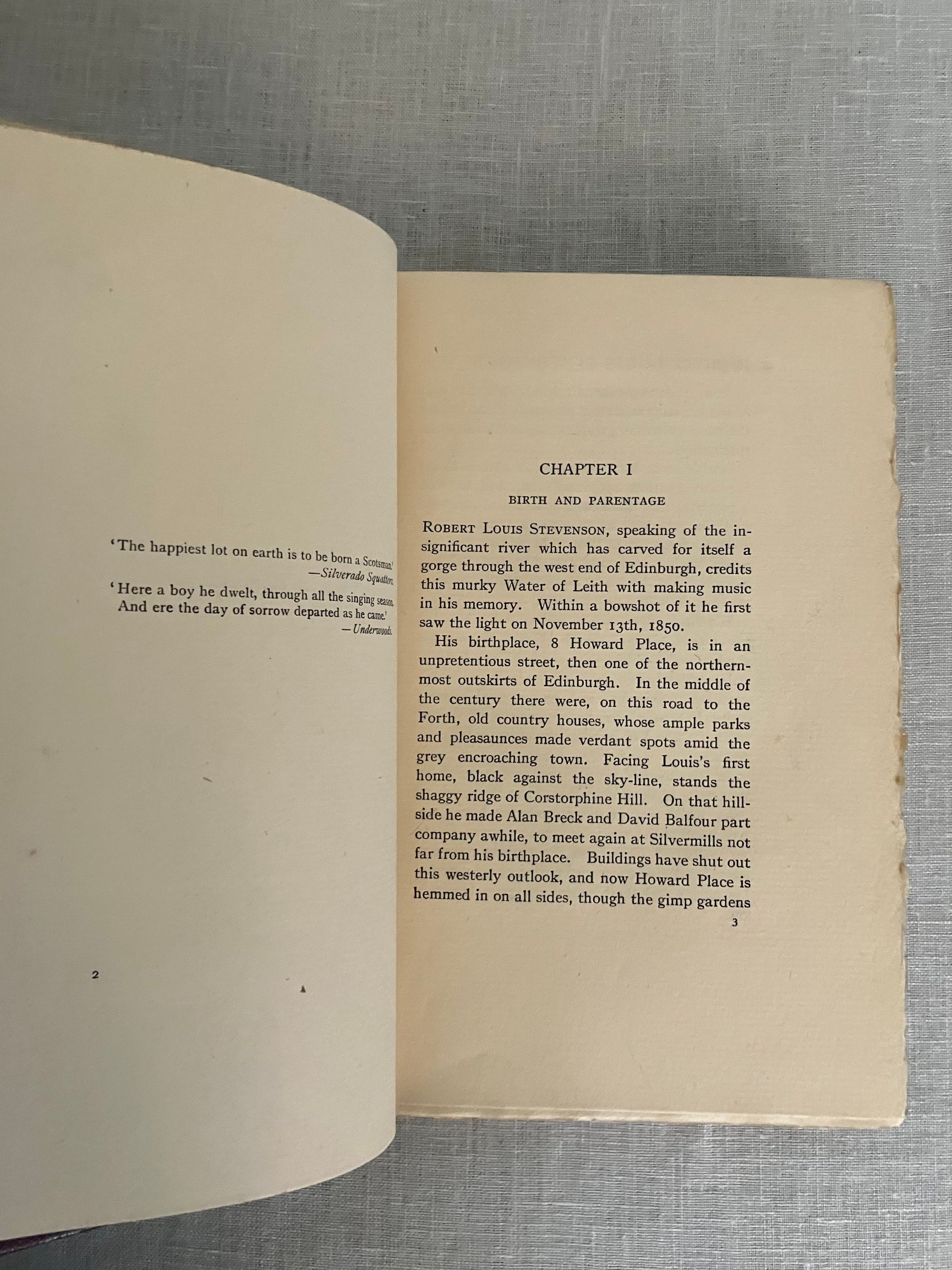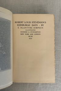 Reprint, Third Edition. Hard cover, 8vo, in red buckram with titles blocked in gold to front board and spine, tipped in Author photo to frontis. Tissue-guarded black and white gravures of scene's around Colinton and Edinburgh where the fabled author of works such as " Kidnapped" and " The Strange Case of Dr. Jekyll and Mr. Hyde," was raised. CONDITION: Very Good. Lightly cocked. Boards clean with very minor wear. Foxing to several pages of prelims, clean inside. Also lightly foxed at text block edges. Old inscription ffep. dated 1913. Mostle clean and lightly toned. Hinges in order. The Author of these reminiscences, Evelyn Blantyre Simpson, (1855-1920), was the sister of a friend of Stevenson's, Walter Simpson. Their father, Prof. James Young Simpson was a specialist in obstetric medicine at the Univ. of Edinburgh, pioneering the use of choloform during childbirth, among other achievements. Eve wrote a number of books of biography and of folklore in the lowlands, helping to support her eight brothers and sisters after the early death of their parents.
