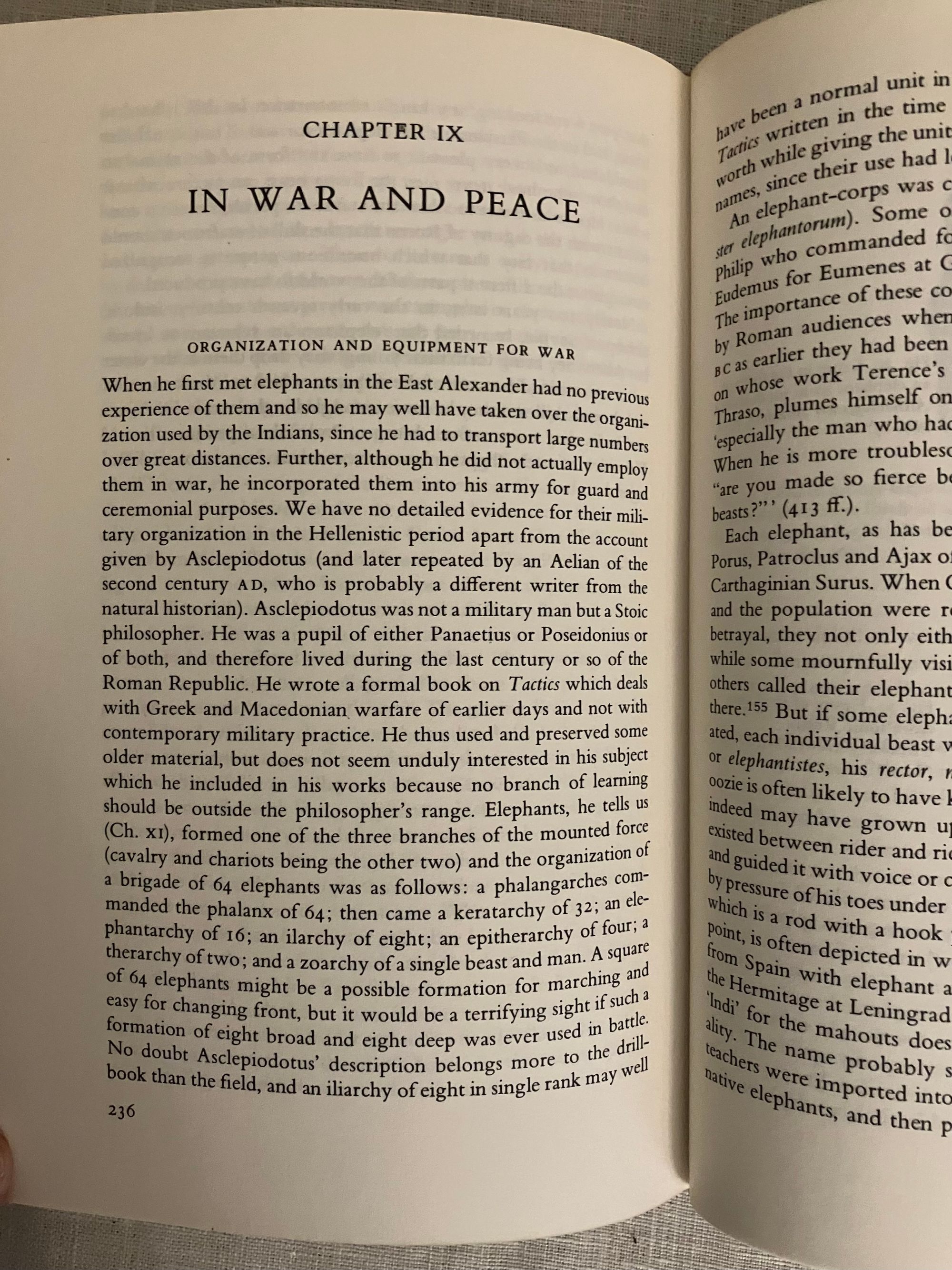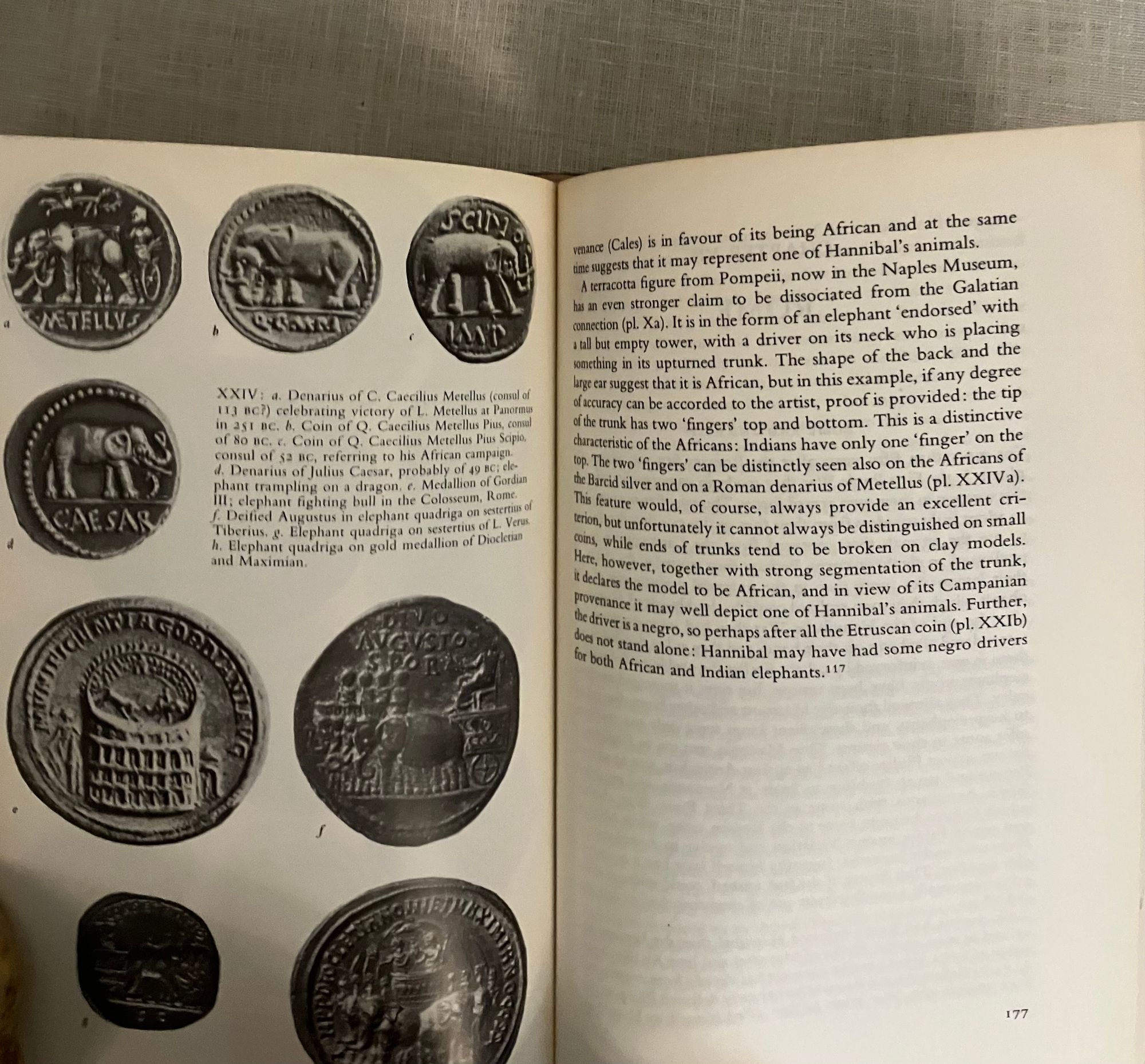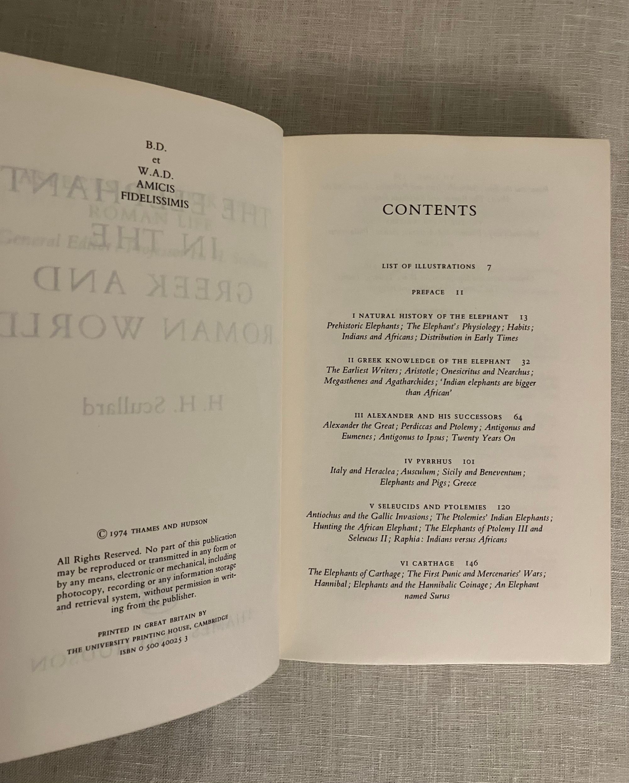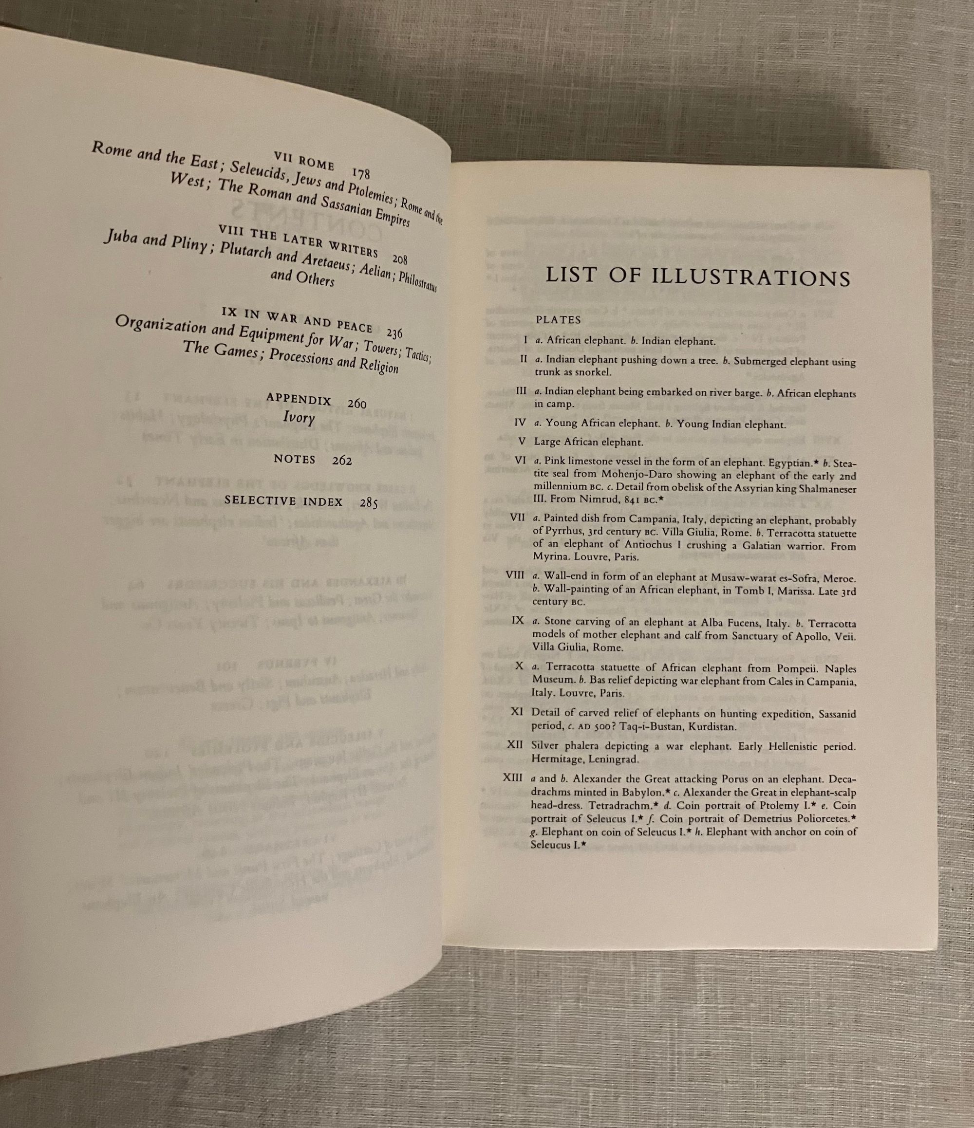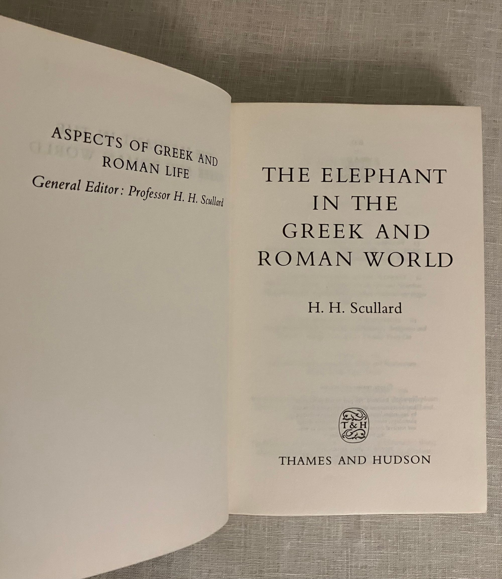 Hard cover, 8vo in tan cloth with vignette publisher's logo to front board, and titles to spine in gold. Lacking d/j. CONDITION: Very Good Plus, or better. Two minimally bumped corners, and minute spotting to text block edges. Otherwise very clean and sound. Ex-academic library markings to front endpapers. [10] 11-288pp., with index. **A study of both the zoological history and symbolism of the elephant, as depicted in art and classical texts found in the British Museum. Illustrated with many photographic reproductions, engravings, and line drawings of Indian and African elephants. Coins, carvings and inclusion as decorative elements upon pottery are all considered. From Alexander the Great to Zenos of Rhodes, and so much more. A worthy introduction to the broad study of classical history. British AUTHOR Prof. Howard Hayes Scullard (1903-1983) taught at New College Oxford and later King's College, London, and popularized classical studies through many works, including The "Oxford Classical Dictionary."