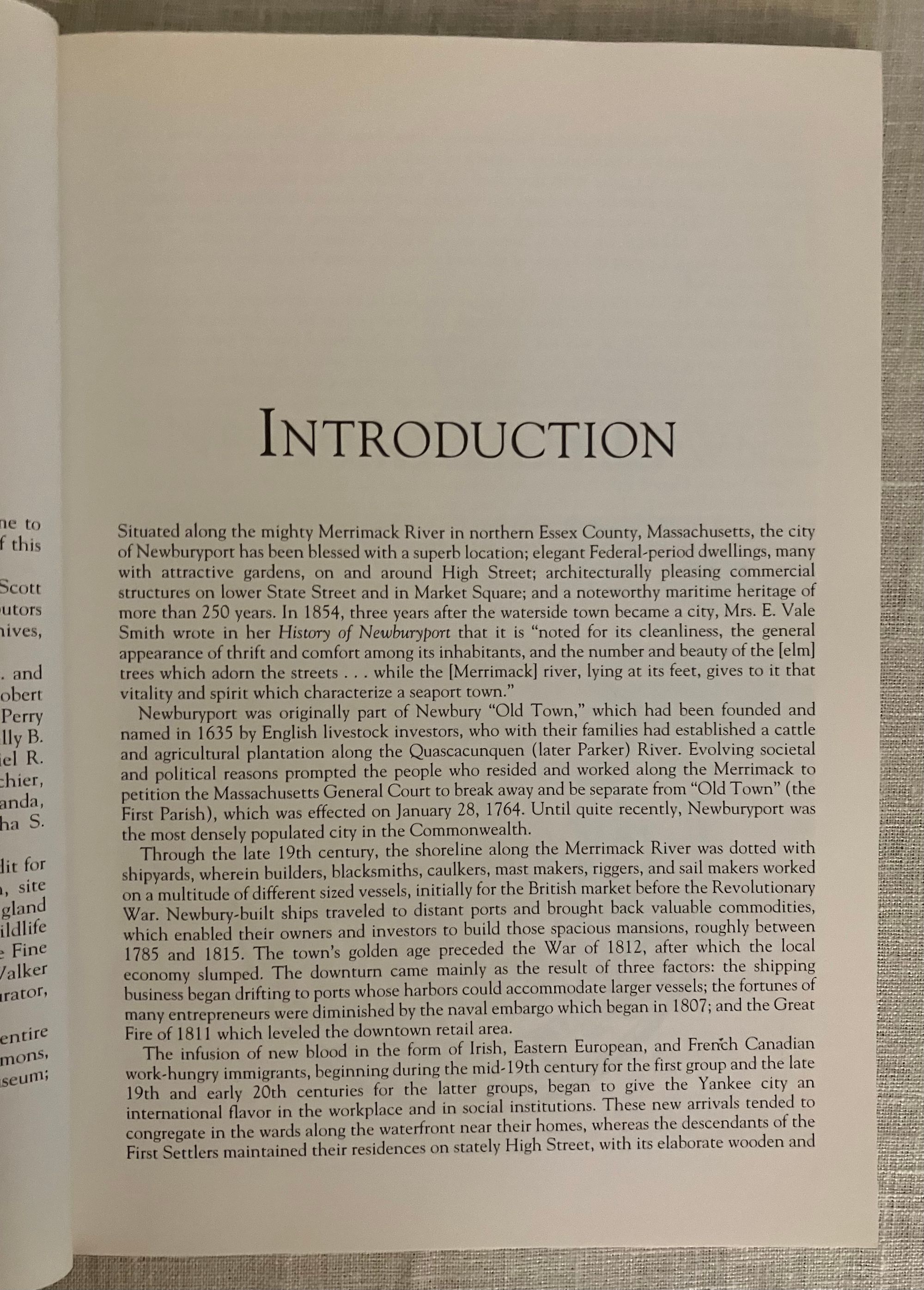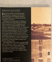 Soft cover, 8vo, with sepia photgraphed pictorial cover of Newburyport Harbor in the 19th century, 127 pp. Presumed first edition (awaiting LOC number). CONDITION: Fine. A local history paperback about Newburyport, Massachusetts: home of the American clipper ship, United States Coast Guard, and "an architectural gem of New England," as shown through numerous historical photographs and descriptions. Highlights include the Lord Timothy Dexter mansion, early images of Plum Island, rum factories supplied by West Indian sugar, shipyards, rail, trolley and clamming scenes along the Joppa waterside.