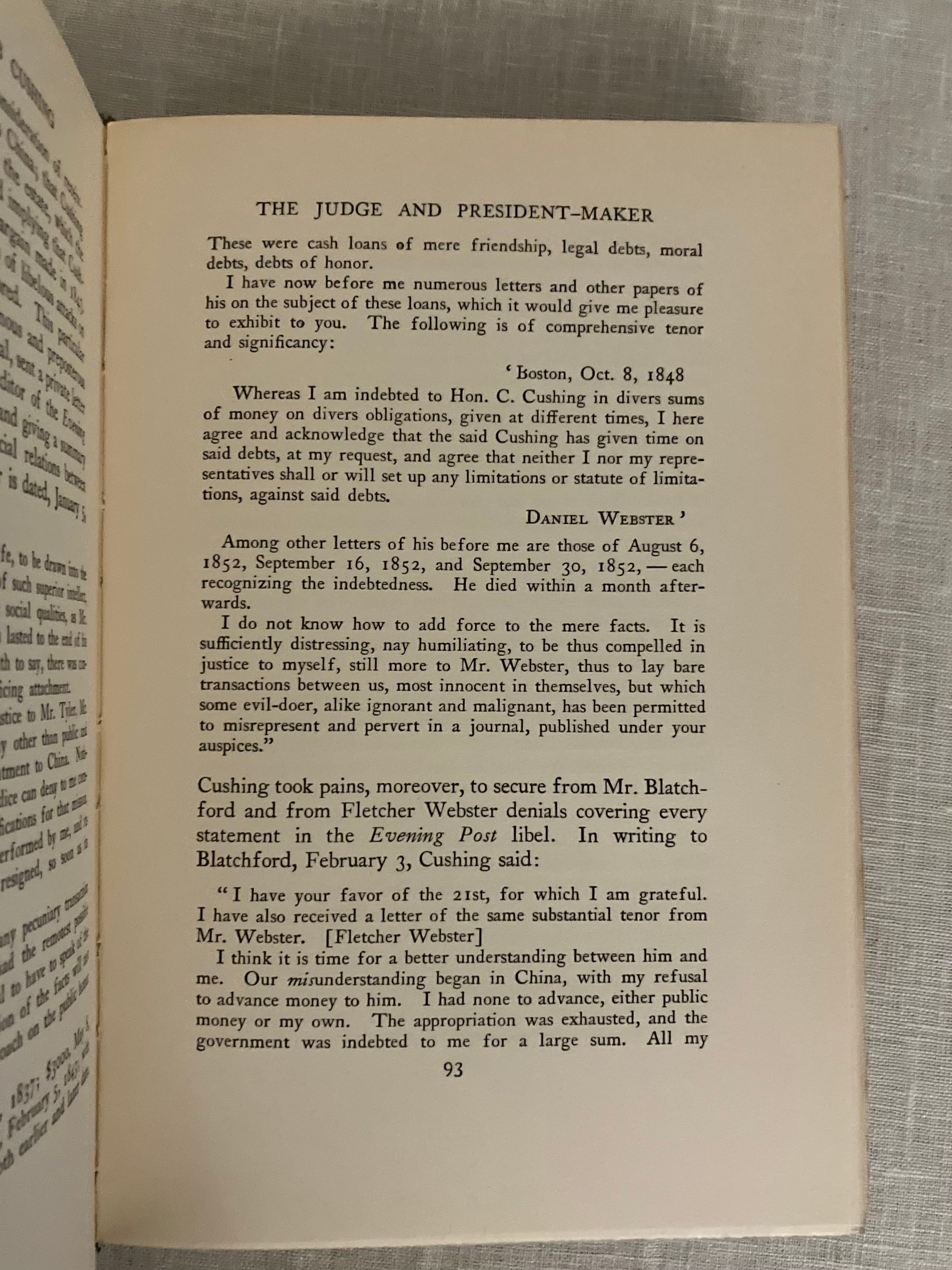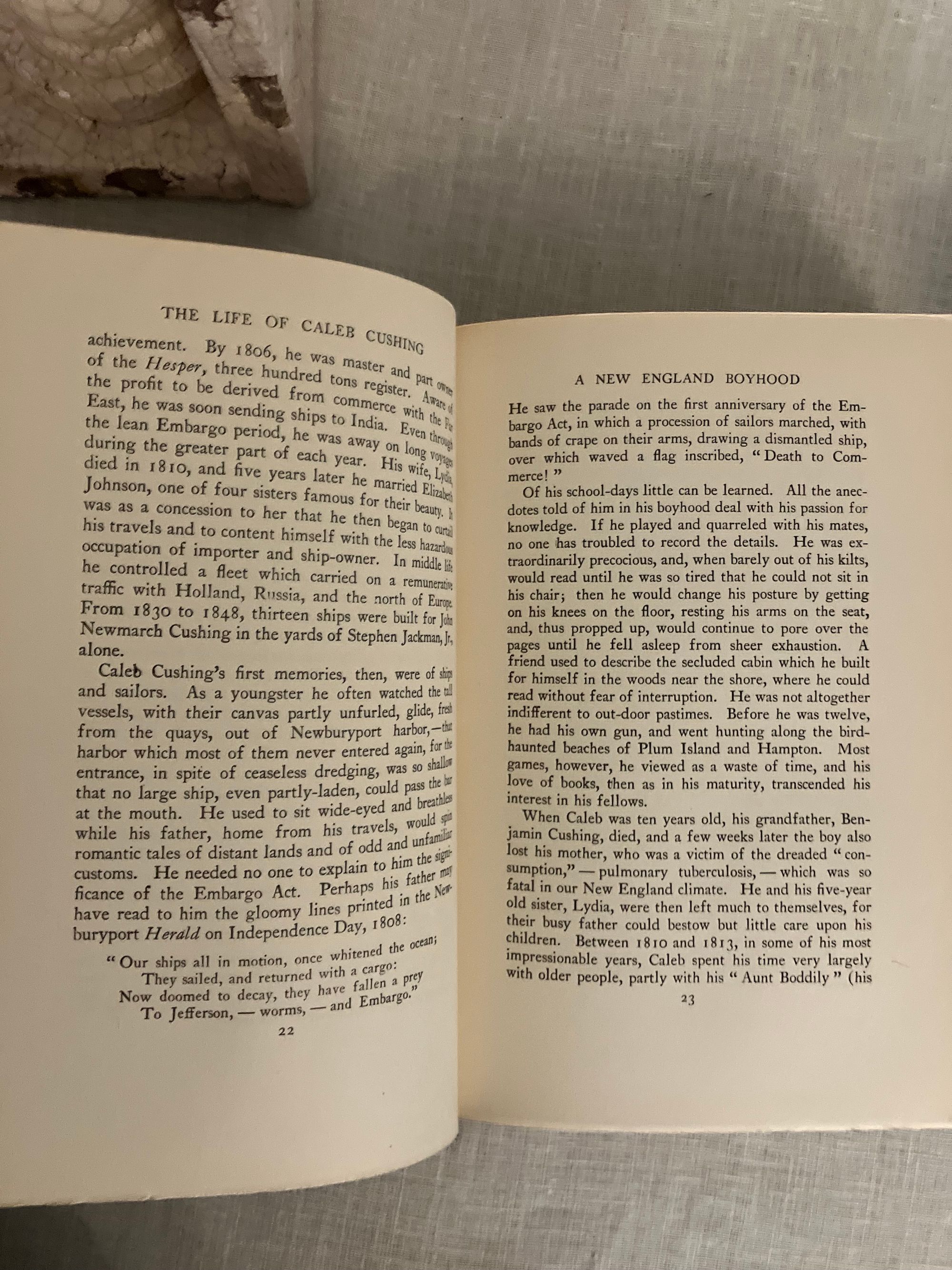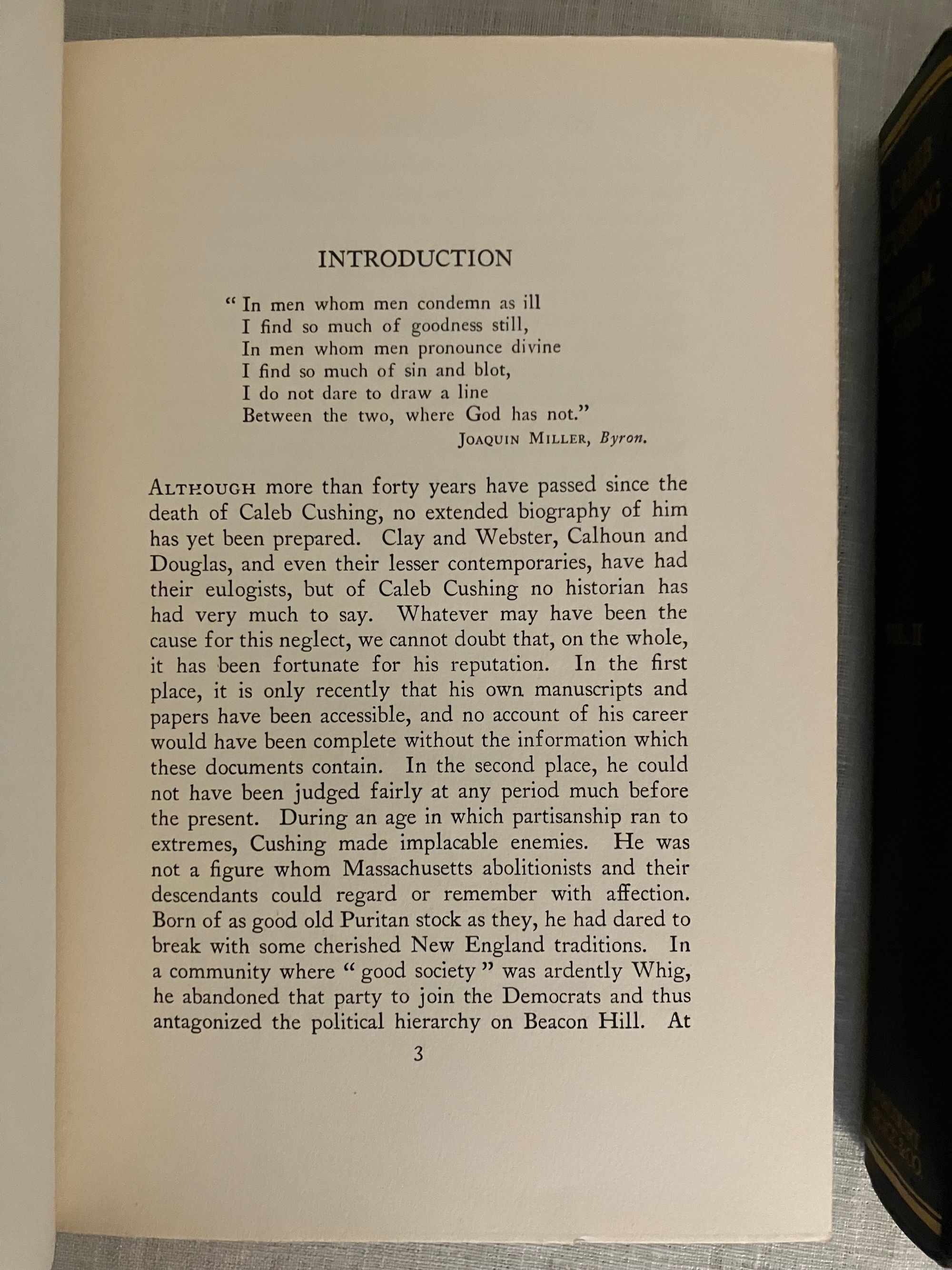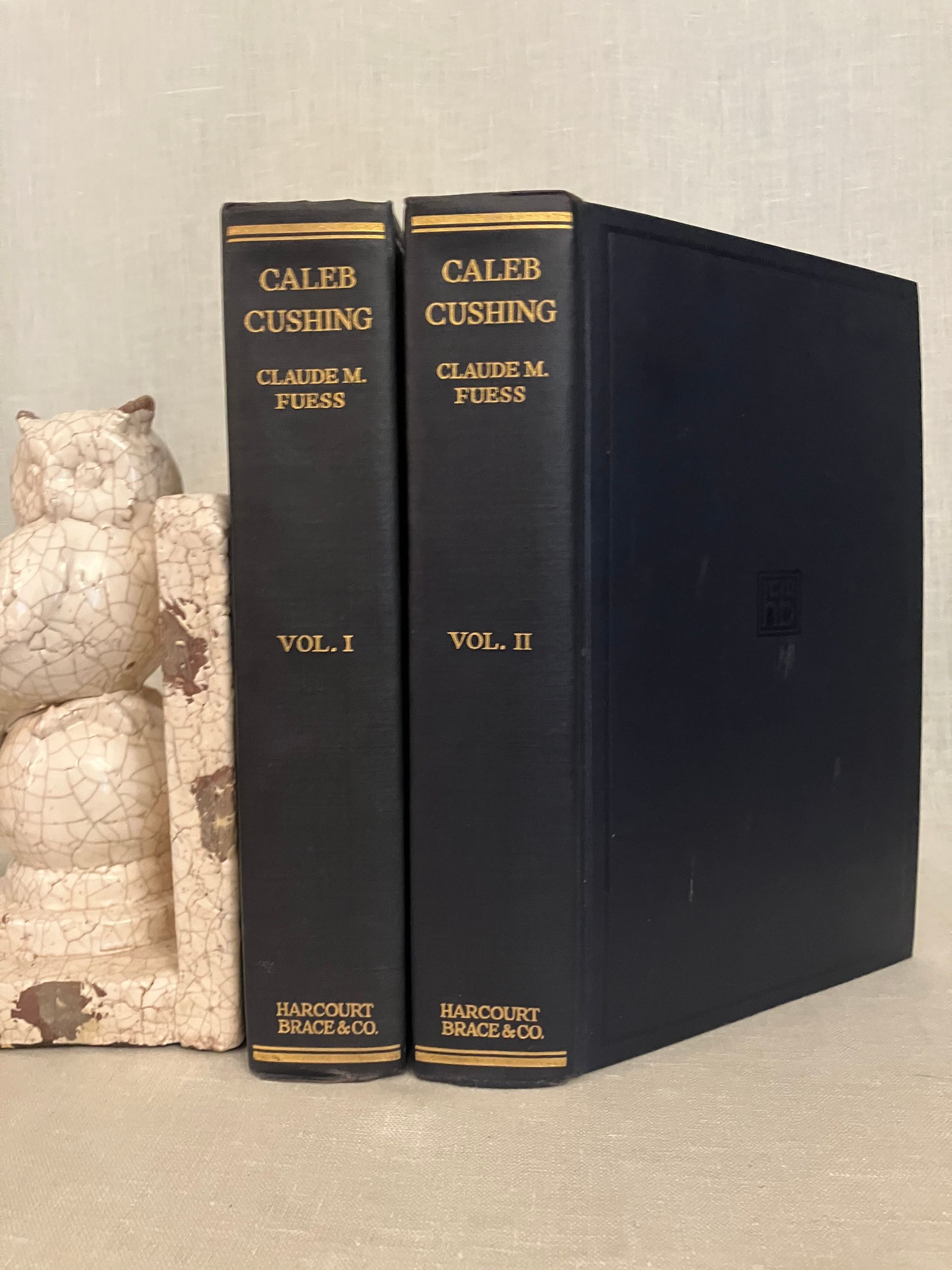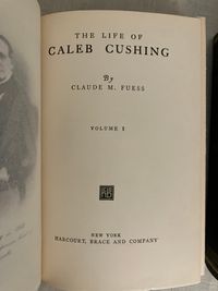 Hard cover, 8vo in publisher's blue cloth , stamped in blind with banding and publisher's logo to front boards, and blocked with titles in gold to the spines, tope edge gilt, 2 volume set, First Edition, xi, 454pp and vii, 442pp. includes index. CONDITION: Near Fine, clean, sound with a few light marks to covers. Largely unopened. One of Newburyport's most famous sons, the Harvard-educated lawyer, politician and diplomat Caleb Cushing (1800-1879) is best known for his appointment as the first as Envoy Extraordinary and Minister Plenipotentiary to China under President John Tyler, negotiating the first American trade treaty with the Celestial Kingdom during the clipper ship era in 1843. Again, in the Post Civil War era, he was appointed Envoy Extraordinary and Minister Plenipotentiary to Spain under President Ulysses S. Grant, where he managed a diplomatic crisis, the Virginius Affair, in which a group of American citizens had been caught in the cross-hairs of the warring Cubans and Spanish in the 1870's. Other diplomatic missions saw him conducting agreement for the building of the Panama Canal. His views as a "copperhead" Democrat (anti-war) made his controversial during the Civil War era, thwarting his appointment to the U.S. Supreme Court. Fuess's biography is based upon Cushing's hitherto unexamined papers and correspondence, which highlights the wide influence of this sometimes controversial, but nonetheless hugely significant, figure of nineteenth-century America.