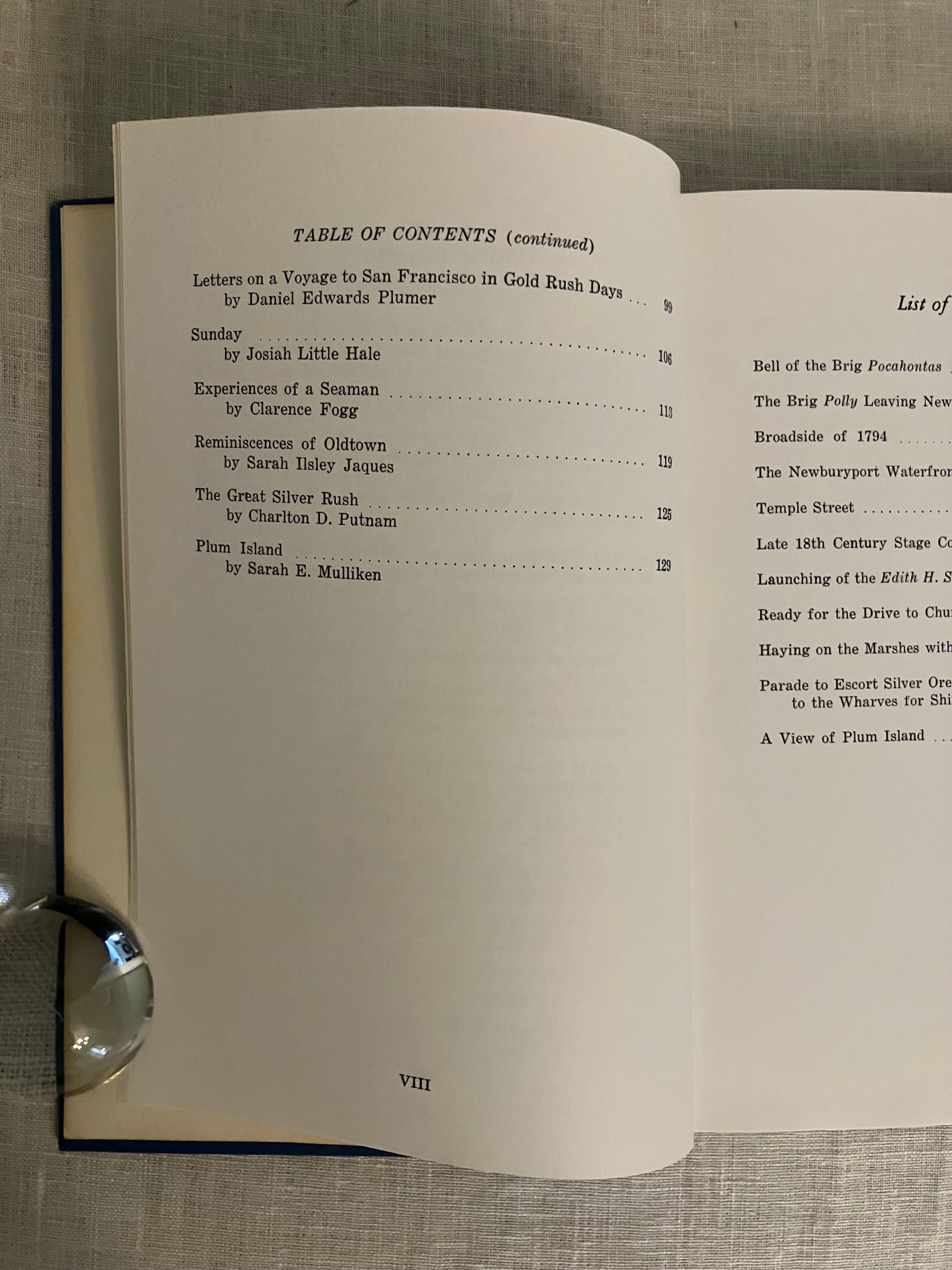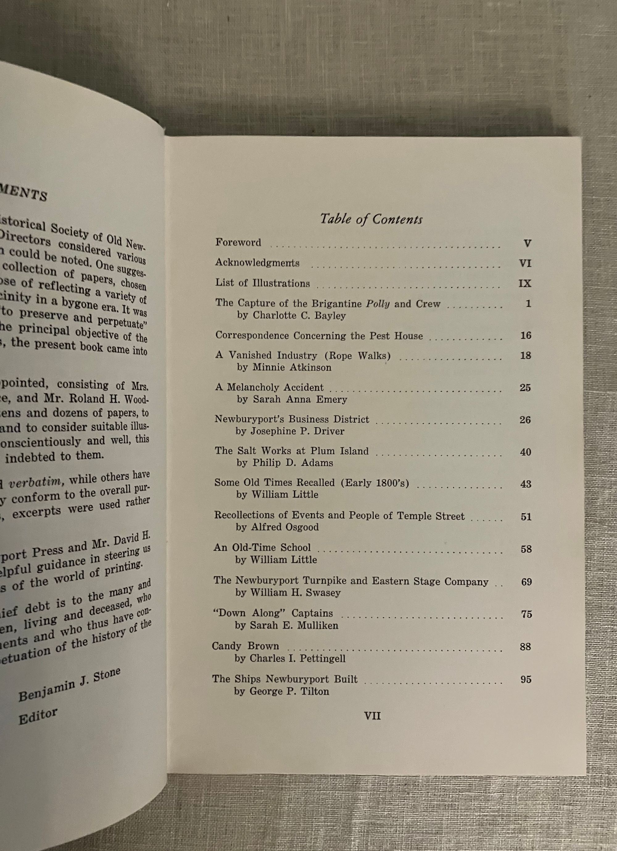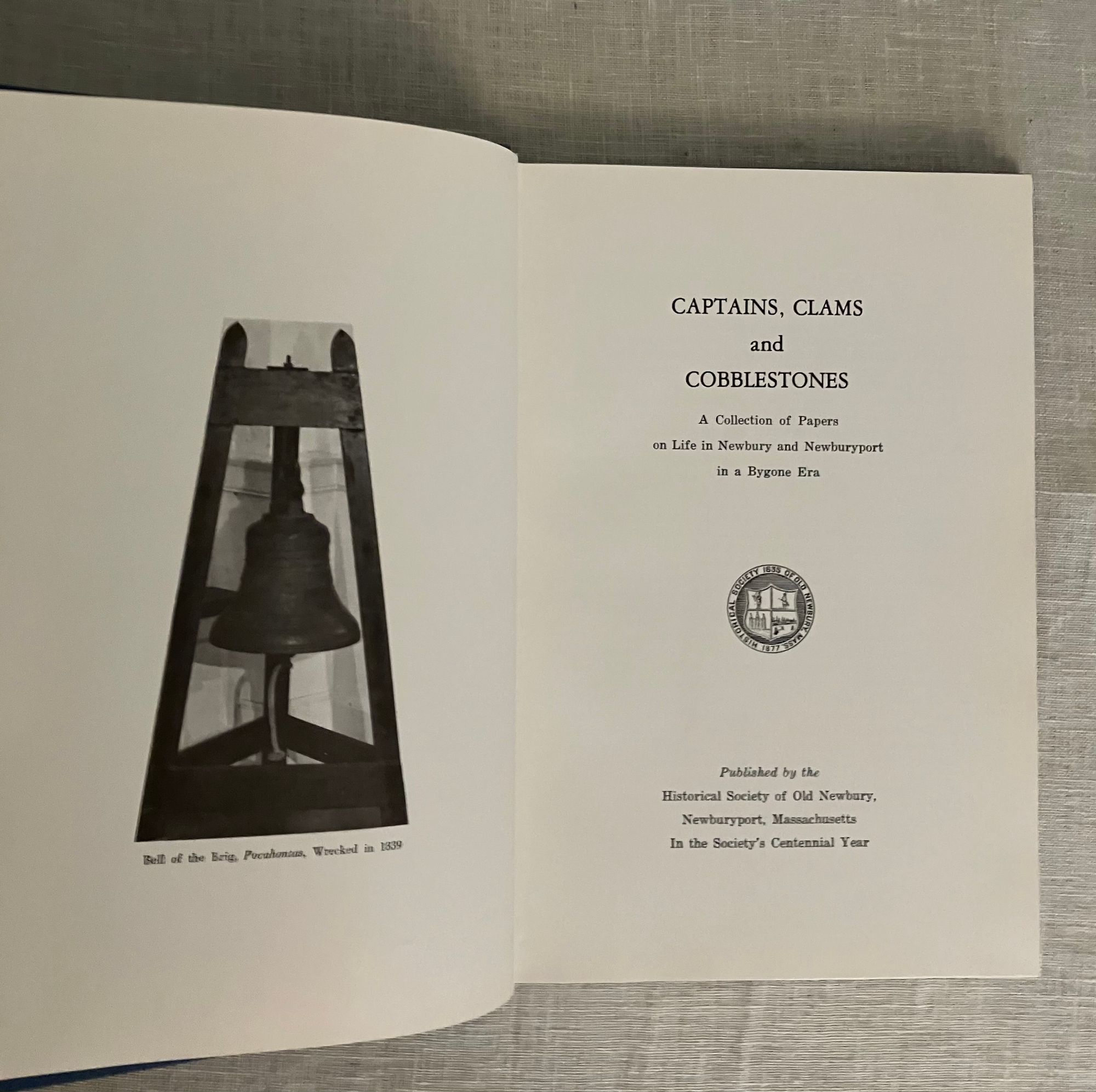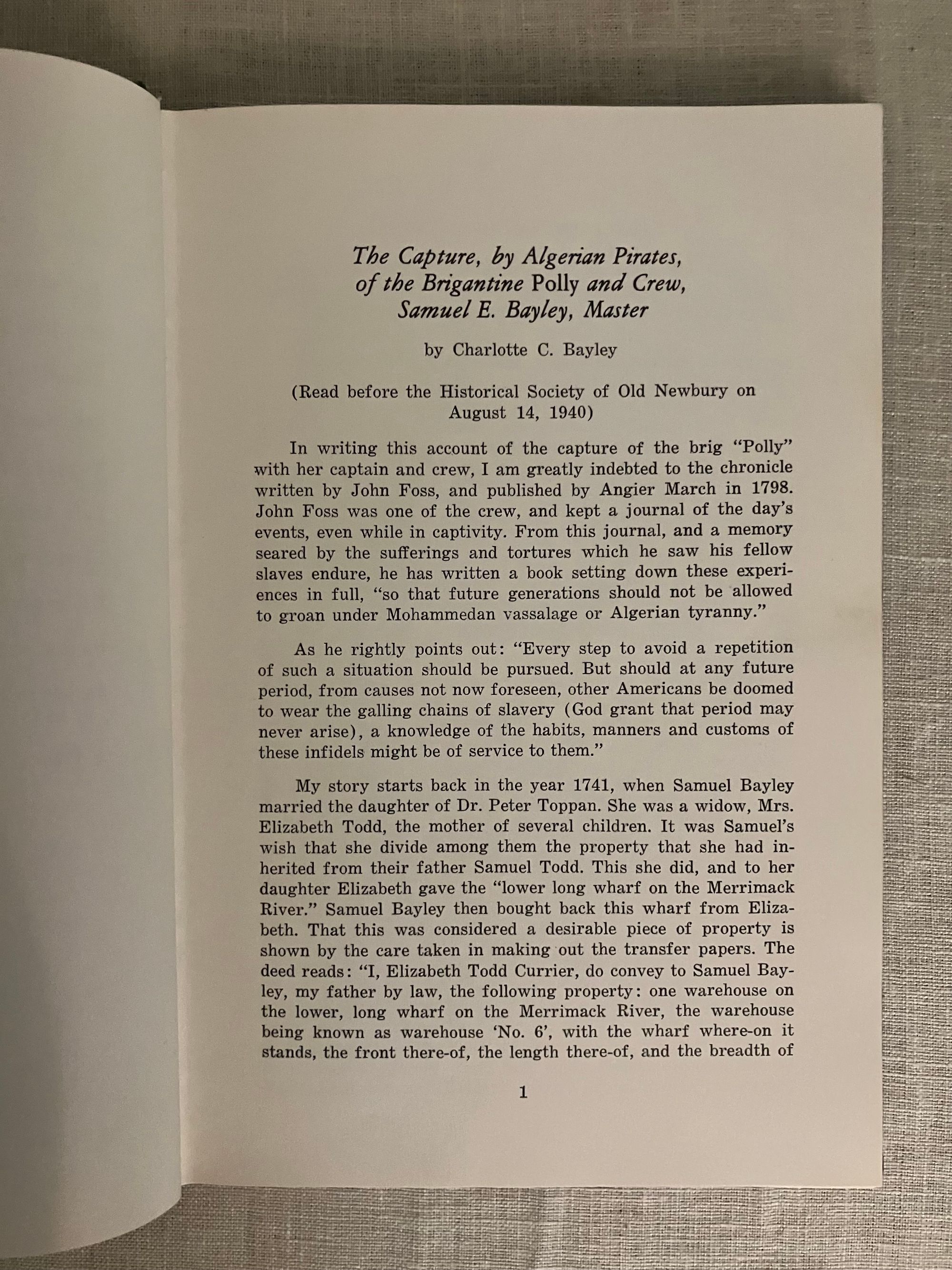 Hard cover, 8vo, in blue cloth, titles in silver, ix, 138 pp. CONDITION: Very Good Plus, light shelfwear and minor rubbing. Gift inscription to ffep in ballpoint by contributor Charlotte C. Bayley, author of the first paper: "The Capture of the Brigantine Polly and Crew." This anthology of nineteen historical papers delivered before the members of the Historical Society of Old Newbury was produced as a centennial tribute to its mission of preserving the local history of the early settlers of Newbury, and later Newburyport (incorporated seprately in 1851), Massachusetts through the records and other artifacts preserved, collected and studied by its membership. Fascinating accounts, such as in the Bayley article, detail how this maritime and ship-building center was once caught up in the currents of history and international diplomacy, with mariners preyed upon, imprisoned and ransomed by Algerian pirates off Cadiz in 1793. Other accounts detail the presence of a "Pest House" on Plum Island, used to quarantine shipboard illnesses brought back from foreign ports, such as smallpox or plague. The hero's parade for the commander of the French allies, the Marquis de Lafayette, is also discussed. A very readable, thought-provoking book of local history.