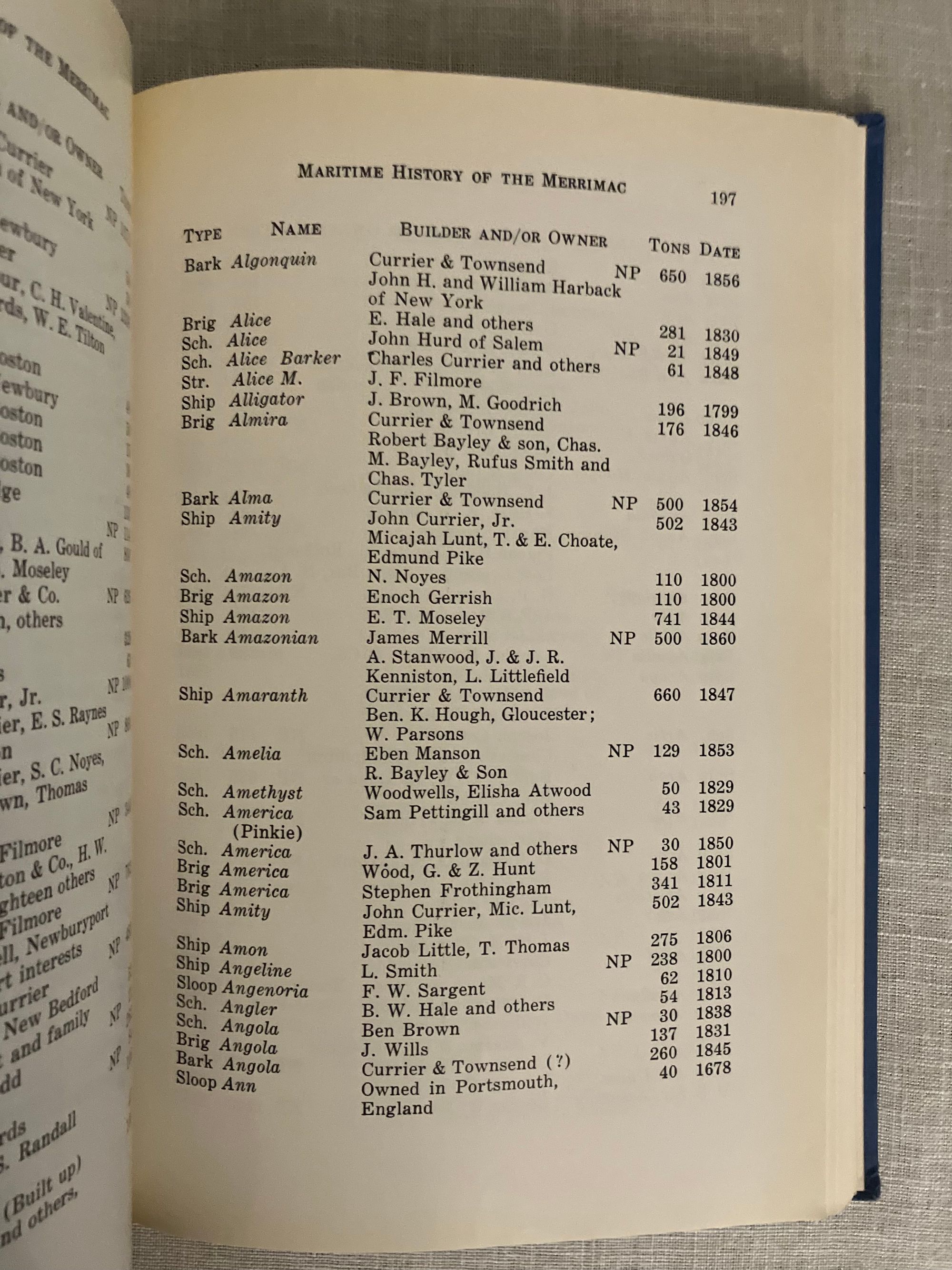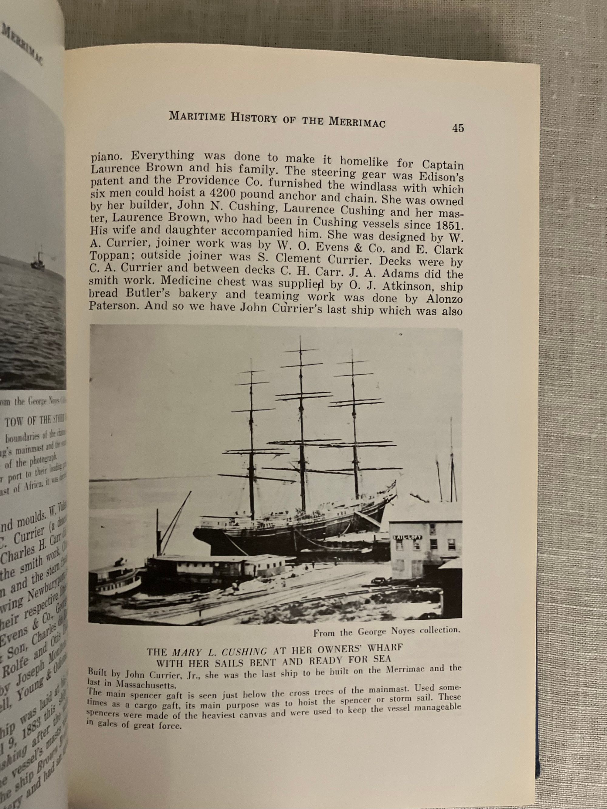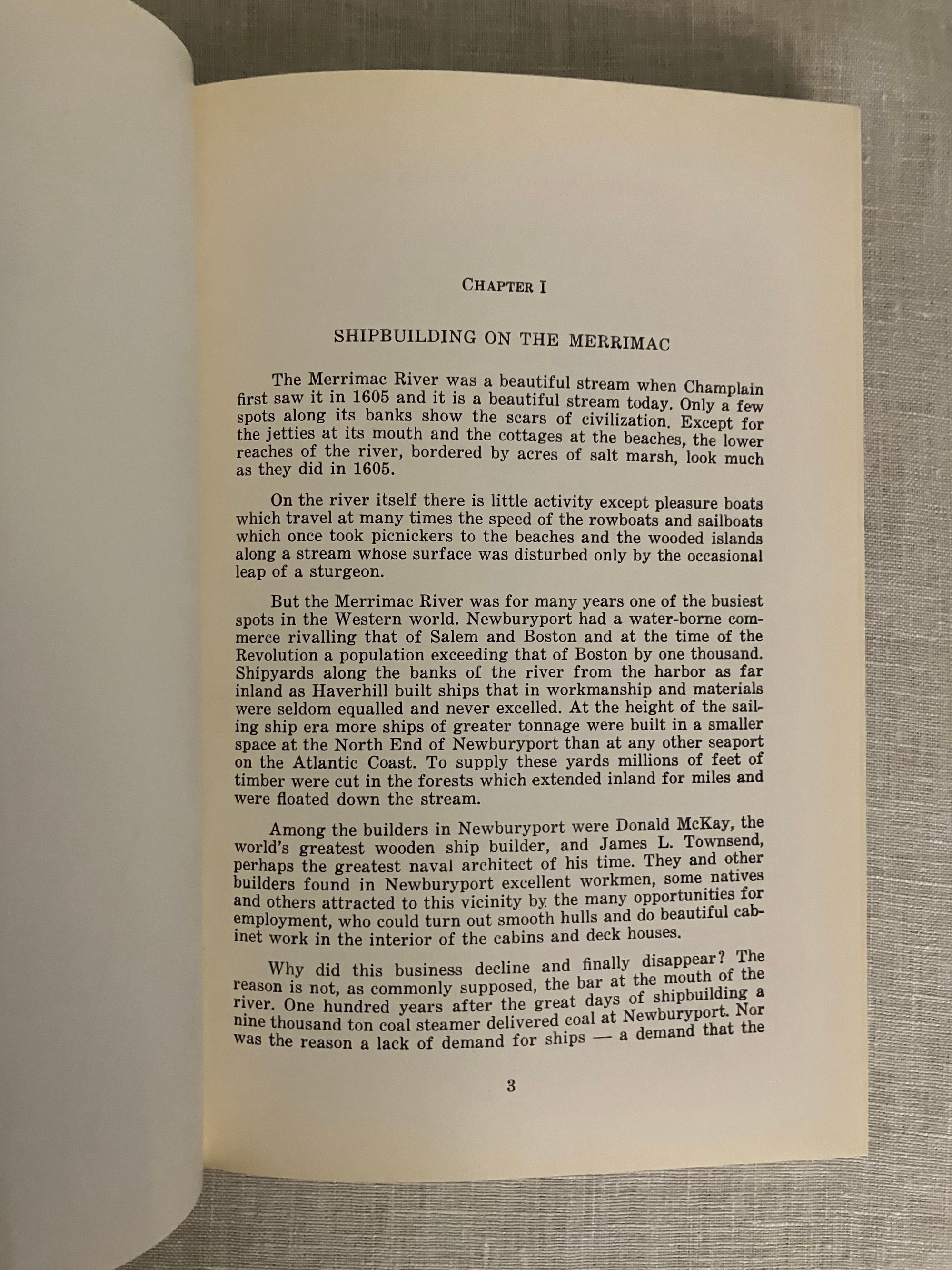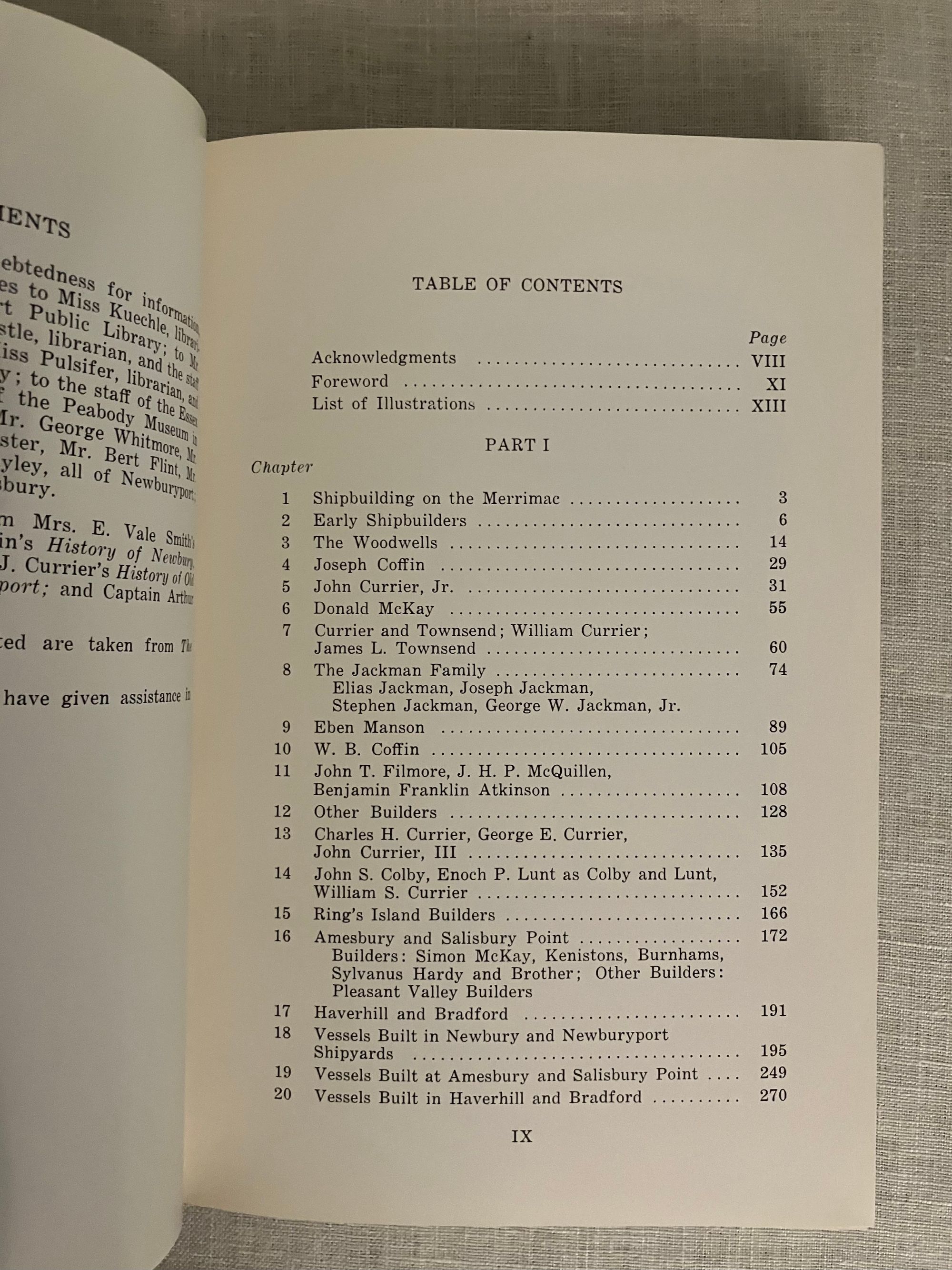 Hard cover, 8vo, in light blue cloth with titles in silver, map endpapers of Newburyport shipyards, frontispiece portrait of the Author, xiv, 386 pp., First edition signed by Author. Illustrated. CONDITION: Near Fine, with a little light rubbing. "No one has ever accumulated so much information on the shipbuilding of the region, the fishing fleets, the busy coasting industry, or the steamers and tugboats which were built there, or plied their smokey way to the head of navigation. Some of the most famous ships of the America's great days of sail were built in Newburyport" (from the Foreward). Early shipbuilding history from the area in the seventeenth-century is discussed. Details the famous Currier and Townsend Shipyard's speed-record-setting packet ship, "The Dreadnaught," traversing from New York to Liverpool in a mere nine days and thirteen hours in 1860. Other shipbuilders included a young Donald McKay, and George W. Jackman, Jr., spanning the days of clipper ships to steamers. A comprehensive, and indexed, text with background on the world travels of captains, ship's merchandise and crew from the lower Merrimack River to points across the world.