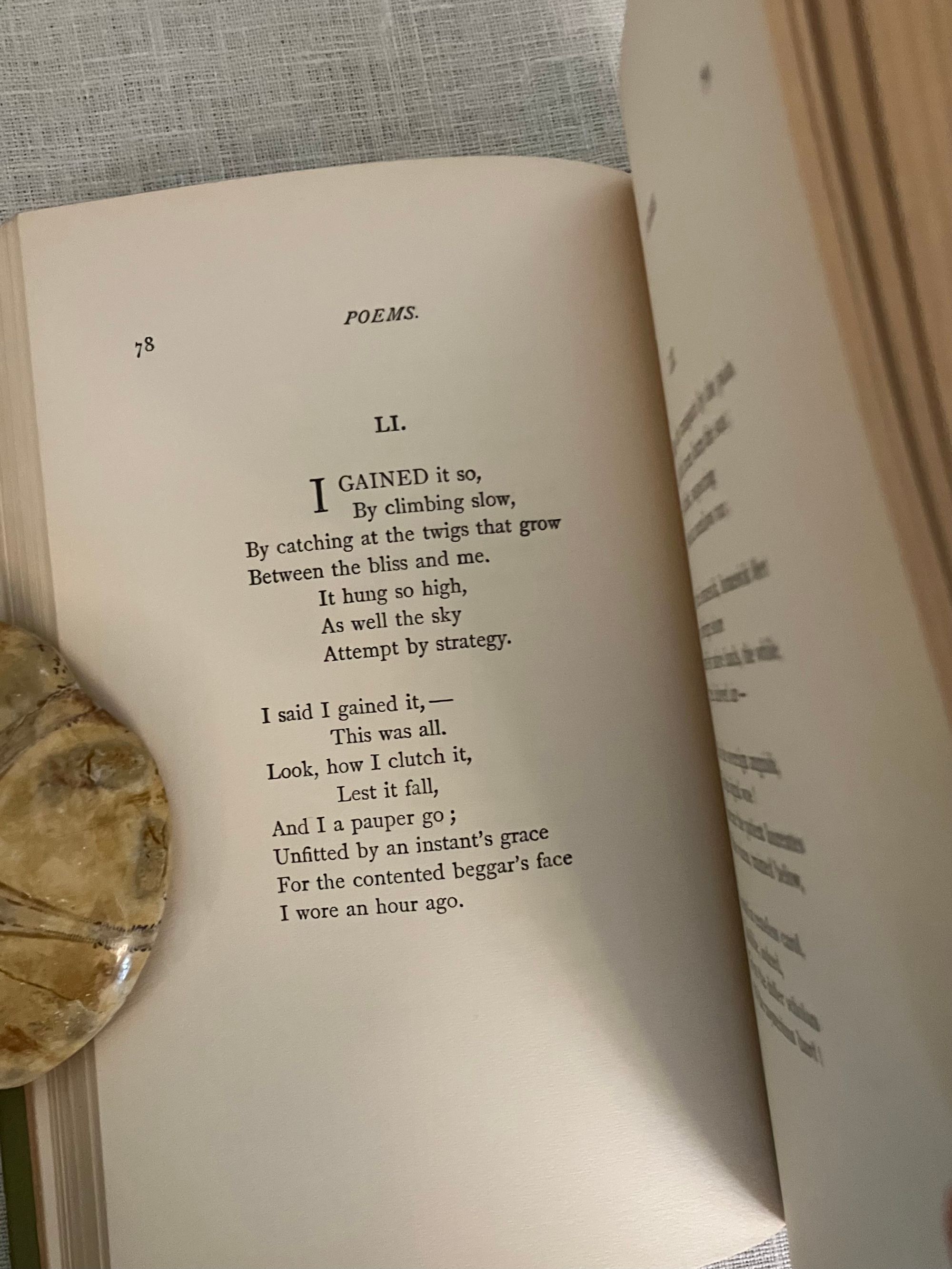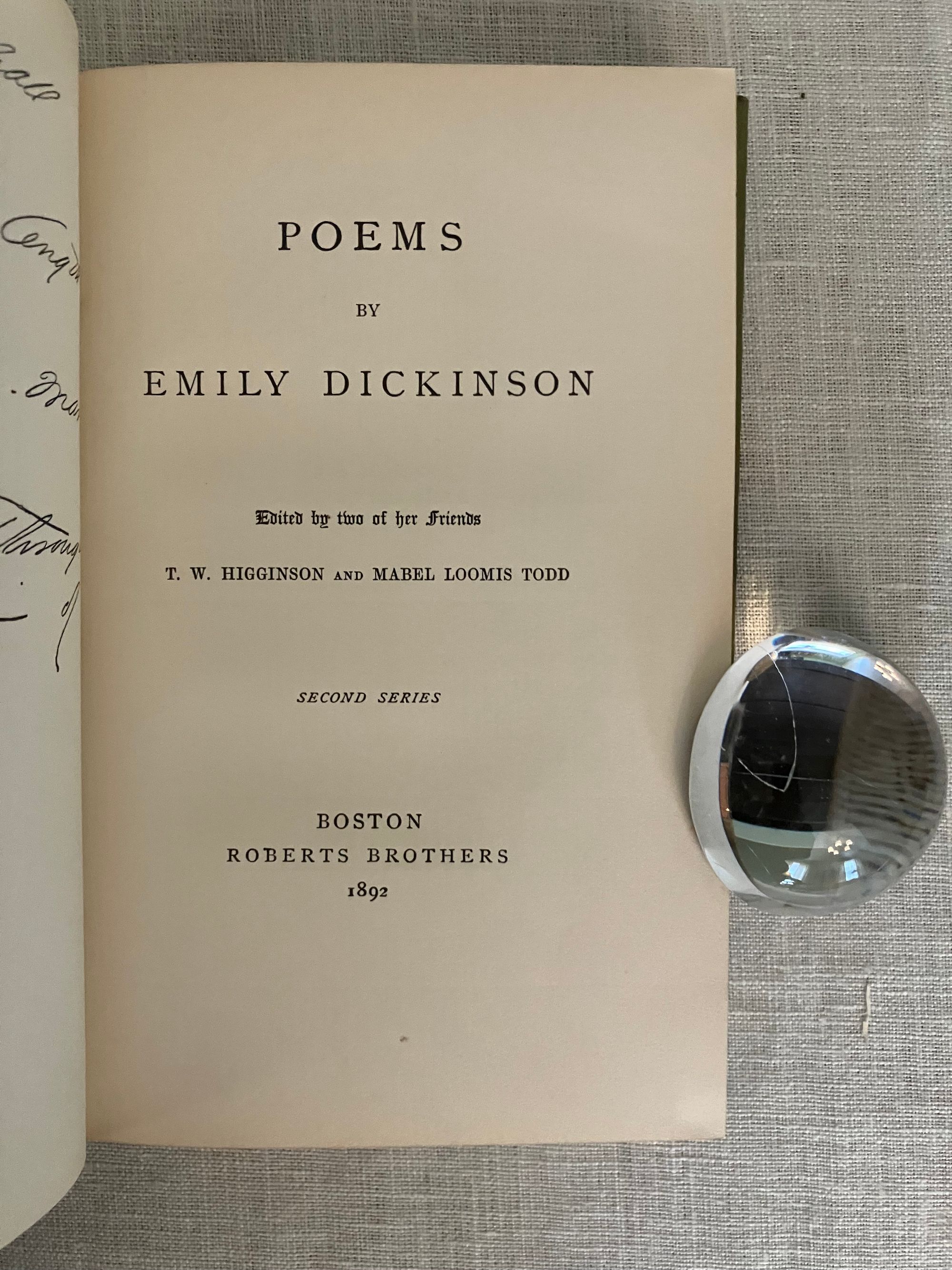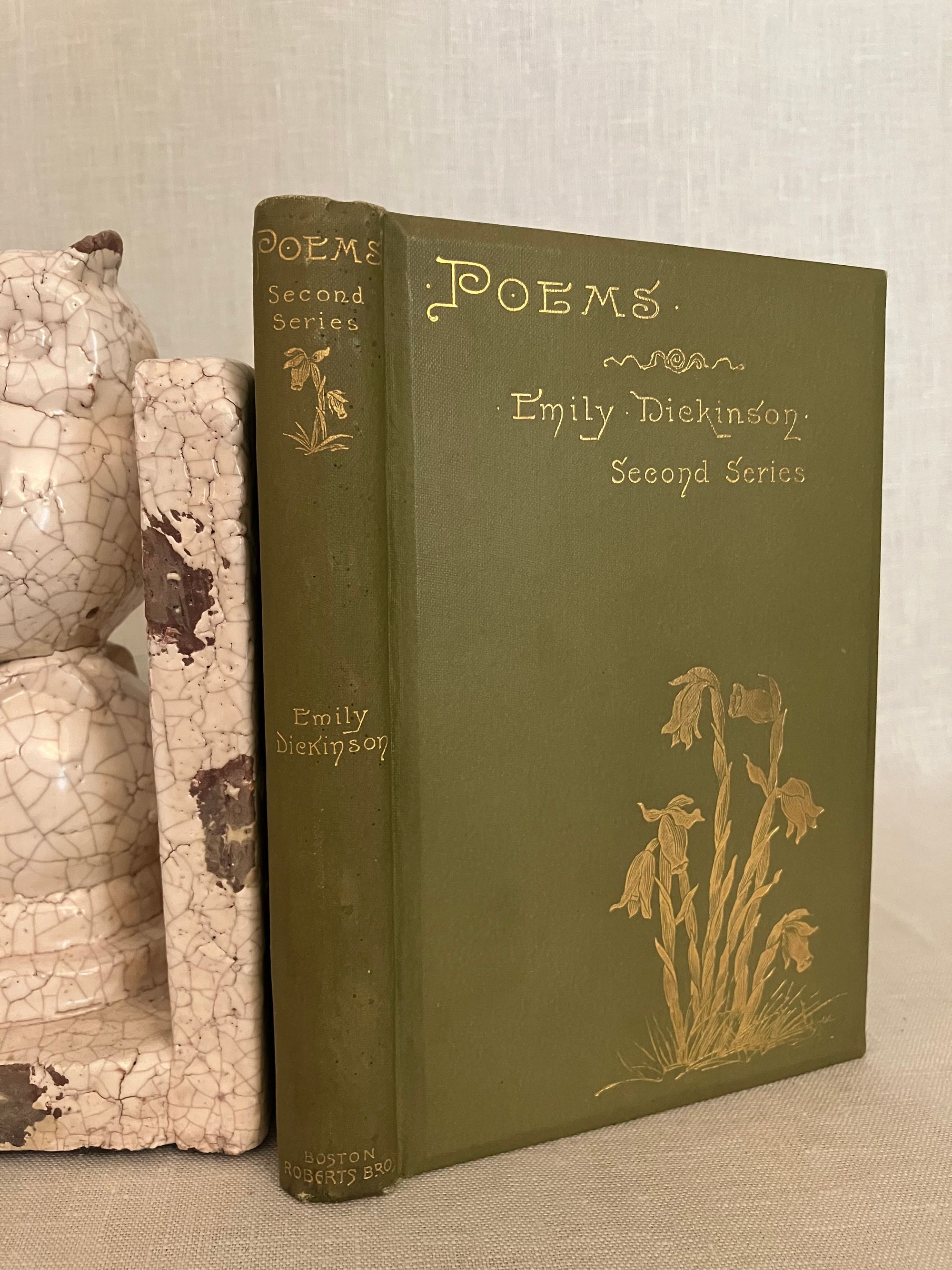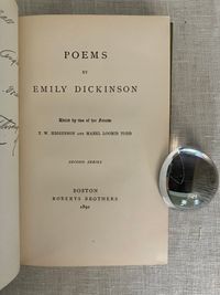 First edition, second printing, with copyright 1891. Hard cover,16mo, (4 3/4 x 6 15/16 Inches) in original variant b binding (no preference) of green cloth with the Indian or ghost pipe wild flower vignette blocked to cover and spine, the titles in gold decorative script to bevelled edged front board, with BOSTON/ROBERTS BROS. at foot of spine, top edge gilt, with original white silk bookmark intact. Collation: [i-iv], facsimile [v-vii], [1] -230pp, [3] pp. CONDITION: Near Fine. A few dark spatter marks to spine edge only, seen in photo. Otherwise, clean, firm, unmarked, unwritten in, bright with extremely limited wear. Bookmark intact.**The "Belle of Amherst", Massachusetts poet EMILY DICKINSON, (1830-1886) was influenced by the transcendentalists, and her work is well known for its close attention to nature, independent thought and introspective tenor. She published little during her lifetime, and the three "series" of these poems represent the first public dissemination of the vast majority of her work. **This second printing has the six errata text corrections specified by Meyerson, (the only changes from the first printing). The decorative artwork to the covers was apparently from a painting done by Mabel Loomis Todd, one of the literary editors with a romantic connection to the poet's brother, Austin. The other editor, Thomas W. Higginson, had corresponded with Dickinson during her lifetime, offering literary encouragement. Higginson had a Newburyport connection, being employed early in his pastoral career as minister of that city's Unitarian Church. His increasing involvement in the politics of abolition and women's suffrage would eventually, however, see him relocate to Boston. BAL 4656. Meyerson (1984) A.2.1b, p. 26.