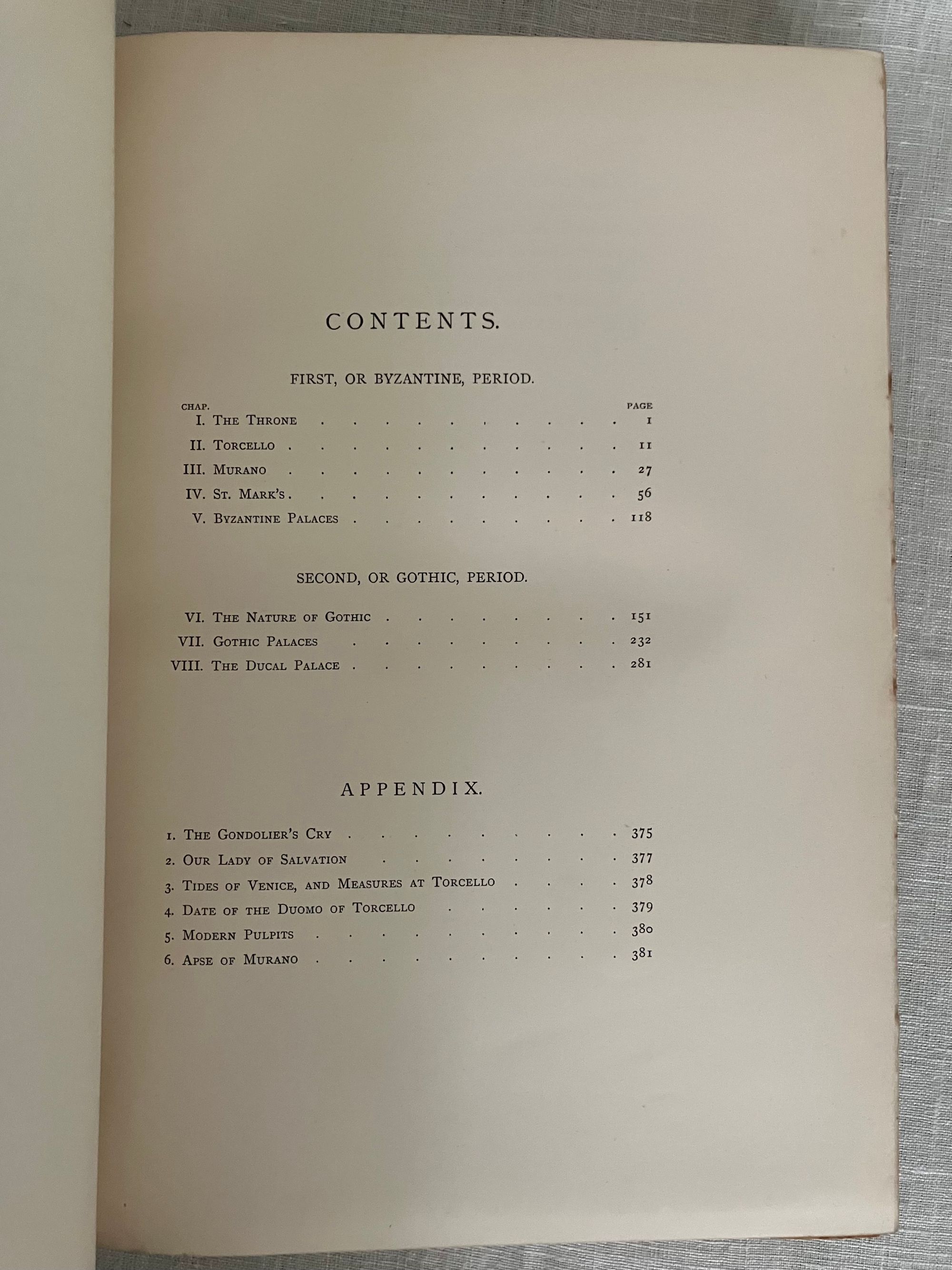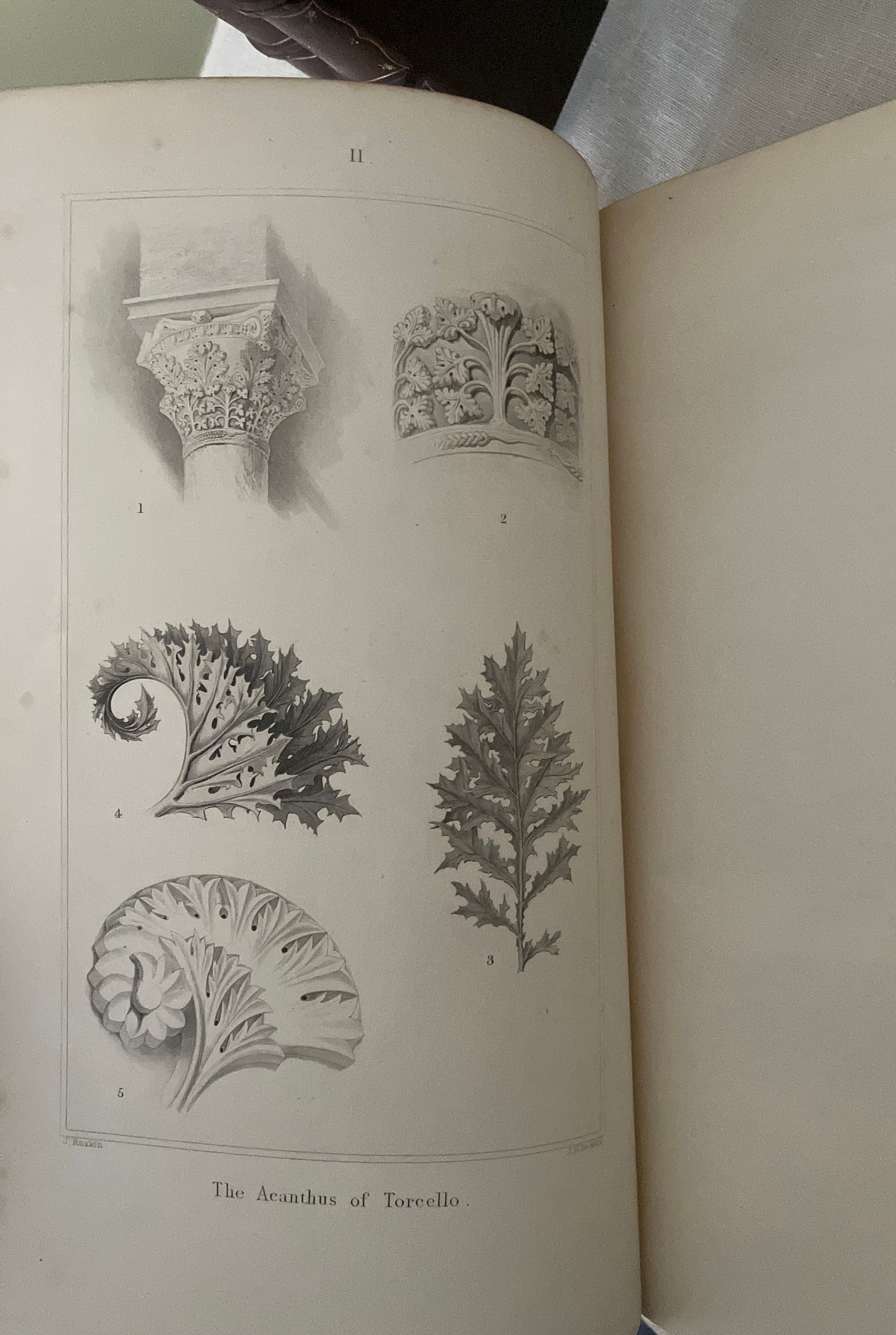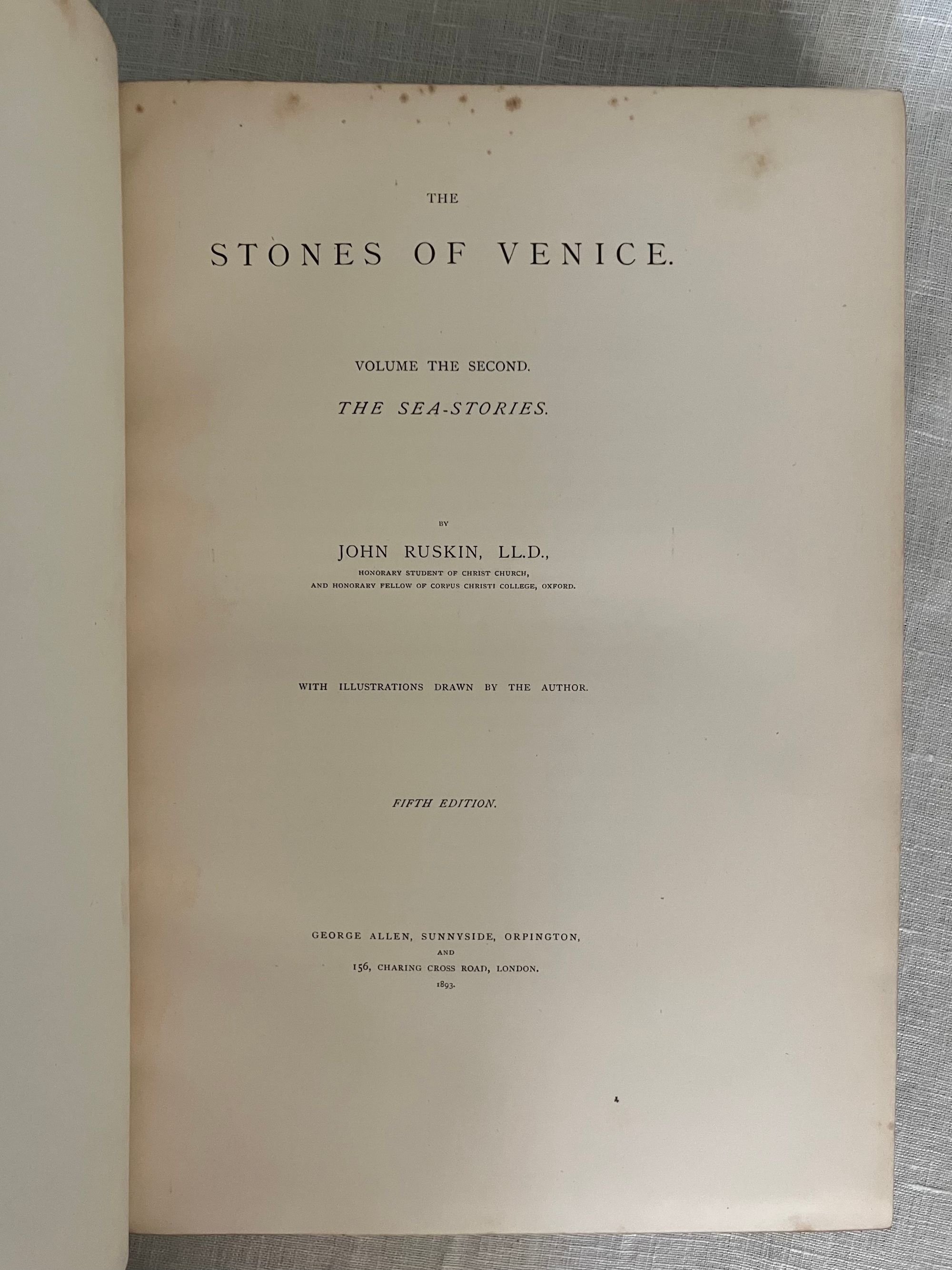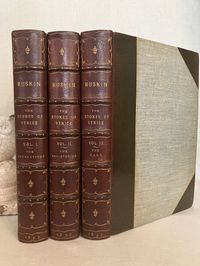Fifth Edition. Hard cover, in three volumes complete, Imperial octavo (8 x 11.5 inches) in three-quarter crushed morocco over light green wove cloth, gilt with a single rule. The spine has five raised gilt-tooled bands, each compartment tooled with a 4-part ogee (byzantine arch shaped) Italianate banding, centering corner fleurons and a central floral motif. The date 1893 at the foot. Binding is stamp-signed to verso endpaper by London bookbinder W. J. Mansell. Printed by Ballantyne, Hanson and Co., at the Ballantyne Press, Edinburgh. Decorative ditzy floral-printed endpapers in teal and gold. Text in English. T.e.g. Top edge, bottom edge trimmed, fore-edges not trimmed. **CONDITION: Near Fine. Some light foxing near top edge, mostly at prelims., or opposite engraved plates, sometimes lightly affecting upper margins of plates. Text block fore-edges only: lightly browned and spotted. Generally though very clean, lightly age-toned , and the binding itself appears unworn and unrubbed. Some pages unopened. **COLLATION: Vol 1: "The Foundations," xv [1], [1]-403 pp. Vol.2: "The Sea Stories", ix, [v], [1]-397 [7]pp., with engraved armorial bookplate (believed to be William Pepperell) with the Latin motto:"peperi" and "vertute, parta, tuemini." [Univ. Delaware has an identical-looking bookplate identified with the Pepperell family in their digital collection.] Vol III: "The Fall," [4], [iv], [1] - 352; gen. index, 135pp., [5]pp.**First published between 1851-1853, this three-volume classic by the nineteenth-century English artist, art historian, social reformer and critic John Ruskin, first Slade Professor of Art at Oxford University, (1819-1900), is both a readable travelogue and history of the fabled Italian Republic whose watery beauty and peculiar logistical importance as a center of trade has beguiled travelers and attracted conquerors for more than two millennia. Most significantly, however, is Ruskin's architectural analysis, detailing how successive layers of historical and cultural influence can be read into the overlapping styles of a handful of churches and civic buildings in Venice --often utilizing repurposed materials--in carefully chosen examples of the early Byzantine, the later medieval, and Gothic styles. He codifies the styles in both moral and philosophical terms, contrasting the Southern European, Greek and Egyptian forms to that found in the colder climates of Northern Europe. Of particular note is the now-famous section from Vol. II which would become the work's most famous essay, "The Nature of Gothic." Written in vivid prose, this essay excited others to abstract and reprint it on its own, as did Ruskin-admirer William Morris, who in 1892 would produce his beautifully designed Kelmscott Press edition, along with a laudatory Preface. ** The ILLUSTRATIONS in "The Stones of Venice" form a carefully co-ordinated program in which the Author-Artist oversaw reproductions made from his own original sketches, watercolors and novel daguerreotype-aided drawings. These were then worked by others into a variety of media, including steel line engravings, sepia-tinted soft-ground etchings (3 originals in Vol. I ), and aquatints, later chromolithographed, producing an altogether cohesive and attractive whole with numerous tissue-guarded full page plates. *BOOKBINDER William Mansell is mentioned as the successive owner, and once business partner to, the London West End firm of James Hayday, purchasing the latter's business name upon his demise in 1872. (Nixon, 1978, p. 202). A solid, worthy copy of this classic work on the history of architecture for the architecture student, (or simply an admirer of all things Venetian.) REF: T. J. Wise and J.P. Smart, "A Complete Bibliography of the Writings... of John Ruskin," Vol. II, p. 63, (London: R. Clay & Sons, Printers, 1891-93) only lists through the 4th edition of 1886. **Heavy set: may require extra postage if sent priority or abroad. (14.5 lbs.)