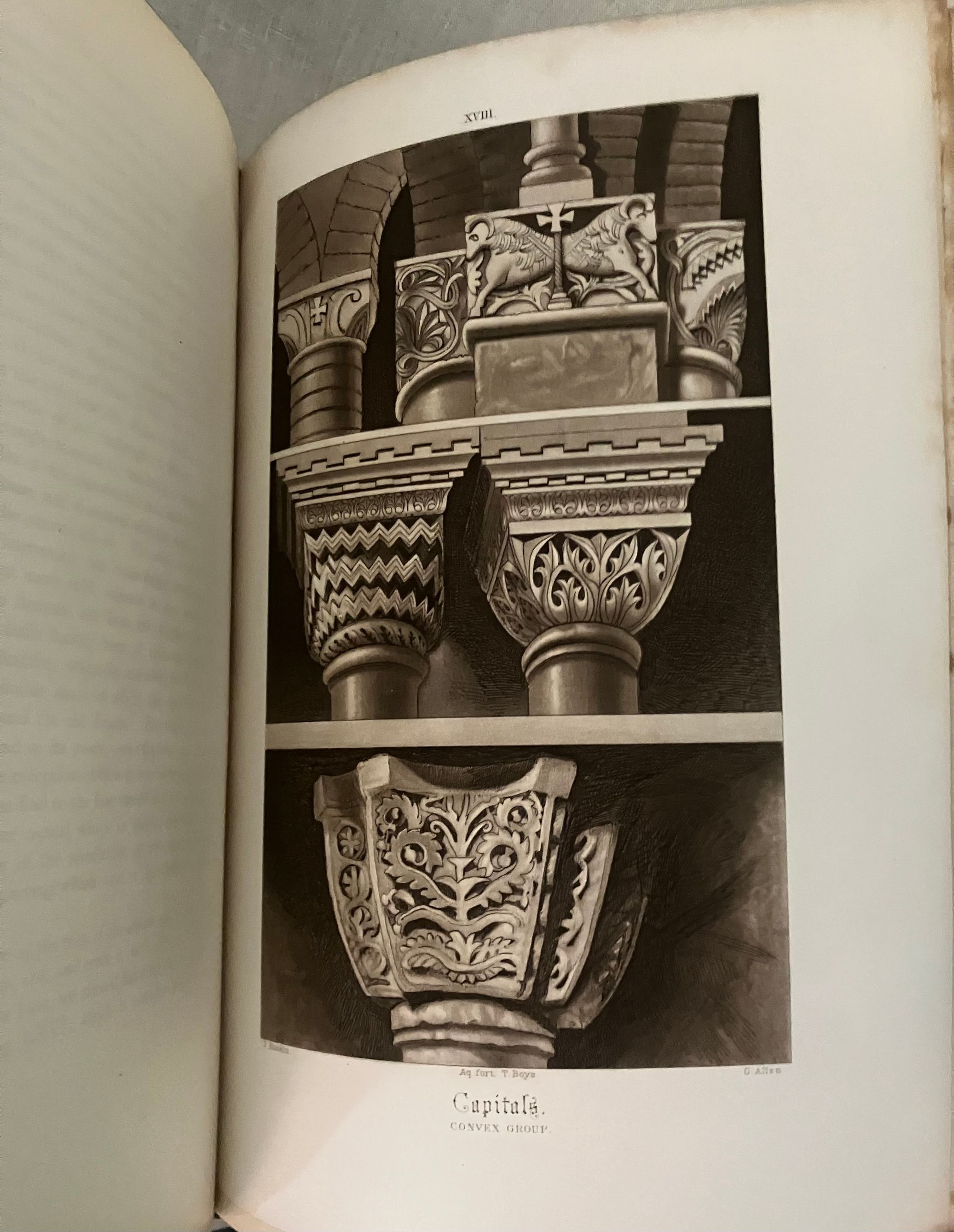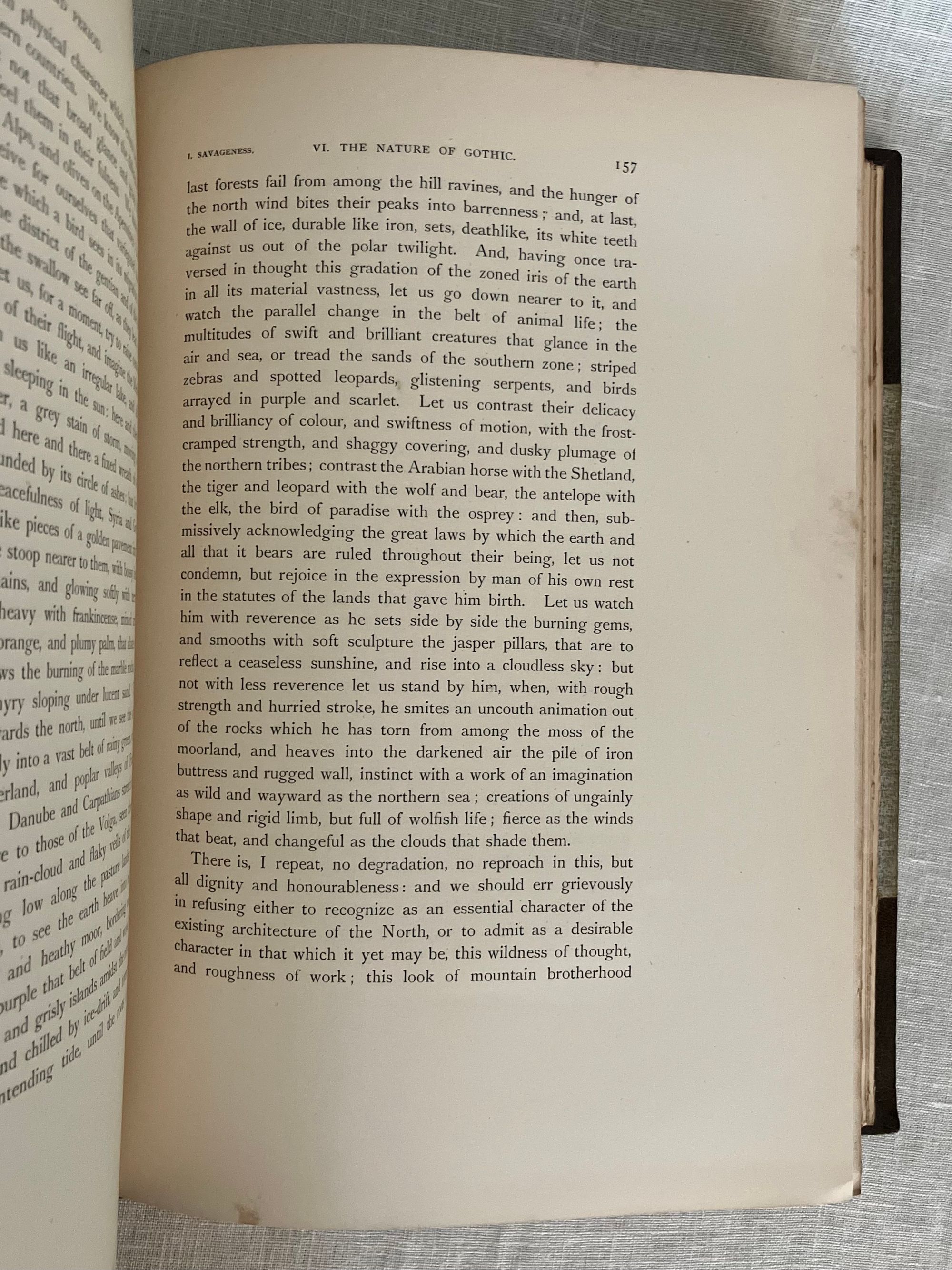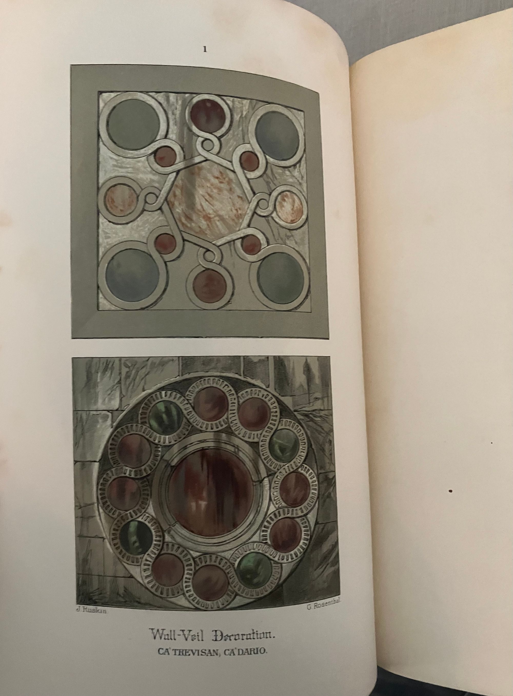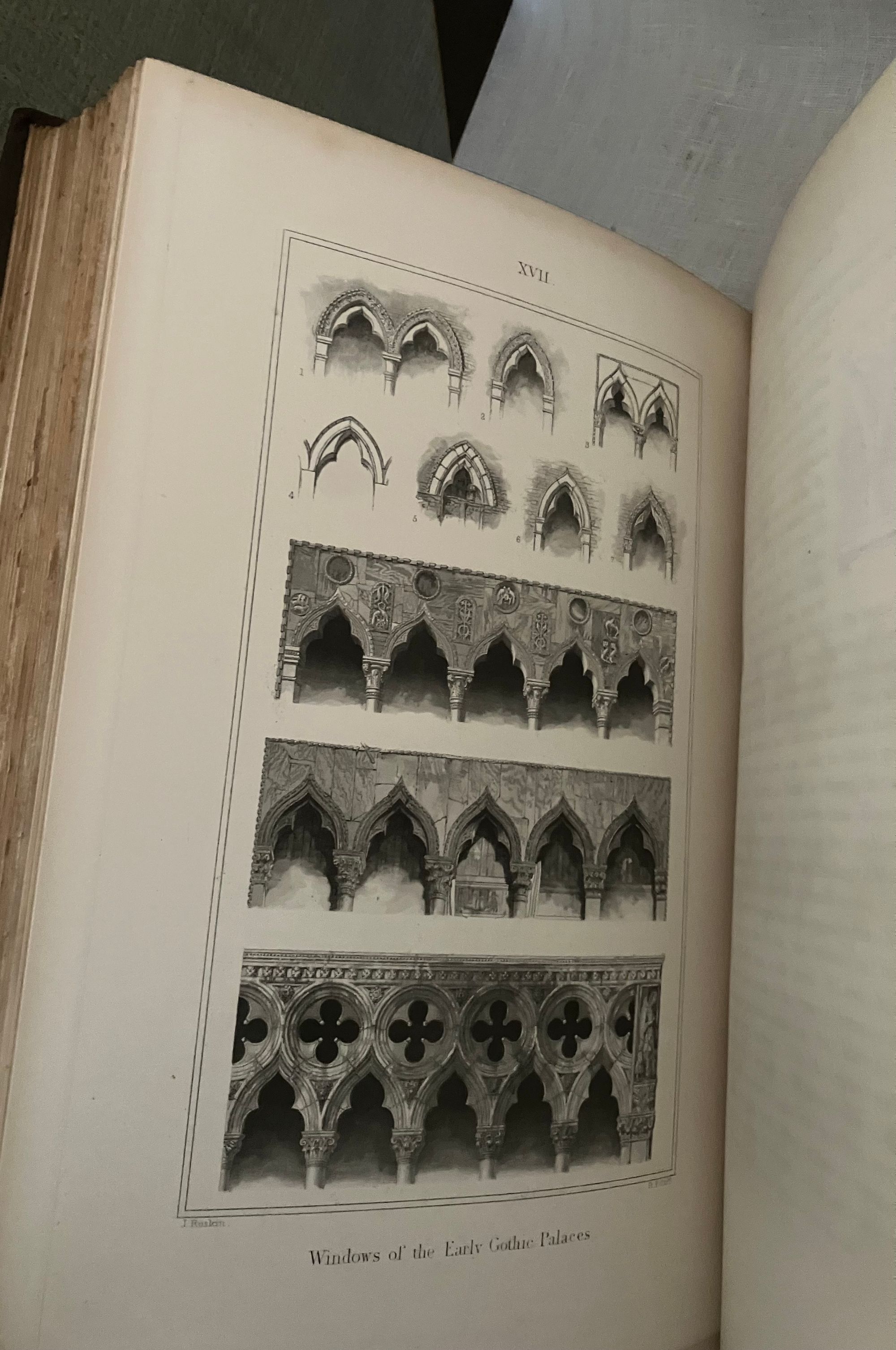 Fifth Edition. Hard cover, in three volumes complete, Imperial octavo (8 x 11.5 inches) in three-quarter crushed morocco over light green wove cloth, gilt with a single rule. The spine has five raised gilt-tooled bands, each compartment tooled with a 4-part ogee (byzantine arch shaped) Italianate banding, centering corner fleurons and a central floral motif. The date 1893 at the foot. Binding is stamp-signed to verso endpaper by London bookbinder W. J. Mansell. Printed by Ballantyne, Hanson and Co., at the Ballantyne Press, Edinburgh. Decorative ditzy floral-printed endpapers in teal and gold. Text in English. T.e.g. Top edge, bottom edge trimmed, fore-edges not trimmed. **CONDITION: Near Fine. Some light foxing near top edge, mostly at prelims., or opposite engraved plates, sometimes lightly affecting upper margins of plates. Text block fore-edges only: lightly browned and spotted. Generally though very clean, lightly age-toned , and the binding itself appears unworn and unrubbed. Some pages unopened. **COLLATION: Vol 1: "The Foundations," xv [1], [1]-403 pp. Vol.2: "The Sea Stories", ix, [v], [1]-397 [7]pp., with engraved armorial bookplate (believed to be William Pepperell) with the Latin motto:"peperi" and "vertute, parta, tuemini." [Univ. Delaware has an identical-looking bookplate identified with the Pepperell family in their digital collection.] Vol III: "The Fall," [4], [iv], [1] - 352; gen. index, 135pp., [5]pp.**First published between 1851-1853, this three-volume classic by the nineteenth-century English artist, art historian, social reformer and critic John Ruskin, first Slade Professor of Art at Oxford University, (1819-1900), is both a readable travelogue and history of the fabled Italian Republic whose watery beauty and peculiar logistical importance as a center of trade has beguiled travelers and attracted conquerors for more than two millennia. Most significantly, however, is Ruskin's architectural analysis, detailing how successive layers of historical and cultural influence can be read into the overlapping styles of a handful of churches and civic buildings in Venice --often utilizing repurposed materials--in carefully chosen examples of the early Byzantine, the later medieval, and Gothic styles. He codifies the styles in both moral and philosophical terms, contrasting the Southern European, Greek and Egyptian forms to that found in the colder climates of Northern Europe. Of particular note is the now-famous section from Vol. II which would become the work's most famous essay, "The Nature of Gothic." Written in vivid prose, this essay excited others to abstract and reprint it on its own, as did Ruskin-admirer William Morris, who in 1892 would produce his beautifully designed Kelmscott Press edition, along with a laudatory Preface. ** The ILLUSTRATIONS in "The Stones of Venice" form a carefully co-ordinated program in which the Author-Artist oversaw reproductions made from his own original sketches, watercolors and novel daguerreotype-aided drawings. These were then worked by others into a variety of media, including steel line engravings, sepia-tinted soft-ground etchings (3 originals in Vol. I ), and aquatints, later chromolithographed, producing an altogether cohesive and attractive whole with numerous tissue-guarded full page plates. *BOOKBINDER William Mansell is mentioned as the successive owner, and once business partner to, the London West End firm of James Hayday, purchasing the latter's business name upon his demise in 1872. (Nixon, 1978, p. 202). A solid, worthy copy of this classic work on the history of architecture for the architecture student, (or simply an admirer of all things Venetian.) REF: T. J. Wise and J.P. Smart, "A Complete Bibliography of the Writings... of John Ruskin," Vol. II, p. 63, (London: R. Clay & Sons, Printers, 1891-93) only lists through the 4th edition of 1886. **Heavy set: may require extra postage if sent priority or abroad. (14.5 lbs.)