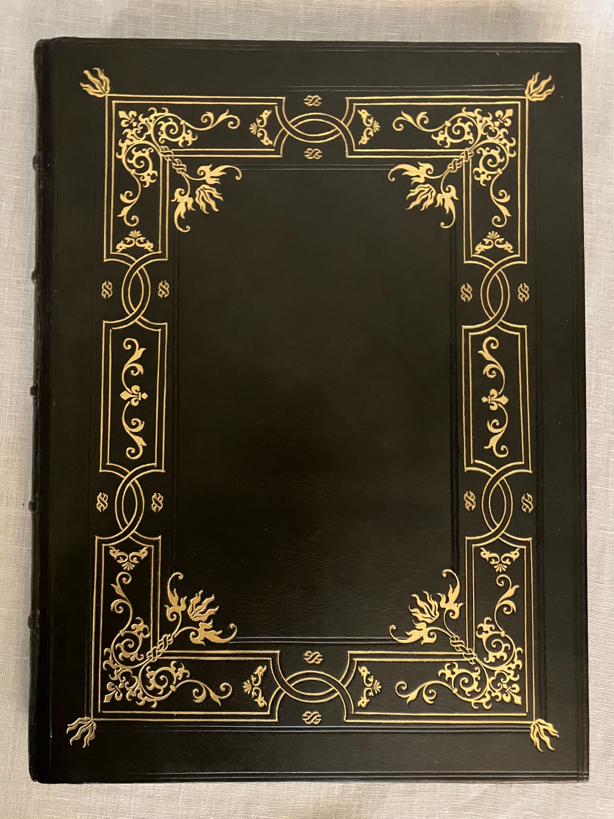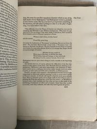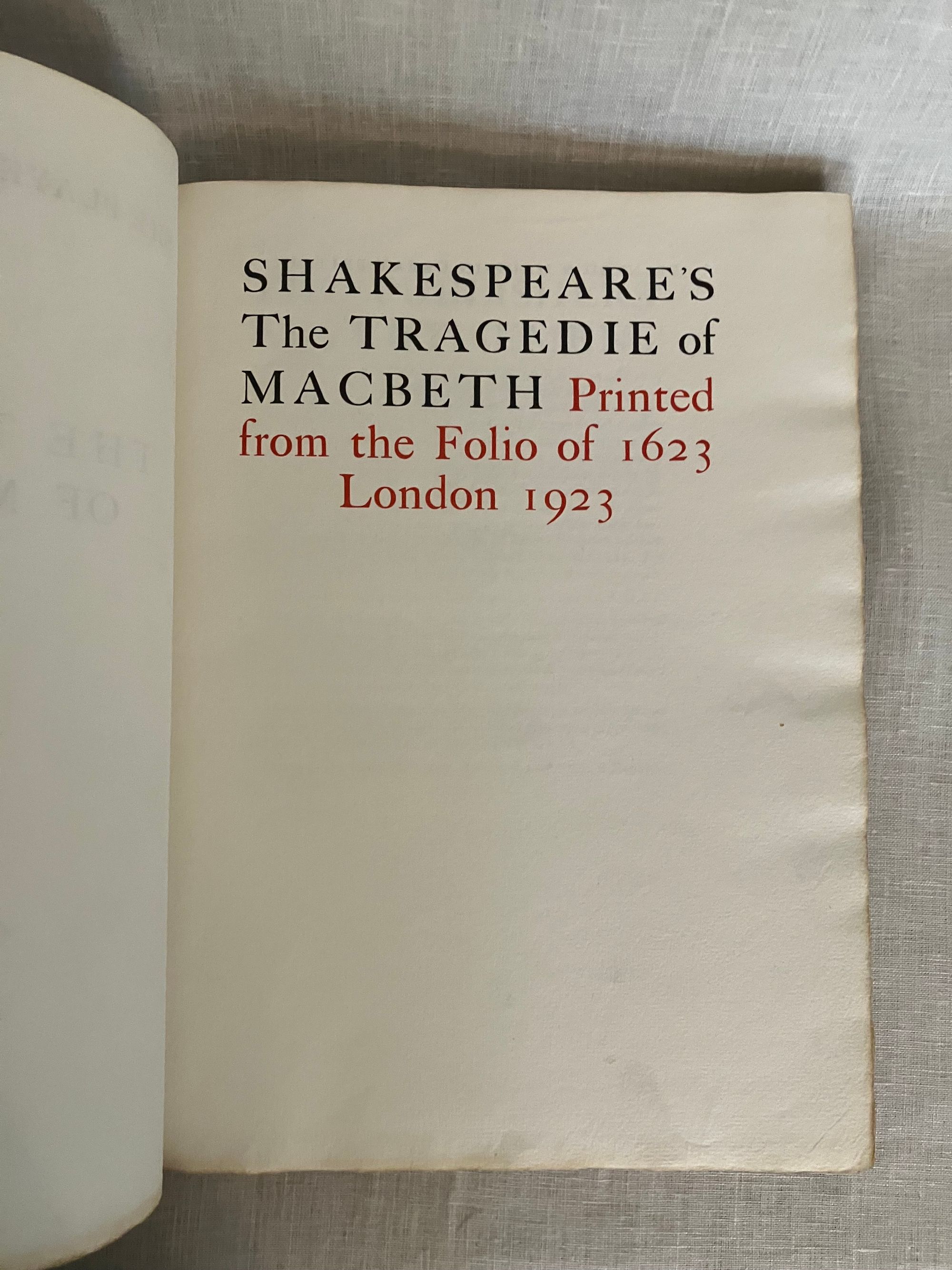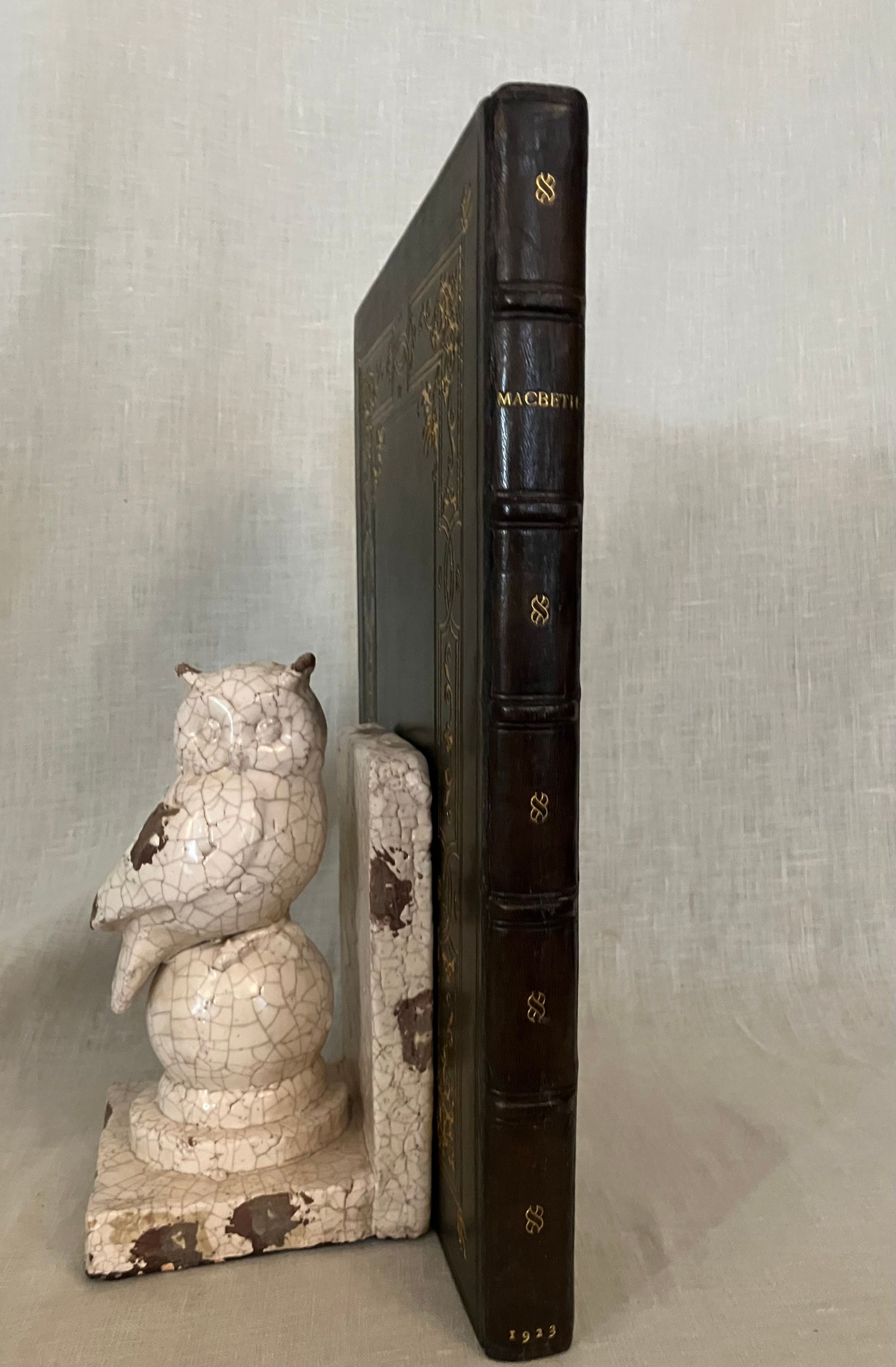Hard cover, 4to (measuring 9 1/2 x 13 inches) in a limited edition, (No. 97 of 100 copies) letterpress printed, in the original fine binding of green morocco, with the boards decorated in gilt and blind in an Italianate architectural frame (Grolier style) featuring torches blazing in both inner and outer corners, fleurs de lis and other shapes, such as small x-crossed ogees (which imitate crossed marks made by a calligraphic pen, in outline) bound by Zaehnsdorf, 1923 with their oval tooled gilt figural insignia of a man at a book finisher's worktable on the lower rear endpaper. The spine has five raised bands, the title tooled to the second, and the other compartments tooled with the crossed ogee. Half-title reads: "The Player's Shakespeare/ The Tragedie of Macbeth." Title page: "Shakespeare's The Tragedie of Macbeth Printed/ from the Folio of 1623/London 1923, in black and red inks. Printed upon Batchelor's Kelmscott rag paper with their hammer and anvil watermark, all as identified in the"Publisher's Advertisement". ***ILLUSTRATED AND SIGNED by the very influential, Swiss-born early twentieth-century British Arts and Crafts book design Artist, CHARLES DE SOUCY RICKETTS (1866-1931), once principal book designer at John Lane's Bodley Head, co-publisher of the magazine "The Dial," principal partner of publishers Hacon and Ricketts (circa 1890- 1898), and, with Charles Shannon, the Vale Press, as well as an early mentor and publisher in collaboration with the Eragny Press's Lucien Pissarro, from about 1890. Ricketts's work represented the best of its time, evolving the fine press craft traditions of printer Emery Walker and designer William Morris into the twentieth century. The second signatory to this volume is by the Author of the "Introduction," HARLEY GRANVILLE-BARKER (1877-1946). Author, playwright, critic and producer, G-B was a major player in the staging of Shakespeare, (as well as other modern playwrights such as Ibsen and Shaw,) called by various the "Father of modern British theatre." His notes here provide useful information on how and why the original text was adapted by other pens, with remarks on the specifics of "The Scottish Play"; a worthy introduction to whet the readers' appetite for the series as a whole. Granville-Barker's own stage-craft book series "Prefaces to Shakespeare" appeared in print beginning in 1927; some passages from the text of this 1923 "Introduction" to Macbeth were directly translated into his Macbeth chapter in Vol. I of that series, and so it is not difficult to conclude this commission was a direct inspiration to the latter publication. Third signatory was ALBERT RUTHERSTON, Art-Editor, (1881-1953). **ILLUSTRATIONS : Ricketts provides 13 full page, tissue-guarded illustrations reproduced by the fine-art facsimile collotype printmaking method. This expensive, finicky technique involved the use of photographically exposed gelatine-covered plates, which enabled the resultant images to closely resemble the original Ricketts's fine-art watercolor drawings or other etchings. (The technique was being replaced in the 1920's with the advent of less expensive offset lithography.) **CONDITION: Near Fine. Oxidation to the spine has turned it brown in color. Minor touching up to joints, more at exterior rear joint. A couple of instances of very light soiling within, affecting margin of one plate. A few penciled notes to endpaper. Otherwise, hinges are in order, there is no foxing and overall the pages remain very bright, generally clean and sound. BOOKBINDER Joseph W. Zaehnsdorf, of Austrian-Hungarian descent, (1853-1930) son of that firm's founder, who had relocated to Britain by 1841. The Player's Shakespeare series was ambitiously conceived as a passion project of the publishers and printed between 1923 and 1927, in seven volumes; this was the first of those published. It is difficult to find full sets in matching bindings. The project was apparently abandoned because of the expense. REFS: Granville-Barker: R.Eyre column in "The Guardian," 11 Sept. 2009. On Ricketts, M. Watry, "The Vale Press" (Oak Knoll. Brit. Library, 2004). J.W. Zaehnsdorf, "The Art of Bookbinding," (London: Geo. Bell and Sons, 1890).