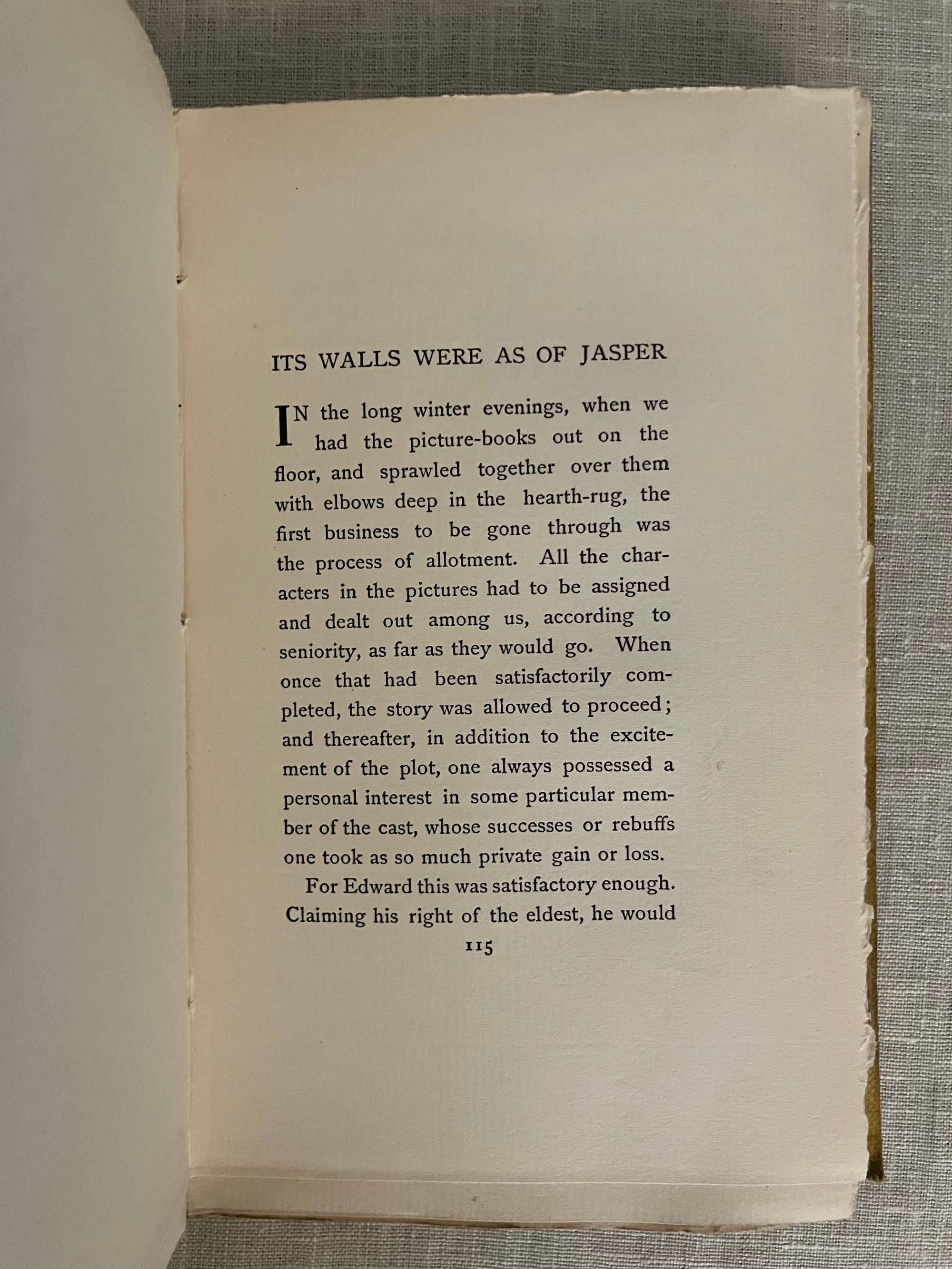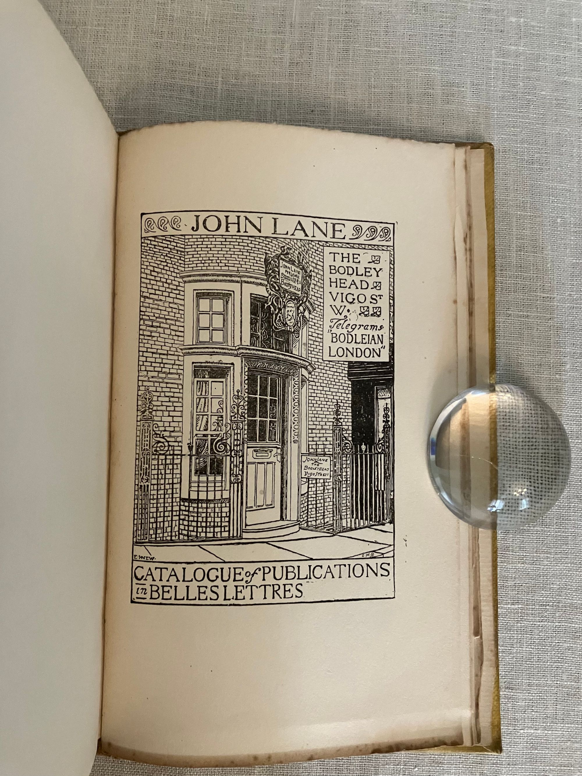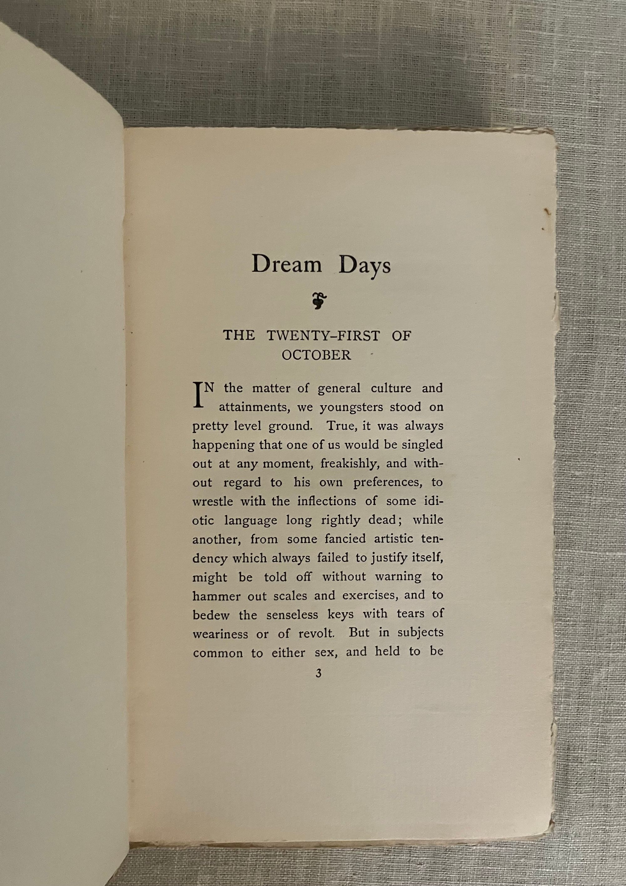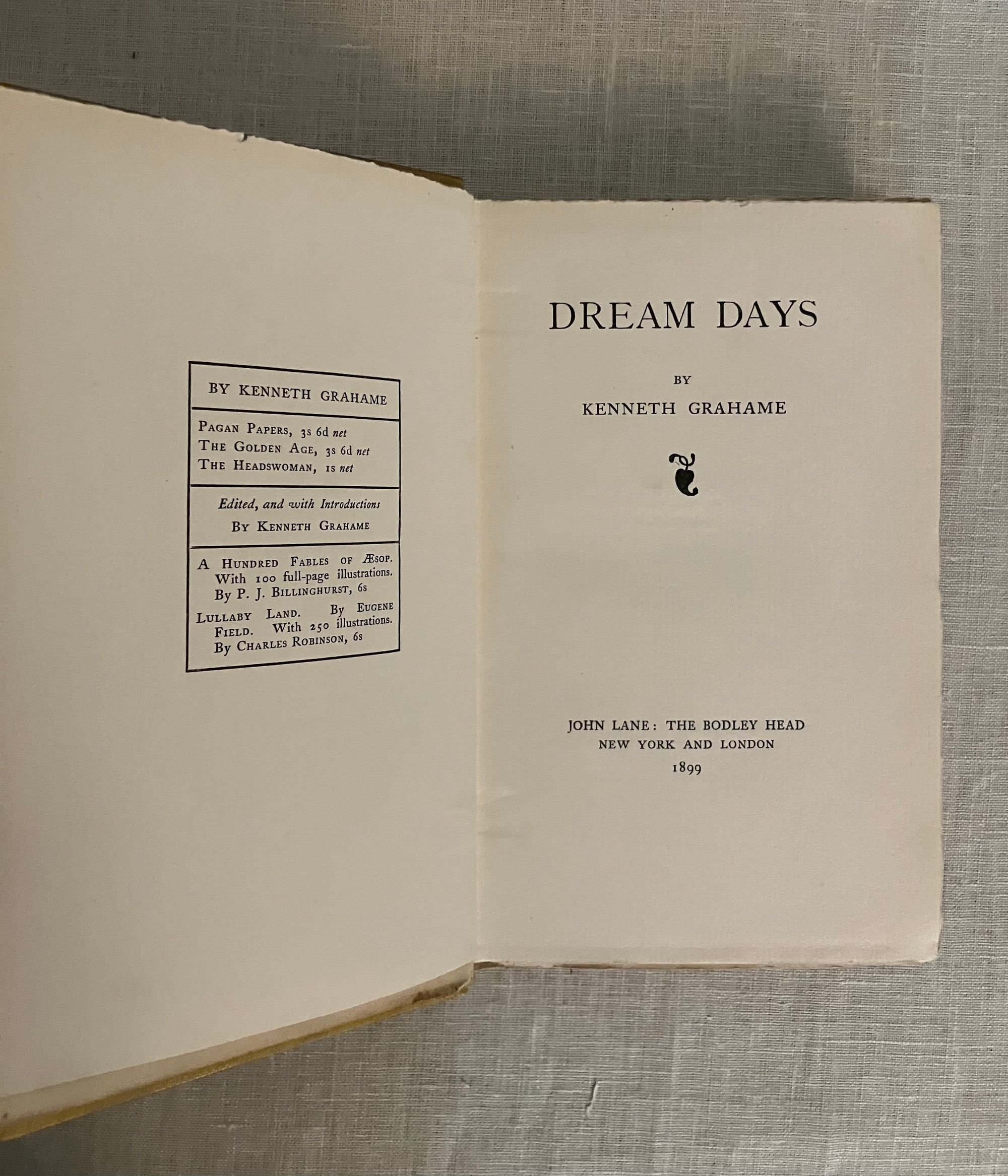 Copyright states 1898; title page 1899. First English edition, second printing [The First-first had a different cover. and all were issued without story illustration.] Hard cover, 16mo, in yellow pictoral cloth printed in green with figurative art of a young child in a hat amongst a fruiting, flowering bower, the titles in an artful script to front and spine, which has another young child with a rattle illustrated there. "List of books written or edited by Grahame on verso of half-title, priced in sterling." Printed by John Wilson and Son, University Press, Cambridge, U.S.A. , collophon. COLLATION: [3], 275pp. plus [15]pp. publisher's catalogue with the illustrated wood engraved cover art by British Artist Edward Hort New, who was associated with the Birmingham Guild of Handicraft, and whose initials appear in the lower left of the image. (See our listing Nos. 9417, 9419 and 9420 for other examples of his art.) "Typesetting in the U.S. was required to secure copyright for a foreign literary work; it is presumable that duplicate printing plates were sent to England for printing there. "The Golden Age" had been similarly printed and published." (worldcat) **CONDITION: Near Fine. Spine a bit darkened. This was a continuation of Grahame's semi-autobiographical tales of childhood begun in "The Golden Age," (see our listing no. 9284) and includes "The Twenty First of October," and "The Reluctant Dragon." Edinburgh-born AUTHOR Kenneth Grahame (1859-1932), was perhaps best known for his later work, "The Wind in the Willows" of 1908. Watson 1097.