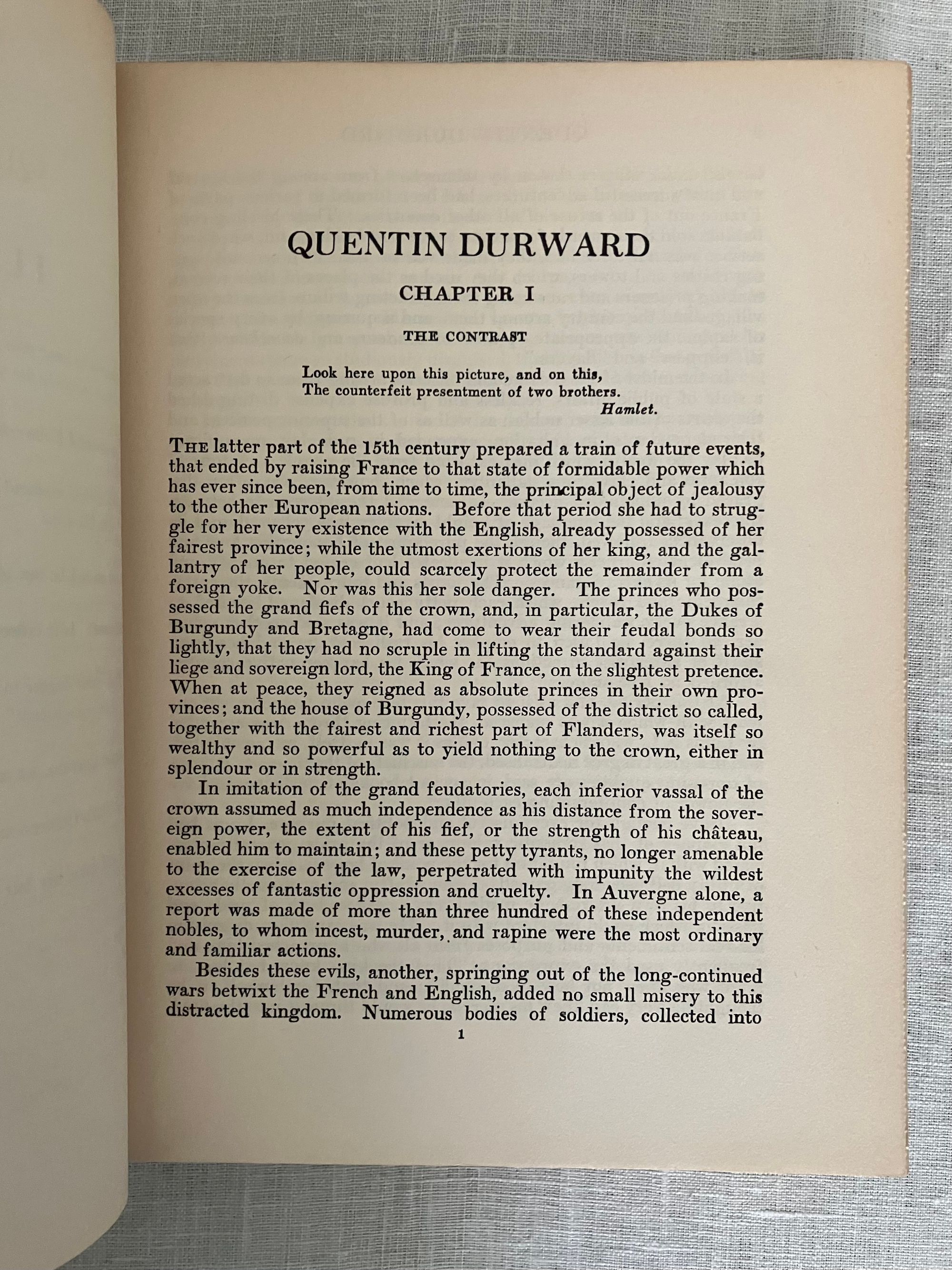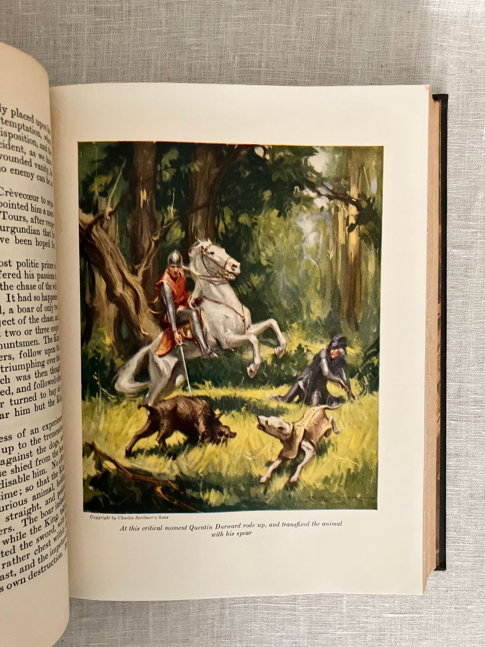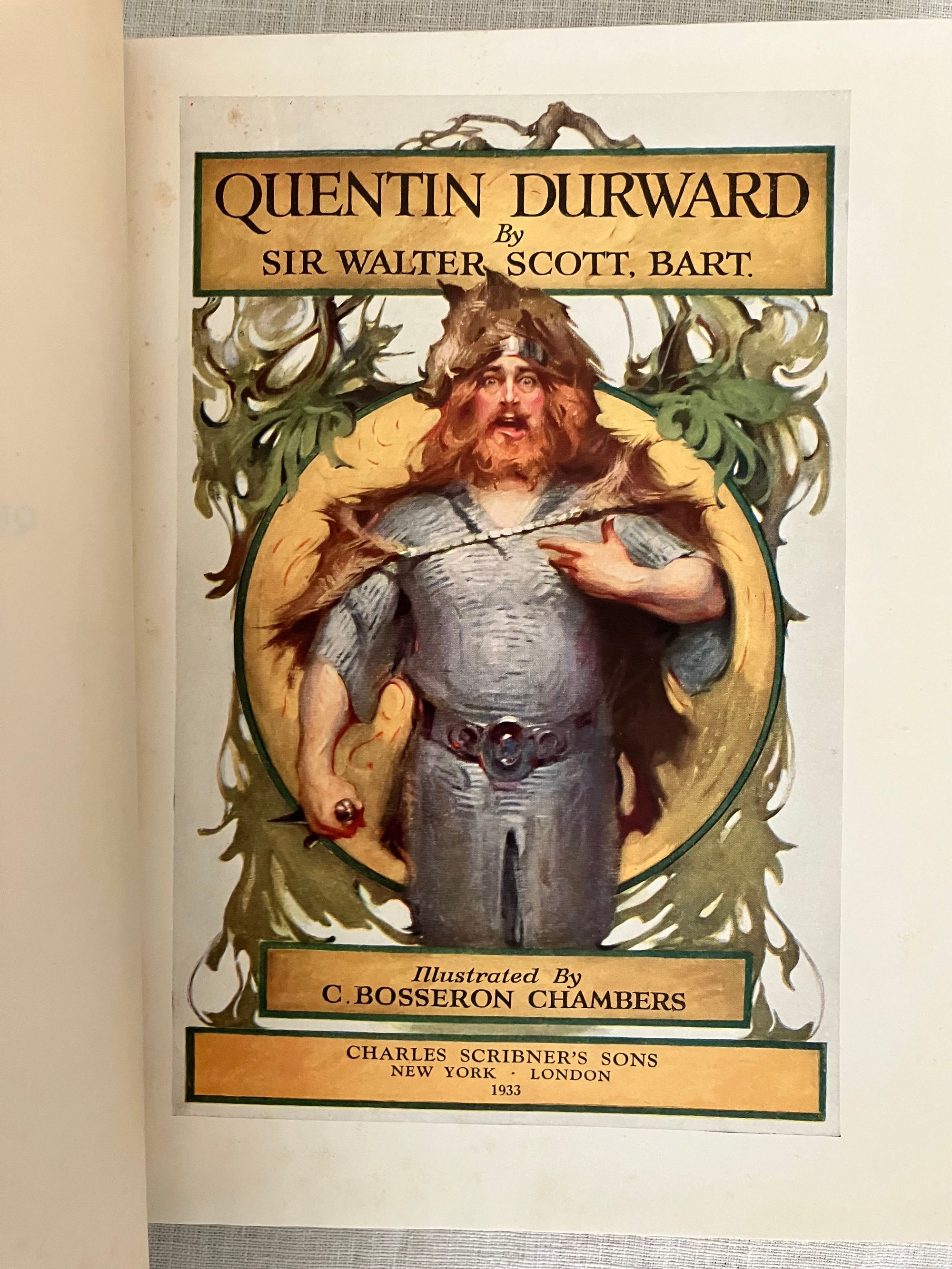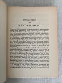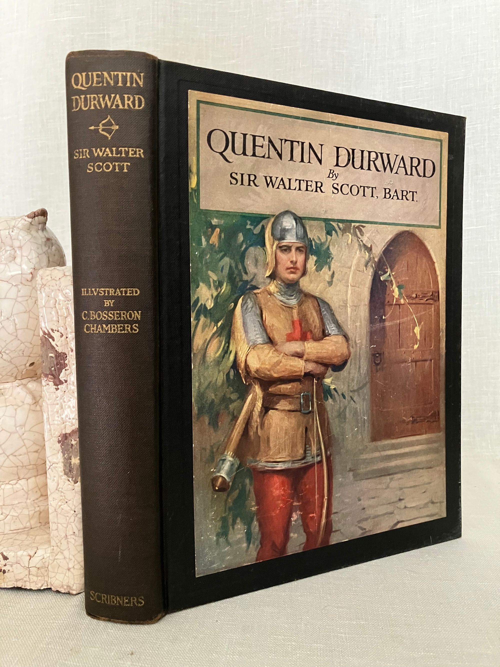 Reprint, (from 1923 Scribner's first illustrated trade edition.) Hard cover, large 8vo, in black cloth covered boards with applied chromolithographed cover art, titles printed to spine in gold, illustrated endpapers, color illustrated title page, plus nine additional full page color illustrations by American Artist Charles Bosseron Chambers (see below). COLLATION: xxxiii, [xxxiv-xxxvi], 422pp, plus 1 pg. series advertising for Scribner's "Illustrated Classics for Young Readers." CONDITION: Very Good. A few light scuff to covers. Pages moderately age toned, otherwise sound, square and with no obvious shelfwear. With lengthy introduction and Notes following text, best for the enthusiastic, young adult (or older) reader, perhaps. In his introduction datelined Abbotsford, Dec. 1831, prolific Scottish author Sir Walter Scott (1771-1832) dives deep into the historical background of 15th century French, English and continental politics, with historical facts about France's King Louis XI and changes evolving in the feudal system with consequent erosion of the values of chivalry. This book was one of the most popular of Scott's "Waverley Novels," a series of historical fiction which became a publishing sensation in the early nineteenth century. [It was also adapted into a wonderfully cheesey 1955 MGM swashbuckler of the same name, starring Robert Taylor, Kay Kendall and Robert Morley as the nasty King Louis XI. Blurb from IMDB: "Scottish knight in France to facilitate a marriage between a rich and beautiful countess and his aging uncle becomes involved in court intrigue."] **St. Louis-born Artist C. Bosseron Chambers (1882-1964) trained in Europe, later working in Florida and New York, became known for his book illustrations, society portraiture and Catholic religious imagery.