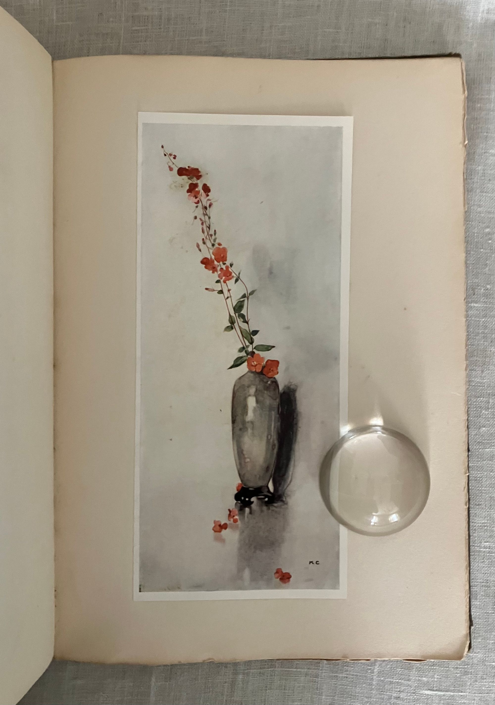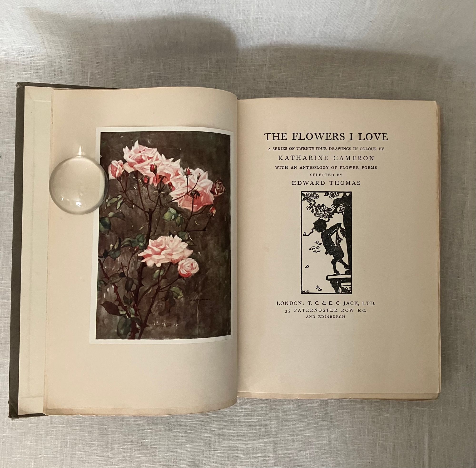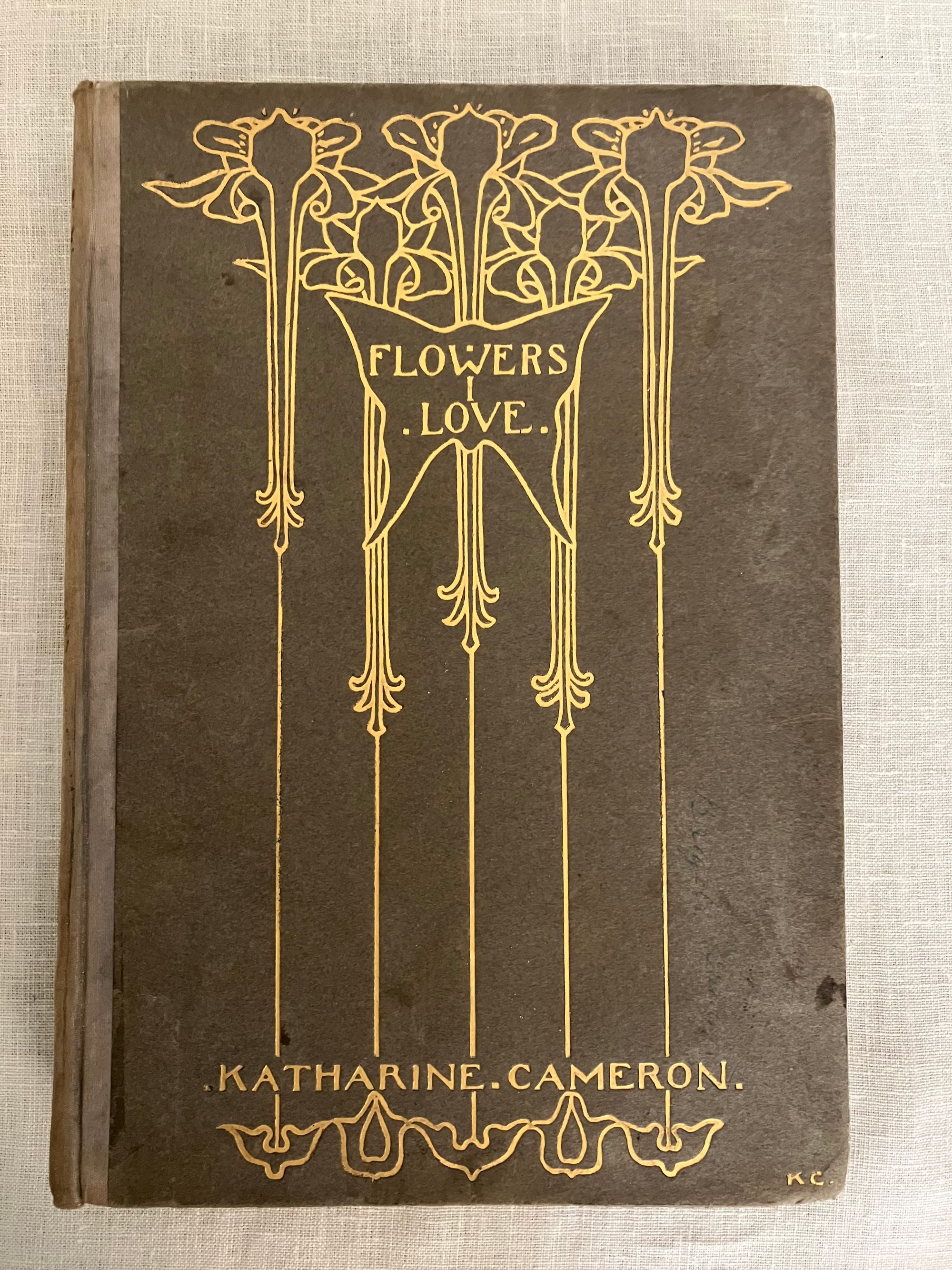 Undated, but believed to be from about 1915-1920. Hard cover 4to, in cream colored quarter linen over grey paper-covered boards blocked in gold with art deco cover design featuring five possibly iris-like flowers with long descending stems terminating in abstract leaves and surmounted by a butterfly shaped shield with the illustrated title design, initialed by the artist Katherine Cameron within the design lower right front. Spine in gold repeating title and single flower design as on front board. xi, 81pp., with unnumbered plate and labelled guard pages. Frontispiece " Roses of Morning" and additional 23 chromolithographed plates are tipped in. Printed in Great Britain upon thick cream art stock. Poems include selections from Shakespeare, Burns, Christina Rossetti, the Romantic Poets, Elizabeth Barrett Browning, Robert Frost and many more. CONDITION: Very Good. Some spots of soiling to boards and spine. Ghost of a an old ballpoint signature to front cover on right side, barely seen. Moderate wear at corners. The cloth at spine is delicate, yet intact. Hinges in order. Brown offset to ffep. and rep. The odd singular spot of foxing. The lovely floral watercolor reproductions of the Glasgow, Scotland ARTIST Katherine Cameron (1874-1965) , RWS, RE make this gift book sing. Cameron attended the Glasgow School of Art from 1889-1893, and was associated with some fellow women artists there at the time, including Jessie M. King, Frances and Margaret Macdonald and others, as part of the group called the "Glasgow Girls." As a group these artists developed a unique Glasgow art nouveau style. She had a long and successful career as a children's book illustrator, notably for this London publisher, T.C. and E.C. Jack, and also designed the book cover. E. Ewan et al, New Biographical Dictionary of Scottish Women (Edinburgh Univ. Press, 2018). A scarce title of the artist's work.