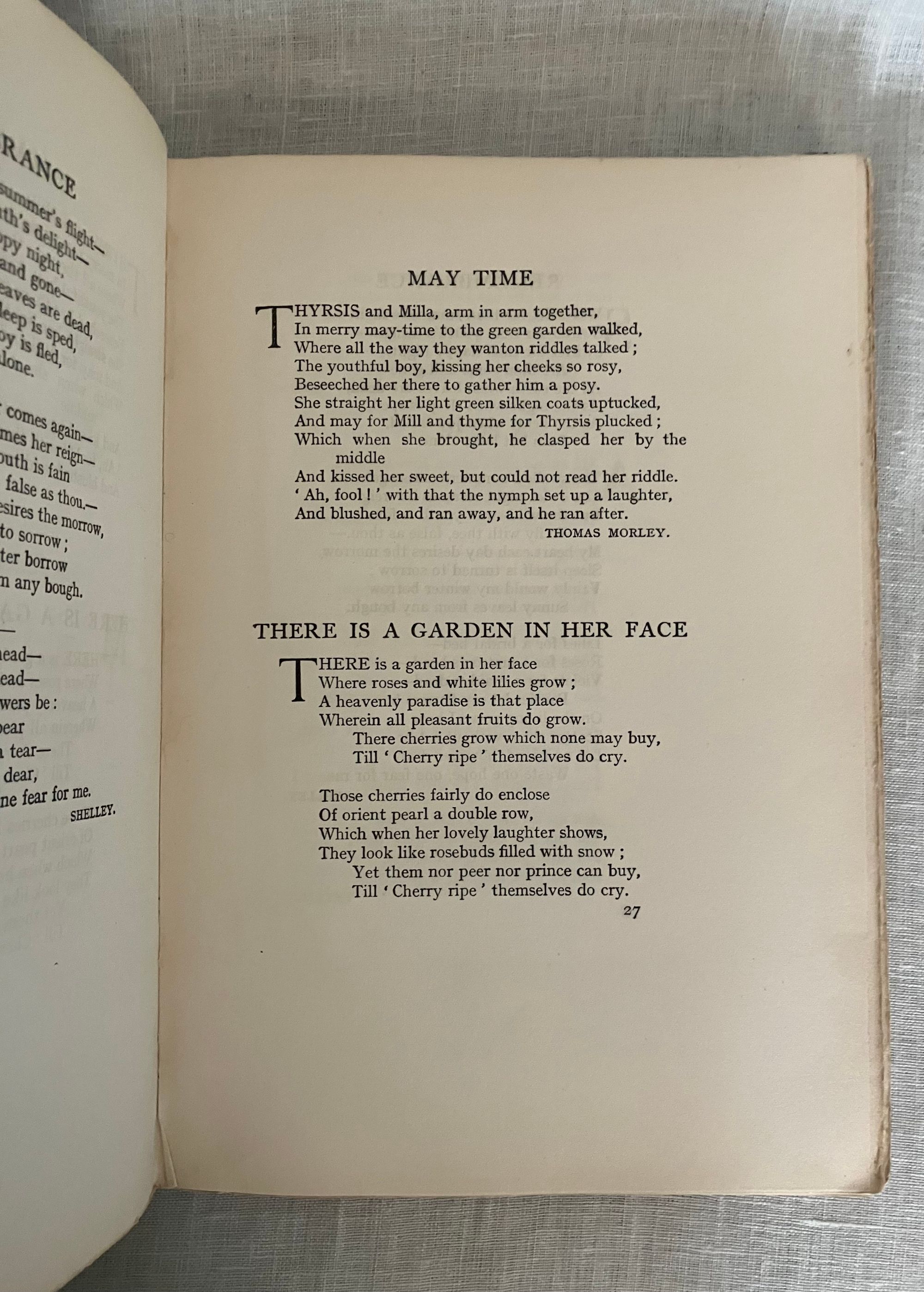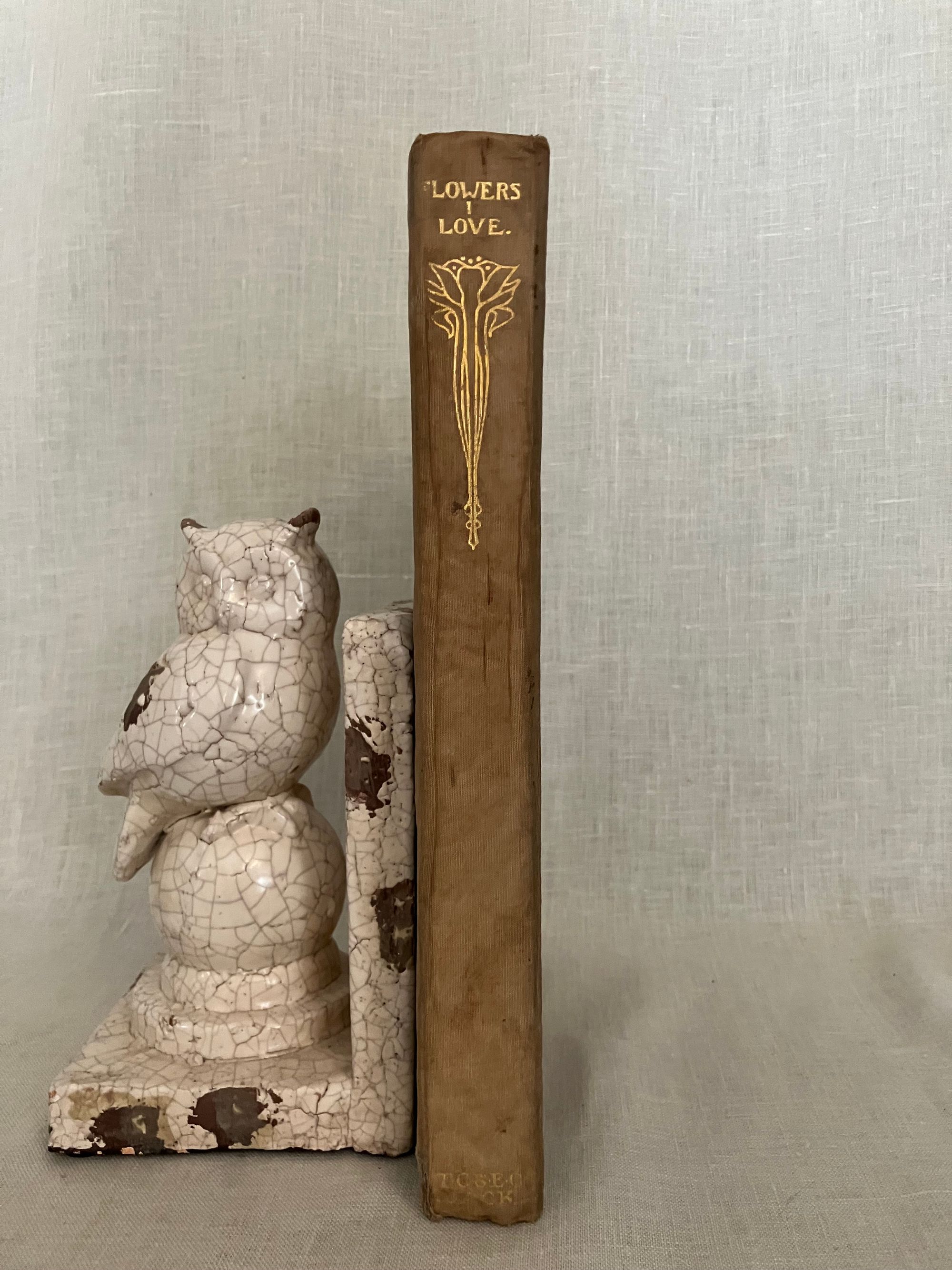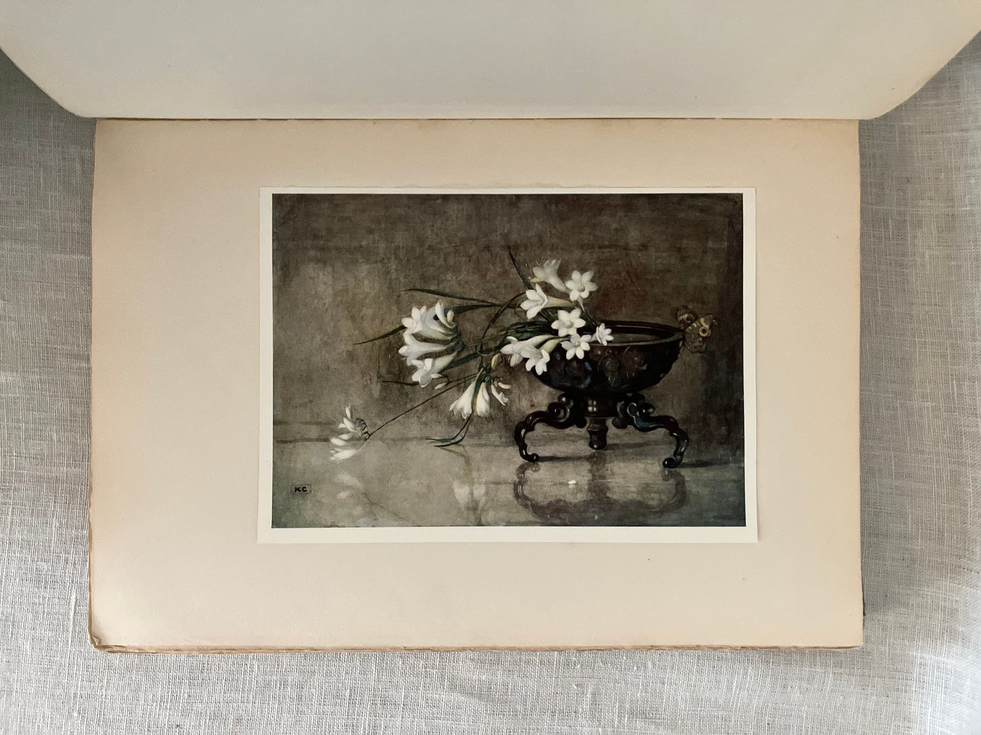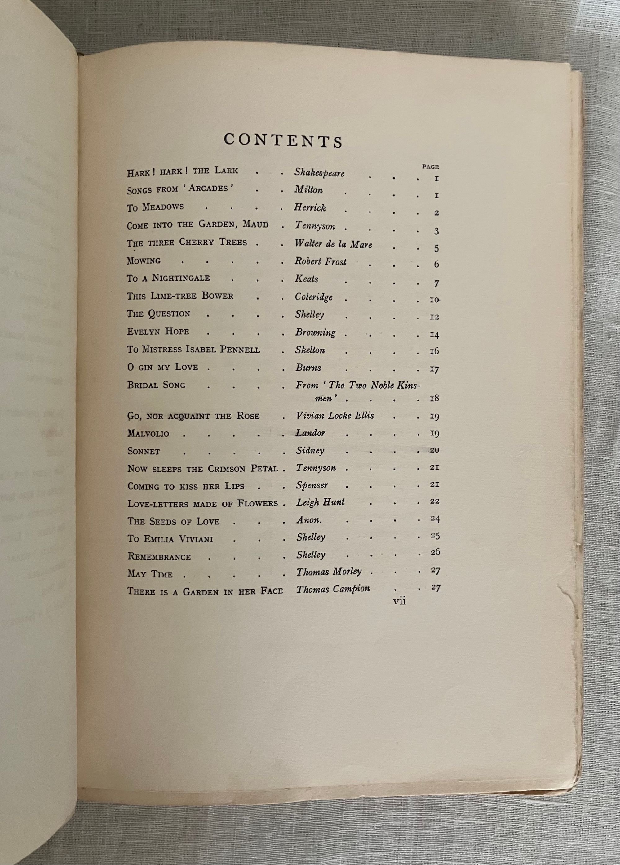 Undated, but believed to be from about 1915-1920. Hard cover 4to, in cream colored quarter linen over grey paper-covered boards blocked in gold with art deco cover design featuring five possibly iris-like flowers with long descending stems terminating in abstract leaves and surmounted by a butterfly shaped shield with the illustrated title design, initialed by the artist Katherine Cameron within the design lower right front. Spine in gold repeating title and single flower design as on front board. xi, 81pp., with unnumbered plate and labelled guard pages. Frontispiece " Roses of Morning" and additional 23 chromolithographed plates are tipped in. Printed in Great Britain upon thick cream art stock. Poems include selections from Shakespeare, Burns, Christina Rossetti, the Romantic Poets, Elizabeth Barrett Browning, Robert Frost and many more. CONDITION: Very Good. Some spots of soiling to boards and spine. Ghost of a an old ballpoint signature to front cover on right side, barely seen. Moderate wear at corners. The cloth at spine is delicate, yet intact. Hinges in order. Brown offset to ffep. and rep. The odd singular spot of foxing. The lovely floral watercolor reproductions of the Glasgow, Scotland ARTIST Katherine Cameron (1874-1965) , RWS, RE make this gift book sing. Cameron attended the Glasgow School of Art from 1889-1893, and was associated with some fellow women artists there at the time, including Jessie M. King, Frances and Margaret Macdonald and others, as part of the group called the "Glasgow Girls." As a group these artists developed a unique Glasgow art nouveau style. She had a long and successful career as a children's book illustrator, notably for this London publisher, T.C. and E.C. Jack, and also designed the book cover. E. Ewan et al, New Biographical Dictionary of Scottish Women (Edinburgh Univ. Press, 2018). A scarce title of the artist's work.
