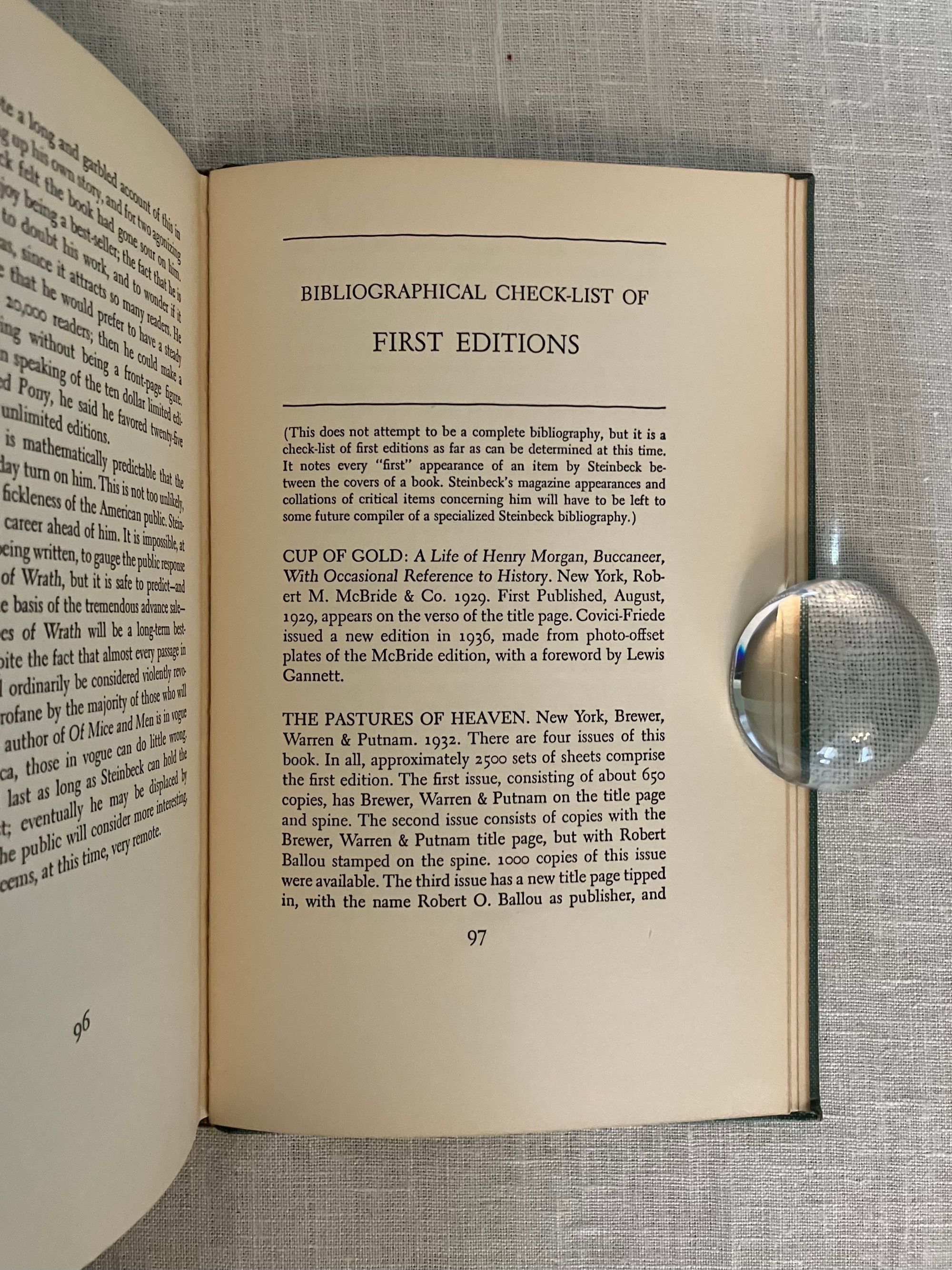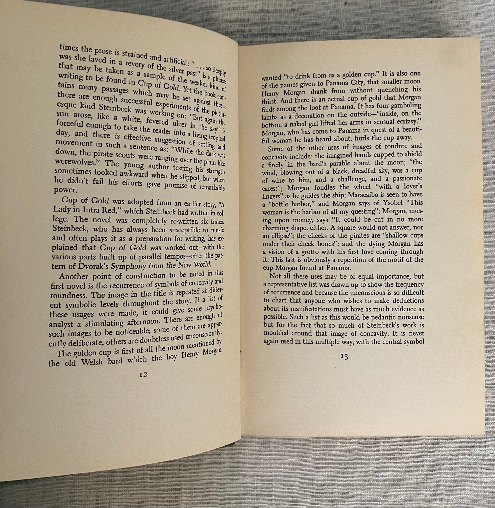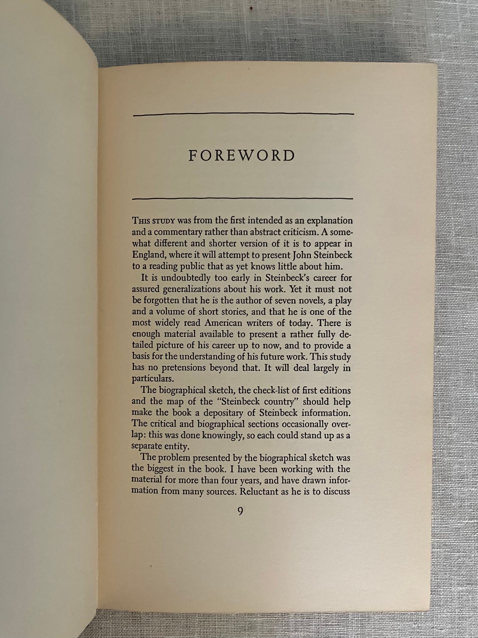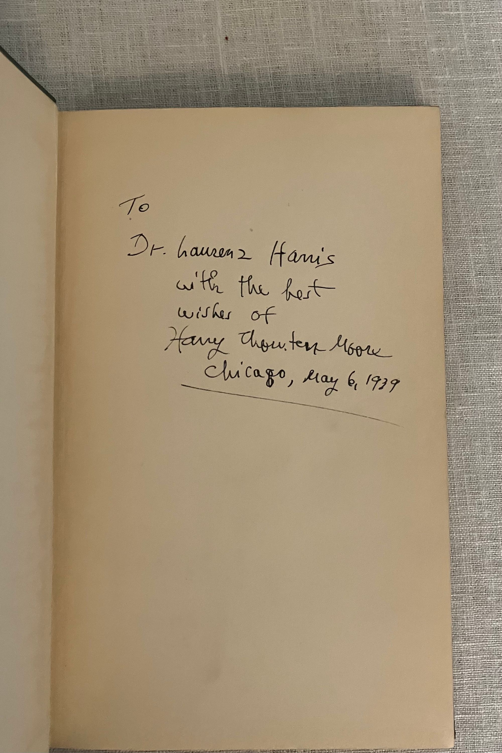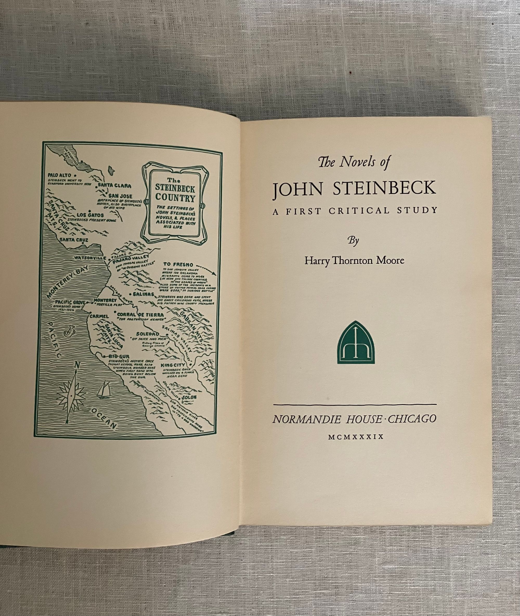 Hardcover, 12mo, in green publisher's cloth printed with titles in gold to front board and vertically to spine. 102pp. First Edition. Signed and inscribed on ffep. by Author, dated May, 1939, to Dr. Laurenz Harris. Printed in an edition of 1000 copies at the Black Cat Press and bound by the John F. Cuneo Company, April, 1939. Design and typography by Norman W. Forgue. (from colophon). Includes frontispiece map labeled "Steinbeck Country" printed in green, as well as an arched green publisher's device to front page. Otherwise clean and hinges in order. CONDITION: Very Good Plus. Lacking dust jacket. Spine darkened and dulled. Minimal wear to tips and head and foot of spine. Light age toning.**AUTHOR Harry Thorton Moore (1908-1981) was an early bibliographer of the American novelist John Steinbeck, and winner of a Guggenheim Fellowship for English Literature in 1958 and 60. At the point of publication, Steinbeck had written only seven novels, a play and a book of short stories. Other of his titles concern the writers D.H. Lawrence, Henry James, and E.M. Foster, and he also wrote literary criticism for the New Republic (Boston College Burns Library Archive). **PRINTER Norman W. Forgue (1904-1985) was an African American fine printer born in Chicago, whose Black Cat Press produced over three hundred publications beginning in 1932, and "winning numerous awards from the American Institute of Graphic Arts and other graphic arts organizations." (Smithsonian Archives of American Art, Norman Press Collection.) REF: Bradford Morrow, Catalogue Eight, "John Steinbeck, A Collection...The Harry Valentine Collection" (Santa Barbara: Cummings Press, 1980), No. 569, p. 133.