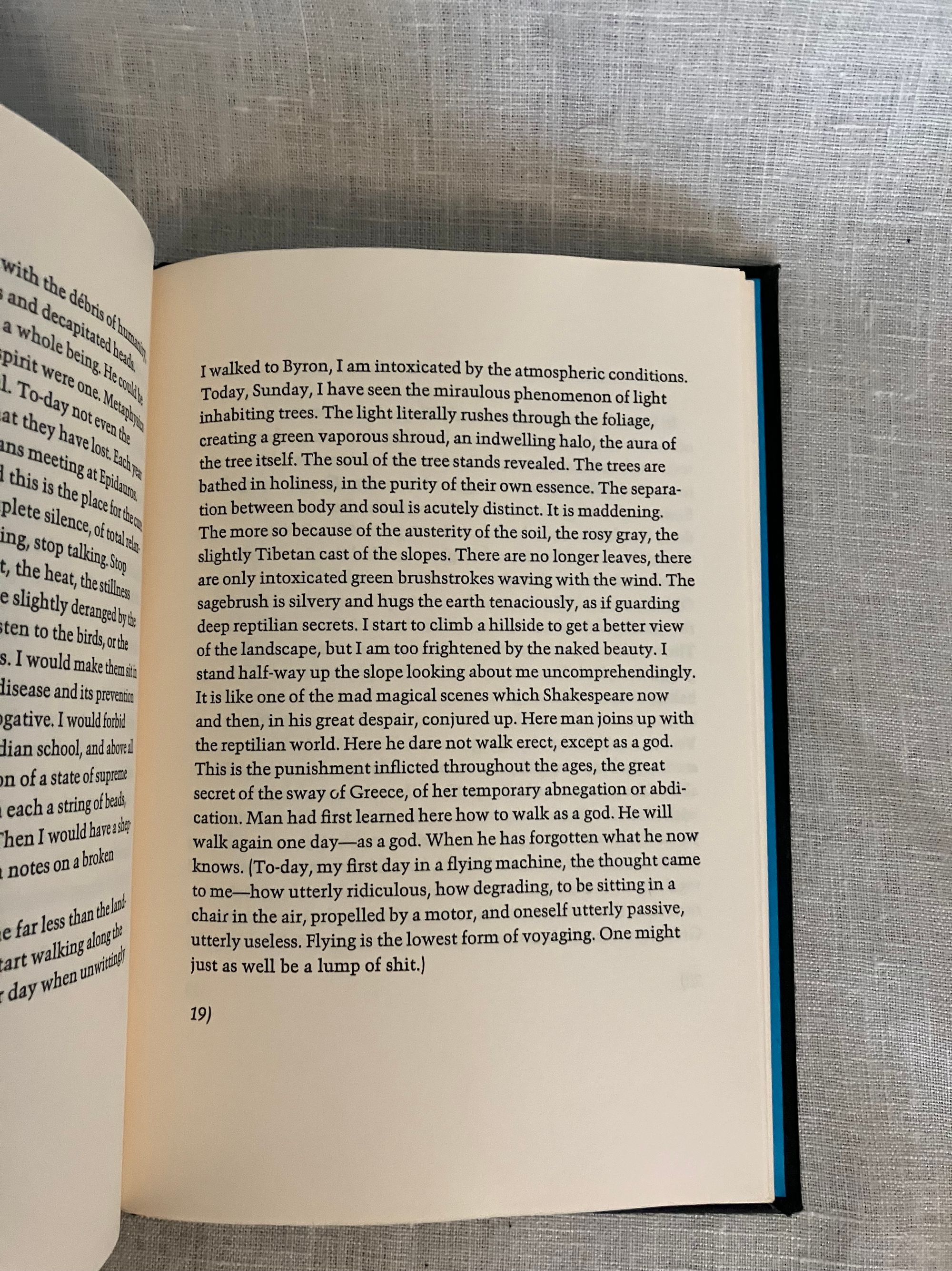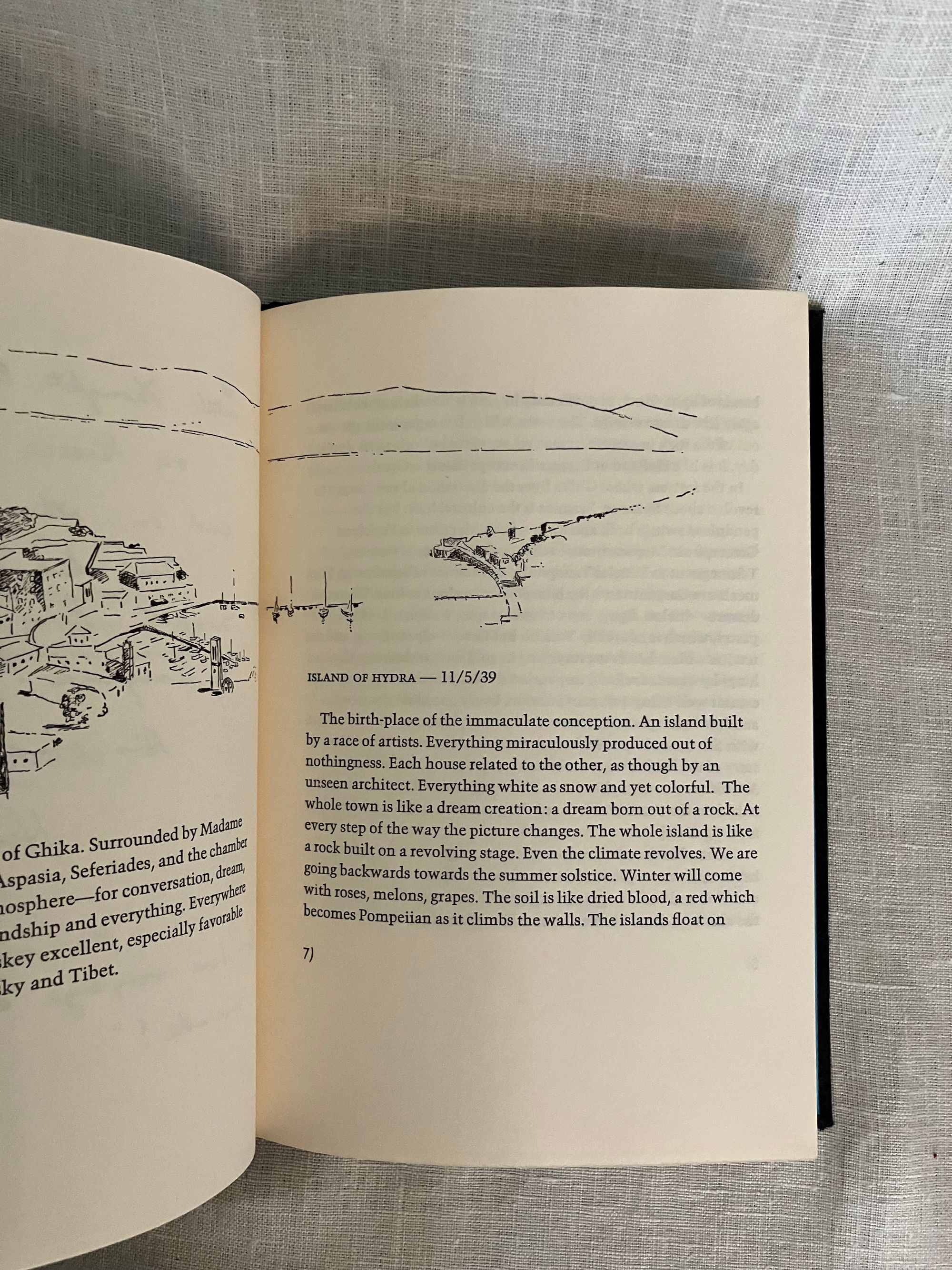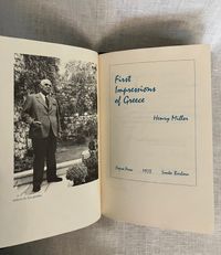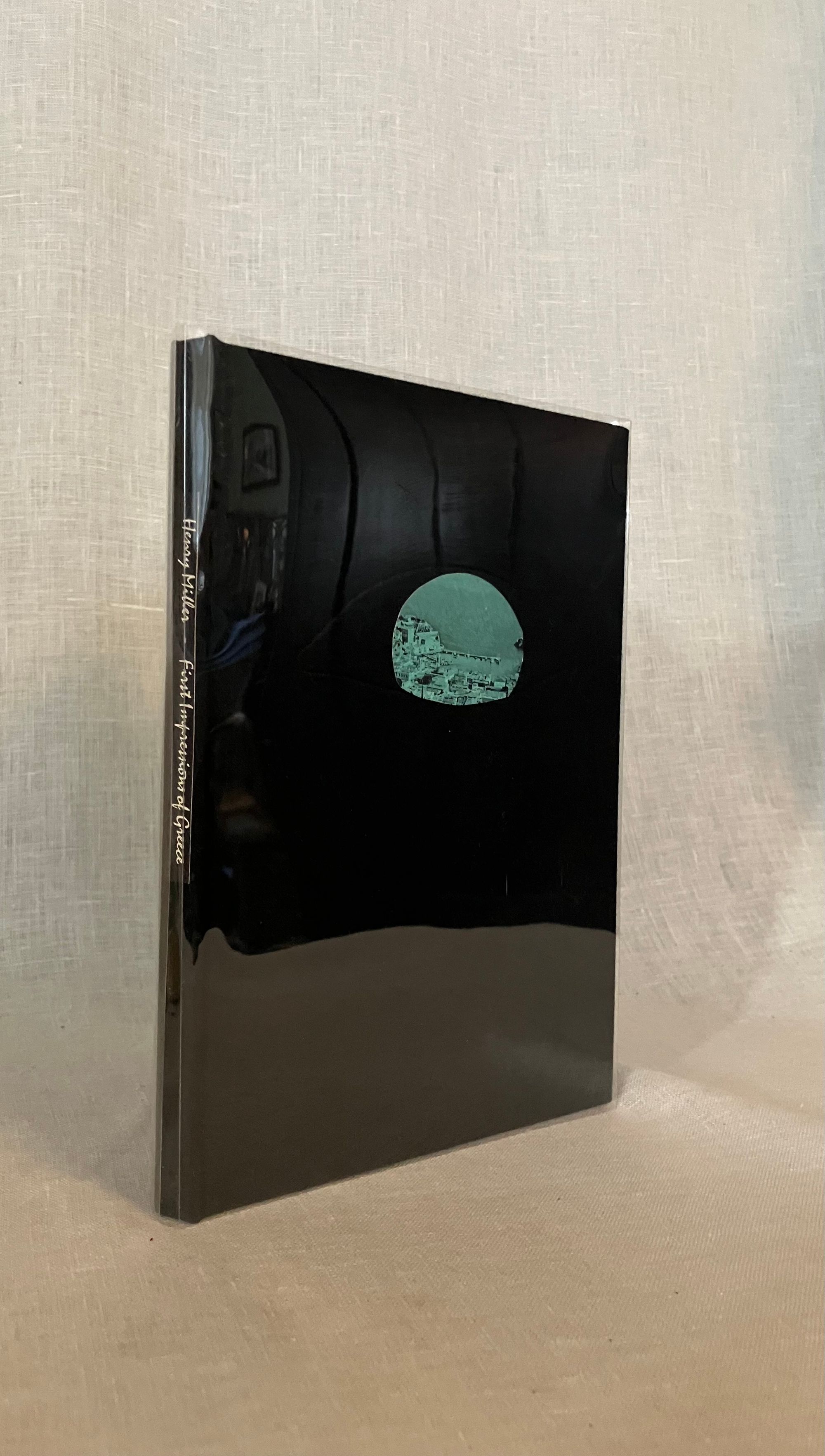 Hard cover, 12 mo, in black cloth, with circular photo vignette in aqua to front, within a blind stamped eye shape, titles printed in white upon a black paper label applied to the spine. Aqua colored end papers. Author's facsimile inscription to [p.1] in English and French: "Begun at Hydra at the house of Ghika. Entouré par la Madame Hadji-Kyriaco, Katsimbalis, Aspasia, Seferiades--et les femmes de chambre..." (This passage is translated in full on p. 6, and refers to Miller's stay at the house of the Greek painter. This was also where he began the first draft for what some consider his most famous novel, "The Colossus of Marousi," written about George Katsimbalis. Also, another facsimile handwritten dedication by Miller to "King George Seferis of Smyrna" dated and signed in facsimile by Miller Nov. 1939 [p. 5.] His portrait photograph appears as the frontispiece. Colophon limitation page with REAL author signature at rear of work, Limited Edition No. 29 of 250 copies. Stated first edition designed and printed by Noel Young for Capra Press and hand-bound (binder not named).**CONDITION: Fine. But now in a new mylar protector. **Henry Miller travelled to Greece from Paris in 1939 , staying with his friend, fellow ex-pat and literary admirer Lawrence Durrell, recently after publication of his "Tropic of Cancer" in Paris the same year. This is a sort of literary travel diary of the trip, in which Miller reflects on the people and places he goes, makes observations on his reading, and thinks about some of the authors who have travelled the road before him. (Byron, for one). From Shakespeare to Nijinsky, the Greek philosophers to contemporary writers and thinkers George Katsimbalis and poet Giorgos Seferis, Miller's observations provide an interesting interior view of the mind of one of the twentieth century's most unique Modernist writers and his influences. There are also some rough drafts of passages which appear in a rewritten form in the final published version of "The Colossus of Marousi." [See our related listing 9494.]