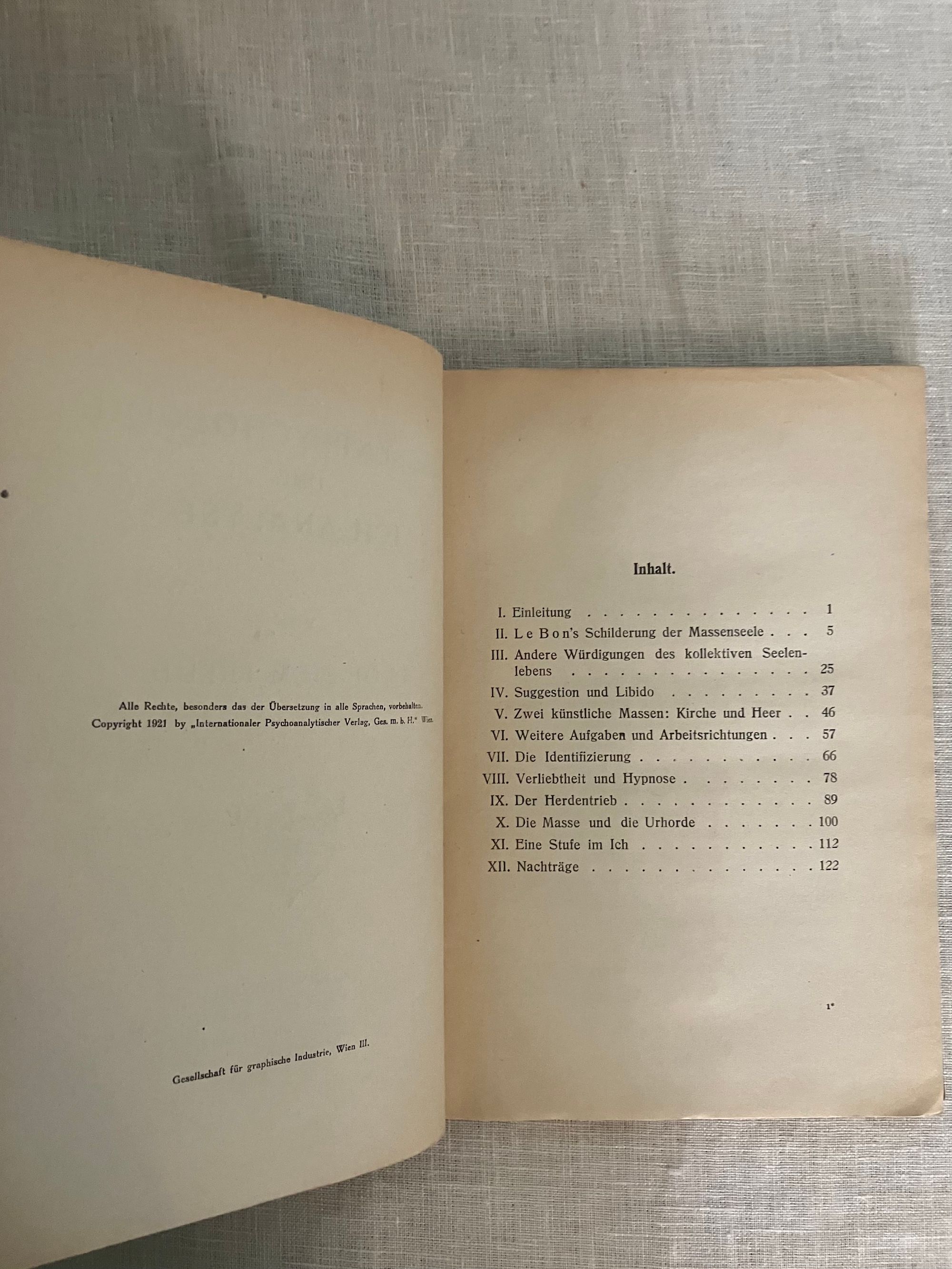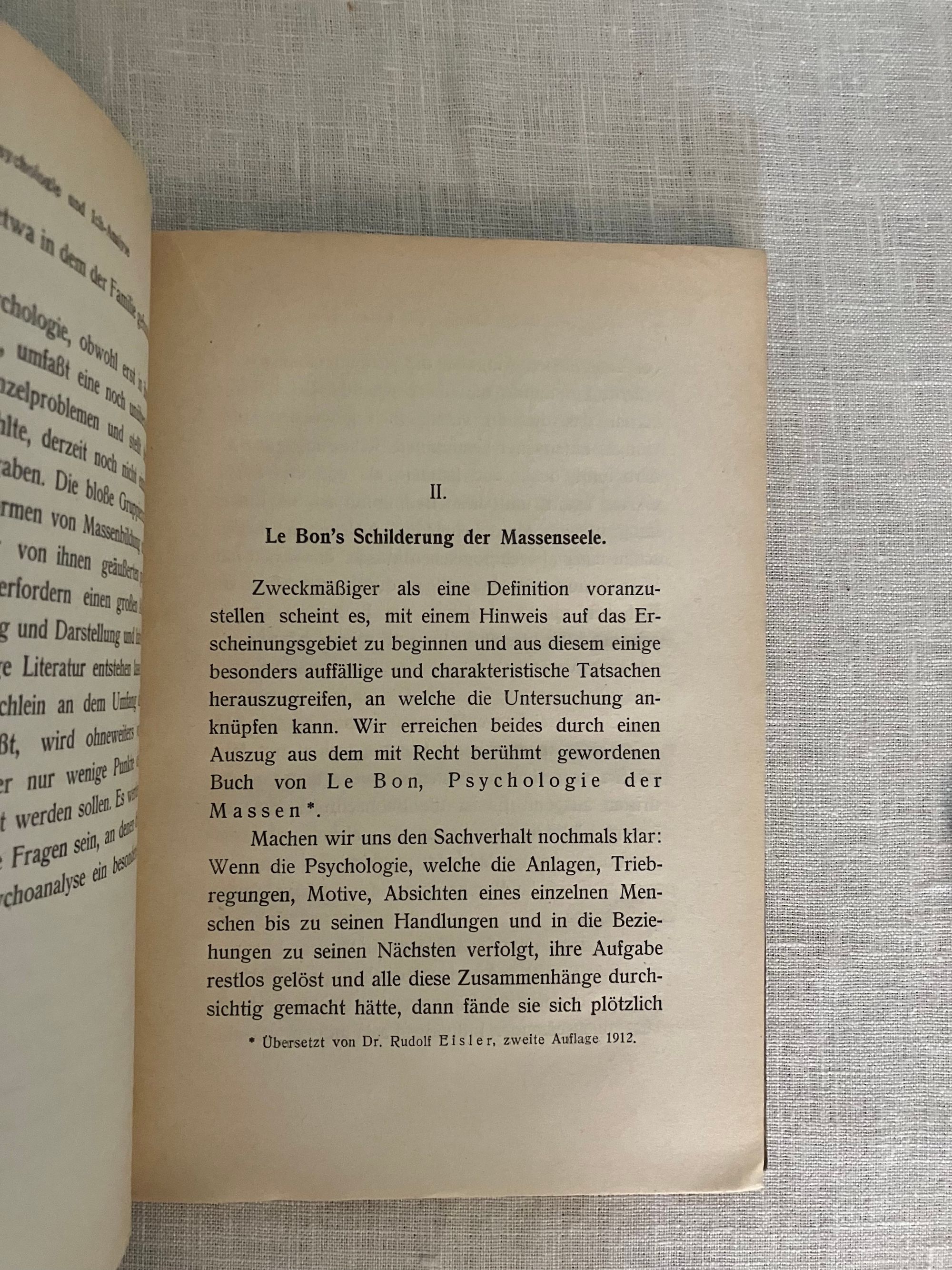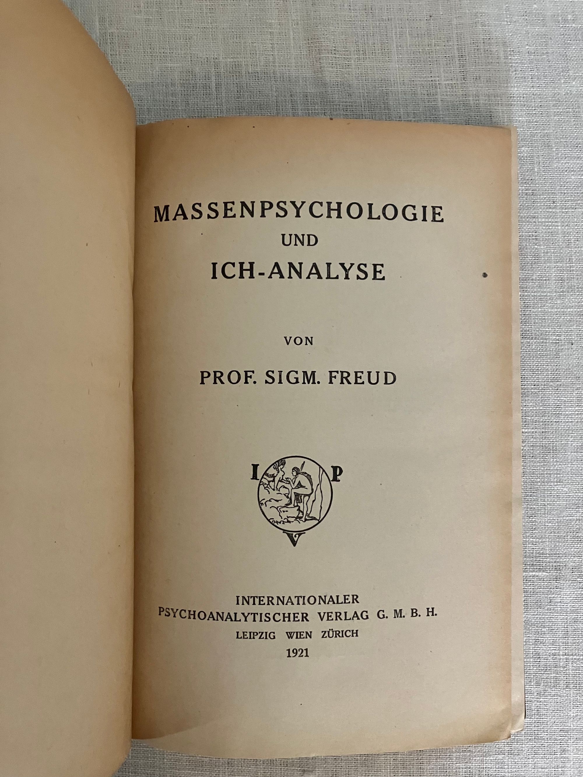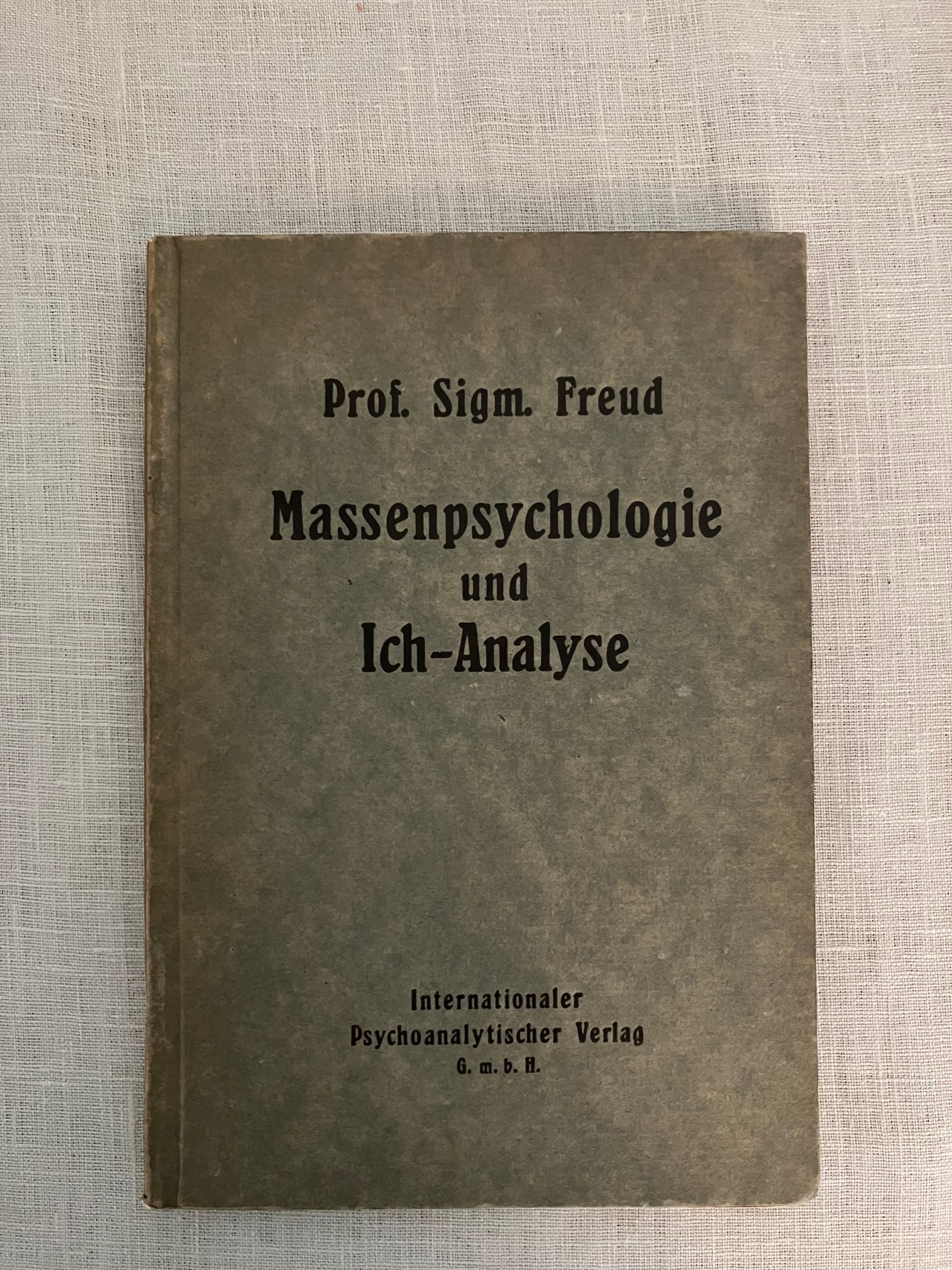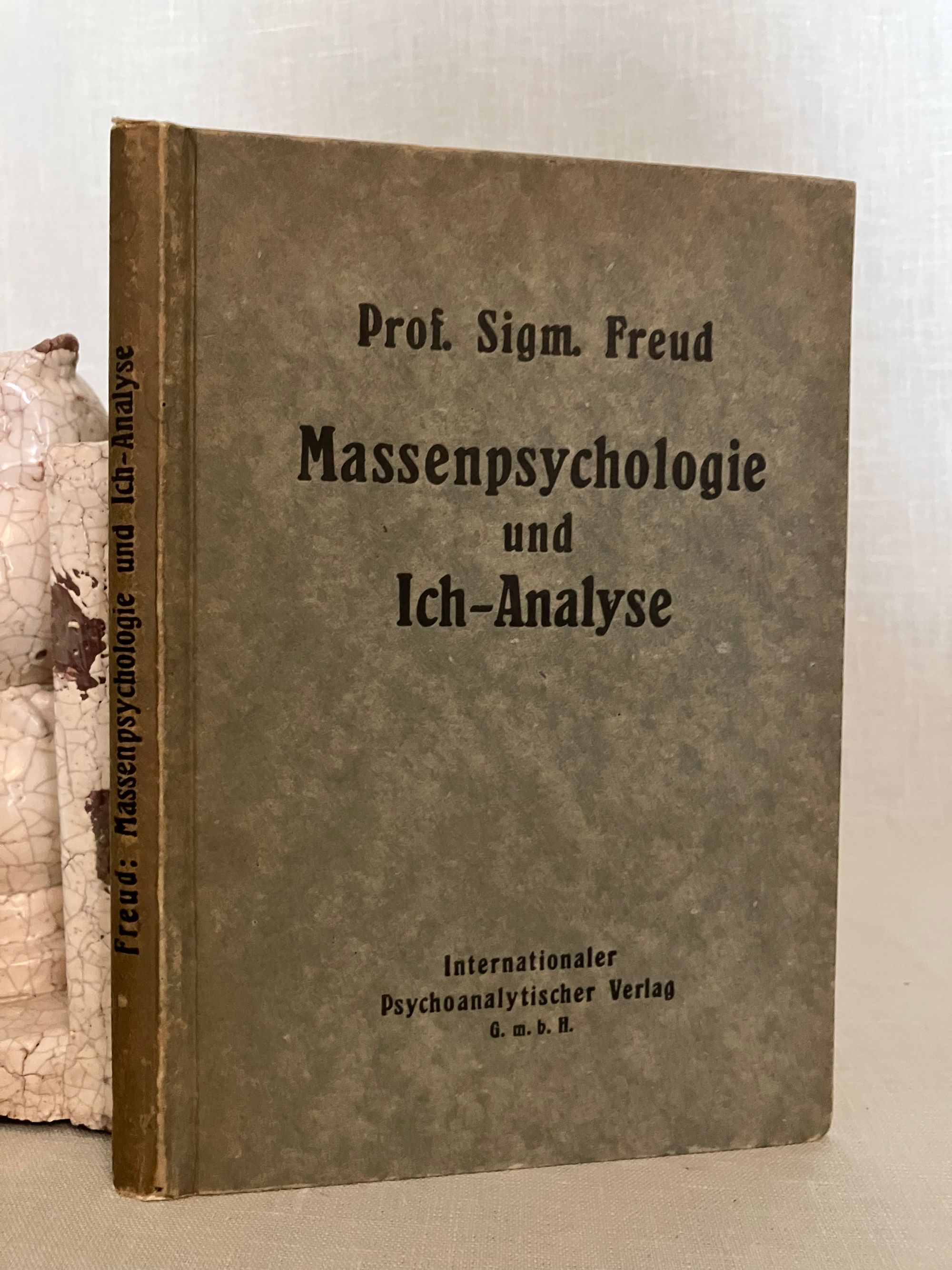 Hard cover, 12 mo in green-grey paper covered boards, titles printed to front and vertically along spine in black. First Edition. 140 pp. Text in German. (English: Group Psychology and the Analysis of the Ego.) CONDITION: Very Good. Front Hinge cracked. Moderate age toning to pages and endpapers. Otherwise with minimal wear. **Pioneering Austrian psychoanalyst Sigmund Freud (1856-1939) discusses the way mass movements are affected by psychological forces. Suggestibility, "contagion of thought," the hypnotic influence of the group upon the individual through their subconscious are identified as the means through which group psychology is manifested. The intimidation of individuals, or conversely, the removal of inhibitions by proximity to a group, are discussed in relation to organizations such as churches or armies, or nations, for instance. References to other contemporary psychologists on the topic, cf. LeBon, McDougall, Berheim, Schopenhauer et al.
